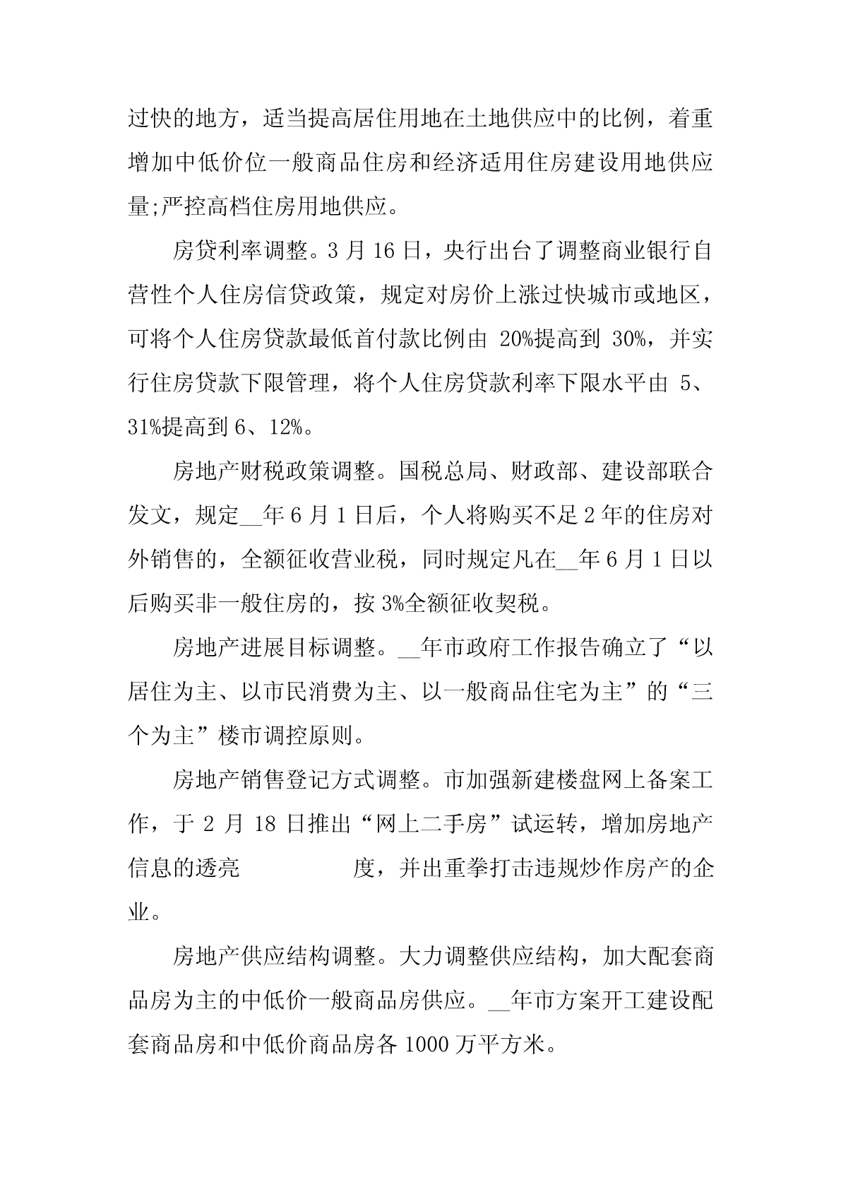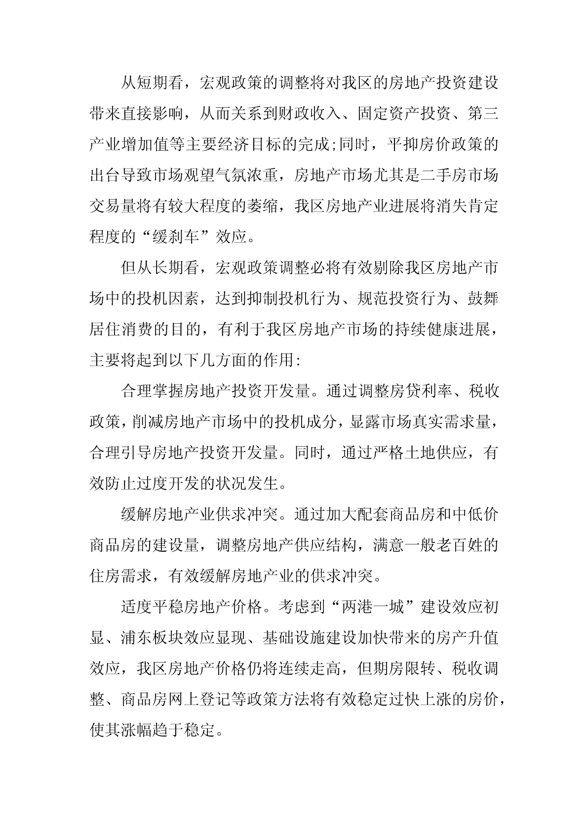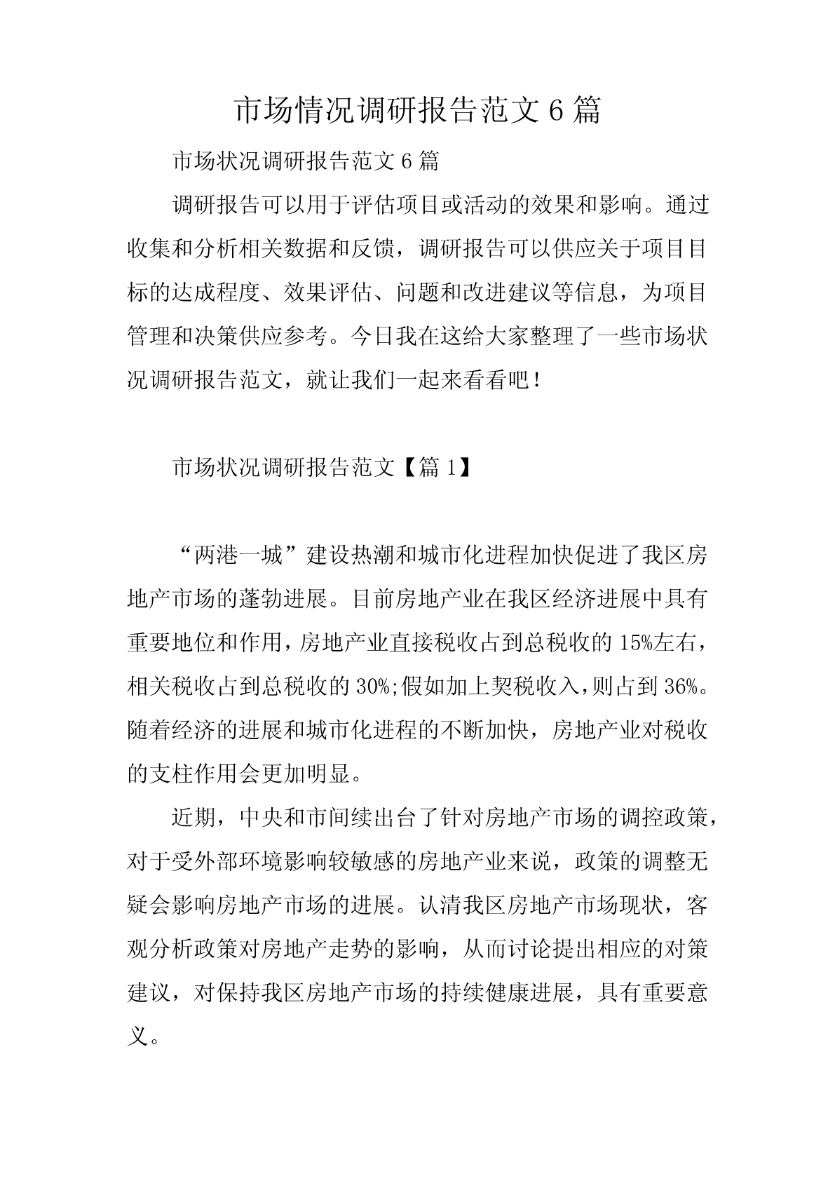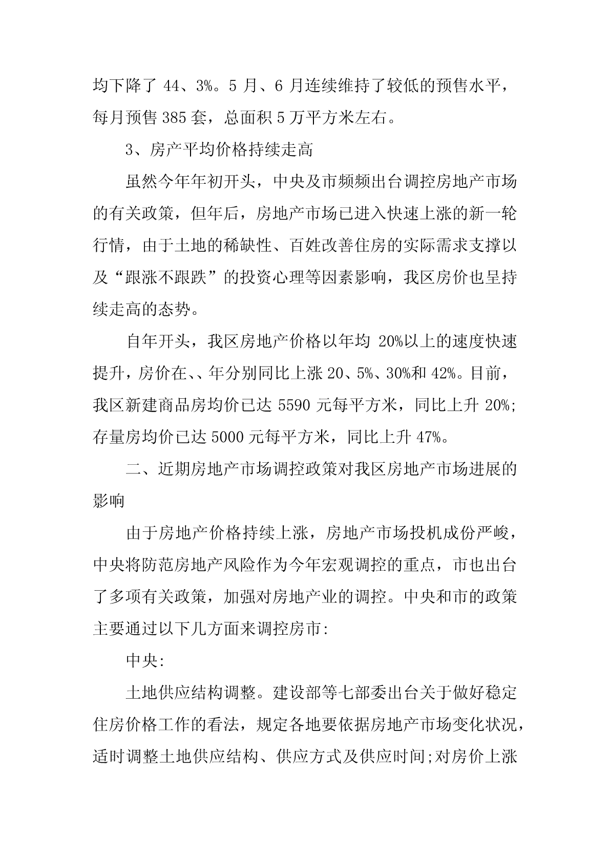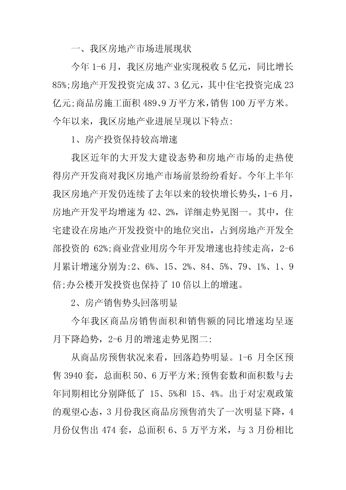 市场情况调研报告范文6篇市场状况调研报告范文6篇调研报告可以用于评估项目或活动的效果和影响。通过收集和分析相关数据和反馈,调研报告可以供应关于项目目标的达成程度、效果评估、问题和改进建议等信息,为项目管理和决策供应参考。今日我在这给大家整理了一些市场状况调研报告范文,就让我们一起来看看吧!市场状况调研报告范文【篇1】“两港一城”建设热潮和城市化进程加快促进了我区房地产市场的蓬勃进展。目前房地产业在我区经济进展中具有重要地位和作用,房地产业直接税收占到总税收的15%左右,相关税收占到总税收的30%;假如加上契税收入,则占到36%。随着经济的进展和城市化进程的不断加快,房地产业对税收的支柱作用会更加明显。近期,中央和市间续出台了针对房地产市场的调控政策,对于受外部环境影响较敏感的房地产业来说,政策的调整无疑会影响房地产市场的进展。认清我区房地产市场现状,客观分析政策对房地产走势的影响,从而讨论提出相应的对策建议,对保持我区房地产市场的持续健康进展,具有重要意义。一、我区房地产市场进展现状今年1-6月,我区房地产业实现税收5亿元,同比增长85%;房地产开发投资完成37、3亿元,其中住宅投资完成23亿元;商品房施工面积489、9万平方米,销售100万平方米。今年以来,我区房地产业进展呈现以下特点:1、房产投资保持较高增速我区近年的大开发大建设态势和房地产市场的走热使得房产开发商对我区房地产市场前景纷纷看好。今年上半年我区房地产开发仍连续了去年以来的较快增长势头,1-6月,房地产开发平均增速为42、2%,详细走势见图一。其中,住宅建设在房地产开发投资中的地位突出,占到房地产开发全部投资的62%;商业营业用房今年开发增速也持续走高,2-6月累计增速分别为:2、6%、15、2%、84、5%、79、1%、1、9倍;办公楼开发投资也保持了10倍以上的增速。2、房产销售势头回落明显今年我区商品房销售面积和销售额的同比增速均呈逐月下降趋势,2-6月的增速走势见图二:从商品房预售状况来看,回落趋势明显。1-6月全区预售3940套,总面积50、6万平方米;预售套数和面积数与去年同期相比分别降低了15、5%和15、4%。出于对宏观政策的观望心态,3月份我区商品房预售消失了一次明显下降,4月份仅售出474套,总面积6、5万平方米,与3月份相比均下降了44、3%。5月、6月连续维持了较低的预售水平,每月预售385套,总面积5万平方米左右。3、房产平均价格持续走高虽然今年年初开头,中央及市频频出台调控房地产市场的有关政策,但年后,房地产市场已进入快速上涨的新一轮行情,由于土地的稀缺性、百姓改善住房的实际需求支撑以及“跟涨不跟跌”的投资心理等因素影响,我区房价也呈持续走高的态势。自年开头,我区房地产价格以年均20%以上的速度快速提升,房价在、、年分别同比上涨20、5%、30%和42%。目前,我区新建商品房均价已达5590元每平方米,同比上升20%;存量房均价已达5000元每平方米,同比上升47%。二、近期房地产市场调控政策对我区房地产市场进展的影响由于房地产价格持续上涨,房地产市场投机成份严峻,中央将防范房地产风险作为今年宏观调控的重点,市也出台了多项有关政策,加强对房地产业的调控。中央和市的政策主要通过以下几方面来调控房市:中央:土地供应结构调整。建设部等七部委出台关于做好稳定住房价格工作的看法,规定各地要依据房地产市场变化状况,适时调整土地供应结构、供应方式及供应时间;对房价上涨过快的地方,适当提高居住用地在土地供应中的比例,着重增加中低价位一般商品住房和经济适用住房建设用地供应量;严控高档住房用地供应。房贷利率调整。3月16日,央行出台了调整商业银行自营性个人住房信贷政策,规定对房价上涨过快城市或地区,可将个人住房贷款最低首付款比例由20%提高到30%,并实行住房贷款下限管理,将个人住房贷款利率下限水平由5、31%提高到6、12%。房地产财税政策调整。国税总局、财政部、建设部联合发文,规定__年6月1日后,个人将购买不足2年的住房对外销售的,全额征收营业税,同时规定凡在__年6月1日以后购买非一般住房的,按3%全额征收契税。房地产进展目标调整。__年市政府工作报告确立了“以居住为主、以市民消费为主、以一般商品住宅为主”的“三个为主”楼市调控原则。房地产销售登记方式调整。市加强新建楼盘网上备案工作,于2月18日推出“网上二手房”试运转,增加房地产信息的透亮度,并出重拳打击违规炒作房产的企业。房地产供应结构调整。大力调整供应结构,加大配套商品房为主的中低价一般商品房供应。__年市方案开工建设配套商品房和中低价商品房各1000万平方米。从短期看,宏观政策的调整将对我区的房地产投资建设带来直接影响,从而关系到财政收入、固定资产投资、第三产业增加值等主要经济目标的完