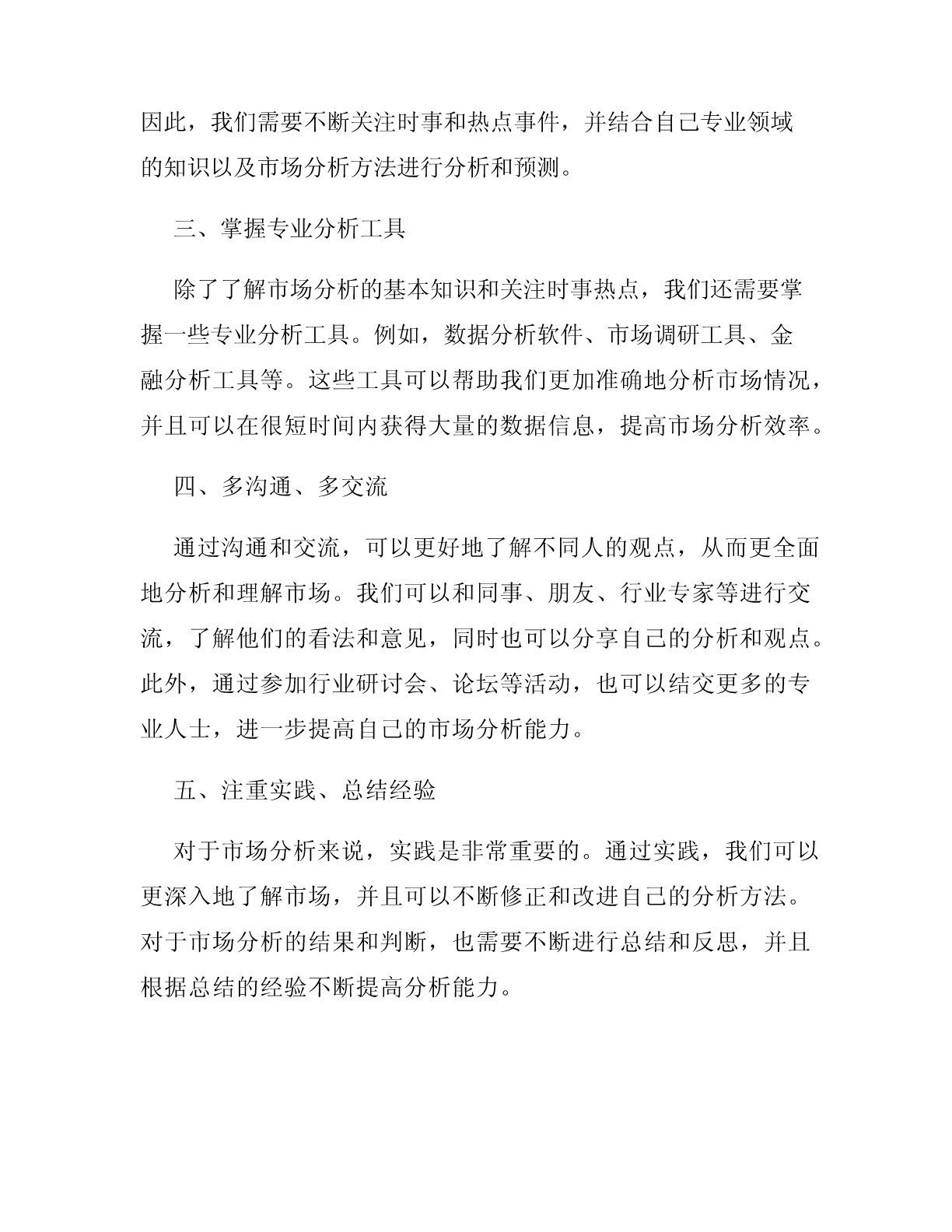 如何提升自己的市场分析能力市场分析是指通过对市场环境、产品需求、竞争对手等多方位的调研和分析,以了解市场情况,做出正确决策的过程。对于企业而言,市场分析是非常重要的一环,因为它直接关系到企业的发展和前景。而对于个人而言,提升自己的市场分析能力,不仅能够帮助个人更好地理解市场,判断产品的生命周期和市场趋势,还有利于提高个人在职场的竞争力。本文将从以下几个方面介绍如何提升自己的市场分析能力。一、学习市场分析知识市场分析是一门综合性较强的学科,包括市场环境、市场调查、产品竞争、消费者需求等方面的知识。为了提升市场分析能力,我们需要先了解这些基本概念和理论知识。可以通过阅读专业书籍、参加培训班、培训课程等多种途径学习市场分析方面的知识。此外,在了解市场分析的过程中,我们还需要学会如何分析和预测市场的变化趋势。二、关注时事和热点事件市场环境是随着时代的变化而不断发生的变化,因此时事和热点事件也是了解市场分析的重要内容。时事和热点事件的变化,往往会直接影响到市场的变化和发展趋势。比如,当前疫情的发生和全球经济的不稳定性,对不同行业的市场都有很大的影响。因此,我们需要不断关注时事和热点事件,并结合自己专业领域的知识以及市场分析方法进行分析和预测。三、掌握专业分析工具除了了解市场分析的基本知识和关注时事热点,我们还需要掌握一些专业分析工具。例如,数据分析软件、市场调研工具、金融分析工具等。这些工具可以帮助我们更加准确地分析市场情况,并且可以在很短时间内获得大量的数据信息,提高市场分析效率。四、多沟通、多交流通过沟通和交流,可以更好地了解不同人的观点,从而更全面地分析和理解市场。我们可以和同事、朋友、行业专家等进行交流,了解他们的看法和意见,同时也可以分享自己的分析和观点。此外,通过参加行业研讨会、论坛等活动,也可以结交更多的专业人士,进一步提高自己的市场分析能力。五、注重实践、总结经验对于市场分析来说,实践是非常重要的。通过实践,我们可以更深入地了解市场,并且可以不断修正和改进自己的分析方法。对于市场分析的结果和判断,也需要不断进行总结和反思,并且根据总结的经验不断提高分析能力。总之,提升市场分析能力需要我们不断学习、关注时事、掌握专业分析工具、多沟通交流、注重实践总结。只有不断地积累经验,才能更好地应对市场的变化,并做出最正确的决策。