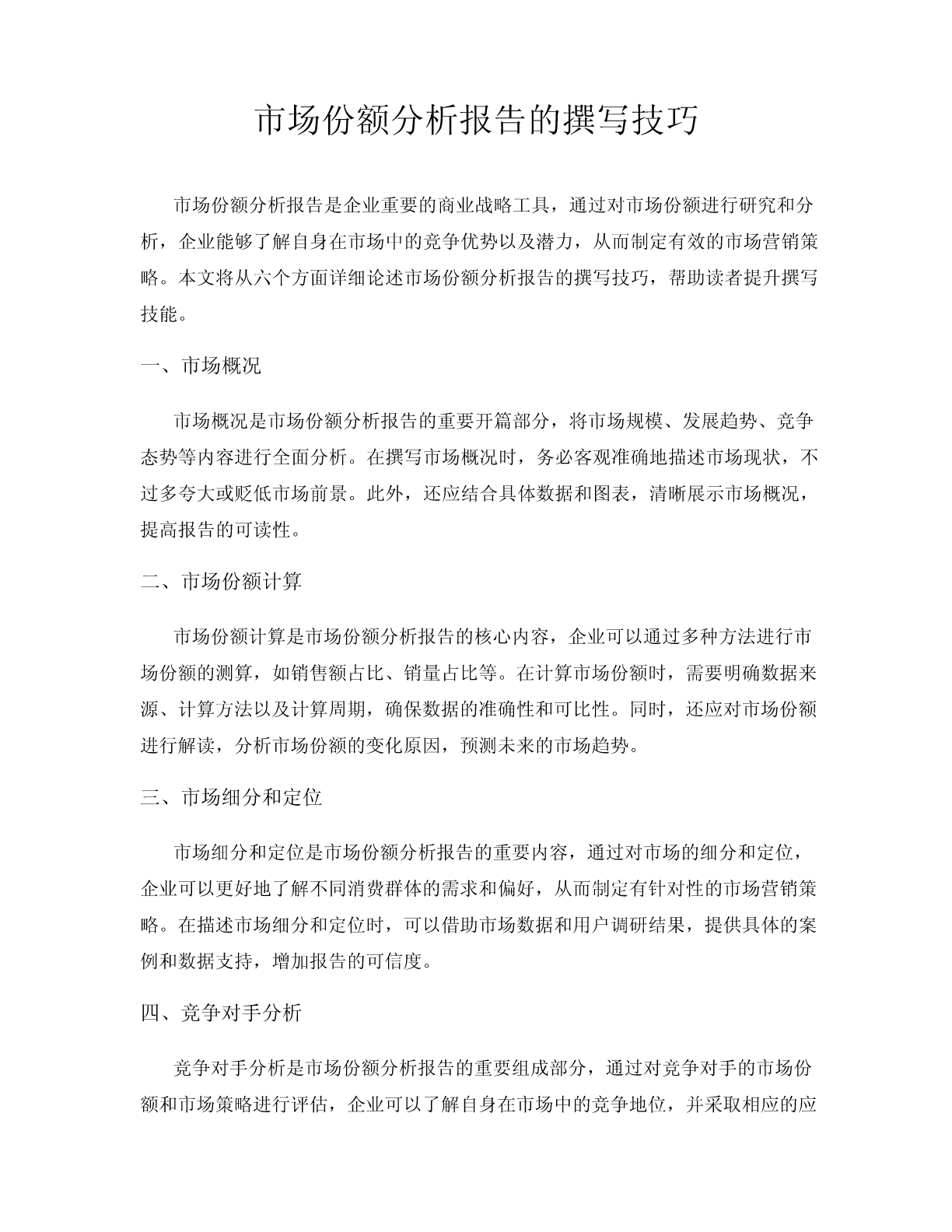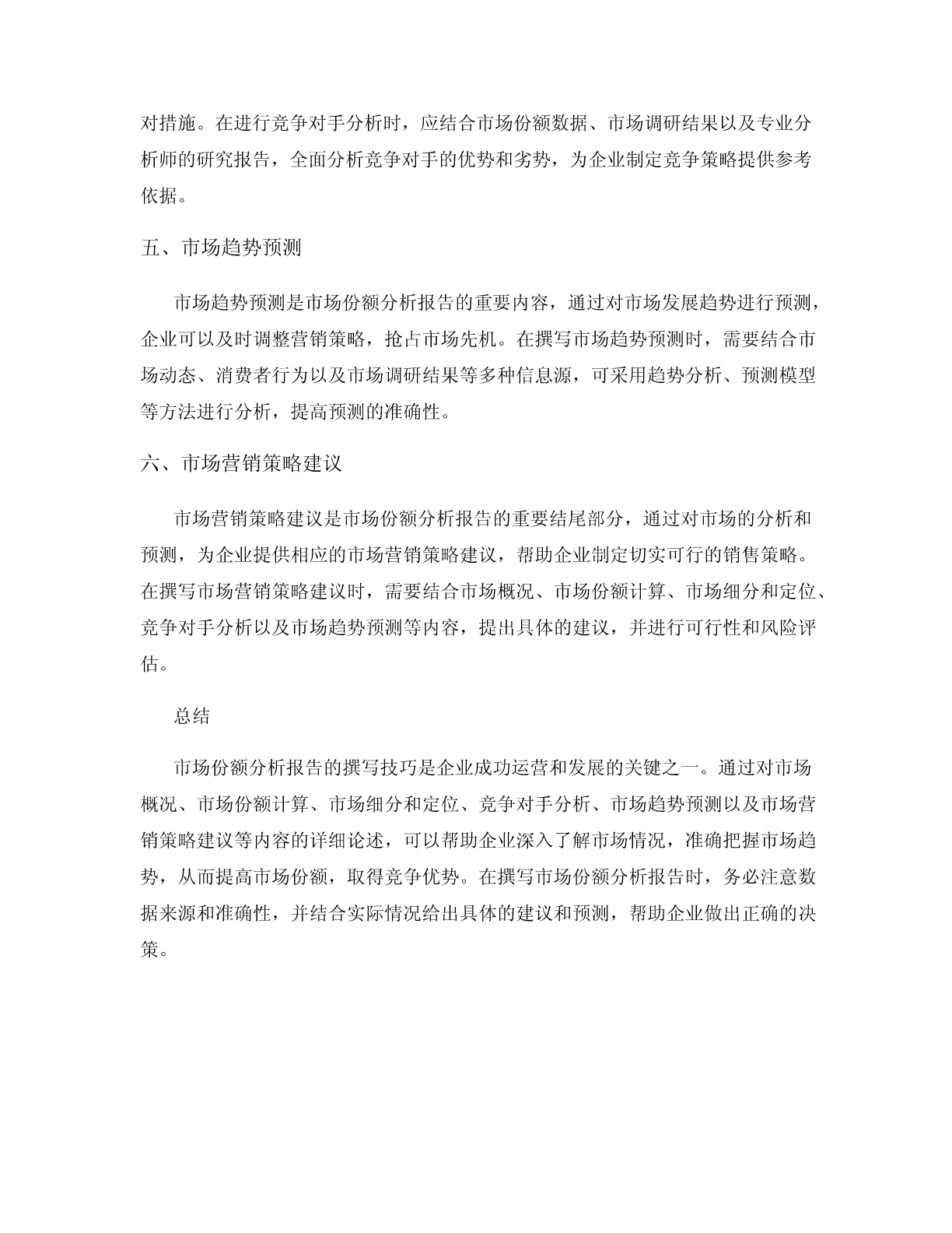 市场份额分析报告的撰写技巧市场份额分析报告是企业重要的商业战略工具,通过对市场份额进行研究和分析,企业能够了解自身在市场中的竞争优势以及潜力,从而制定有效的市场营销策略。本文将从六个方面详细论述市场份额分析报告的撰写技巧,帮助读者提升撰写技能。一、市场概况市场概况是市场份额分析报告的重要开篇部分,将市场规模、发展趋势、竞争态势等内容进行全面分析。在撰写市场概况时,务必客观准确地描述市场现状,不过多夸大或贬低市场前景。此外,还应结合具体数据和图表,清晰展示市场概况,提高报告的可读性。二、市场份额计算市场份额计算是市场份额分析报告的核心内容,企业可以通过多种方法进行市场份额的测算,如销售额占比、销量占比等。在计算市场份额时,需要明确数据来源、计算方法以及计算周期,确保数据的准确性和可比性。同时,还应对市场份额进行解读,分析市场份额的变化原因,预测未来的市场趋势。三、市场细分和定位市场细分和定位是市场份额分析报告的重要内容,通过对市场的细分和定位,企业可以更好地了解不同消费群体的需求和偏好,从而制定有针对性的市场营销策略。在描述市场细分和定位时,可以借助市场数据和用户调研结果,提供具体的案例和数据支持,增加报告的可信度。四、竞争对手分析竞争对手分析是市场份额分析报告的重要组成部分,通过对竞争对手的市场份额和市场策略进行评估,企业可以了解自身在市场中的竞争地位,并采取相应的应对措施。在进行竞争对手分析时,应结合市场份额数据、市场调研结果以及专业分析师的研究报告,全面分析竞争对手的优势和劣势,为企业制定竞争策略提供参考依据。五、市场趋势预测市场趋势预测是市场份额分析报告的重要内容,通过对市场发展趋势进行预测,企业可以及时调整营销策略,抢占市场先机。在撰写市场趋势预测时,需要结合市场动态、消费者行为以及市场调研结果等多种信息源,可采用趋势分析、预测模型等方法进行分析,提高预测的准确性。六、市场营销策略建议市场营销策略建议是市场份额分析报告的重要结尾部分,通过对市场的分析和预测,为企业提供相应的市场营销策略建议,帮助企业制定切实可行的销售策略。在撰写市场营销策略建议时,需要结合市场概况、市场份额计算、市场细分和定位、竞争对手分析以及市场趋势预测等内容,提出具体的建议,并进行可行性和风险评估。总结市场份额分析报告的撰写技巧是企业成功运营和发展的关键之一。通过对市场概况、市场份额计算、市场细分和定位、竞争对手分析、市场趋势预测以及市场营销策略建议等内容的详细论述,可以帮助企业深入了解市场情况,准确把握市场趋势,从而提高市场份额,取得竞争优势。在撰写市场份额分析报告时,务必注意数据来源和准确性,并结合实际情况给出具体的建议和预测,帮助企业做出正确的决策。
