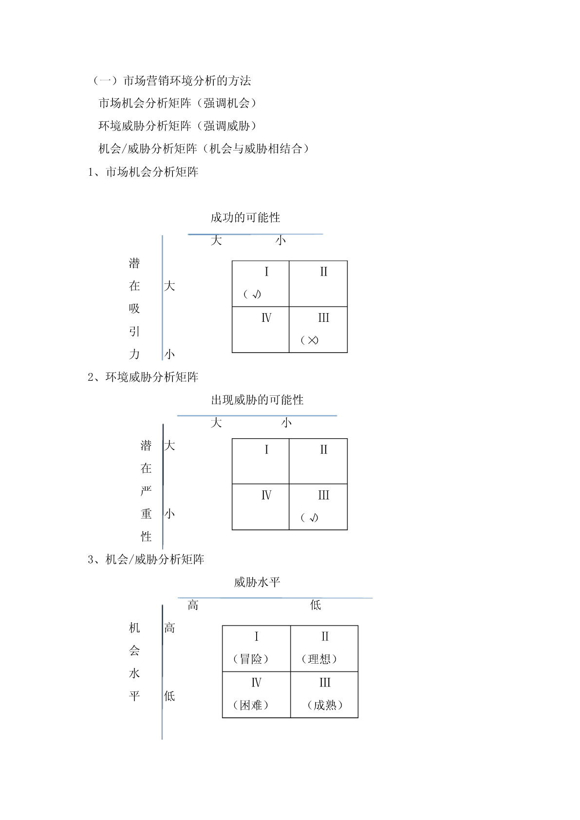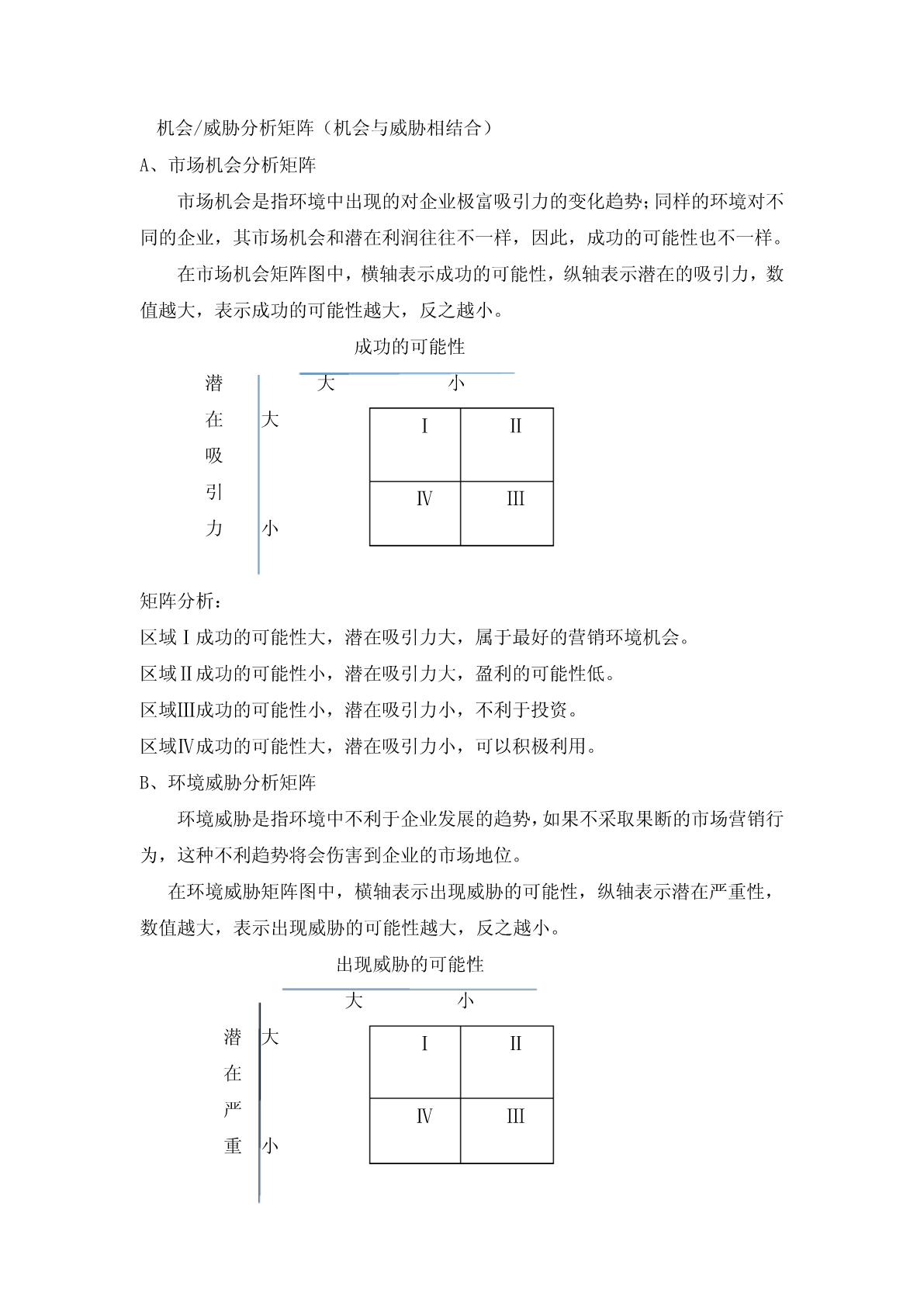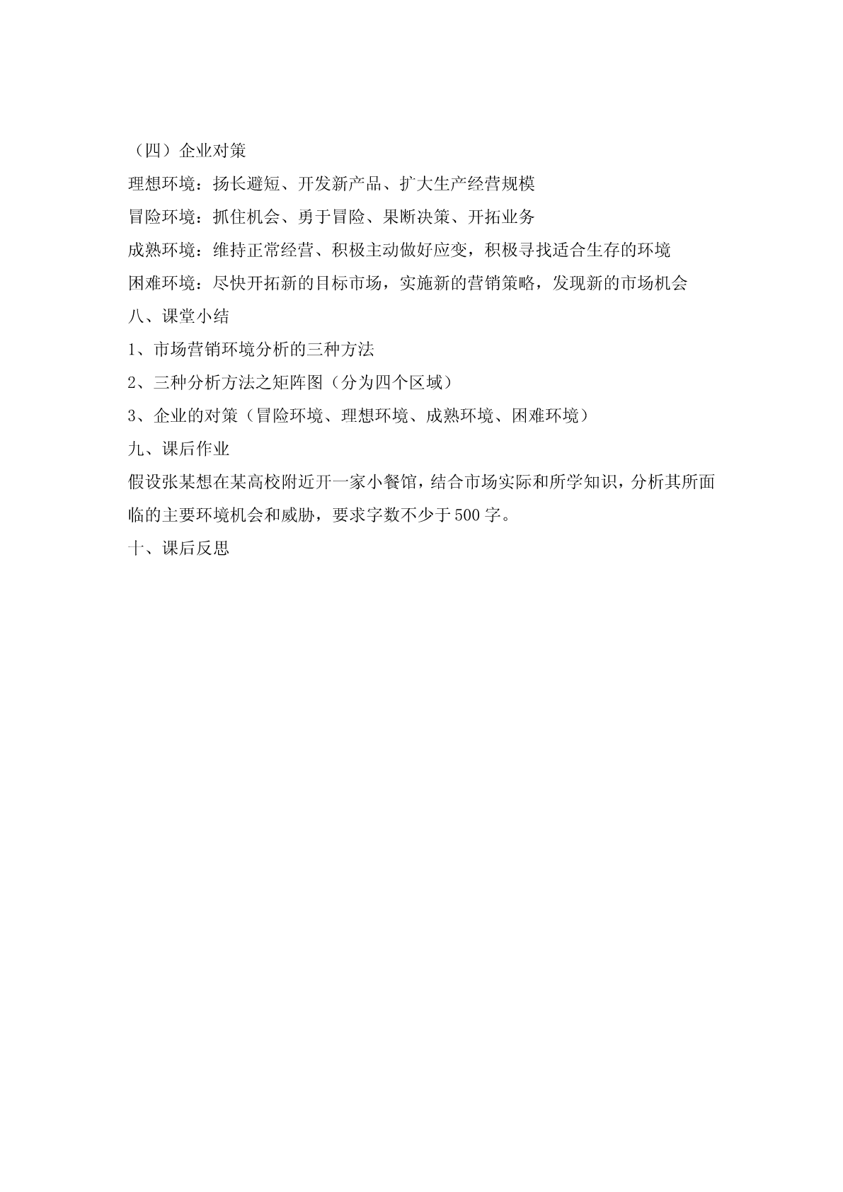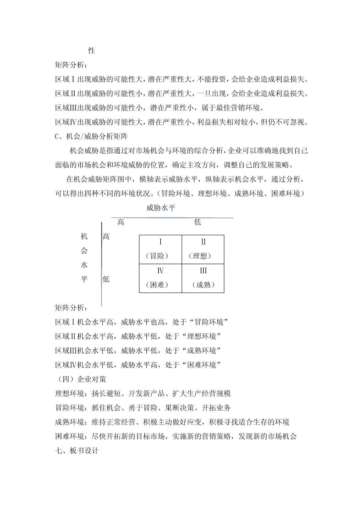 科目:市场营销参考教材:中国财政经济出版社----市场营销知识试讲内容:第二章市场营销环境分析第四节市场营销环境分析与对策授课教师:第二章市场营销环境分析第四节市场营销环境分析与对策一、教学目标通过本次教学,让学生理解和掌握市场营销环境分析的重要性和市场营销环境分析的三种方法与对策。二、教学要求教学过程中着重阐述市场营销环境分析的方法与对策,特别强调三种矩阵图;教授过程中结合有关案例,激发学生的学习兴趣。三、教学重点1、市场机会分析矩阵方法2、环境威胁分析矩阵方法3、机会/威胁分析矩阵4、企业市场营销对策四、教学难点1、市场营销环境分析的三种方法2、企业市场营销对策五、教学方法以典型案例引题,配合相关知识点的讲解、案例分析、提问、学生讨论、多媒体教学等方法六、教学过程(一)案例导入:肯德基在中国的成功和美国牛肉在日本的失败(二)市场营销环境分析的方法市场机会分析矩阵(强调机会)环境威胁分析矩阵(强调威胁)机会/威胁分析矩阵(机会与威胁相结合)A、市场机会分析矩阵市场机会是指环境中出现的对企业极富吸引力的变化趋势;同样的环境对不同的企业,其市场机会和潜在利润往往不一样,因此,成功的可能性也不一样。在市场机会矩阵图中,横轴表示成功的可能性,纵轴表示潜在的吸引力,数值越大,表示成功的可能性越大,反之越小。成功的可能性潜大小在大ⅠⅡ吸引ⅣⅢ力小矩阵分析:区域Ⅰ成功的可能性大,潜在吸引力大,属于最好的营销环境机会。区域Ⅱ成功的可能性小,潜在吸引力大,盈利的可能性低。区域Ⅲ成功的可能性小,潜在吸引力小,不利于投资。区域Ⅳ成功的可能性大,潜在吸引力小,可以积极利用。B、环境威胁分析矩阵环境威胁是指环境中不利于企业发展的趋势,如果不采取果断的市场营销行为,这种不利趋势将会伤害到企业的市场地位。在环境威胁矩阵图中,横轴表示出现威胁的可能性,纵轴表示潜在严重性,数值越大,表示出现威胁的可能性越大,反之越小。出现威胁的可能性大小潜大ⅠⅡ在严ⅣⅢ重小性矩阵分析:区域Ⅰ出现威胁的可能性大,潜在严重性大,不能投资,会给企业造成利益损失。区域Ⅱ出现威胁的可能性小,潜在严重性大,一旦出现,会给企业造成利益损失。区域Ⅲ出现威胁的可能性小,潜在严重性小,属于最佳营销环境。区域Ⅳ出现威胁的可能性大,潜在严重性小,利益损失相对较小,但仍不可忽视。C、机会/威胁分析矩阵机会威胁是指通过对市场机会与环境的综合分析,企业可以准确地找到自己面临的市场机会和环境威胁的位置,确定主攻方向,调整自己的发展策略。在机会威胁矩阵图中,横轴表示威胁水平,纵轴表示机会水平,通过分析,可以得出四种不同的环境状况。(冒险环境、理想环境、成熟环境、困难环境)威胁水平高低机高ⅠⅡ会(冒险)(理想)水ⅣⅢ平低(困难)(成熟)矩阵分析:区域Ⅰ机会水平高,威胁水平也高,处于“冒险环境”区域Ⅱ机会水平高,威胁水平低,处于“理想环境”区域Ⅲ机会水平低,威胁水平低,处于“成熟环境”区域Ⅳ机会水平低,威胁水平高,处于“困难环境”(四)企业对策理想环境:扬长避短、开发新产品、扩大生产经营规模冒险环境:抓住机会、勇于冒险、果断决策、开拓业务成熟环境:维持正常经营、积极主动做好应变,积极寻找适合生存的环境困难环境:尽快开拓新的目标市场,实施新的营销策略,发现新的市场机会七、板书设计(一)市场营销环境分析的方法市场机会分析矩阵(强调机会)环境威胁分析矩阵(强调威胁)机会/威胁分析矩阵(机会与威胁相结合)1、市场机会分析矩阵成功的可能性大小潜ⅠⅡ在大(√)吸ⅣⅢ引(×)力小2、环境威胁分析矩阵出现威胁的可能性大小潜大ⅠⅡ在严ⅣⅢ重小(√)性3、机会/威胁分析矩阵威胁水平高低机高ⅠⅡ会(冒险)(理想)水ⅣⅢ平低(困难)(成熟)(四)企业对策理想环境:扬长避短、开发新产品、扩大生产经营规模冒险环境:抓住机会、勇于冒险、果断决策、开拓业务成熟环境:维持正常经营、积极主动做好应变,积极寻找适合生存的环境困难环境:尽快开拓新的目标市场,实施新的营销策略,发现新的市场机会八、课堂小结1、市场营销环境分析的三种方法2、三种分析方法之矩阵图(分为四个区域)3、企业的对策(冒险环境、理想环境、成熟环境、困难环境)九、课后作业假设张某想在某高校附近开一家小餐馆,结合市场实际和所学知识,分析其所面临的主要环境机会和威胁,要求字数不少于500字。十、课后反思