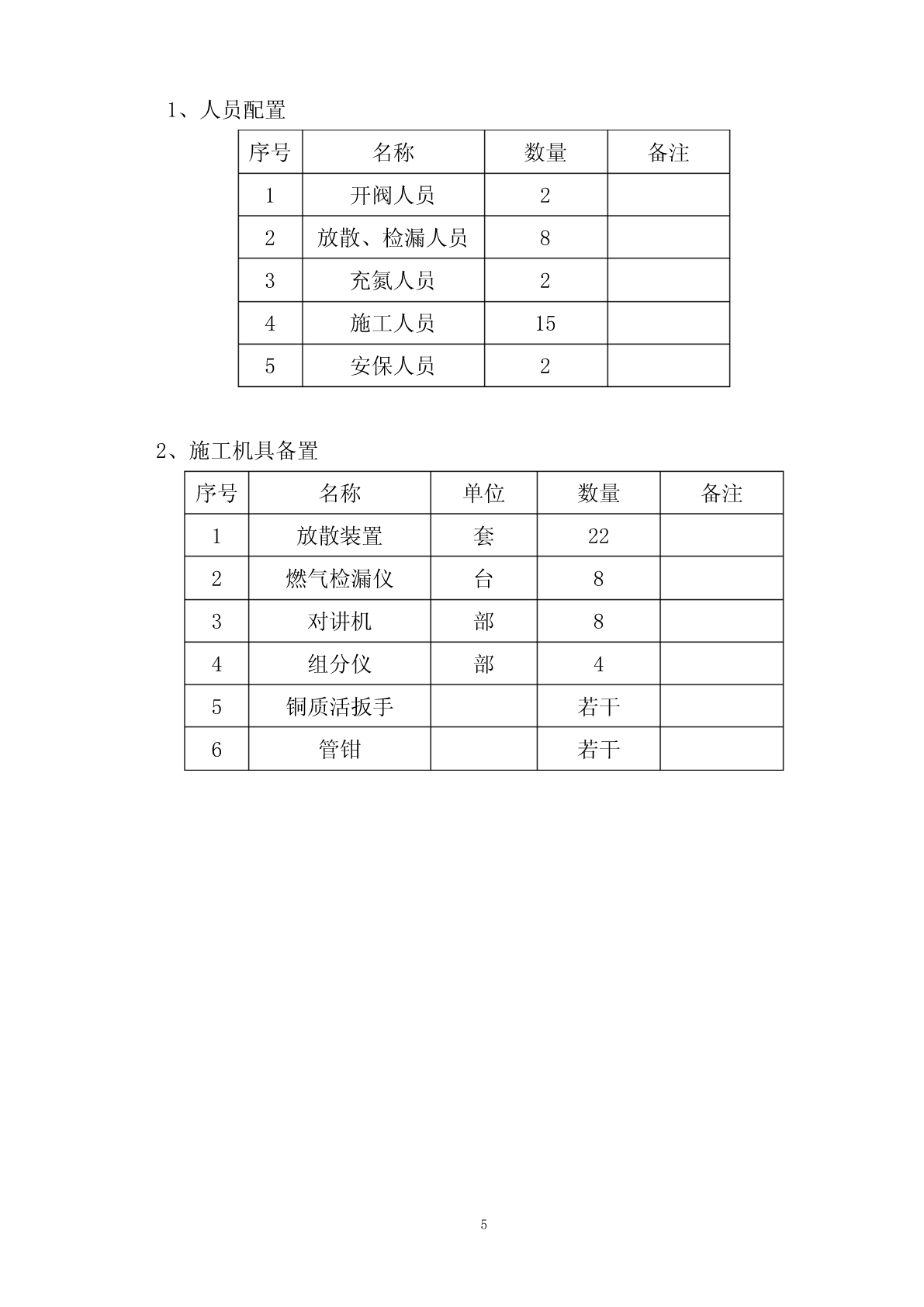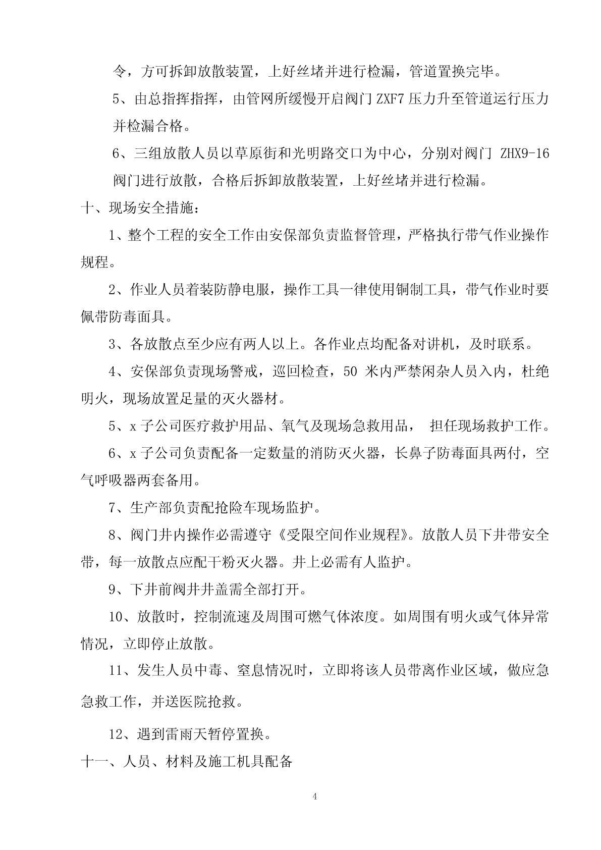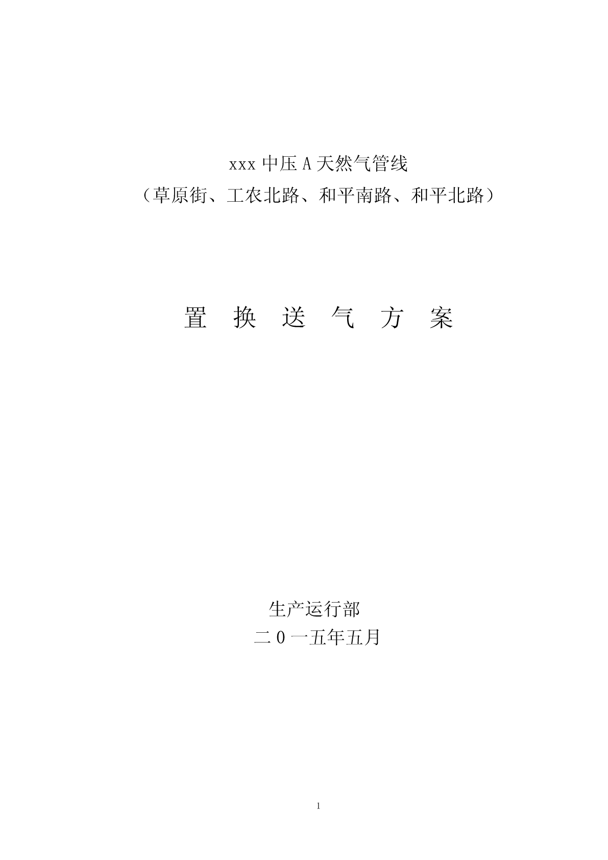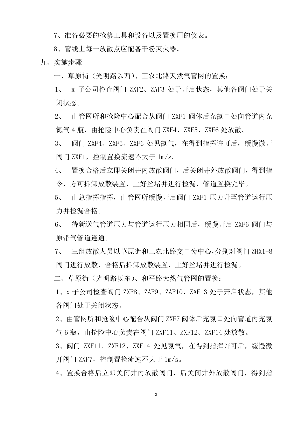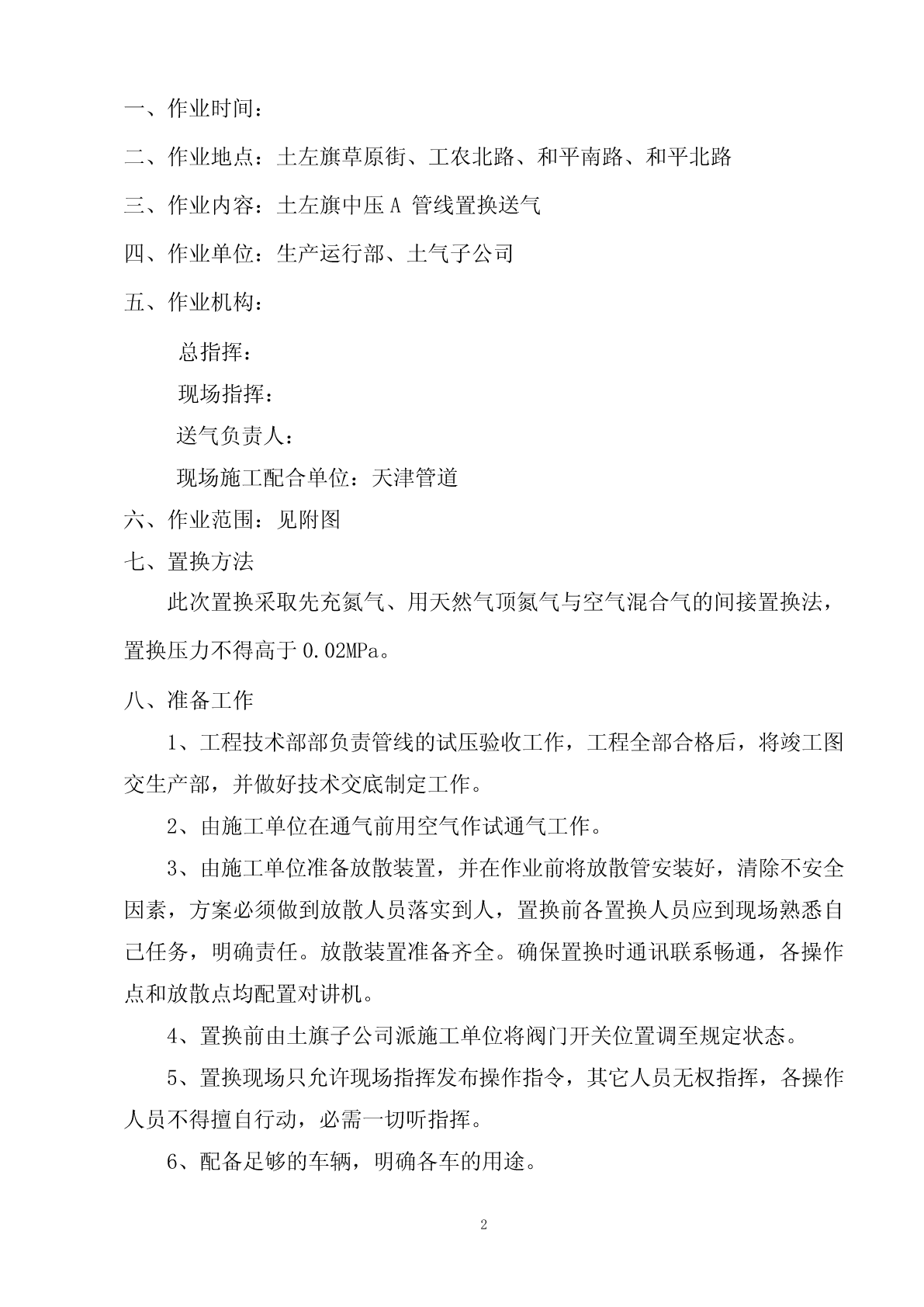xxx中压A天然气管线(草原街、工农北路、和平南路、和平北路)置换送气方案生产运行部二0一五年五月1一、作业时间:二、作业地点:土左旗草原街、工农北路、和平南路、和平北路三、作业内容:土左旗中压A管线置换送气四、作业单位:生产运行部、土气子公司五、作业机构:总指挥:现场指挥:送气负责人:现场施工配合单位:天津管道六、作业范围:见附图七、置换方法此次置换采取先充氮气、用天然气顶氮气与空气混合气的间接置换法,置换压力不得高于0.02MPa。八、准备工作1、工程技术部部负责管线的试压验收工作,工程全部合格后,将竣工图交生产部,并做好技术交底制定工作。2、由施工单位在通气前用空气作试通气工作。3、由施工单位准备放散装置,并在作业前将放散管安装好,清除不安全因素,方案必须做到放散人员落实到人,置换前各置换人员应到现场熟悉自己任务,明确责任。放散装置准备齐全。确保置换时通讯联系畅通,各操作点和放散点均配置对讲机。4、置换前由土旗子公司派施工单位将阀门开关位置调至规定状态。5、置换现场只允许现场指挥发布操作指令,其它人员无权指挥,各操作人员不得擅自行动,必需一切听指挥。6、配备足够的车辆,明确各车的用途。27、准备必要的抢修工具和设备以及置换用的仪表。8、管线上每一放散点应配备干粉灭火器。九、实施步骤一、草原街(光明路以西)、工农北路天然气管网的置换:1、x子公司检查阀门ZXF2、ZAF3处于开启状态,其他各阀门处于关闭状态。2、由管网所和抢险中心配合从阀门ZXF1阀体后充氮口处向管道内充氮气4瓶,由抢险中心负责在阀门ZXF4、ZXF5、ZXF6处放散。3、阀门ZXF4、ZXF5、ZXF6处见氮气,在得到指挥许可后,缓慢微开阀门ZXF1,控制置换流速不大于1m/s。4、置换合格后立即关闭井内放散阀门,后关闭井外放散阀门,得到指令,方可拆卸放散装置,上好丝堵并进行检漏,管道置换完毕。5、由总指挥指挥,由管网所缓慢开启阀门ZXF1压力升至管道运行压力并检漏合格。6、待新送气管道压力与管道运行压力相同后,缓慢开启ZXF6阀门与原带气管道连通。7、三组放散人员以草原街和工农北路交口为中心,分别对阀门ZHX1-8阀门进行放散,合格后拆卸放散装置,上好丝堵并进行检漏。二、草原街(光明路以东)、和平路天然气管网的置换:1、x子公司检查阀门ZXF8、ZAF9、ZAF10、ZAF13处于开启状态,其他各阀门处于关闭状态。2、由管网所和抢险中心配合从阀门ZXF7阀体后充氮口处向管道内充氮气6瓶,由抢险中心负责在阀门ZXF11、ZXF12、ZXF14处放散。3、阀门ZXF11、ZXF12、ZXF14处见氮气,在得到指挥许可后,缓慢微开阀门ZXF7,控制置换流速不大于1m/s。4、置换合格后立即关闭井内放散阀门,后关闭井外放散阀门,得到指3令,方可拆卸放散装置,上好丝堵并进行检漏,管道置换完毕。5、由总指挥指挥,由管网所缓慢开启阀门ZXF7压力升至管道运行压力并检漏合格。6、三组放散人员以草原街和光明路交口为中心,分别对阀门ZHX9-16阀门进行放散,合格后拆卸放散装置,上好丝堵并进行检漏。十、现场安全措施:1、整个工程的安全工作由安保部负责监督管理,严格执行带气作业操作规程。2、作业人员着装防静电服,操作工具一律使用铜制工具,带气作业时要佩带防毒面具。3、各放散点至少应有两人以上。各作业点均配备对讲机,及时联系。4、安保部负责现场警戒,巡回检查,50米内严禁闲杂人员入内,杜绝明火,现场放置足量的灭火器材。5、x子公司医疗救护用品、氧气及现场急救用品,担任现场救护工作。6、x子公司负责配备一定数量的消防灭火器,长鼻子防毒面具两付,空气呼吸器两套备用。7、生产部负责配抢险车现场监护。8、阀门井内操作必需遵守《受限空间作业规程》。放散人员下井带安全带,每一放散点应配干粉灭火器。井上必需有人监护。9、下井前阀井井盖需全部打开。10、放散时,控制流速及周围可燃气体浓度。如周围有明火或气体异常情况,立即停止放散。11、发生人员中毒、窒息情况时,立即将该人员带离作业区域,做应急急救工作,并送医院抢救。12、遇到雷雨天暂停置换。十一、人员、材料及施工机具配备41、人员配置序号名称数量备注1开阀人员22放散、检漏人员83充氮人员24施工人员155安保人员22、施工机具备置序号名称单位数量备注1放散装置套222燃气检漏仪台83对讲机部84组分仪部45铜质活扳手若干6管钳若干5