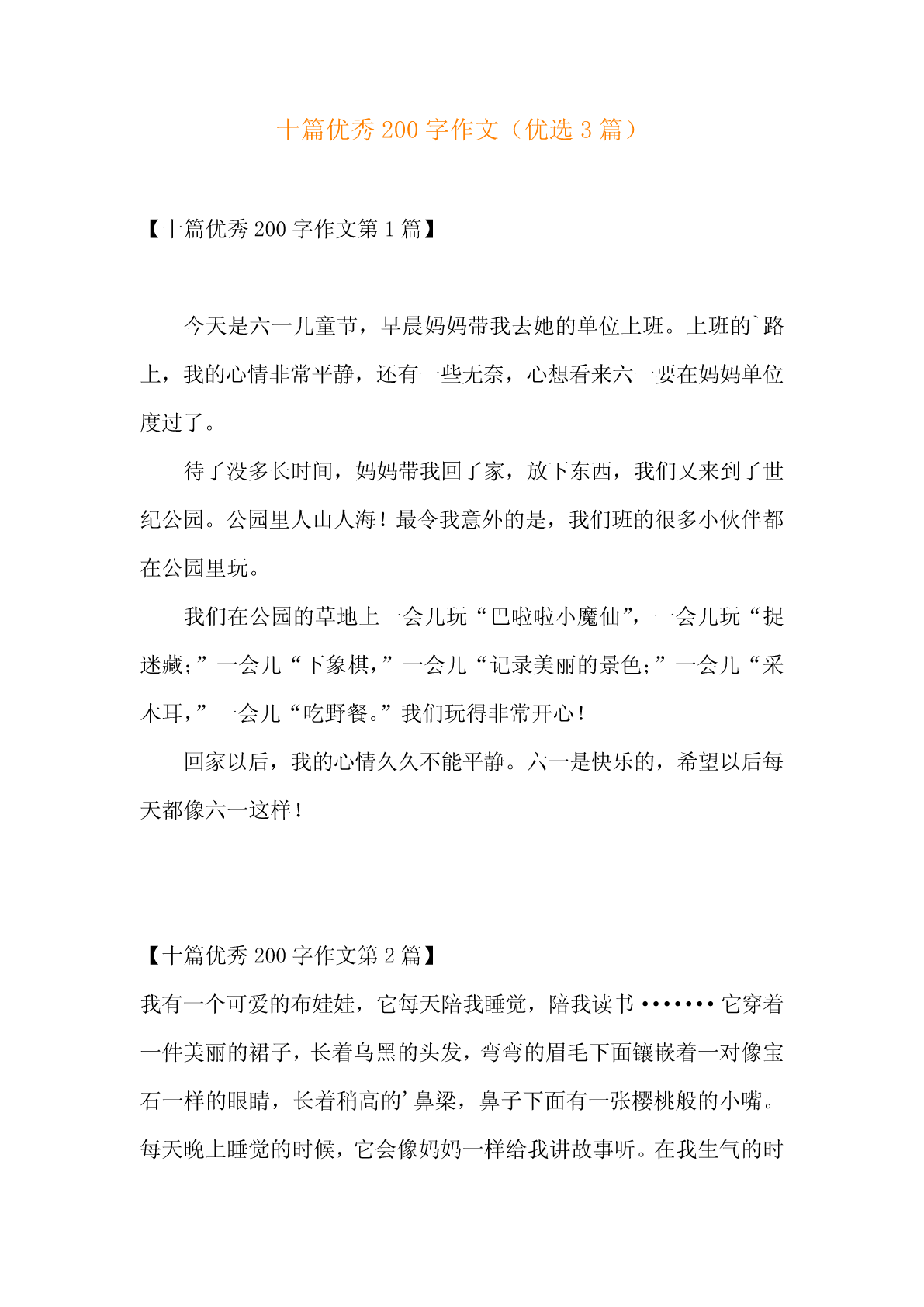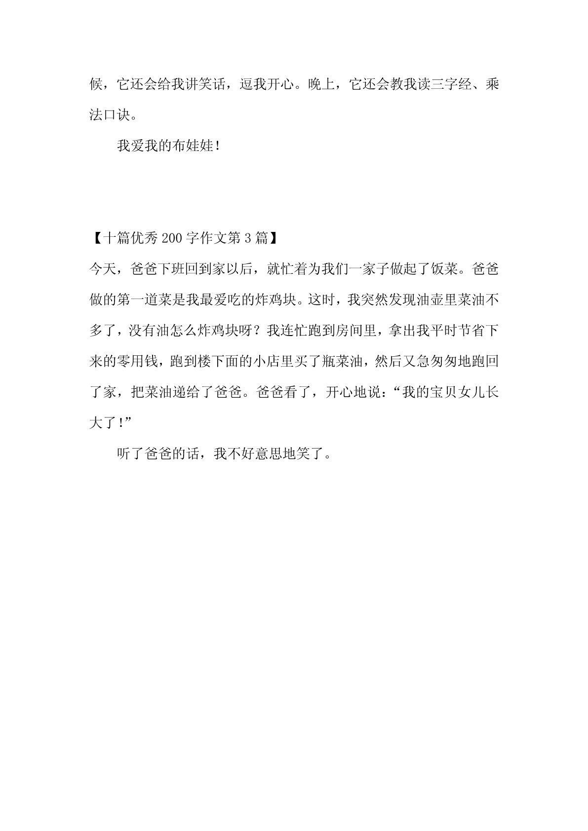 十篇优秀200字作文(优选3篇)【十篇优秀200字作文第1篇】今天是六一儿童节,早晨妈妈带我去她的单位上班。上班的`路上,我的心情非常平静,还有一些无奈,心想看来六一要在妈妈单位度过了。待了没多长时间,妈妈带我回了家,放下东西,我们又来到了世纪公园。公园里人山人海!最令我意外的是,我们班的很多小伙伴都在公园里玩。我们在公园的草地上一会儿玩“巴啦啦小魔仙”,一会儿玩“捉迷藏;”一会儿“下象棋,”一会儿“记录美丽的景色;”一会儿“采木耳,”一会儿“吃野餐。”我们玩得非常开心!回家以后,我的心情久久不能平静。六一是快乐的,希望以后每天都像六一这样!【十篇优秀200字作文第2篇】我有一个可爱的布娃娃,它每天陪我睡觉,陪我读书·······它穿着一件美丽的裙子,长着乌黑的头发,弯弯的眉毛下面镶嵌着一对像宝石一样的眼睛,长着稍高的'鼻梁,鼻子下面有一张樱桃般的小嘴。每天晚上睡觉的时候,它会像妈妈一样给我讲故事听。在我生气的时候,它还会给我讲笑话,逗我开心。晚上,它还会教我读三字经、乘法口诀。我爱我的布娃娃!【十篇优秀200字作文第3篇】今天,爸爸下班回到家以后,就忙着为我们一家子做起了饭菜。爸爸做的第一道菜是我最爱吃的炸鸡块。这时,我突然发现油壶里菜油不多了,没有油怎么炸鸡块呀?我连忙跑到房间里,拿出我平时节省下来的零用钱,跑到楼下面的小店里买了瓶菜油,然后又急匆匆地跑回了家,把菜油递给了爸爸。爸爸看了,开心地说:“我的宝贝女儿长大了!”听了爸爸的话,我不好意思地笑了。
