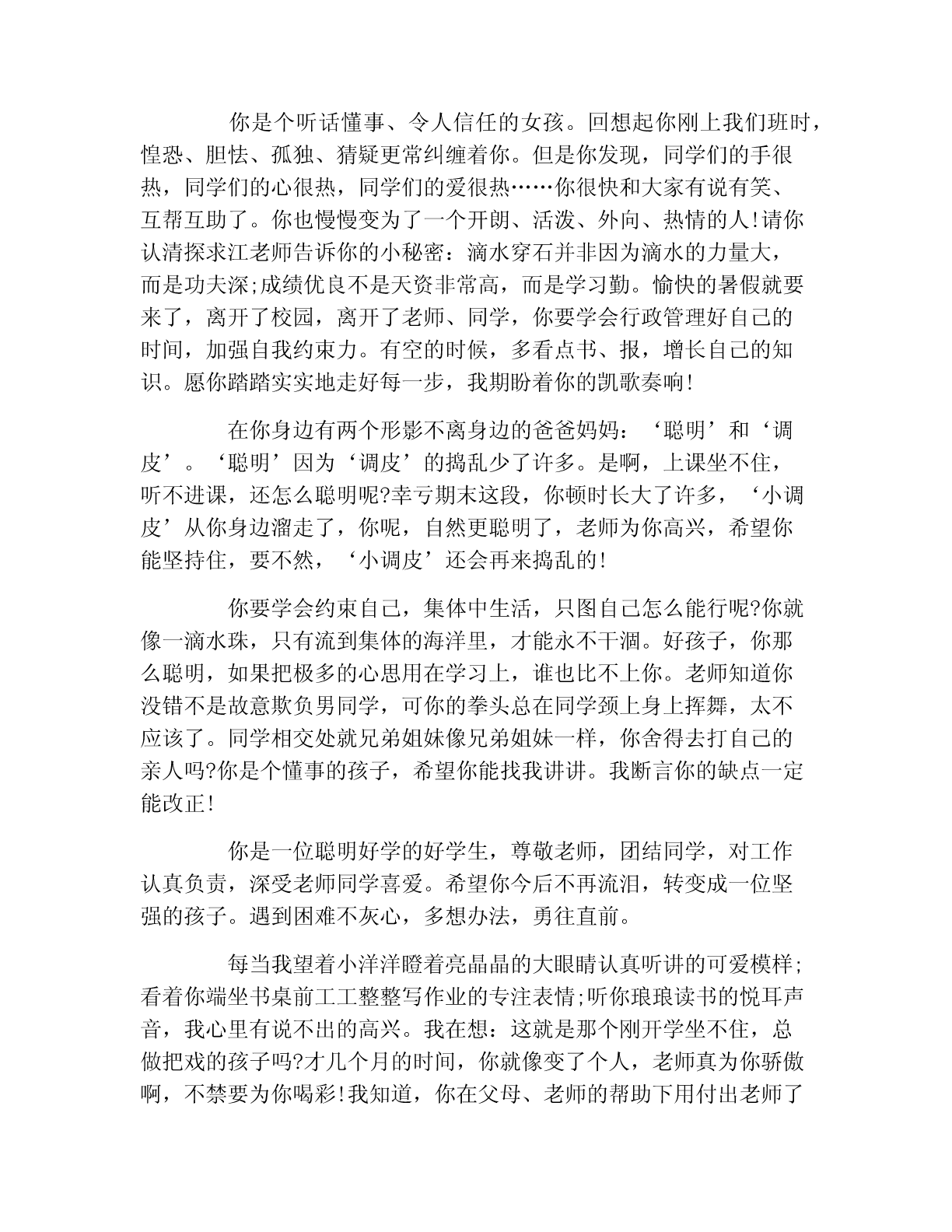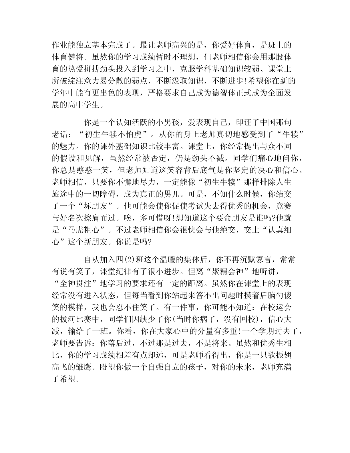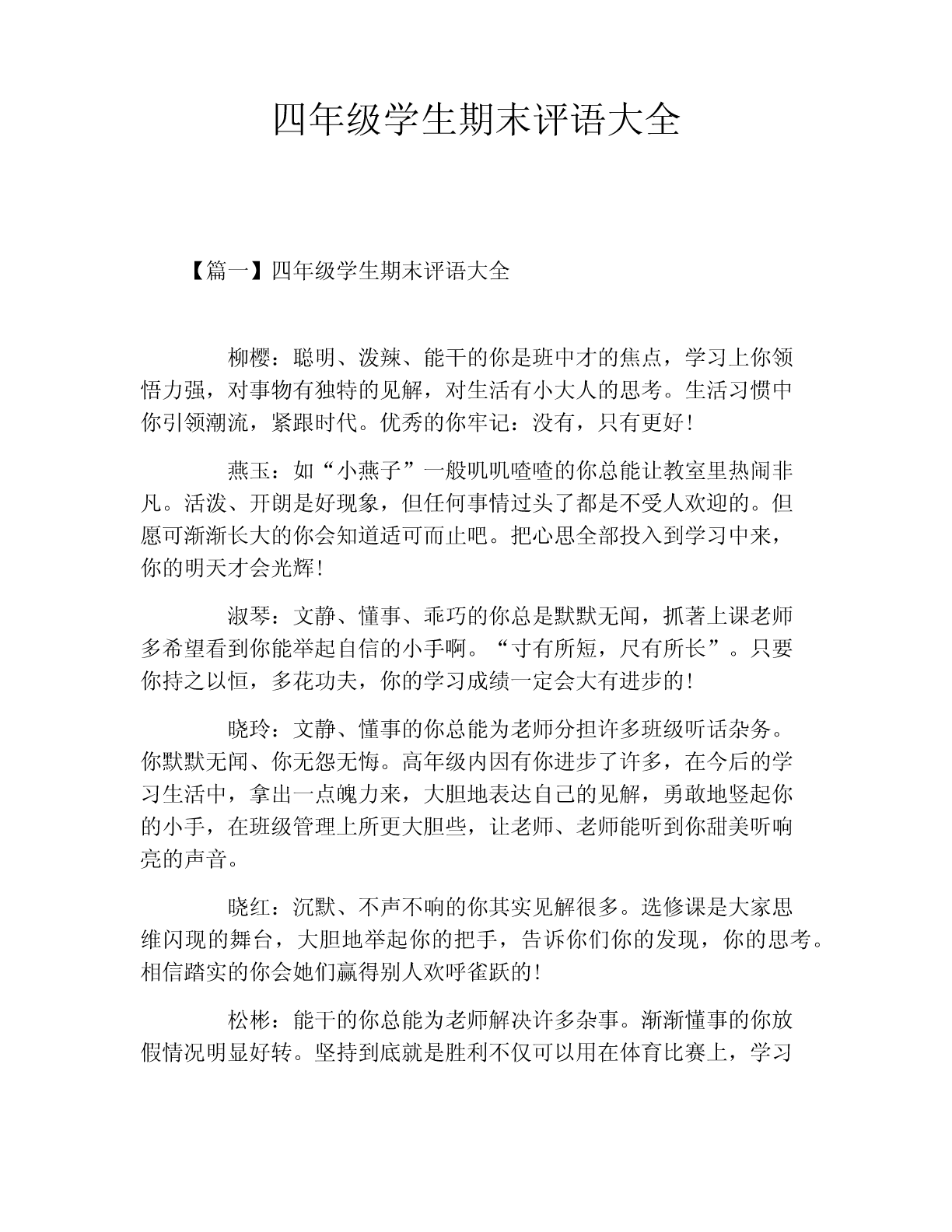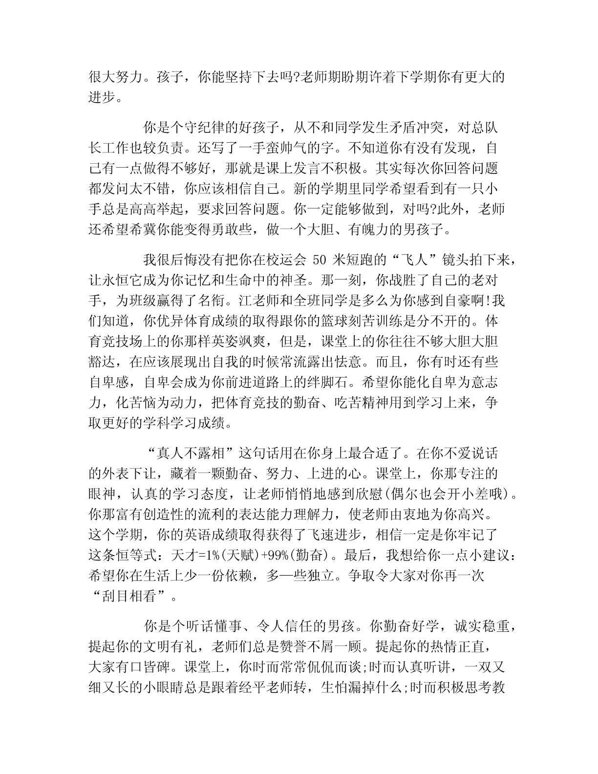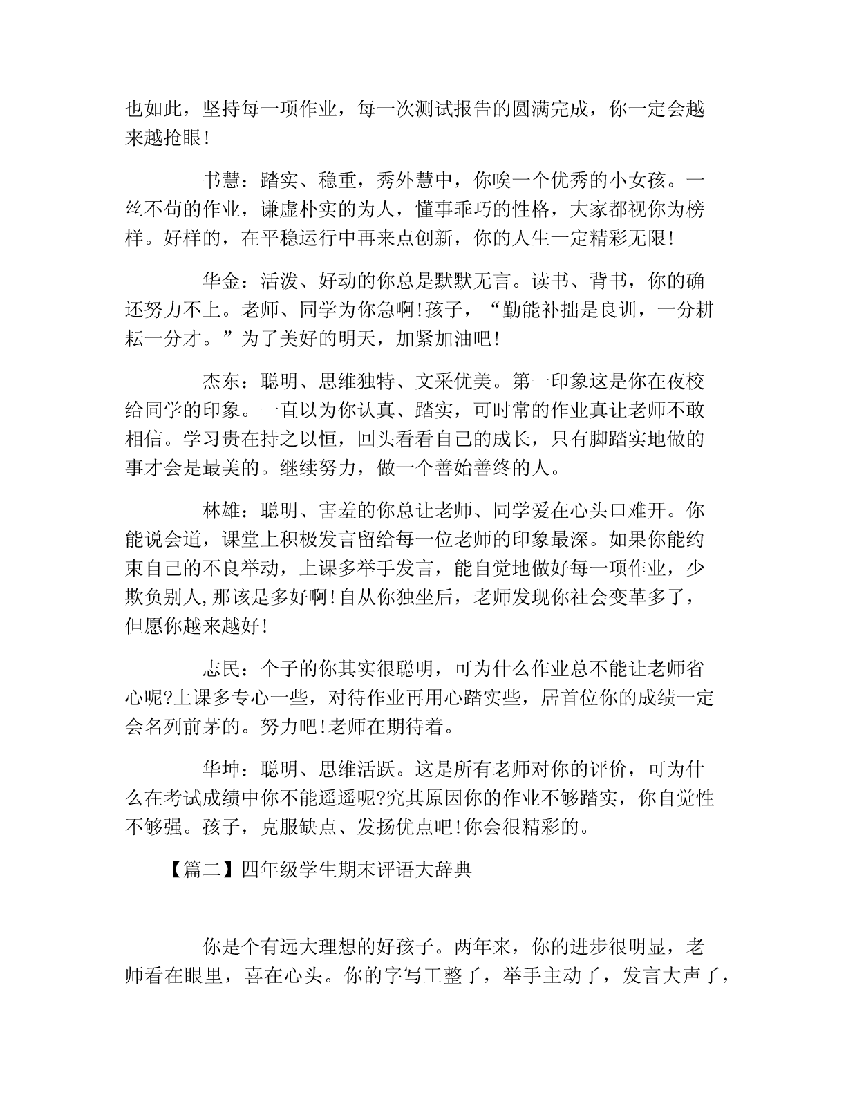 四年级学生期末评语大全【篇一】四年级学生期末评语大全柳樱:聪明、泼辣、能干的你是班中才的焦点,学习上你领悟力强,对事物有独特的见解,对生活有小大人的思考。生活习惯中你引领潮流,紧跟时代。优秀的你牢记:没有,只有更好!燕玉:如“小燕子”一般叽叽喳喳的你总能让教室里热闹非凡。活泼、开朗是好现象,但任何事情过头了都是不受人欢迎的。但愿可渐渐长大的你会知道适可而止吧。把心思全部投入到学习中来,你的明天才会光辉!淑琴:文静、懂事、乖巧的你总是默默无闻,抓著上课老师多希望看到你能举起自信的小手啊。“寸有所短,尺有所长”。只要你持之以恒,多花功夫,你的学习成绩一定会大有进步的!晓玲:文静、懂事的你总能为老师分担许多班级听话杂务。你默默无闻、你无怨无悔。高年级内因有你进步了许多,在今后的学习生活中,拿出一点魄力来,大胆地表达自己的见解,勇敢地竖起你的小手,在班级管理上所更大胆些,让老师、老师能听到你甜美听响亮的声音。晓红:沉默、不声不响的你其实见解很多。选修课是大家思维闪现的舞台,大胆地举起你的把手,告诉你们你的发现,你的思考。相信踏实的你会她们赢得别人欢呼雀跃的!松彬:能干的你总能为老师解决许多杂事。渐渐懂事的你放假情况明显好转。坚持到底就是胜利不仅可以用在体育比赛上,学习也如此,坚持每一项作业,每一次测试报告的圆满完成,你一定会越来越抢眼!书慧:踏实、稳重,秀外慧中,你唉一个优秀的小女孩。一丝不苟的作业,谦虚朴实的为人,懂事乖巧的性格,大家都视你为榜样。好样的,在平稳运行中再来点创新,你的人生一定精彩无限!华金:活泼、好动的你总是默默无言。读书、背书,你的确还努力不上。老师、同学为你急啊!孩子,“勤能补拙是良训,一分耕耘一分才。”为了美好的明天,加紧加油吧!杰东:聪明、思维独特、文采优美。第一印象这是你在夜校给同学的印象。一直以为你认真、踏实,可时常的作业真让老师不敢相信。学习贵在持之以恒,回头看看自己的成长,只有脚踏实地做的事才会是最美的。继续努力,做一个善始善终的人。林雄:聪明、害羞的你总让老师、同学爱在心头口难开。你能说会道,课堂上积极发言留给每一位老师的印象最深。如果你能约束自己的不良举动,上课多举手发言,能自觉地做好每一项作业,少欺负别人,那该是多好啊!自从你独坐后,老师发现你社会变革多了,但愿你越来越好!志民:个子的你其实很聪明,可为什么作业总不能让老师省心呢?上课多专心一些,对待作业再用心踏实些,居首位你的成绩一定会名列前茅的。努力吧!老师在期待着。华坤:聪明、思维活跃。这是所有老师对你的评价,可为什么在考试成绩中你不能遥遥呢?究其原因你的作业不够踏实,你自觉性不够强。孩子,克服缺点、发扬优点吧!你会很精彩的。【篇二】四年级学生期末评语大辞典你是个有远大理想的好孩子。两年来,你的进步很明显,老师看在眼里,喜在心头。你的字写工整了,举手主动了,发言大声了,作业能独立基本完成了。最让老师高兴的是,你爱好体育,是班上的体育健将。虽然你的学习成绩暂时不理想,但老师相信你会用那股体育的热爱拼搏劲头投入到学习之中,克服学科基础知识较弱、课堂上所破绽注意力易分散的弱点,不断汲取知识,不断进步!希望你在新的学年中能有更出色的表现,严格要求自己成为德智体正式成为全面发展的高中学生。你是一个认知活跃的小男孩,爱表现自己,印证了中国那句老话:“初生牛犊不怕虎”。从你的身上老师真切地感受到了“牛犊”的魅力。你的课外基础知识比较丰富。课堂上,你经常提出与众不同的假设和见解,虽然经常被否定,仍是劲头不减。同学们痛心地问你,你总是憨憨一笑,但老师知道这笑容背后底气是你坚定的决心和信心。老师相信,只要你不懈地尽力,一定能像“初生牛犊”那样排除人生旅途中的一切障碍,成为真正的男儿。可是,不知什么时候,你结交了一个“坏朋友”。他可能会使你促使考试失去得优秀的机会,竞赛与好名次擦肩而过。唉,多可惜呀!想知道这个要命朋友是谁吗?他就是“马虎粗心”。不过老师相信你会很快会与他绝交,交上“认真细心”这个新朋友。你说是吗?自从加入四(2)班这个温暖的集体后,你不再沉默寡言,常常有说有笑了,课堂纪律有了很小进步。但离“聚精会神”地听讲,“全神贯注”地学习的要求还有一定的距离。虽然你在课堂上的表现经常没有进入状态,但每当看到你站起来答不出问题时摸着后脑勺傻笑的模样,我也会忍不住笑了。有一件事,你可能不知道:在校运会的拔河比赛中,同学们因缺少了你(当时你病了,没有回校),信心大减,输给了一班。你看,你在大家心中的分量有多重!一个学期过去了,老师要告诉:你落后过,不过那是过去,不是将来。虽然和优秀生相比,你的学习成绩相差有点却远,可是老师看得出,你是一只欲振翅高飞的雏鹰。盼望你做一个自强自立的孩子,对你的未来,老师充满了希望。你是个听话懂事、令人信任的女孩。回想起你刚上我们班时