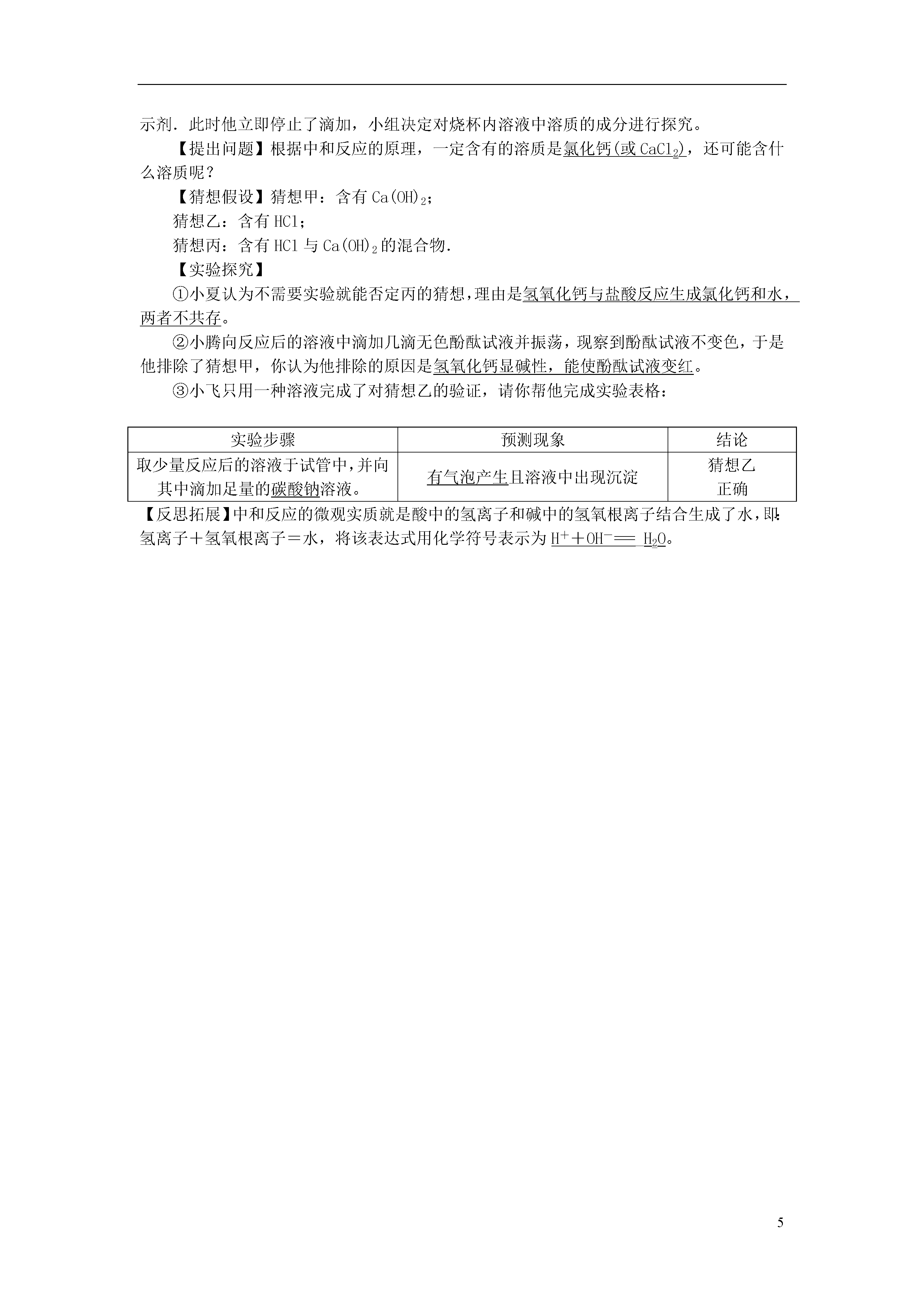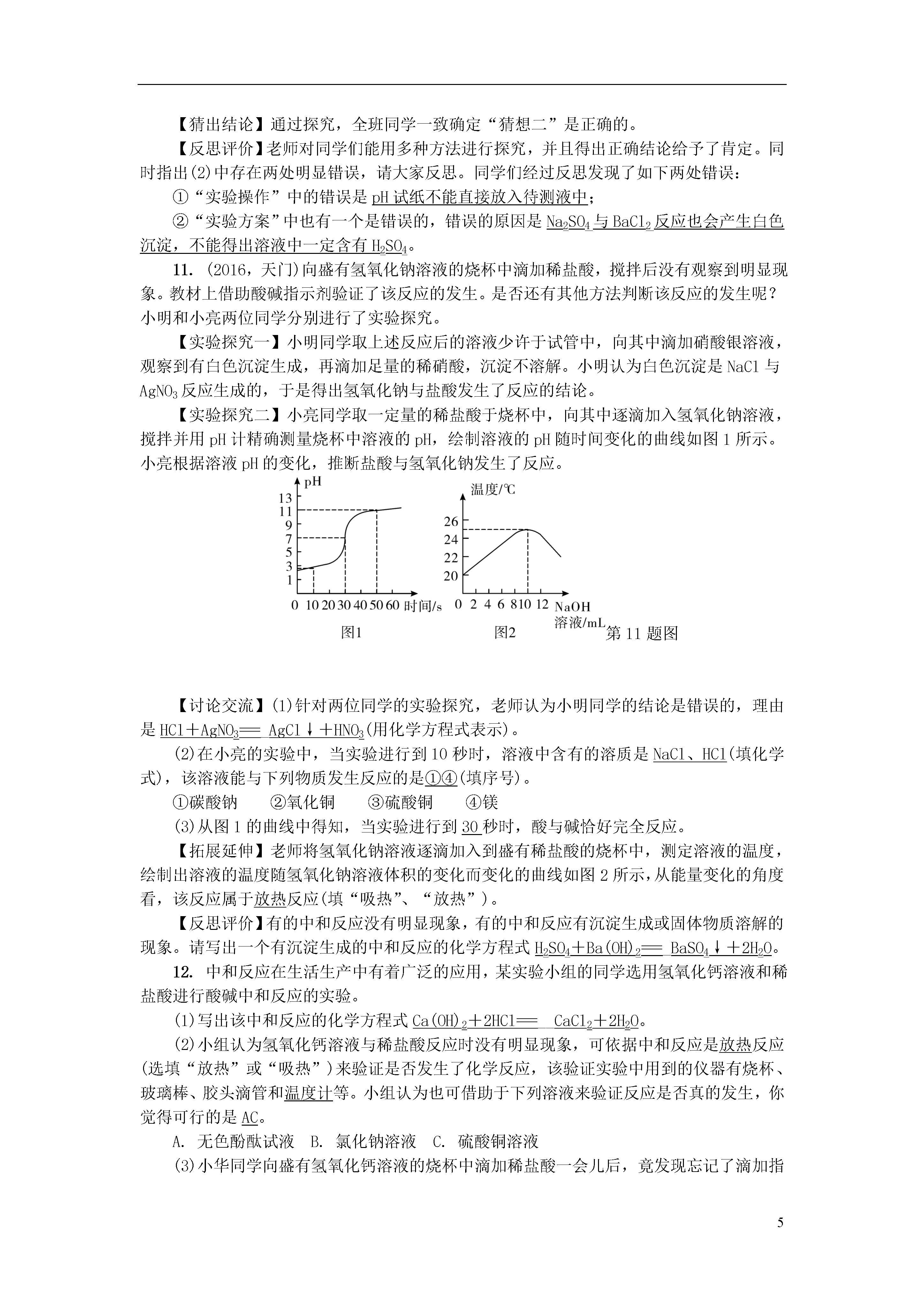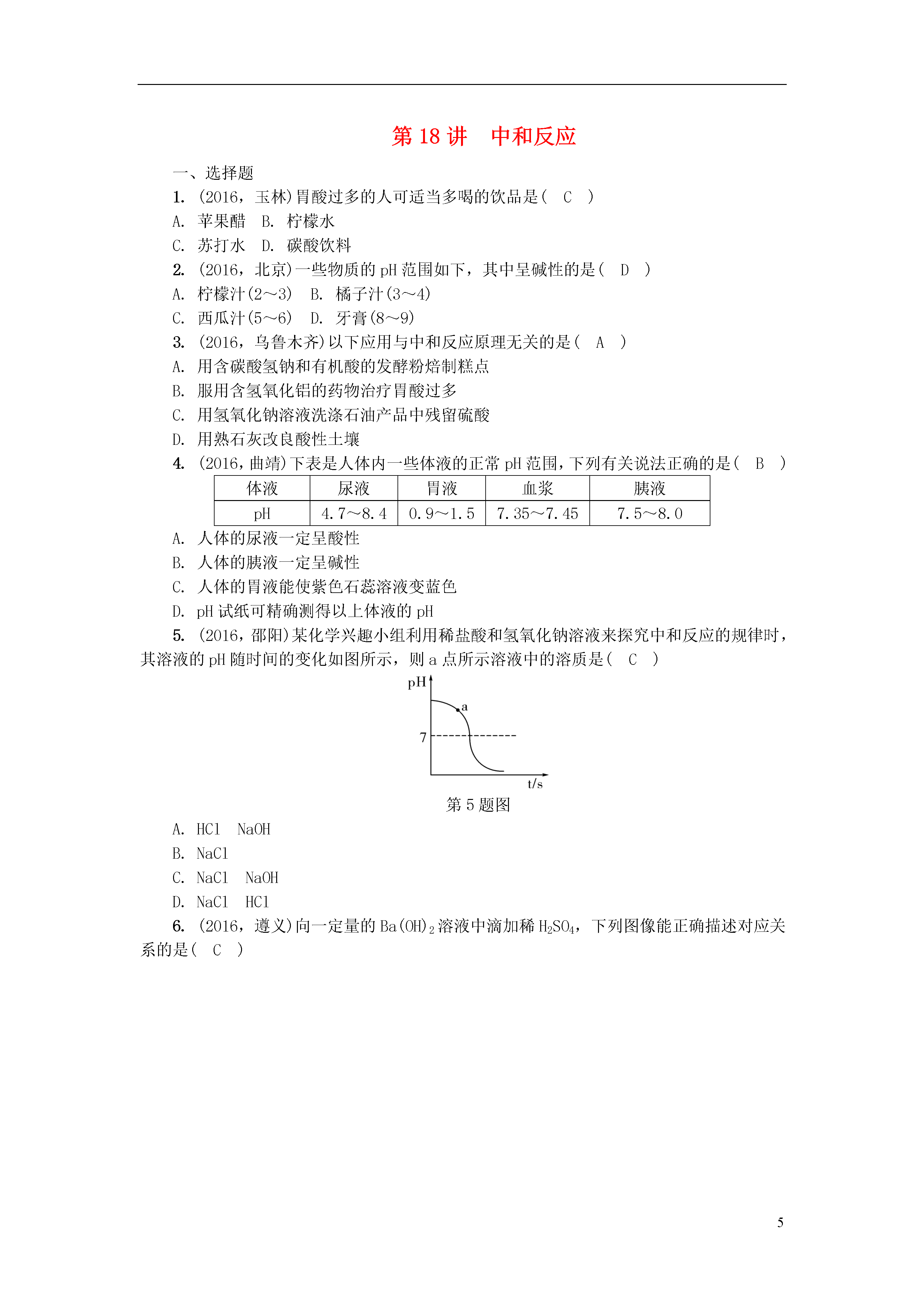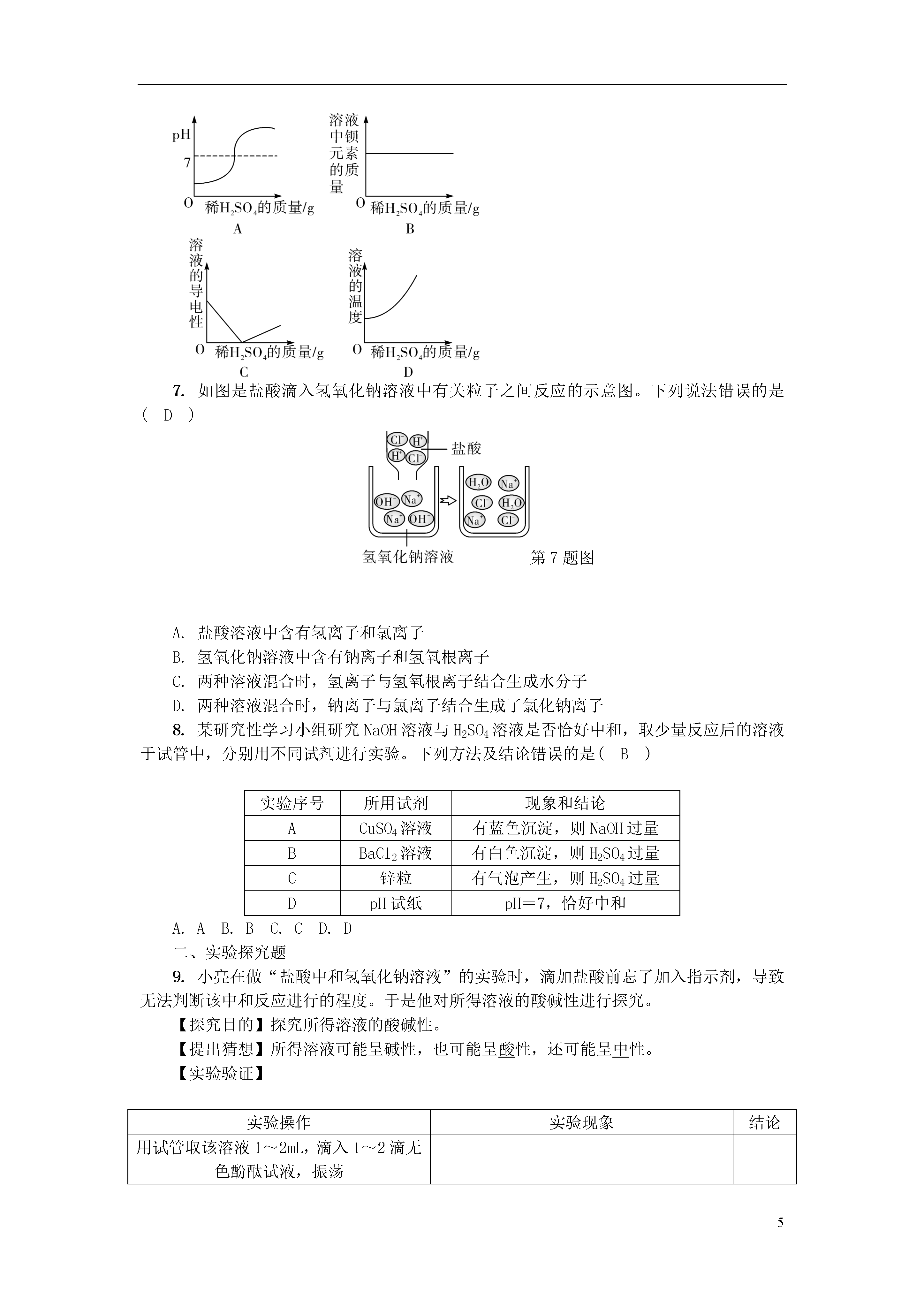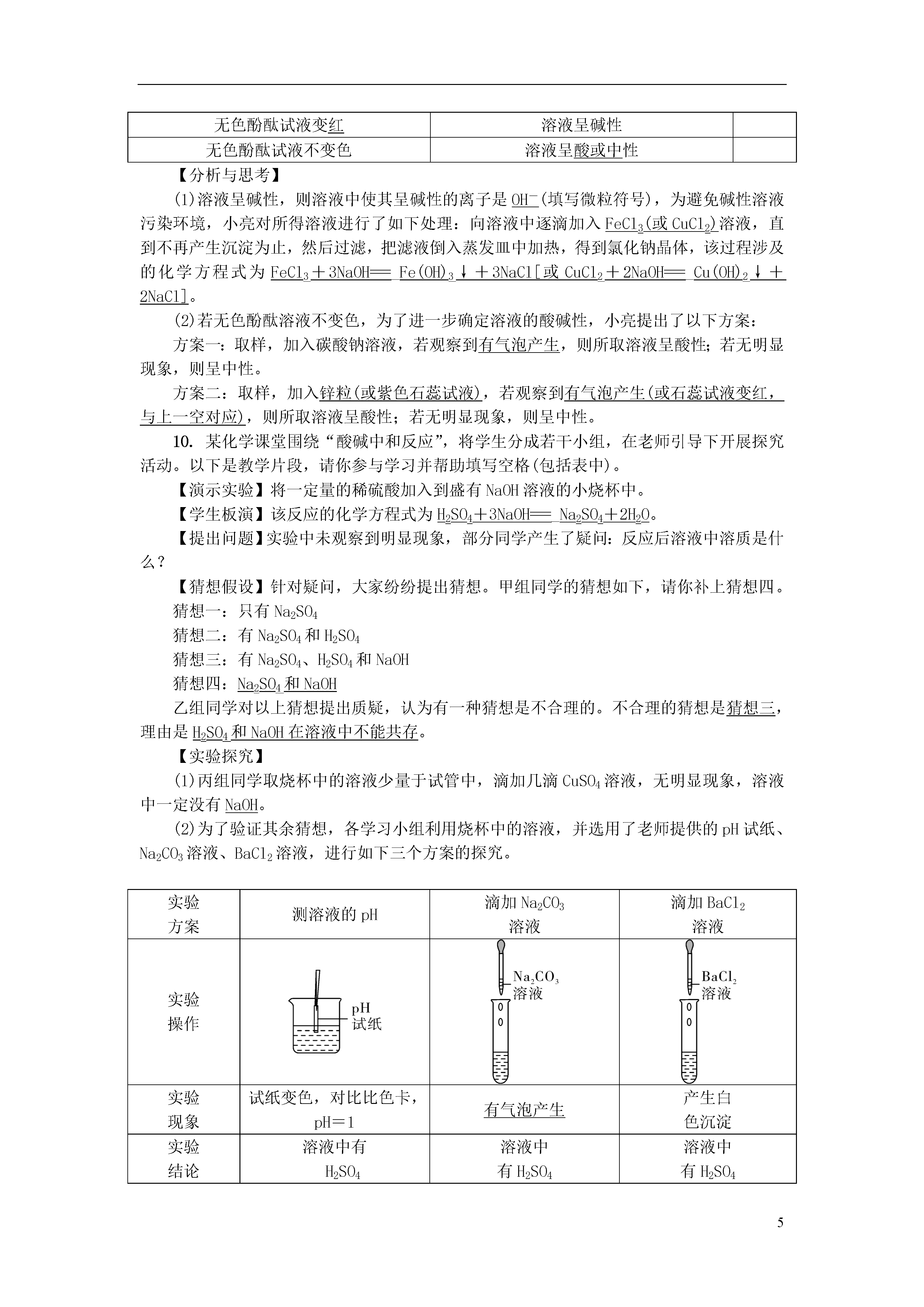 5第18讲中和反应一、选择题1.(2016,玉林)胃酸过多的人可适当多喝的饮品是(C)A.苹果醋B.柠檬水C.苏打水D.碳酸饮料2.(2016,北京)一些物质的pH范围如下,其中呈碱性的是(D)A.柠檬汁(2~3)B.橘子汁(3~4)C.西瓜汁(5~6)D.牙膏(8~9)3.(2016,乌鲁木齐)以下应用与中和反应原理无关的是(A)A.用含碳酸氢钠和有机酸的发酵粉焙制糕点B.服用含氢氧化铝的药物治疗胃酸过多C.用氢氧化钠溶液洗涤石油产品中残留硫酸D.用熟石灰改良酸性土壤4.(2016,曲靖)下表是人体内一些体液的正常pH范围,下列有关说法正确的是(B)体液尿液胃液血浆胰液pH4.7~8.40.9~1.57.35~7.457.5~8.0A.人体的尿液一定呈酸性B.人体的胰液一定呈碱性C.人体的胃液能使紫色石蕊溶液变蓝色D.pH试纸可精确测得以上体液的pH5.(2016,邵阳)某化学兴趣小组利用稀盐酸和氢氧化钠溶液来探究中和反应的规律时,其溶液的pH随时间的变化如图所示,则a点所示溶液中的溶质是(C)第5题图A.HClNaOHB.NaClC.NaClNaOHD.NaClHCl6.(2016,遵义)向一定量的Ba(OH)2溶液中滴加稀H2SO4,下列图像能正确描述对应关系的是(C)7.如图是盐酸滴入氢氧化钠溶液中有关粒子之间反应的示意图。下列说法错误的是(D)第7题图A.盐酸溶液中含有氢离子和氯离子B.氢氧化钠溶液中含有钠离子和氢氧根离子C.两种溶液混合时,氢离子与氢氧根离子结合生成水分子D.两种溶液混合时,钠离子与氯离子结合生成了氯化钠离子8.某研究性学习小组研究NaOH溶液与H2SO4溶液是否恰好中和,取少量反应后的溶液于试管中,分别用不同试剂进行实验。下列方法及结论错误的是(B)实验序号所用试剂现象和结论ACuSO4溶液有蓝色沉淀,则NaOH过量BBaCl2溶液有白色沉淀,则H2SO4过量C锌粒有气泡产生,则H2SO4过量DpH试纸pH=7,恰好中和A.AB.BC.CD.D二、实验探究题9.小亮在做“盐酸中和氢氧化钠溶液”的实验时,滴加盐酸前忘了加入指示剂,导致无法判断该中和反应进行的程度。于是他对所得溶液的酸碱性进行探究。【探究目的】探究所得溶液的酸碱性。【提出猜想】所得溶液可能呈碱性,也可能呈酸性,还可能呈中性。【实验验证】实验操作实验现象结论用试管取该溶液1~2mL,滴入1~2滴无色酚酞试液,振荡无色酚酞试液变红溶液呈碱性无色酚酞试液不变色溶液呈酸或中性【分析与思考】(1)溶液呈碱性,则溶液中使其呈碱性的离子是OH-(填写微粒符号),为避免碱性溶液污染环境,小亮对所得溶液进行了如下处理:向溶液中逐滴加入FeCl3(或CuCl2)溶液,直到不再产生沉淀为止,然后过滤,把滤液倒入蒸发皿中加热,得到氯化钠晶体,该过程涉及的化学方程式为FeCl3+3NaOH===_Fe(OH)3↓+3NaCl[或CuCl2+2NaOH===_Cu(OH)2↓+2NaCl]。(2)若无色酚酞溶液不变色,为了进一步确定溶液的酸碱性,小亮提出了以下方案:方案一:取样,加入碳酸钠溶液,若观察到有气泡产生,则所取溶液呈酸性;若无明显现象,则呈中性。方案二:取样,加入锌粒(或紫色石蕊试液),若观察到有气泡产生(或石蕊试液变红,与上一空对应),则所取溶液呈酸性;若无明显现象,则呈中性。10.某化学课堂围绕“酸碱中和反应”,将学生分成若干小组,在老师引导下开展探究活动。以下是教学片段,请你参与学习并帮助填写空格(包括表中)。【演示实验】将一定量的稀硫酸加入到盛有NaOH溶液的小烧杯中。【学生板演】该反应的化学方程式为H2SO4+3NaOH===_Na2SO4+2H2O。【提出问题】实验中未观察到明显现象,部分同学产生了疑问:反应后溶液中溶质是什么?【猜想假设】针对疑问,大家纷纷提出猜想。甲组同学的猜想如下,请你补上猜想四。猜想一:只有Na2SO4猜想二:有Na2SO4和H2SO4猜想三:有Na2SO4、H2SO4和NaOH猜想四:Na2SO4和NaOH乙组同学对以上猜想提出质疑,认为有一种猜想是不合理的。不合理的猜想是猜想三,理由是H2SO4和NaOH在溶液中不能共存。【实验探究】(1)丙组同学取烧杯中的溶液少量于试管中,滴加几滴CuSO4溶液,无明显现象,溶液中一定没有NaOH。(2)为了验证其余猜想,各学习小组利用烧杯中的溶液,并选用了老师提供的pH试纸、Na2CO3溶液、BaCl2溶液,进行如下三个方案的探究。实验方案测溶液的pH滴加Na2CO3溶液滴加BaCl2溶液实验操作实验现象试纸变色,对比比色卡,