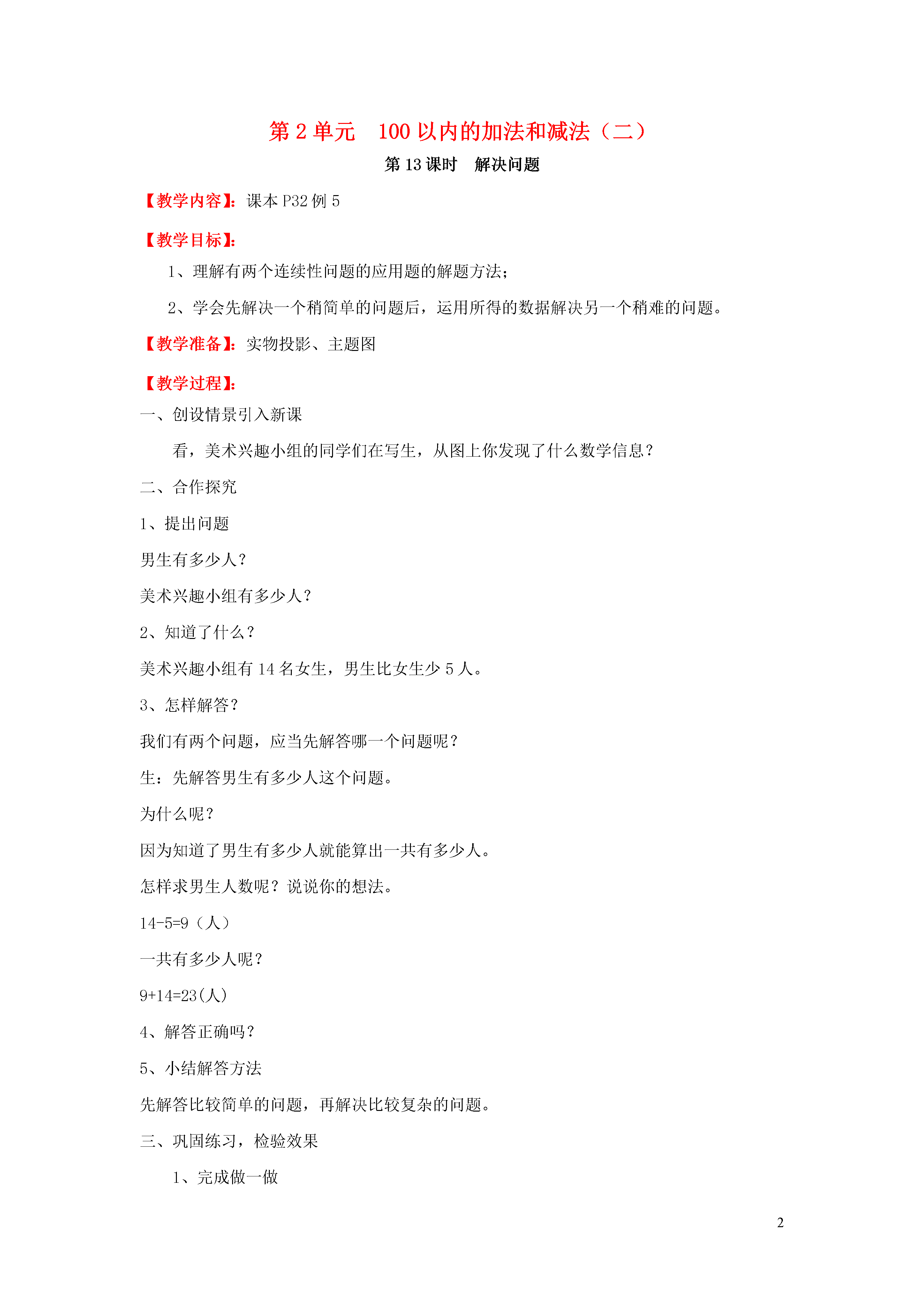 2第2单元100以内的加法和减法(二)第13课时解决问题【教学内容】:课本P32例5【教学目标】:1、理解有两个连续性问题的应用题的解题方法;2、学会先解决一个稍简单的问题后,运用所得的数据解决另一个稍难的问题。【教学准备】:实物投影、主题图【教学过程】:一、创设情景引入新课看,美术兴趣小组的同学们在写生,从图上你发现了什么数学信息?二、合作探究1、提出问题男生有多少人?美术兴趣小组有多少人?2、知道了什么?美术兴趣小组有14名女生,男生比女生少5人。3、怎样解答?我们有两个问题,应当先解答哪一个问题呢?生:先解答男生有多少人这个问题。为什么呢?因为知道了男生有多少人就能算出一共有多少人。怎样求男生人数呢?说说你的想法。14-5=9(人)一共有多少人呢?9+14=23(人)4、解答正确吗?5、小结解答方法先解答比较简单的问题,再解决比较复杂的问题。三、巩固练习,检验效果1、完成做一做全班交流解决方法2、完成P33练习六第1题学生分小组讨论完成。学生汇报,并说明是怎样思考的。3、完成练习六第2题看图理解题意,思考解题方法。学生汇报,并说明解答方法。四、课堂总结:通过今天的学习,我们又学会了什么?学生汇报,教师引导梳理。五、随堂练习【教学反思】: