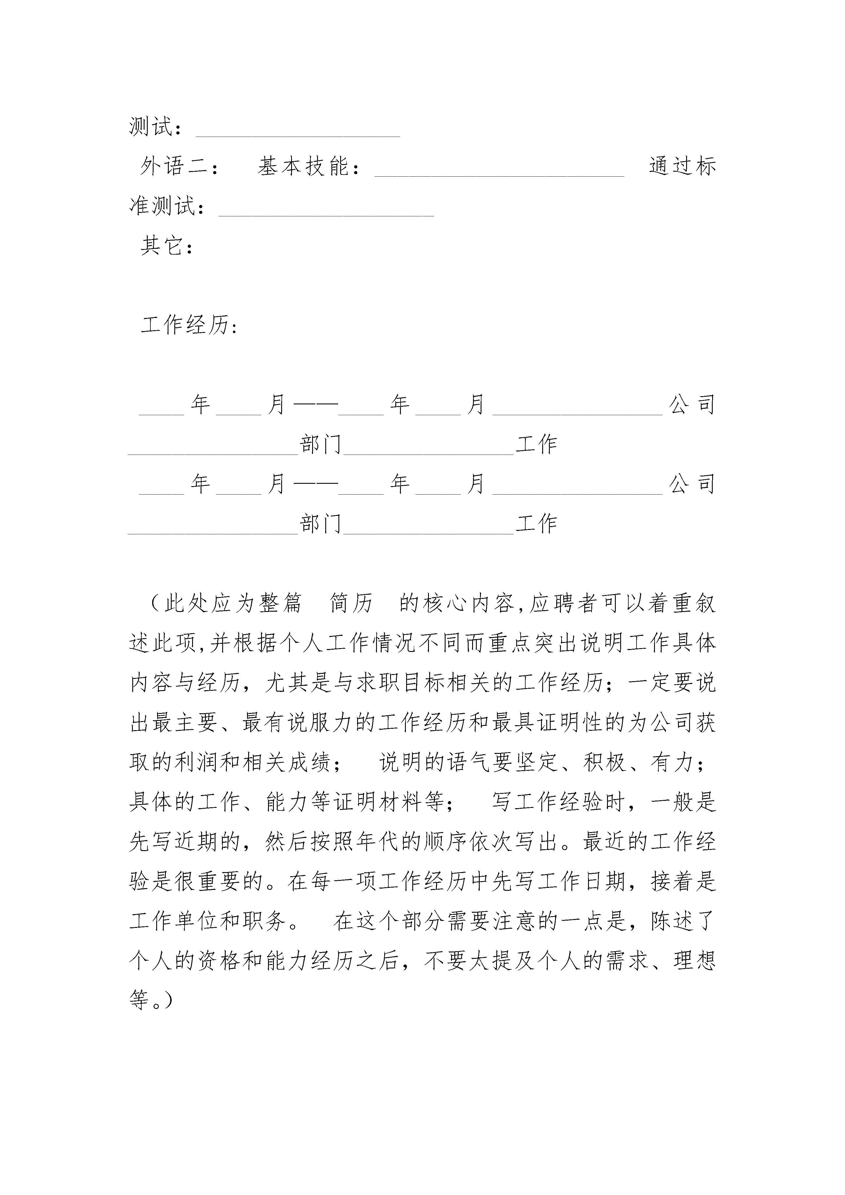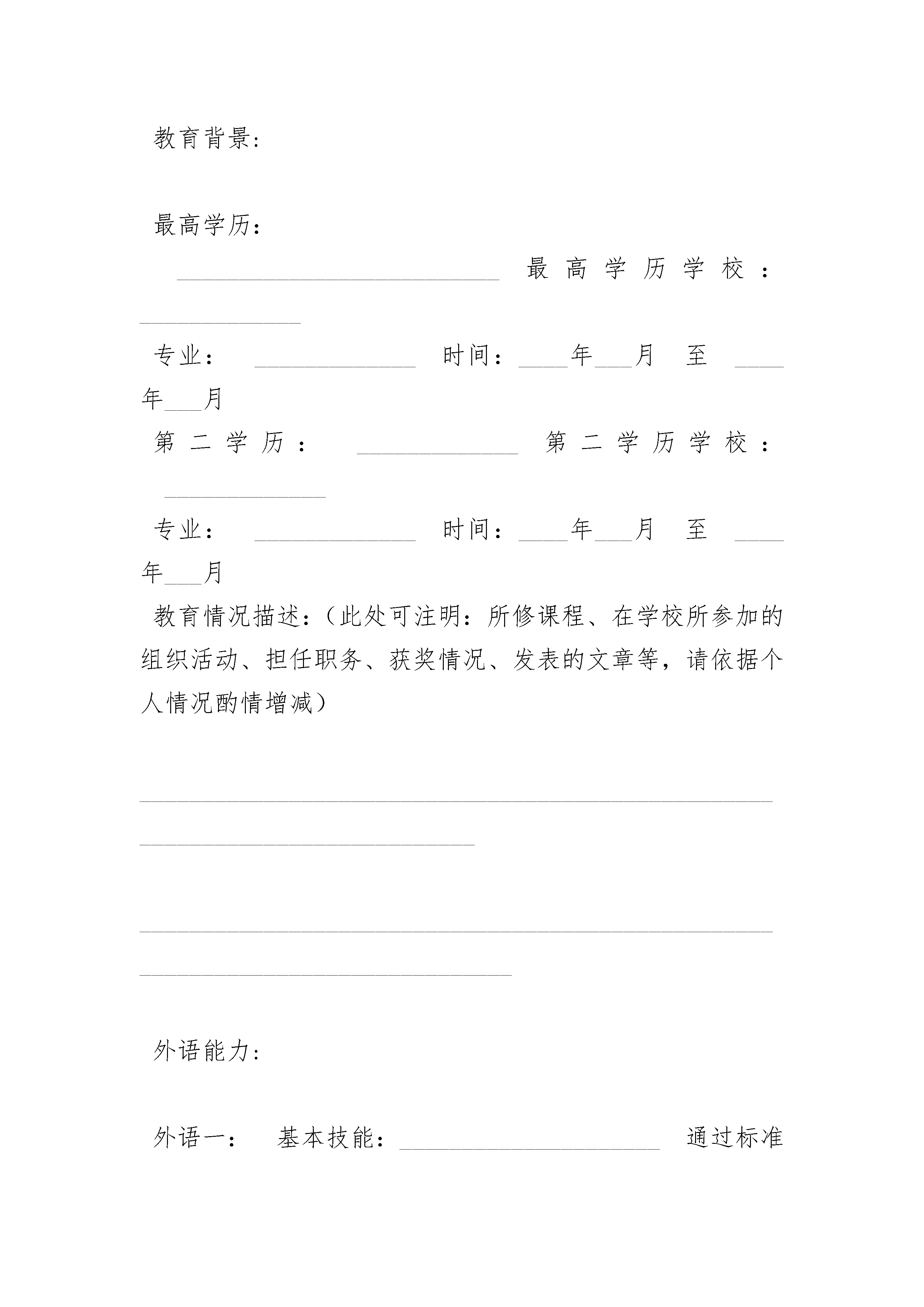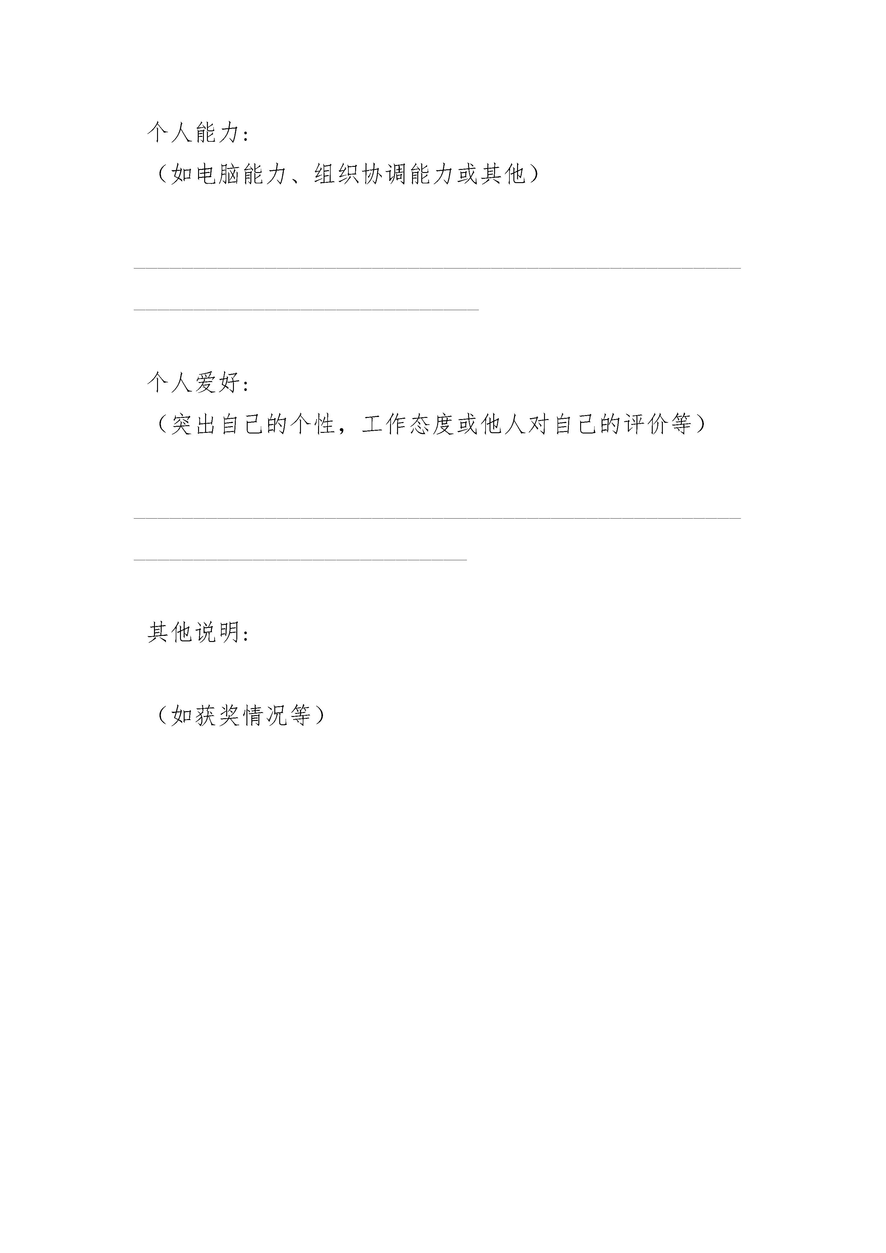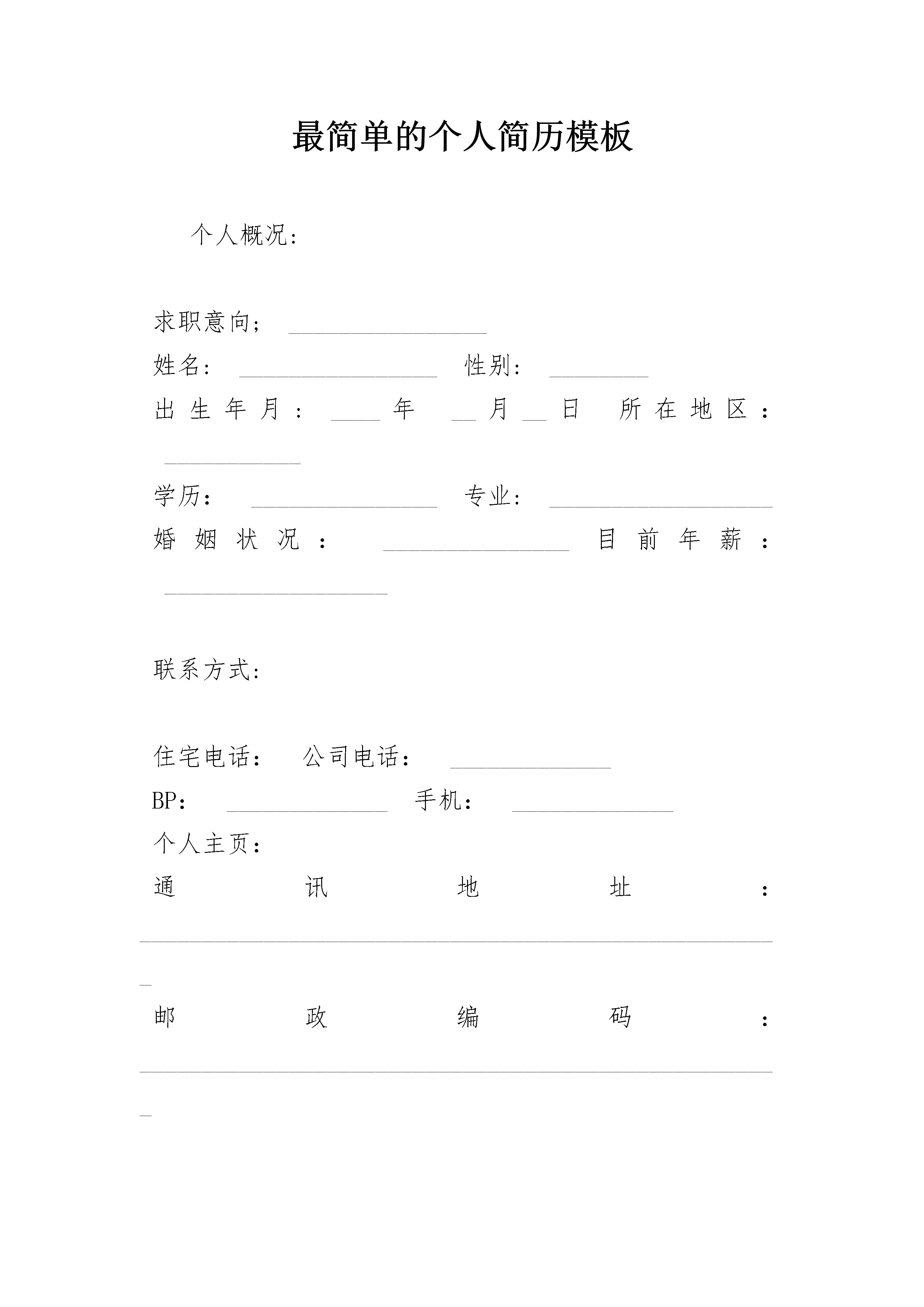 最简单的个人简历模板个人概况:求职意向;________________姓名:________________性别:________出生年月:____年__月__日所在地区:___________学历:_______________专业:__________________婚姻状况:_______________目前年薪:__________________联系方式:住宅电话:公司电话:_____________BP:_____________手机:_____________个人主页:通讯地址:____________________________________________________邮政编码:____________________________________________________教育背景:最高学历:__________________________最高学历学校:_____________专业:_____________时间:____年___月至____年___月第二学历:_____________第二学历学校:_____________专业:_____________时间:____年___月至____年___月教育情况描述:(此处可注明:所修课程、在学校所参加的组织活动、担任职务、获奖情况、发表的文章等,请依据个人情况酌情增减)_______________________________________________________________________________________________________________________________________________________________外语能力:外语一:基本技能:_____________________通过标准测试:__________________外语二:基本技能:______________________通过标准测试:___________________其它:工作经历:____年____月——____年____月_______________公司_______________部门_______________工作____年____月——____年____月_______________公司_______________部门_______________工作(此处应为整篇简历的核心内容,应聘者可以着重叙述此项,并根据个人工作情况不同而重点突出说明工作具体内容与经历,尤其是与求职目标相关的工作经历;一定要说出最主要、最有说服力的工作经历和最具证明性的为公司获取的利润和相关成绩;说明的语气要坚定、积极、有力;具体的工作、能力等证明材料等;写工作经验时,一般是先写近期的,然后按照年代的顺序依次写出。最近的工作经验是很重要的。在每一项工作经历中先写工作日期,接着是工作单位和职务。在这个部分需要注意的一点是,陈述了个人的资格和能力经历之后,不要太提及个人的需求、理想等。)个人能力:(如电脑能力、组织协调能力或其他)________________________________________________________________________________个人爱好:(突出自己的个性,工作态度或他人对自己的评价等)_______________________________________________________________________________其他说明:(如获奖情况等)