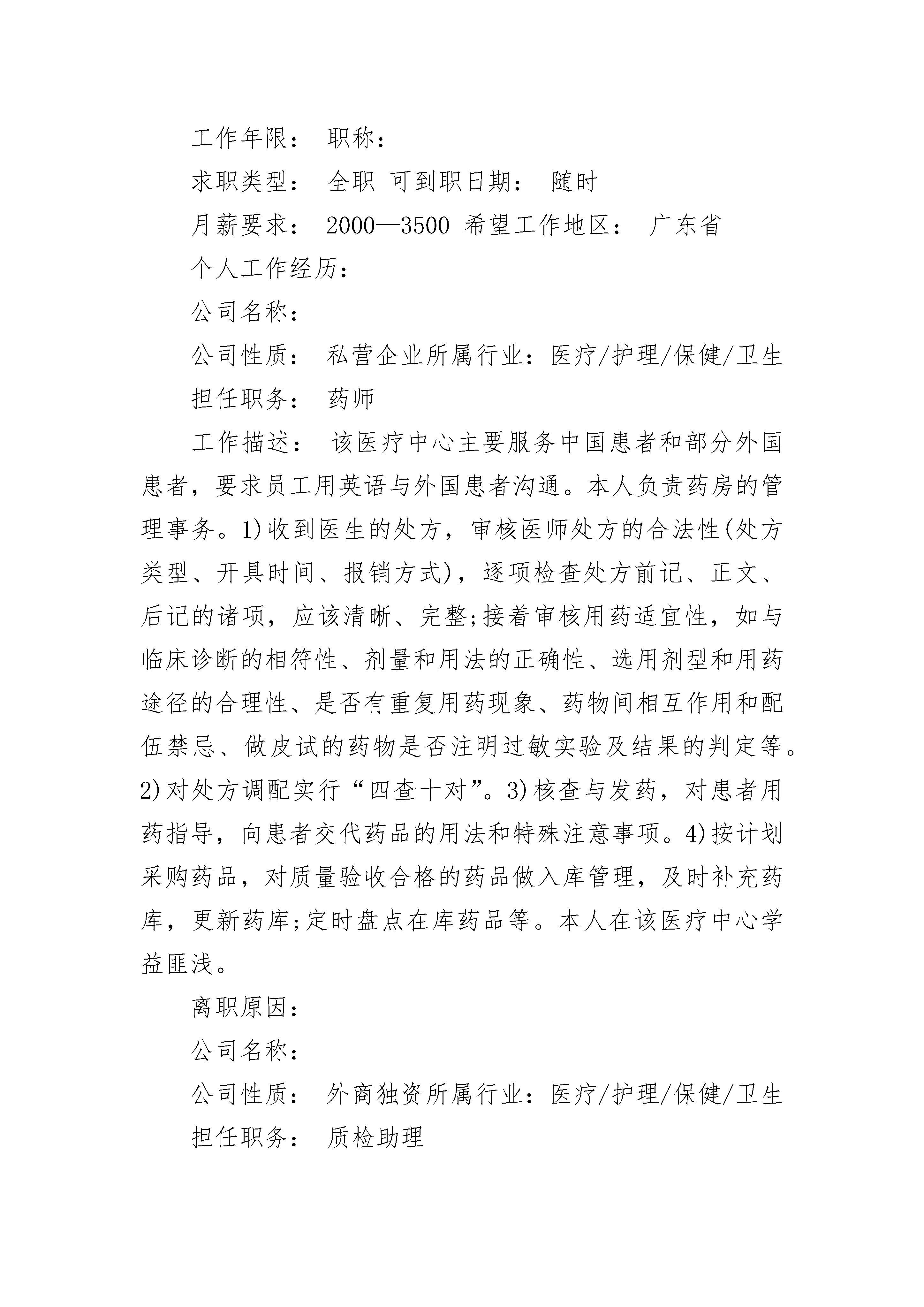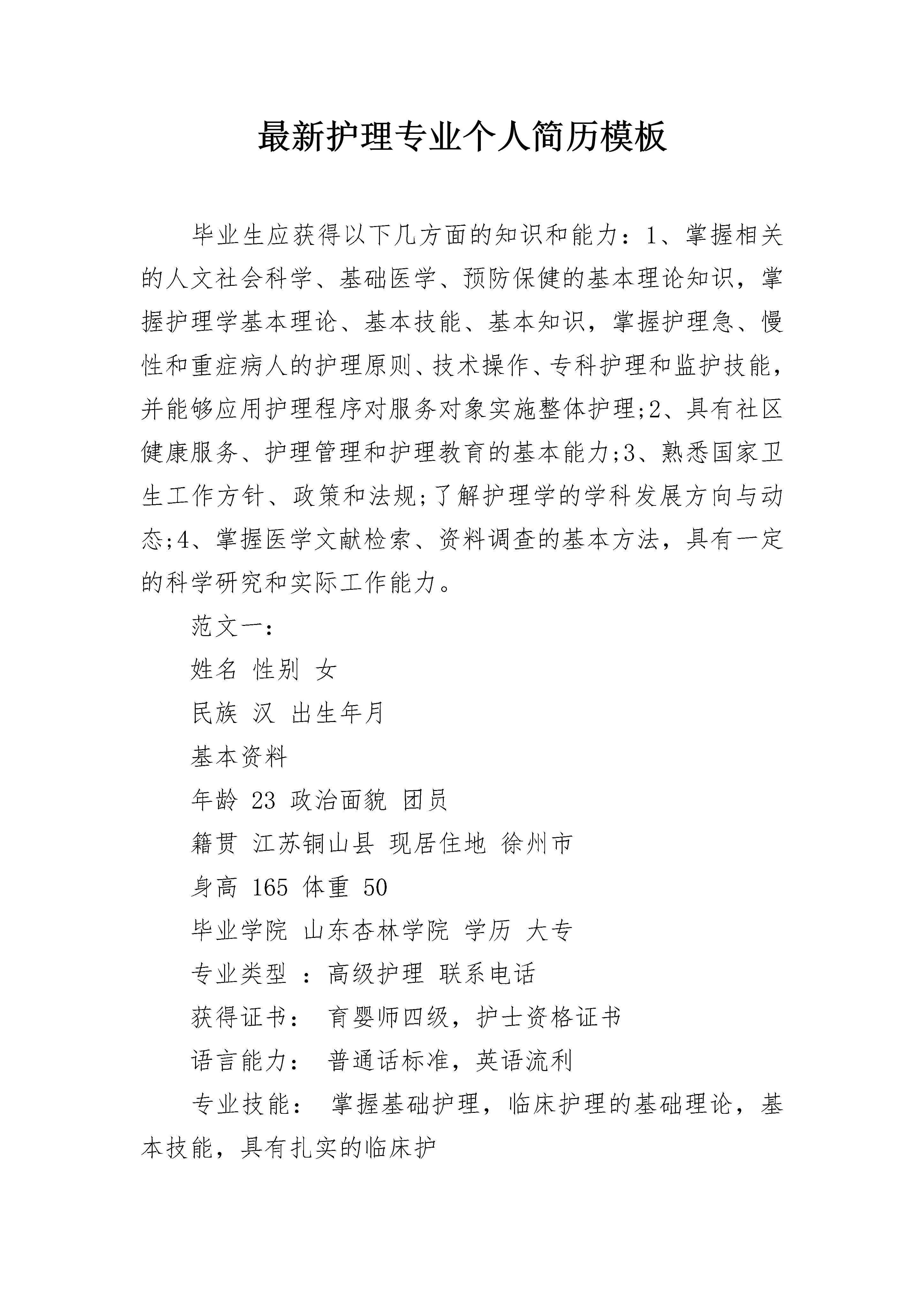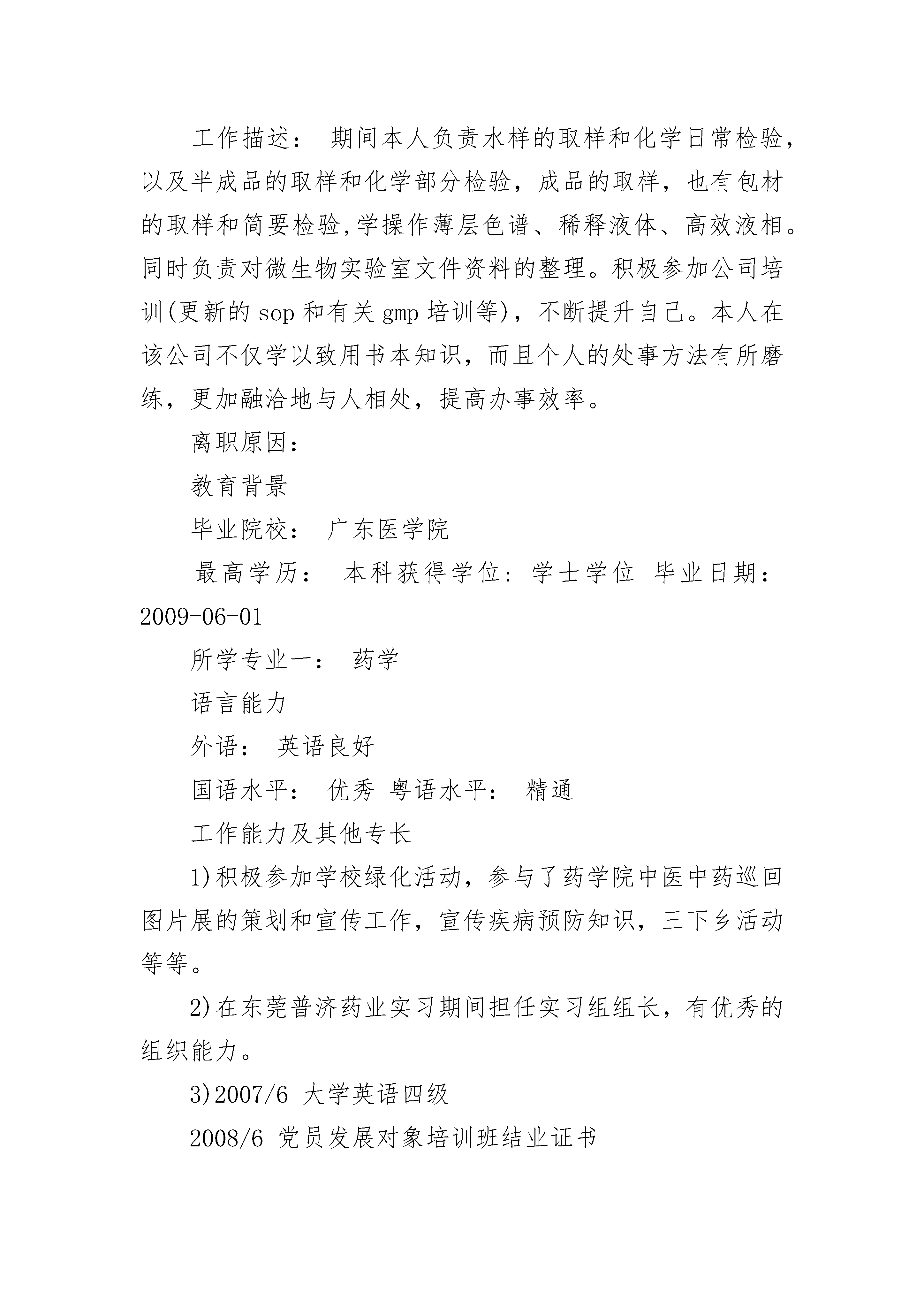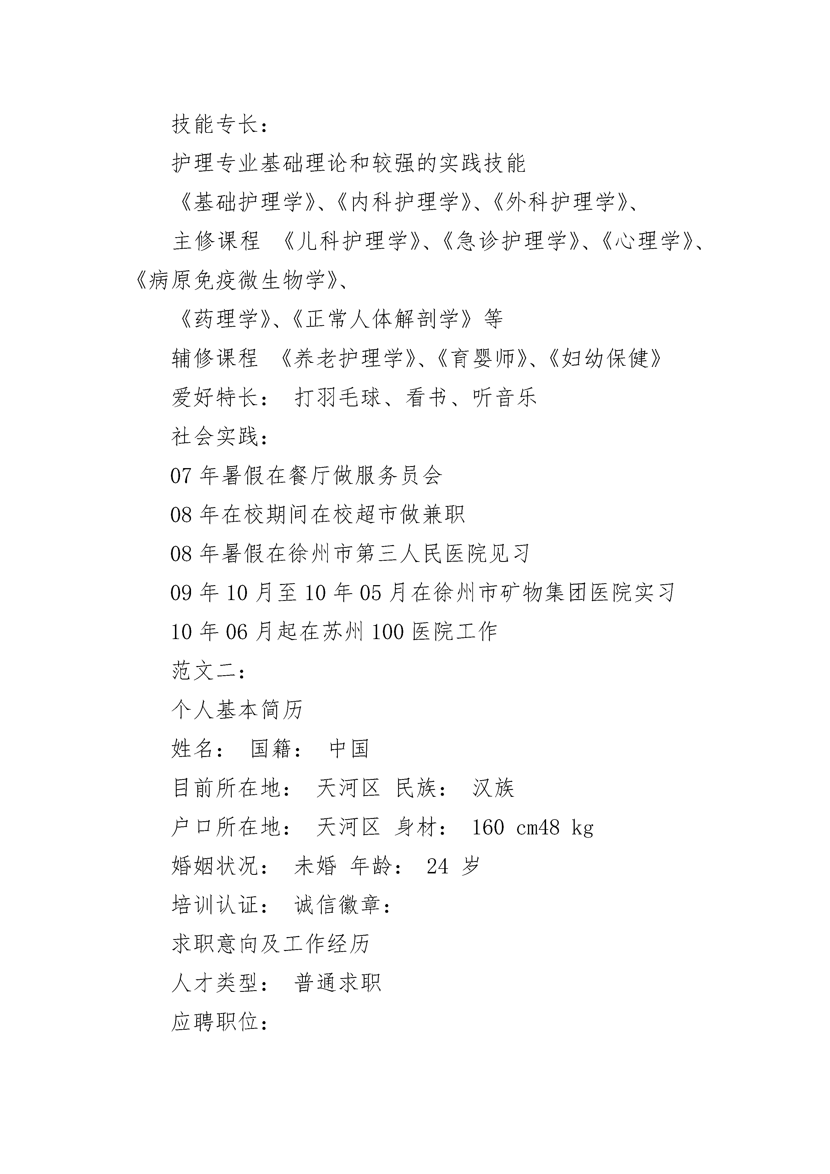 最新护理专业个人简历模板毕业生应获得以下几方面的知识和能力:1、掌握相关的人文社会科学、基础医学、预防保健的基本理论知识,掌握护理学基本理论、基本技能、基本知识,掌握护理急、慢性和重症病人的护理原则、技术操作、专科护理和监护技能,并能够应用护理程序对服务对象实施整体护理;2、具有社区健康服务、护理管理和护理教育的基本能力;3、熟悉国家卫生工作方针、政策和法规;了解护理学的学科发展方向与动态;4、掌握医学文献检索、资料调查的基本方法,具有一定的科学研究和实际工作能力。范文一:姓名性别女民族汉出生年月基本资料年龄23政治面貌团员籍贯江苏铜山县现居住地徐州市身高165体重50毕业学院山东杏林学院学历大专专业类型:高级护理联系电话获得证书:育婴师四级,护士资格证书语言能力:普通话标准,英语流利专业技能:掌握基础护理,临床护理的基础理论,基本技能,具有扎实的临床护技能专长:护理专业基础理论和较强的实践技能《基础护理学》、《内科护理学》、《外科护理学》、主修课程《儿科护理学》、《急诊护理学》、《心理学》、《病原免疫微生物学》、《药理学》、《正常人体解剖学》等辅修课程《养老护理学》、《育婴师》、《妇幼保健》爱好特长:打羽毛球、看书、听音乐社会实践:07年暑假在餐厅做服务员会08年在校期间在校超市做兼职08年暑假在徐州市第三人民医院见习09年10月至10年05月在徐州市矿物集团医院实习10年06月起在苏州100医院工作范文二:个人基本简历姓名:国籍:中国目前所在地:天河区民族:汉族户口所在地:天河区身材:160cm48kg婚姻状况:未婚年龄:24岁培训认证:诚信徽章:求职意向及工作经历人才类型:普通求职应聘职位:工作年限:职称:求职类型:全职可到职日期:随时月薪要求:2000—3500希望工作地区:广东省个人工作经历:公司名称:公司性质:私营企业所属行业:医疗/护理/保健/卫生担任职务:药师工作描述:该医疗中心主要服务中国患者和部分外国患者,要求员工用英语与外国患者沟通。本人负责药房的管理事务。1)收到医生的处方,审核医师处方的合法性(处方类型、开具时间、报销方式),逐项检查处方前记、正文、后记的诸项,应该清晰、完整;接着审核用药适宜性,如与临床诊断的相符性、剂量和用法的正确性、选用剂型和用药途径的合理性、是否有重复用药现象、药物间相互作用和配伍禁忌、做皮试的药物是否注明过敏实验及结果的判定等。2)对处方调配实行“四查十对”。3)核查与发药,对患者用药指导,向患者交代药品的用法和特殊注意事项。4)按计划采购药品,对质量验收合格的药品做入库管理,及时补充药库,更新药库;定时盘点在库药品等。本人在该医疗中心学益匪浅。离职原因:公司名称:公司性质:外商独资所属行业:医疗/护理/保健/卫生担任职务:质检助理工作描述:期间本人负责水样的取样和化学日常检验,以及半成品的取样和化学部分检验,成品的取样,也有包材的取样和简要检验,学操作薄层色谱、稀释液体、高效液相。同时负责对微生物实验室文件资料的整理。积极参加公司培训(更新的sop和有关gmp培训等),不断提升自己。本人在该公司不仅学以致用书本知识,而且个人的处事方法有所磨练,更加融洽地与人相处,提高办事效率。离职原因:教育背景毕业院校:广东医学院最高学历:本科获得学位:学士学位毕业日期:2009-06-01所学专业一:药学语言能力外语:英语良好国语水平:优秀粤语水平:精通工作能力及其他专长1)积极参加学校绿化活动,参与了药学院中医中药巡回图片展的策划和宣传工作,宣传疾病预防知识,三下乡活动等等。2)在东莞普济药业实习期间担任实习组组长,有优秀的组织能力。3)2007/6大学英语四级2008/6党员发展对象培训班结业证书2008/12社会工作积极分子校级4)本人认为在药厂实习,熟悉药的制作,可以为以后工作(无论在哪个行业)作坚实的铺垫!相信没有经验,可以通过实践操作去总结;没有阅历,可以一步一步去积累;没有社会关系,可以一点一点去编织。但是,没有梦想、没有思路才是最可怕的!我给自己一个明确的定位,使自己稳定下来。详细个人自传1)希望工作地区:广州联系电话:手机: