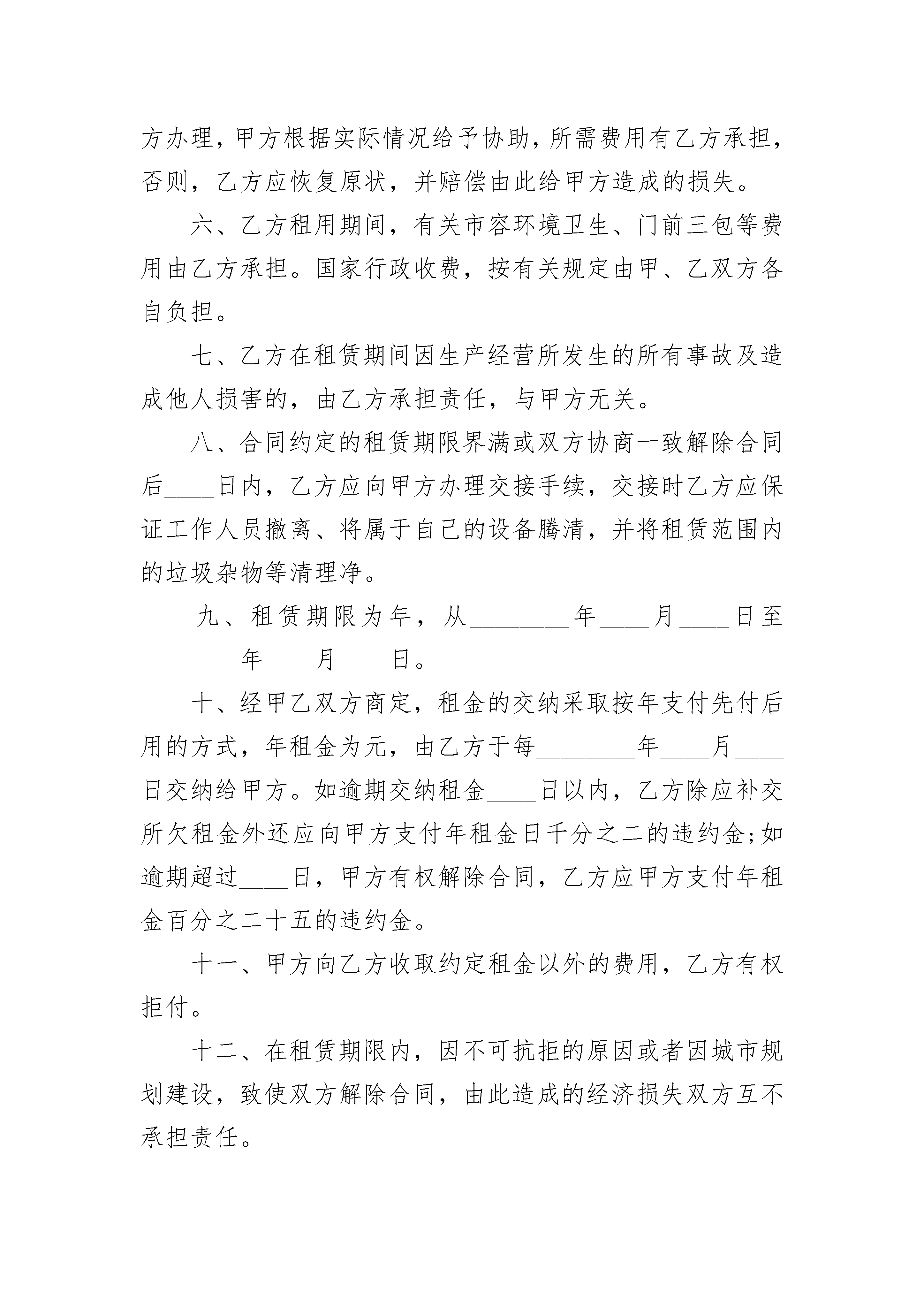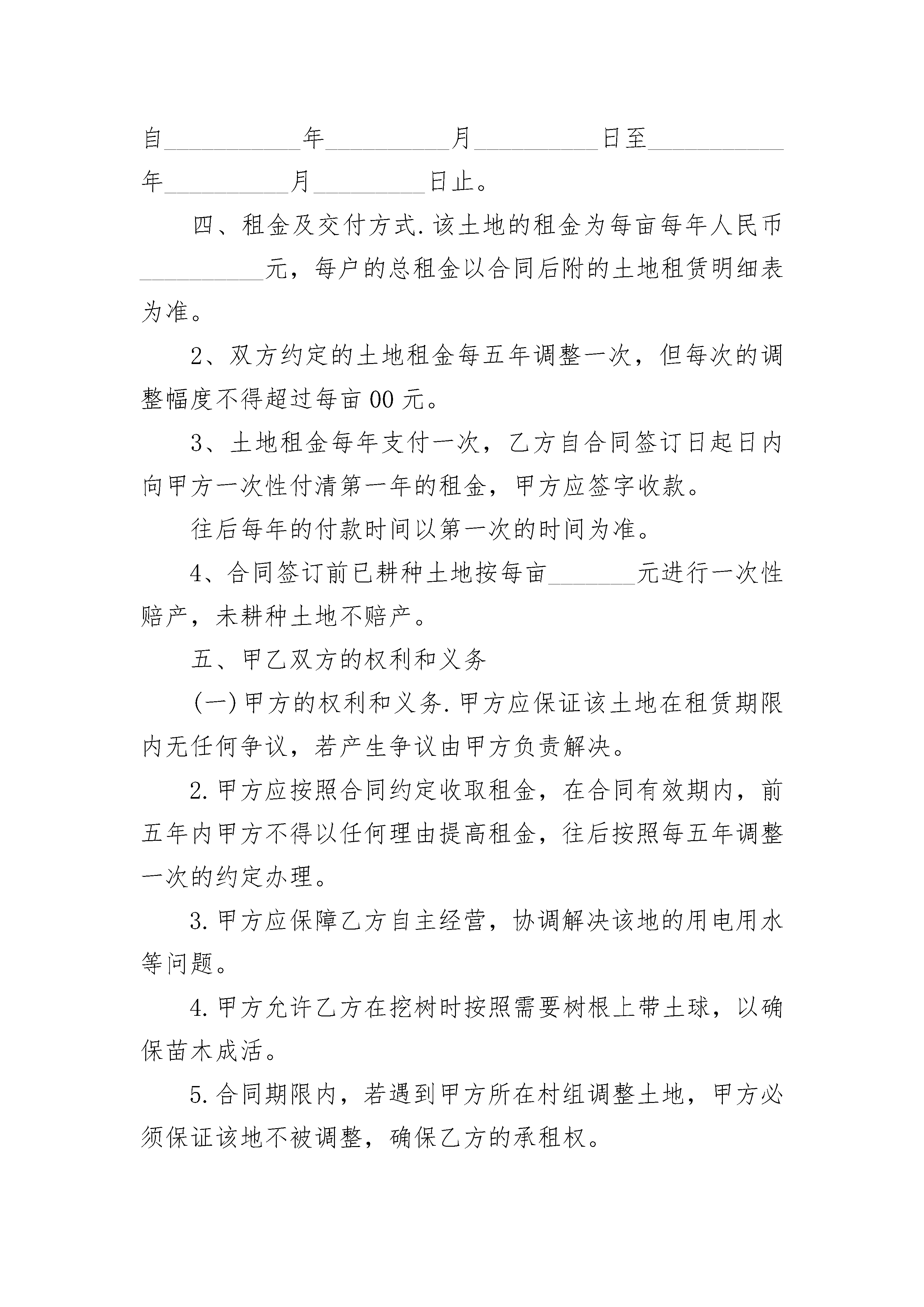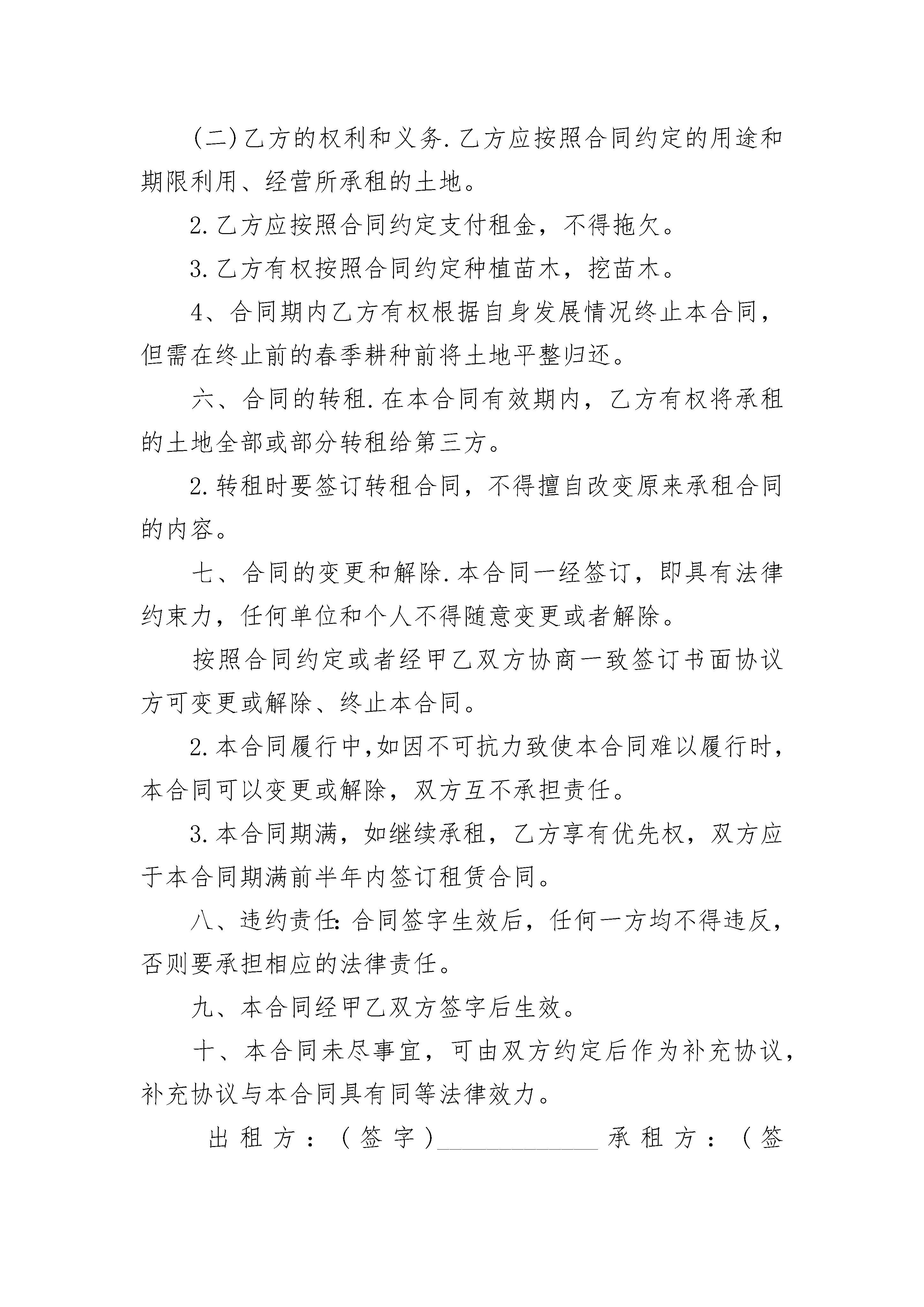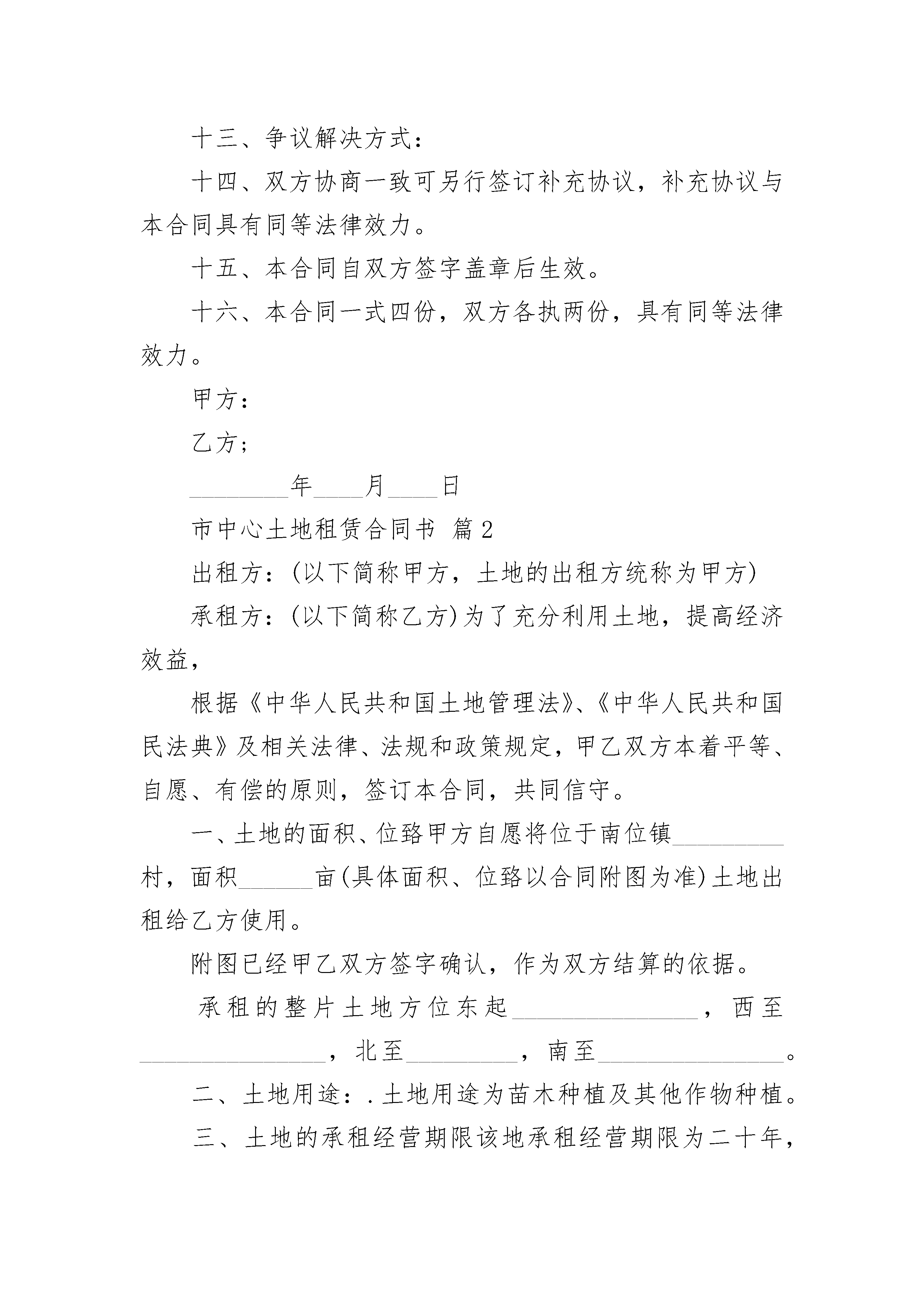 市中心土地租赁合同书市中心土地租赁合同书(精选24篇)市中心土地租赁合同书篇1市中心土地租赁合同书出租方:承租方:根据相关法律规定,为了明确甲、乙双方的权利、义务,经双方平等协商,签订本合同。一、甲方将位于市路号的亩土地的使用权及地上建筑物、构筑物、附着物等出租给乙方使用。二、乙方承租本宗土地必须进行合法经营,否则甲方有权收回土地使用权,终止合同。三、乙方不得擅自转租本宗土地的使用权,如需进行转租应征得甲方书面同意,否则甲方有权收回土地使用权,终止合同。四、甲方应保证本宗土地上的水、电、暖等基本设施完整,并帮助乙方协调同水、电、暖的提供方的有关事宜,但具体收费事宜由乙与水电暖的提供方协商,所有费用由乙方承担。五、乙方在租用期间,不得随意改变本宗土地状况和地上的建筑物、构筑物、附着物及水、电、暖管网等设施,如确需改动或扩增设备应事先征得甲方书面同意后方可实施,对有关设施进行改动或扩增设备时如需办理相关手续,由乙方办理,甲方根据实际情况给予协助,所需费用有乙方承担,否则,乙方应恢复原状,并赔偿由此给甲方造成的损失。六、乙方租用期间,有关市容环境卫生、门前三包等费用由乙方承担。国家行政收费,按有关规定由甲、乙双方各自负担。七、乙方在租赁期间因生产经营所发生的所有事故及造成他人损害的,由乙方承担责任,与甲方无关。八、合同约定的租赁期限界满或双方协商一致解除合同后____日内,乙方应向甲方办理交接手续,交接时乙方应保证工作人员撤离、将属于自己的设备腾清,并将租赁范围内的垃圾杂物等清理净。九、租赁期限为年,从________年____月____日至________年____月____日。十、经甲乙双方商定,租金的交纳采取按年支付先付后用的方式,年租金为元,由乙方于每________年____月____日交纳给甲方。如逾期交纳租金____日以内,乙方除应补交所欠租金外还应向甲方支付年租金日千分之二的违约金;如逾期超过____日,甲方有权解除合同,乙方应甲方支付年租金百分之二十五的违约金。十一、甲方向乙方收取约定租金以外的费用,乙方有权拒付。十二、在租赁期限内,因不可抗拒的原因或者因城市规划建设,致使双方解除合同,由此造成的经济损失双方互不承担责任。十三、争议解决方式:十四、双方协商一致可另行签订补充协议,补充协议与本合同具有同等法律效力。十五、本合同自双方签字盖章后生效。十六、本合同一式四份,双方各执两份,具有同等法律效力。甲方:乙方;________年____月____日市中心土地租赁合同书篇2出租方:(以下简称甲方,土地的出租方统称为甲方)承租方:(以下简称乙方)为了充分利用土地,提高经济效益,根据《中华人民共和国土地管理法》、《中华人民共和国民法典》及相关法律、法规和政策规定,甲乙双方本着平等、自愿、有偿的原则,签订本合同,共同信守。一、土地的面积、位臵甲方自愿将位于南位镇_________村,面积______亩(具体面积、位臵以合同附图为准)土地出租给乙方使用。附图已经甲乙双方签字确认,作为双方结算的依据。承租的整片土地方位东起_______________,西至_______________,北至_________,南至_______________。二、土地用途:.土地用途为苗木种植及其他作物种植。三、土地的承租经营期限该地承租经营期限为二十年,自___________年__________月__________日至___________年__________月_________日止。四、租金及交付方式.该土地的租金为每亩每年人民币__________元,每户的总租金以合同后附的土地租赁明细表为准。2、双方约定的土地租金每五年调整一次,但每次的调整幅度不得超过每亩00元。3、土地租金每年支付一次,乙方自合同签订日起日内向甲方一次性付清第一年的租金,甲方应签字收款。往后每年的付款时间以第一次的时间为准。4、合同签订前已耕种土地按每亩_______元进行一次性赔产,未耕种土地不赔产。五、甲乙双方的权利和义务(一)甲方的权利和义务.甲方应保证该土地在租赁期限内无任何争议,若产生争议由甲方负责解决。2.甲方应按照合同约定收取租金,在合同有效期内,前五年内甲方不得以任何理由提高租金,往后按照每五年调整一次的约定办理。3.甲方应保障乙方自主经营,协调解决该地的用电用水等问题。4.甲方允许乙方在挖树时按照需要树根上带土球,以确保苗木成活。5.合同期限内,若遇到甲方所在村组调整土地,甲方必须保证该地不被调整,确保乙方的承租权。(二)乙方的权利和义务.乙方应按照合同约定的用途和期限利用、经营所承租的土地。2.乙方应按照合同约定支付租金,不得拖欠。3.乙方有权按照合同约定种植苗木,挖苗木。4、合同期内乙方有权根据自身发展情况终止本合同,但需在终