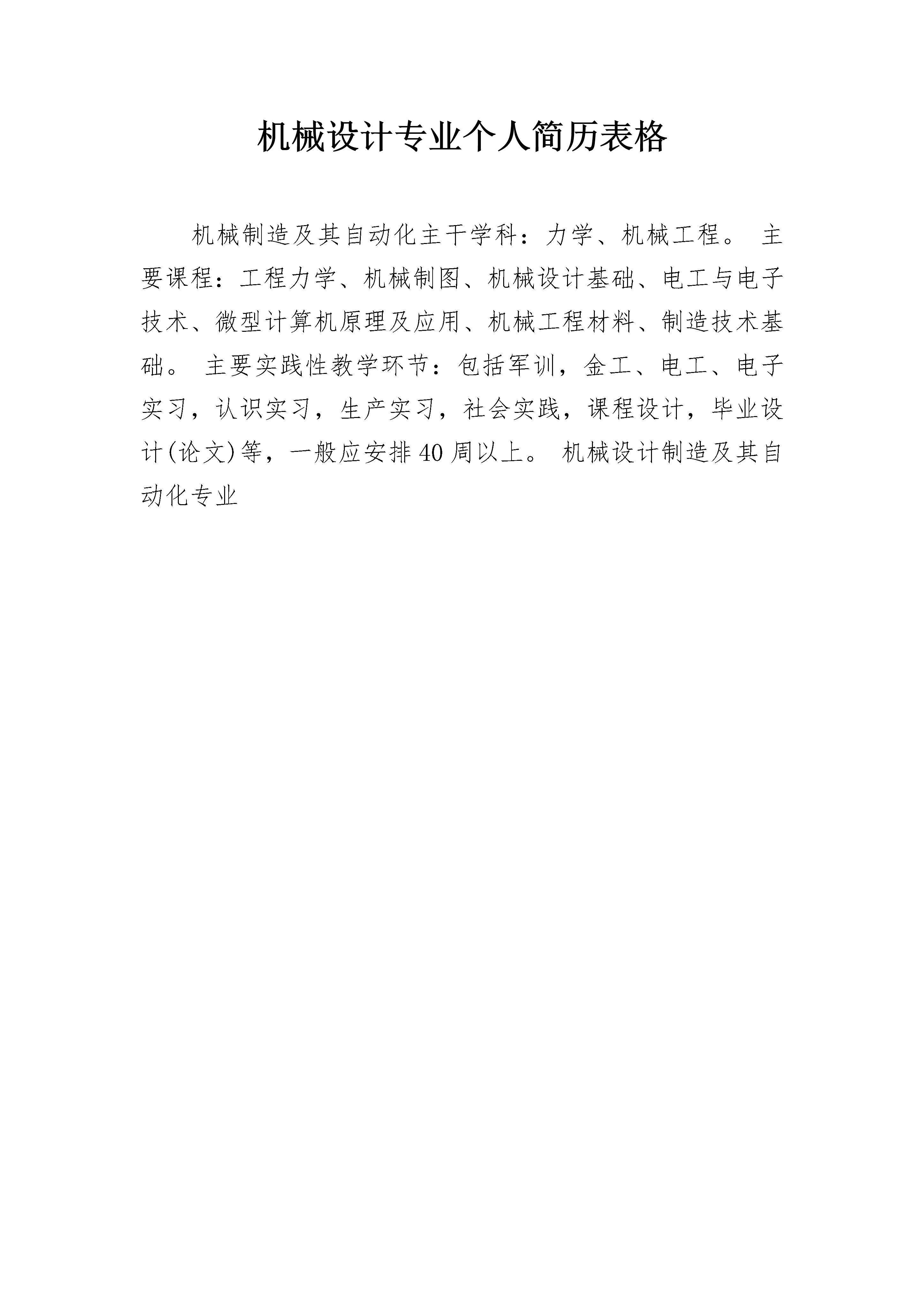 机械设计专业个人简历表格机械制造及其自动化主干学科:力学、机械工程。主要课程:工程力学、机械制图、机械设计基础、电工与电子技术、微型计算机原理及应用、机械工程材料、制造技术基础。主要实践性教学环节:包括军训,金工、电工、电子实习,认识实习,生产实习,社会实践,课程设计,毕业设计(论文)等,一般应安排40周以上。机械设计制造及其自动化专业