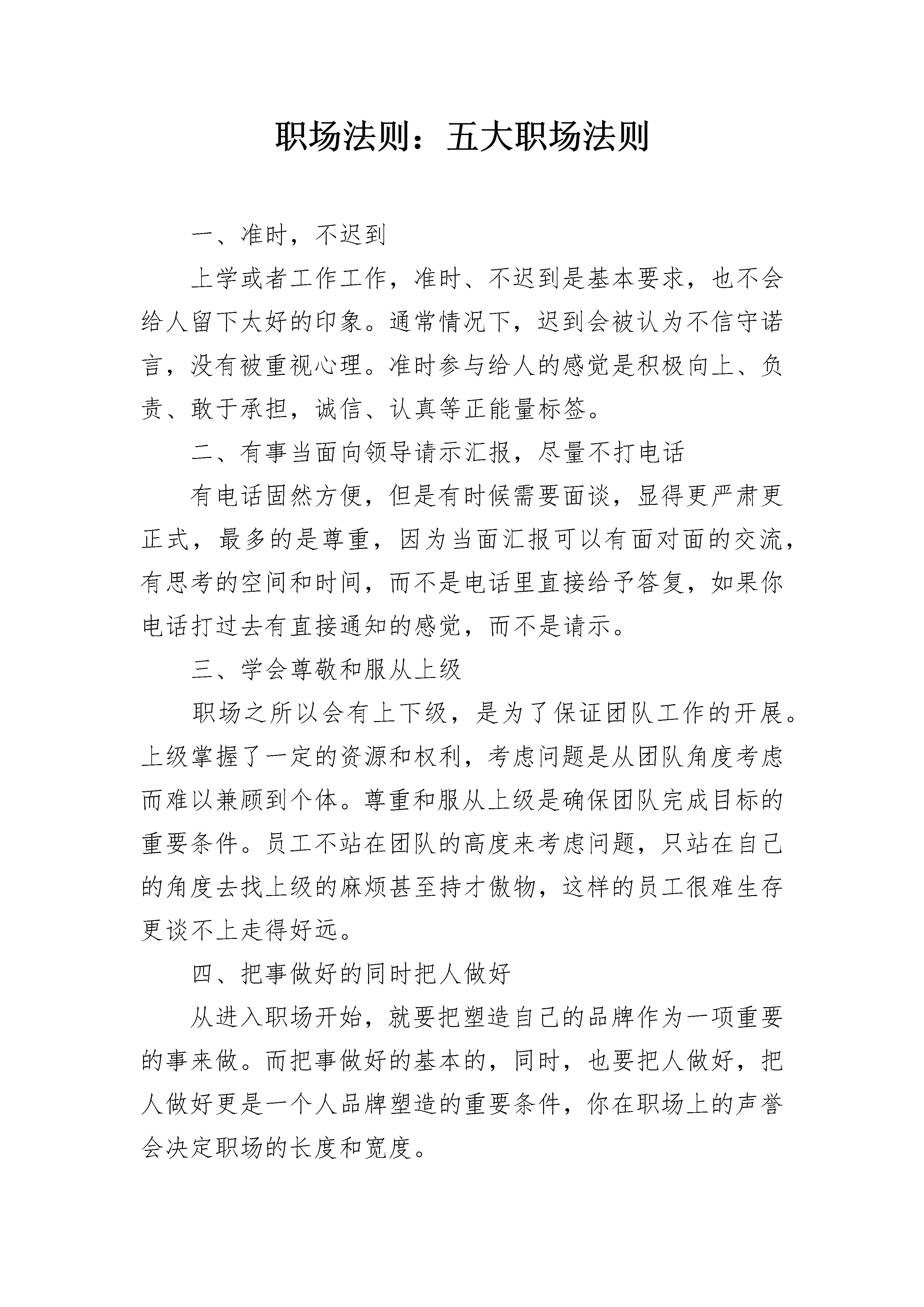 职场法则:五大职场法则一、准时,不迟到上学或者工作工作,准时、不迟到是基本要求,也不会给人留下太好的印象。通常情况下,迟到会被认为不信守诺言,没有被重视心理。准时参与给人的感觉是积极向上、负责、敢于承担,诚信、认真等正能量标签。二、有事当面向领导请示汇报,尽量不打电话有电话固然方便,但是有时候需要面谈,显得更严肃更正式,最多的是尊重,因为当面汇报可以有面对面的交流,有思考的空间和时间,而不是电话里直接给予答复,如果你电话打过去有直接通知的感觉,而不是请示。三、学会尊敬和服从上级职场之所以会有上下级,是为了保证团队工作的开展。上级掌握了一定的资源和权利,考虑问题是从团队角度考虑而难以兼顾到个体。尊重和服从上级是确保团队完成目标的重要条件。员工不站在团队的高度来考虑问题,只站在自己的角度去找上级的麻烦甚至持才傲物,这样的员工很难生存更谈不上走得好远。四、把事做好的同时把人做好从进入职场开始,就要把塑造自己的品牌作为一项重要的事来做。而把事做好的基本的,同时,也要把人做好,把人做好更是一个人品牌塑造的重要条件,你在职场上的声誉会决定职场的长度和宽度。在现代的中国。人品依然是企业用人的重要标准。你的人品是需要大家通过与你共事看出来的,也是一个长期积累的过程。不仅在单位内还要在行业内树立你良好的形象。当然好人不是指长袖善舞、八面玲珑,而是人一定要学会承担责任,不去做有害他人和组织的事情。五、工作有计划,主动汇报工作进度在职场中,我们要学会有计划的工作,并且主动与领导汇报自己的工作进度。计划性的工作能有效的利用时间,高效的完成工作,做到清楚自己做什么,达到什么效果,给公司带来什么效益。主动向领导汇报自己的工作进度与效果,能更好的与领导交流,领导也能针对你工作遇到的困难提供一些帮助和建议,这样可以加快你的工作进度,同时也能达到领导的要求。