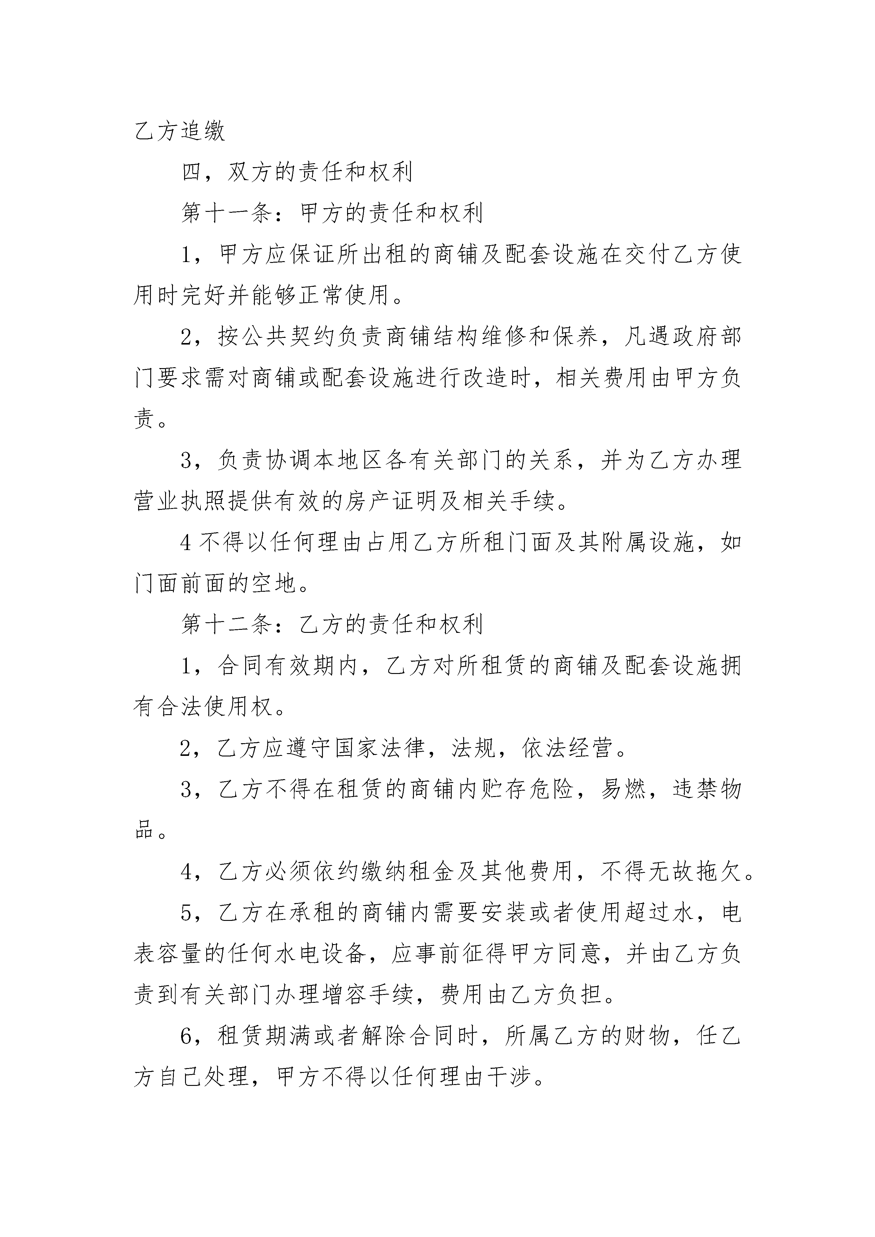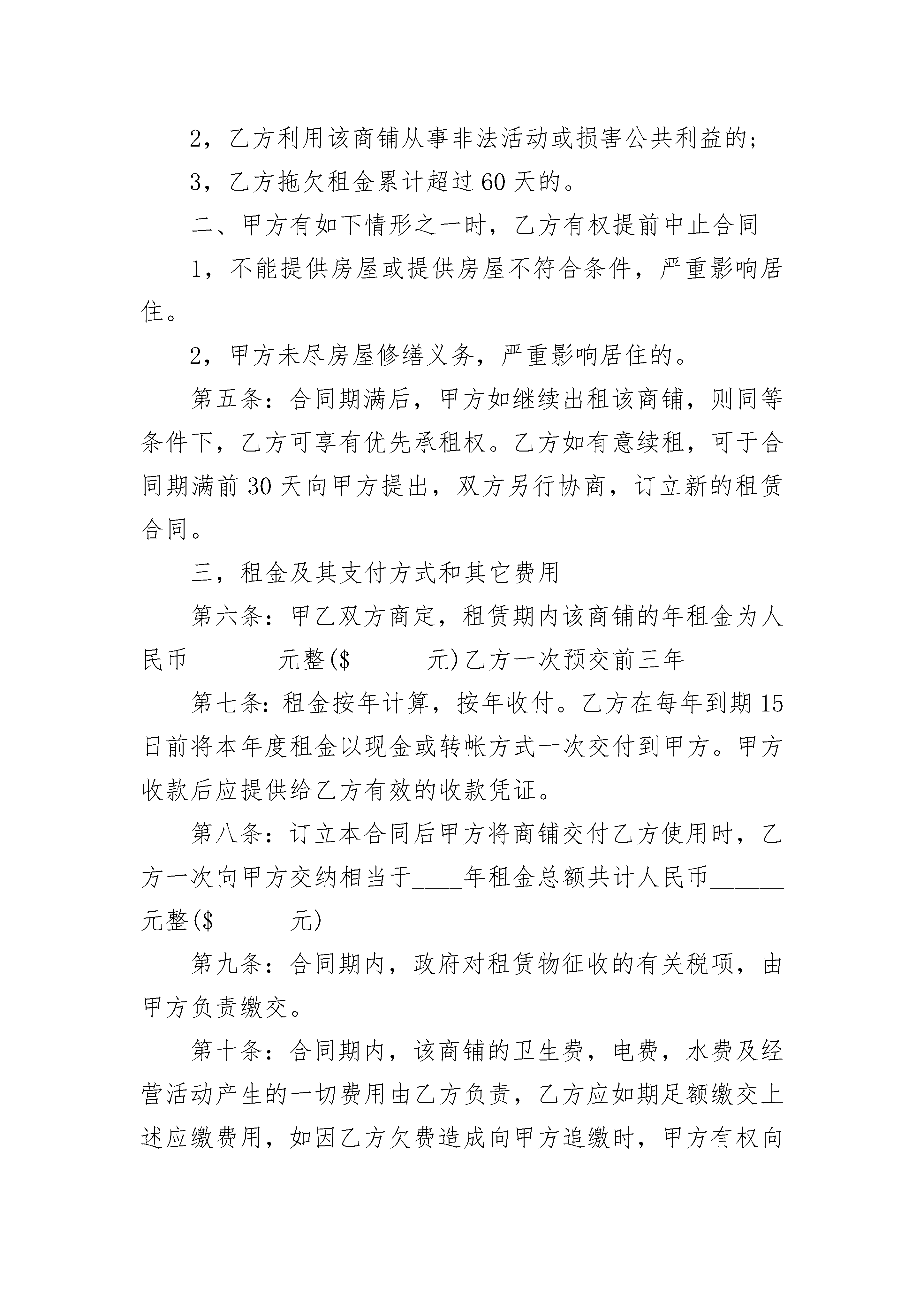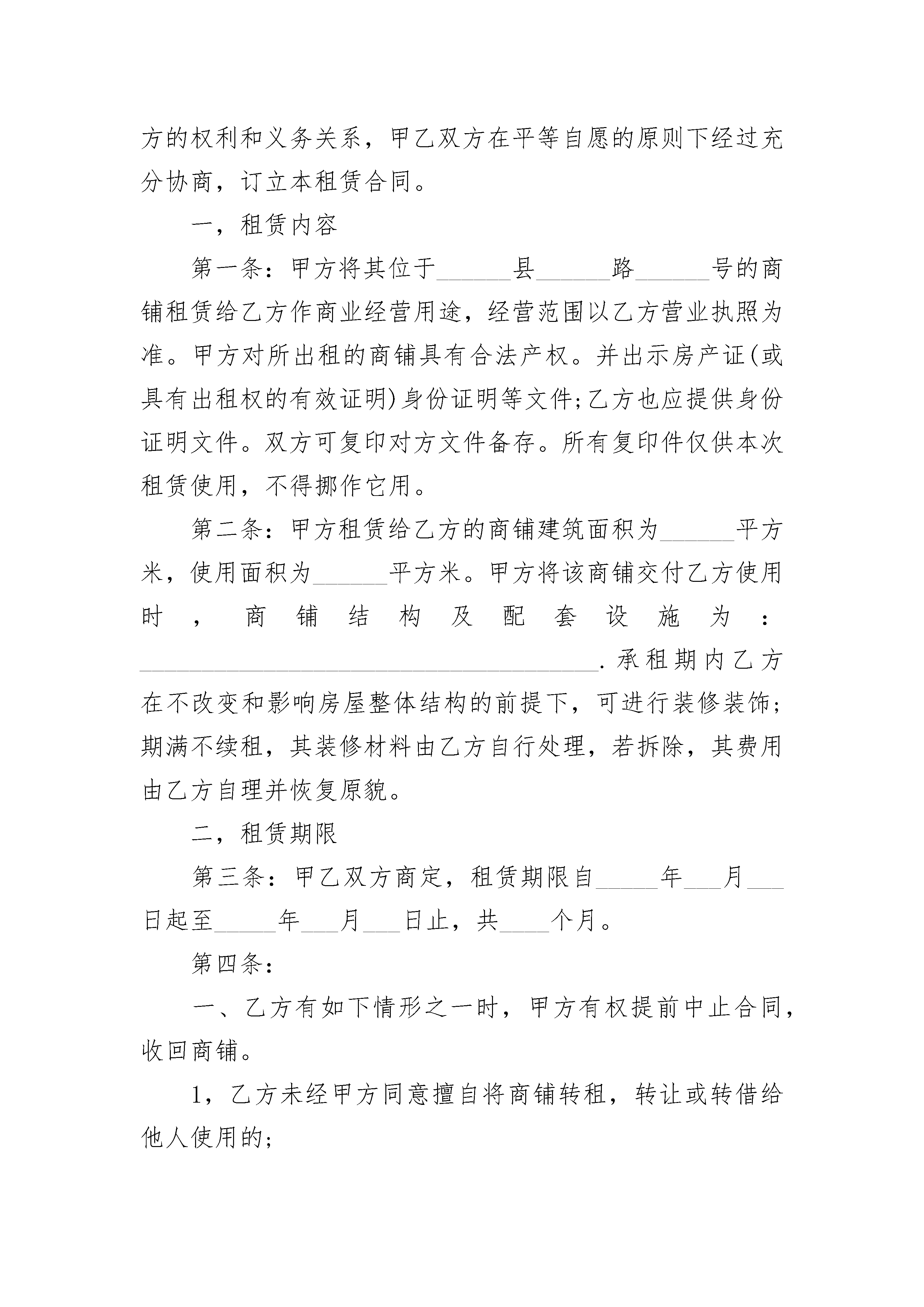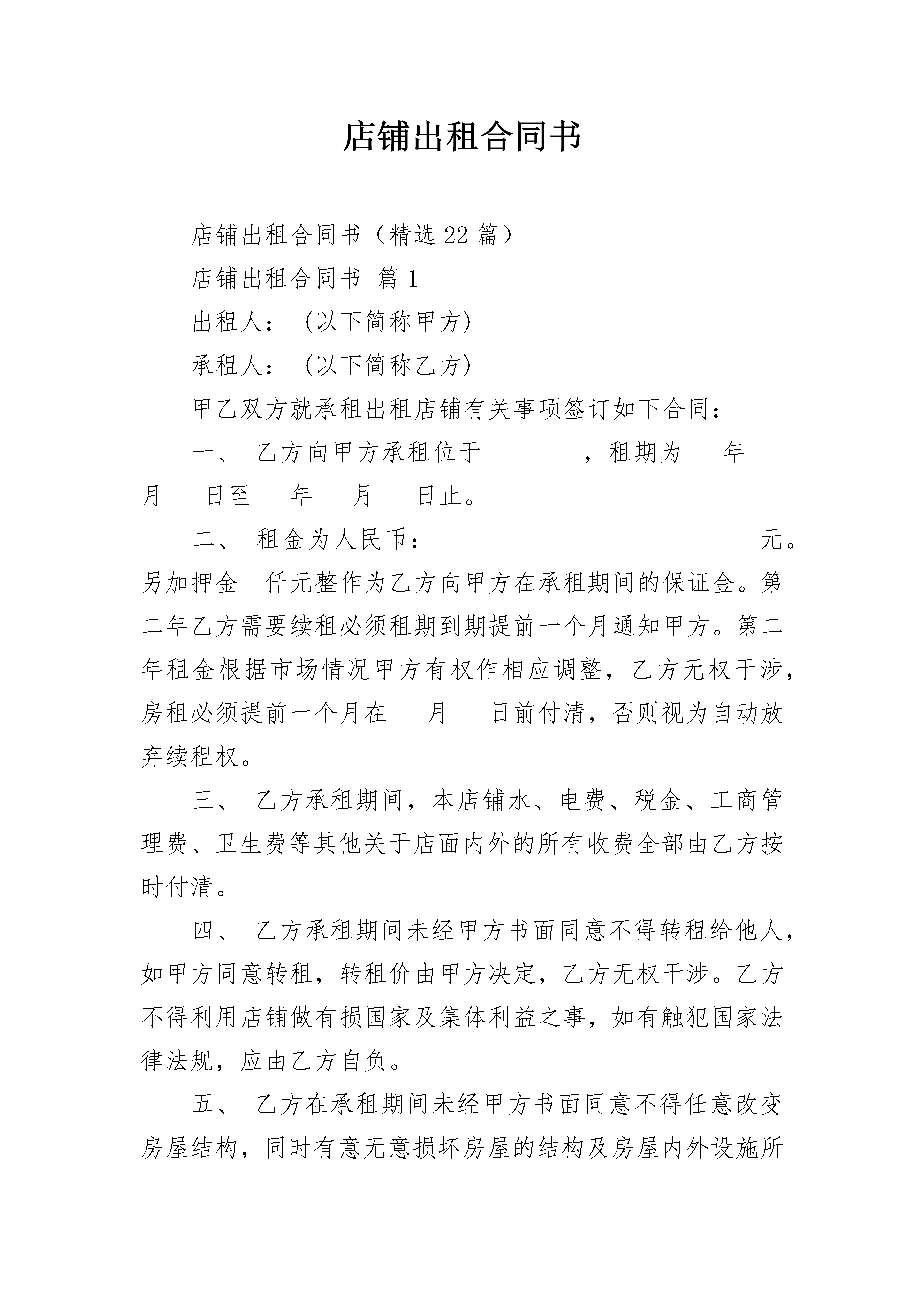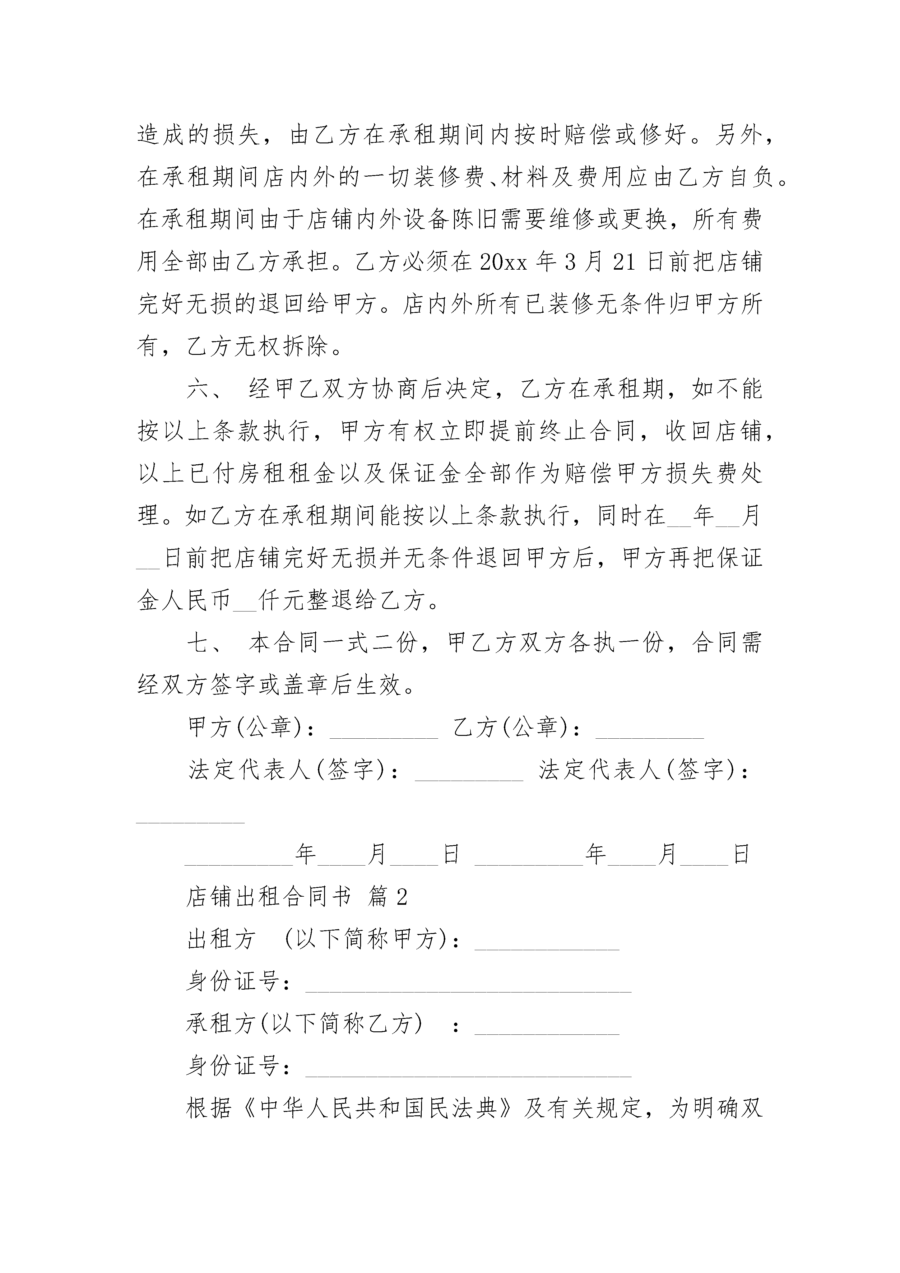 店铺出租合同书店铺出租合同书(精选22篇)店铺出租合同书篇1出租人:(以下简称甲方)承租人:(以下简称乙方)甲乙双方就承租出租店铺有关事项签订如下合同:一、乙方向甲方承租位于________,租期为___年___月___日至___年___月___日止。二、租金为人民币:__________________________元。另加押金__仟元整作为乙方向甲方在承租期间的保证金。第二年乙方需要续租必须租期到期提前一个月通知甲方。第二年租金根据市场情况甲方有权作相应调整,乙方无权干涉,房租必须提前一个月在___月___日前付清,否则视为自动放弃续租权。三、乙方承租期间,本店铺水、电费、税金、工商管理费、卫生费等其他关于店面内外的所有收费全部由乙方按时付清。四、乙方承租期间未经甲方书面同意不得转租给他人,如甲方同意转租,转租价由甲方决定,乙方无权干涉。乙方不得利用店铺做有损国家及集体利益之事,如有触犯国家法律法规,应由乙方自负。五、乙方在承租期间未经甲方书面同意不得任意改变房屋结构,同时有意无意损坏房屋的结构及房屋内外设施所造成的损失,由乙方在承租期间内按时赔偿或修好。另外,在承租期间店内外的一切装修费、材料及费用应由乙方自负。在承租期间由于店铺内外设备陈旧需要维修或更换,所有费用全部由乙方承担。乙方必须在20xx年3月21日前把店铺完好无损的退回给甲方。店内外所有已装修无条件归甲方所有,乙方无权拆除。六、经甲乙双方协商后决定,乙方在承租期,如不能按以上条款执行,甲方有权立即提前终止合同,收回店铺,以上已付房租租金以及保证金全部作为赔偿甲方损失费处理。如乙方在承租期间能按以上条款执行,同时在__年__月__日前把店铺完好无损并无条件退回甲方后,甲方再把保证金人民币__仟元整退给乙方。七、本合同一式二份,甲乙方双方各执一份,合同需经双方签字或盖章后生效。甲方(公章):_________乙方(公章):_________法定代表人(签字):_________法定代表人(签字):__________________年____月____日_________年____月____日店铺出租合同书篇2出租方(以下简称甲方):____________身份证号:___________________________承租方(以下简称乙方):____________身份证号:___________________________根据《中华人民共和国民法典》及有关规定,为明确双方的权利和义务关系,甲乙双方在平等自愿的原则下经过充分协商,订立本租赁合同。一,租赁内容第一条:甲方将其位于______县______路______号的商铺租赁给乙方作商业经营用途,经营范围以乙方营业执照为准。甲方对所出租的商铺具有合法产权。并出示房产证(或具有出租权的有效证明)身份证明等文件;乙方也应提供身份证明文件。双方可复印对方文件备存。所有复印件仅供本次租赁使用,不得挪作它用。第二条:甲方租赁给乙方的商铺建筑面积为______平方米,使用面积为______平方米。甲方将该商铺交付乙方使用时,商铺结构及配套设施为:_____________________________________.承租期内乙方在不改变和影响房屋整体结构的前提下,可进行装修装饰;期满不续租,其装修材料由乙方自行处理,若拆除,其费用由乙方自理并恢复原貌。二,租赁期限第三条:甲乙双方商定,租赁期限自_____年___月___日起至_____年___月___日止,共____个月。第四条:一、乙方有如下情形之一时,甲方有权提前中止合同,收回商铺。1,乙方未经甲方同意擅自将商铺转租,转让或转借给他人使用的;2,乙方利用该商铺从事非法活动或损害公共利益的;3,乙方拖欠租金累计超过60天的。二、甲方有如下情形之一时,乙方有权提前中止合同1,不能提供房屋或提供房屋不符合条件,严重影响居住。2,甲方未尽房屋修缮义务,严重影响居住的。第五条:合同期满后,甲方如继续出租该商铺,则同等条件下,乙方可享有优先承租权。乙方如有意续租,可于合同期满前30天向甲方提出,双方另行协商,订立新的租赁合同。三,租金及其支付方式和其它费用第六条:甲乙双方商定,租赁期内该商铺的年租金为人民币_______元整($______元)乙方一次预交前三年第七条:租金按年计算,按年收付。乙方在每年到期15日前将本年度租金以现金或转帐方式一次交付到甲方。甲方收款后应提供给乙方有效的收款凭证。第八条:订立本合同后甲方将商铺交付乙方使用时,乙方一次向甲方交纳相当于____年租金总额共计人民币______元整($______元)第九条:合同期内,政府对租赁物征收的有关税项,由甲方负责缴交。第十条:合同期内,该商铺的卫生费,电费,水费及经营活动产生的一切费用由乙