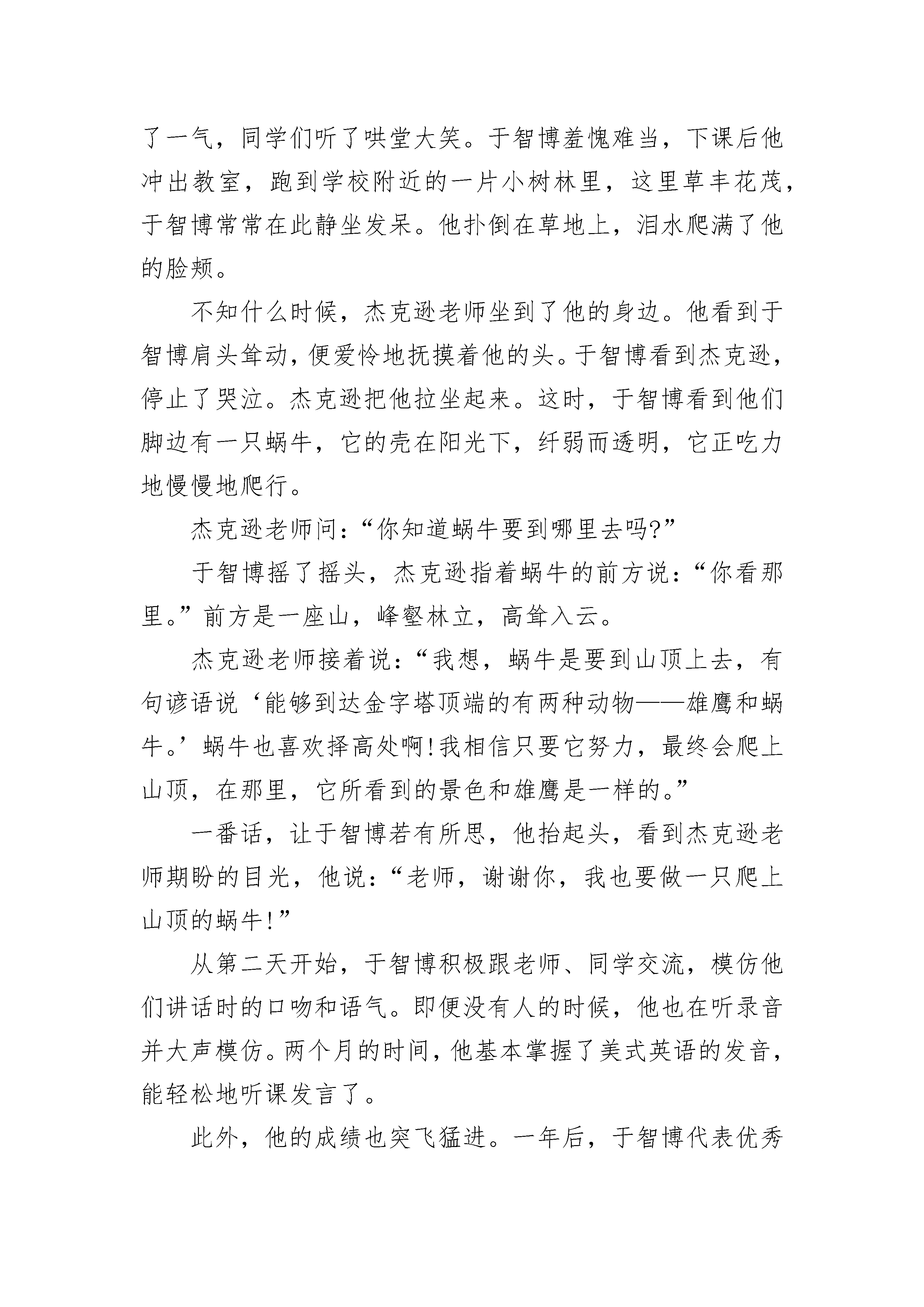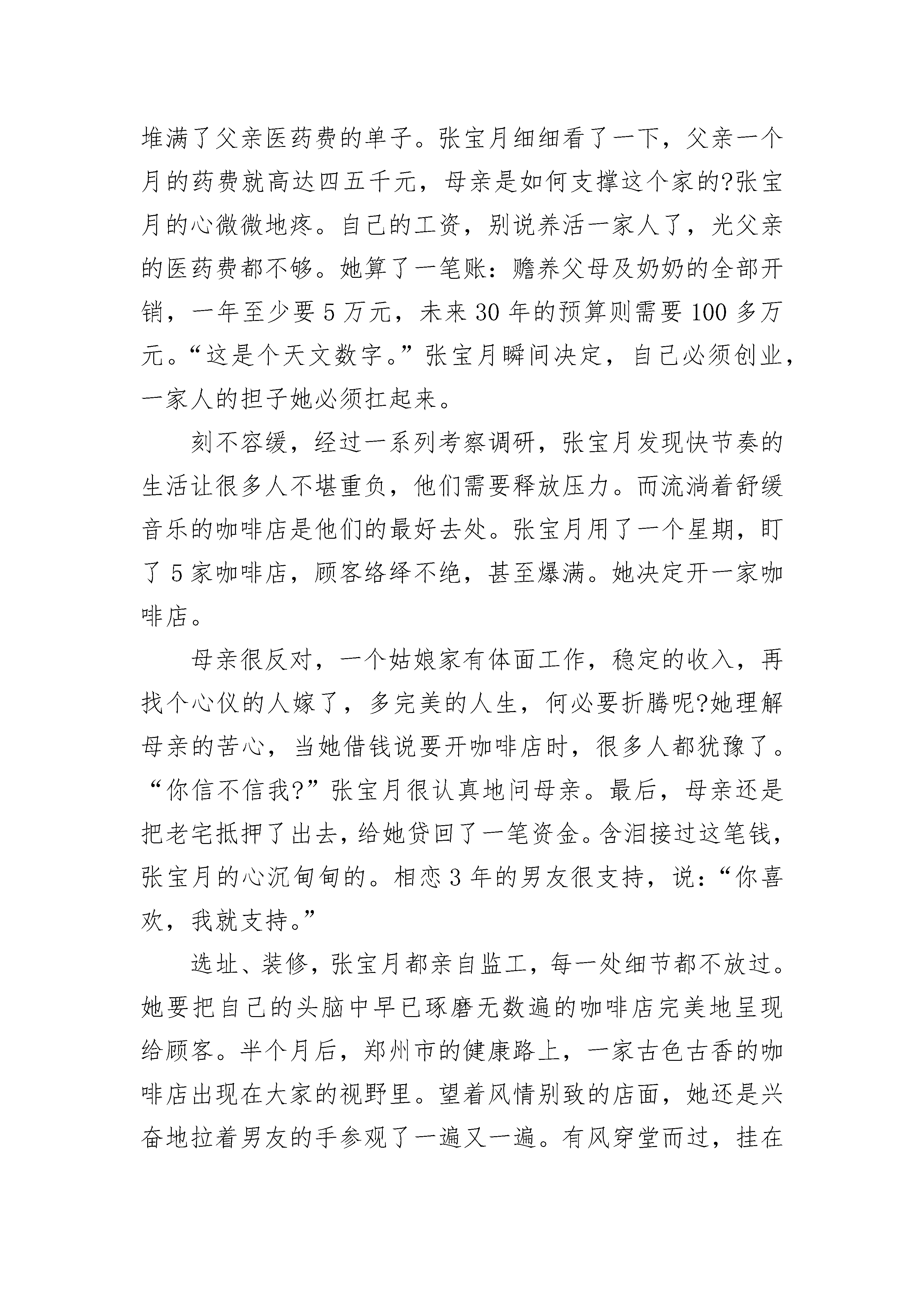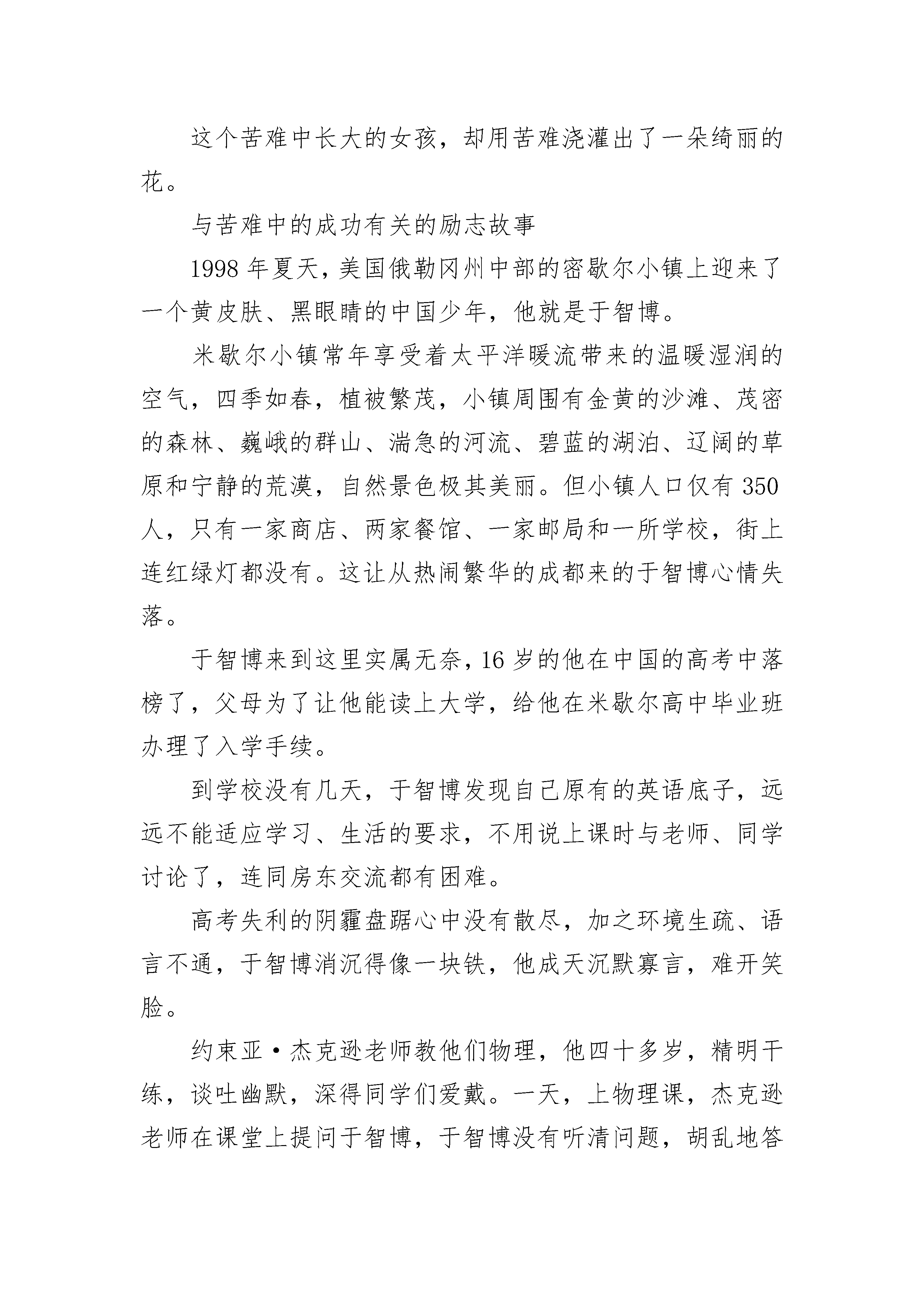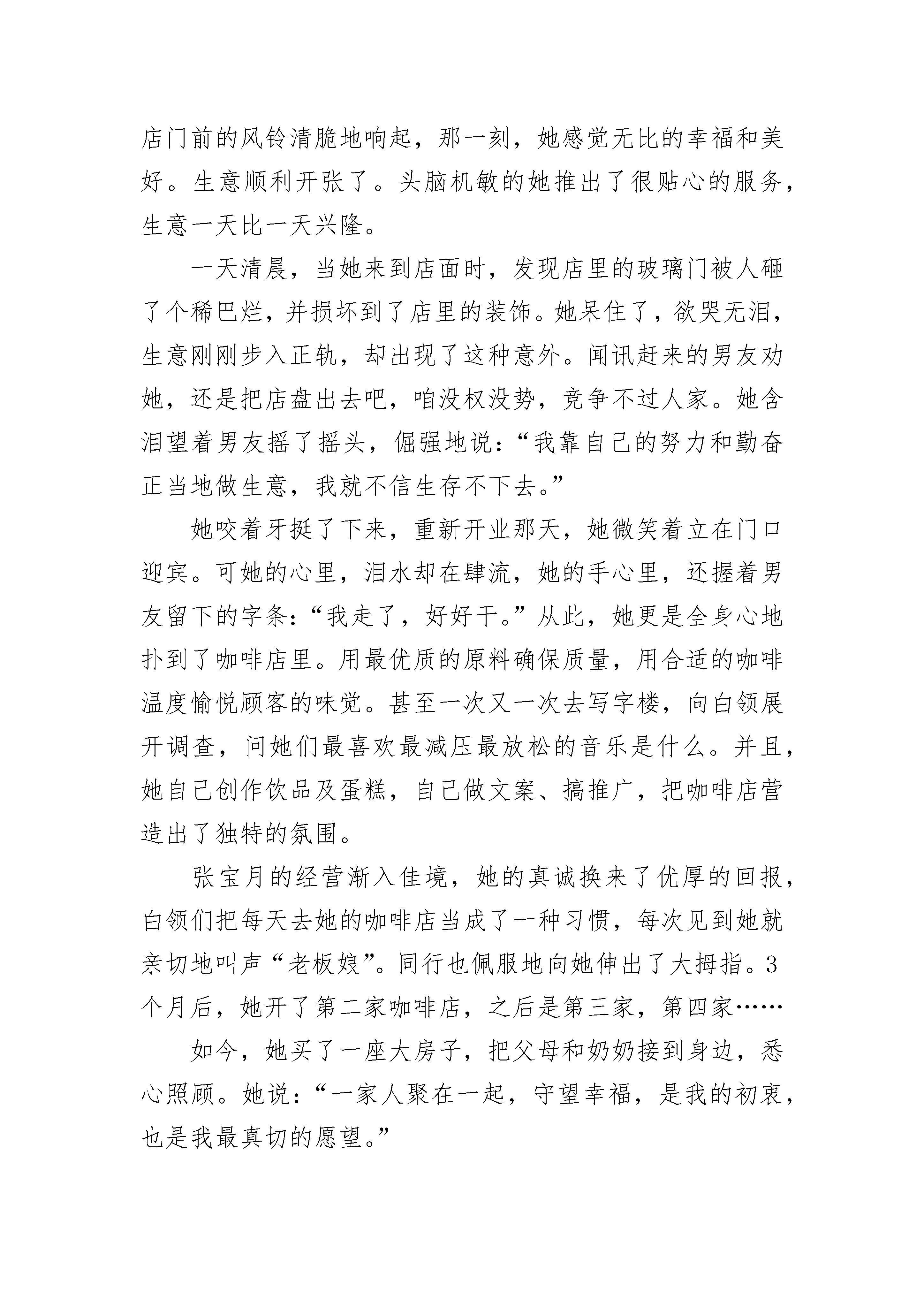 与苦难中的成功有关的励志故事烟灰色短裤,湖蓝短袖,26岁的张宝月,看起来干练清爽。但让人难以置信的是,这个年轻阳光的80后女孩,已是郑州市4家咖啡店的执行董事。更没人能够想象,这个看起来活泼坚强的女孩,承受了多少同龄人难以承受的生命之重。张宝月有一个幸福的童年,父亲经营着小超市,母亲做会计。虽然收入不高,但一家人相亲相爱,其乐融融。12岁那年,父亲遭遇了一场车祸,成了植物人,从此一睡不起,幸福也伴随着父亲的倒下戛然而止。含辛茹苦的母亲勇敢地挑起了生活的重担,她一边细心地照顾丈夫,一边辛苦地挣钱养家。懂事的宝月很早就体味到了母亲的艰辛,勤奋学习,以优异的成绩考上了一所大学。临行前,望着母亲头上日渐增多的白发,她在心底暗暗发誓,一定要尽快接过母亲肩上的重担,让母亲过上好日子。大学毕业后,她被一家杂志社录用为编辑。她努力工作,月薪也涨到3000元。一天,她兴冲冲地赶回家,她要把积攒的薪水交给母亲。却看到瘦弱的母亲一手扶着门框,一手扶着背上的父亲,要把他背到轮椅上晒太阳。她急忙上前帮忙,望着母亲花白的头发,皱纹纵横的脸上吃力的表情,张宝月的眼泪一下子掉了下来。岁月无情,曾经光彩照人的母亲老了,而自己,必须要接过母亲手中的接力棒。父亲的床上,几十年的旧床单干净整洁。床头的抽屉里,堆满了父亲医药费的单子。张宝月细细看了一下,父亲一个月的药费就高达四五千元,母亲是如何支撑这个家的?张宝月的心微微地疼。自己的工资,别说养活一家人了,光父亲的医药费都不够。她算了一笔账:赡养父母及奶奶的全部开销,一年至少要5万元,未来30年的预算则需要100多万元。“这是个天文数字。”张宝月瞬间决定,自己必须创业,一家人的担子她必须扛起来。刻不容缓,经过一系列考察调研,张宝月发现快节奏的生活让很多人不堪重负,他们需要释放压力。而流淌着舒缓音乐的咖啡店是他们的最好去处。张宝月用了一个星期,盯了5家咖啡店,顾客络绎不绝,甚至爆满。她决定开一家咖啡店。母亲很反对,一个姑娘家有体面工作,稳定的收入,再找个心仪的人嫁了,多完美的人生,何必要折腾呢?她理解母亲的苦心,当她借钱说要开咖啡店时,很多人都犹豫了。“你信不信我?”张宝月很认真地问母亲。最后,母亲还是把老宅抵押了出去,给她贷回了一笔资金。含泪接过这笔钱,张宝月的心沉甸甸的。相恋3年的男友很支持,说:“你喜欢,我就支持。”选址、装修,张宝月都亲自监工,每一处细节都不放过。她要把自己的头脑中早已琢磨无数遍的咖啡店完美地呈现给顾客。半个月后,郑州市的健康路上,一家古色古香的咖啡店出现在大家的视野里。望着风情别致的店面,她还是兴奋地拉着男友的手参观了一遍又一遍。有风穿堂而过,挂在店门前的风铃清脆地响起,那一刻,她感觉无比的幸福和美好。生意顺利开张了。头脑机敏的她推出了很贴心的服务,生意一天比一天兴隆。一天清晨,当她来到店面时,发现店里的玻璃门被人砸了个稀巴烂,并损坏到了店里的装饰。她呆住了,欲哭无泪,生意刚刚步入正轨,却出现了这种意外。闻讯赶来的男友劝她,还是把店盘出去吧,咱没权没势,竞争不过人家。她含泪望着男友摇了摇头,倔强地说:“我靠自己的努力和勤奋正当地做生意,我就不信生存不下去。”她咬着牙挺了下来,重新开业那天,她微笑着立在门口迎宾。可她的心里,泪水却在肆流,她的手心里,还握着男友留下的字条:“我走了,好好干。”从此,她更是全身心地扑到了咖啡店里。用最优质的原料确保质量,用合适的咖啡温度愉悦顾客的味觉。甚至一次又一次去写字楼,向白领展开调查,问她们最喜欢最减压最放松的音乐是什么。并且,她自己创作饮品及蛋糕,自己做文案、搞推广,把咖啡店营造出了独特的氛围。张宝月的经营渐入佳境,她的真诚换来了优厚的回报,白领们把每天去她的咖啡店当成了一种习惯,每次见到她就亲切地叫声“老板娘”。同行也佩服地向她伸出了大拇指。3个月后,她开了第二家咖啡店,之后是第三家,第四家……如今,她买了一座大房子,把父母和奶奶接到身边,悉心照顾。她说:“一家人聚在一起,守望幸福,是我的初衷,也是我最真切的愿望。”这个苦难中长大的女孩,却用苦难浇灌出了一朵绮丽的花。与苦难中的成功有关的励志故事1998年夏天,美国俄勒冈州中部的密歇尔小镇上迎来了一个黄皮肤、黑眼睛的中国少年,他就是于智博。米歇尔小镇常年享受着太平洋暖流带来的温暖湿润的空气,四季如春,植被繁茂,小镇周围有金黄的沙滩、茂密的森林、巍峨的群山、湍急的河流、碧蓝的湖泊、辽阔的草原和宁静的荒漠,自然景色极其美丽。但小镇人口仅有350人,只有一家商店、两家餐馆、一家邮局和一所学校,街上连红绿灯都没有。这让从热闹繁华的成都来的于智博心情失落。于智博来到这里实属无奈,16岁的他在中国的高考中落榜了,父母为了让他能读上大学,给他在米歇尔高中毕业班办理了入学手续。到学校没有几天,于智博发现自己原有的英语底