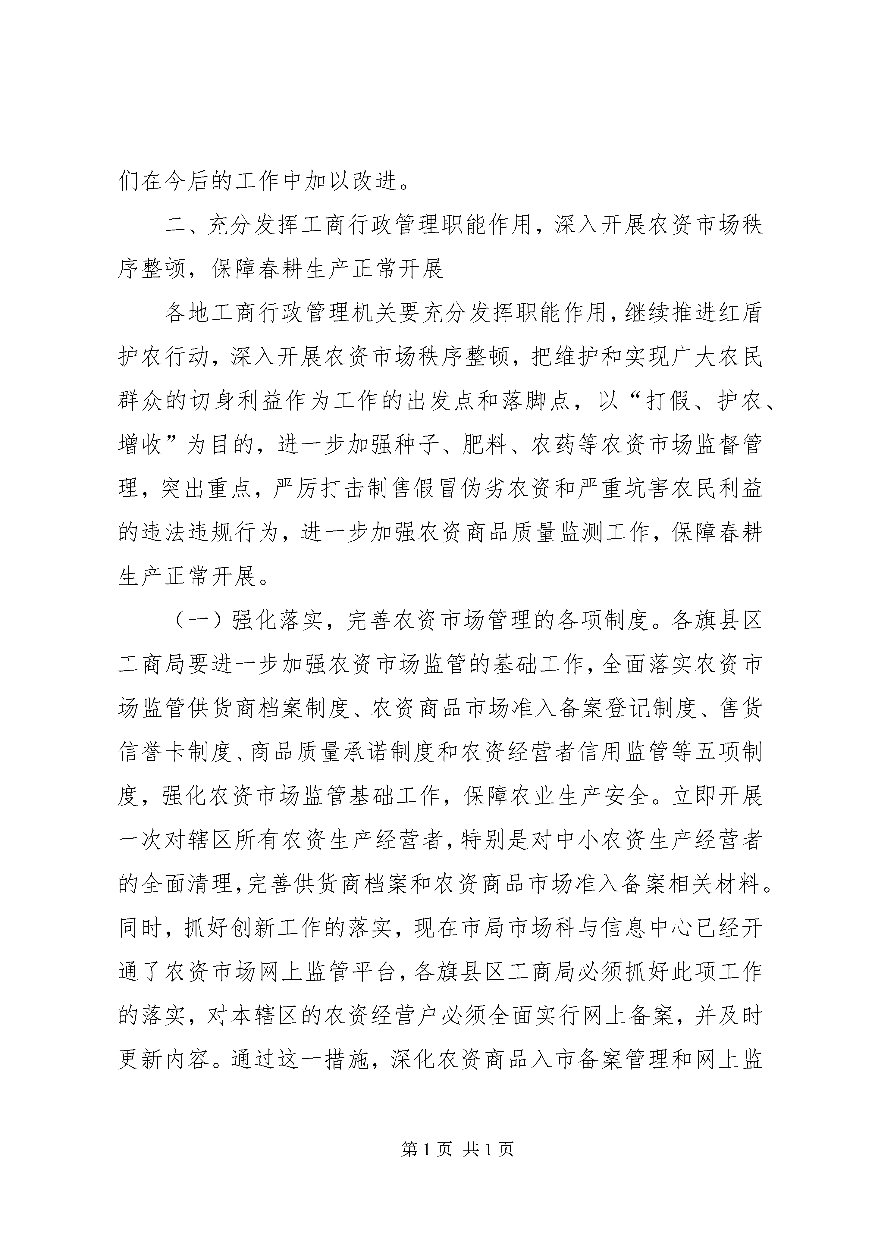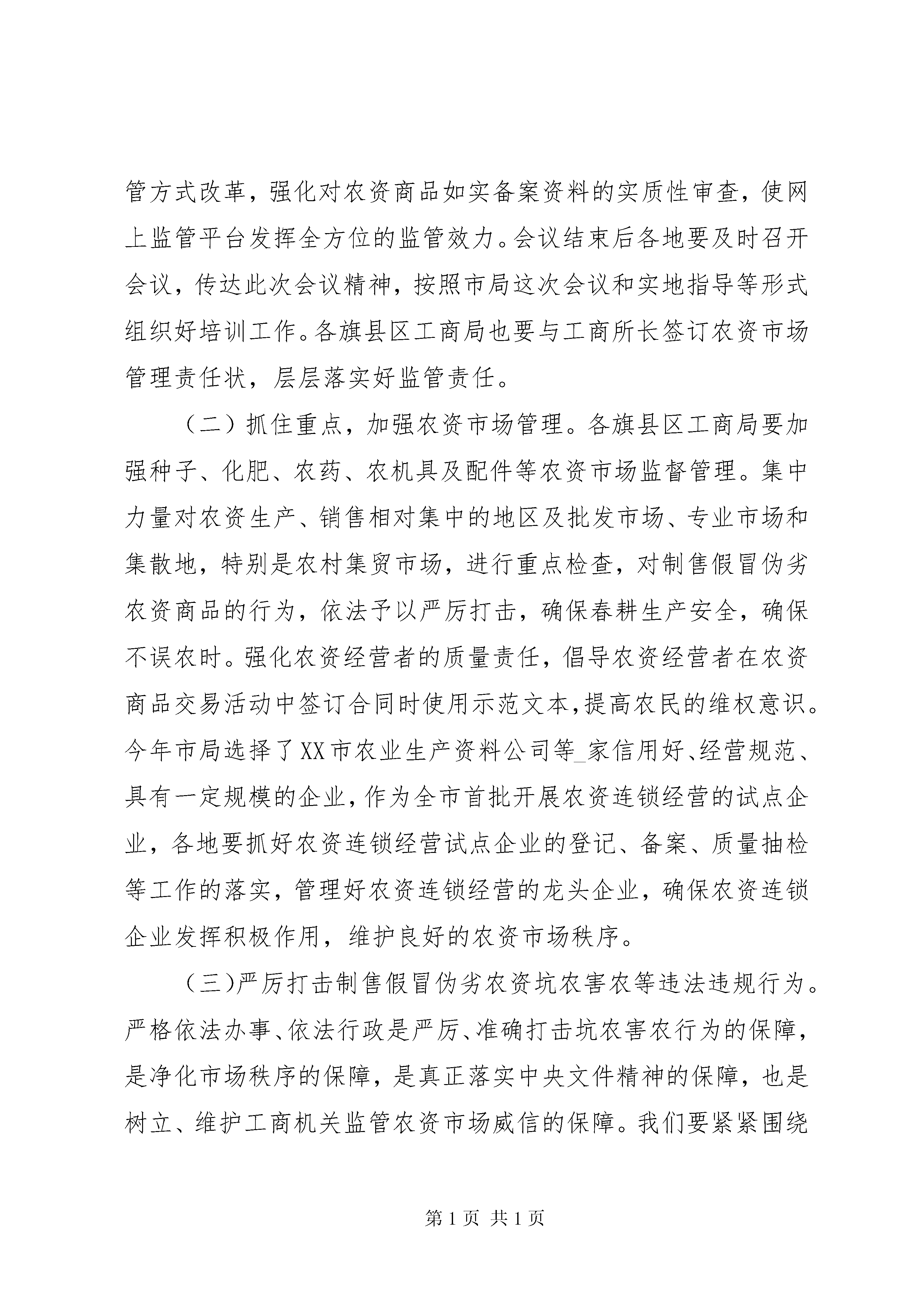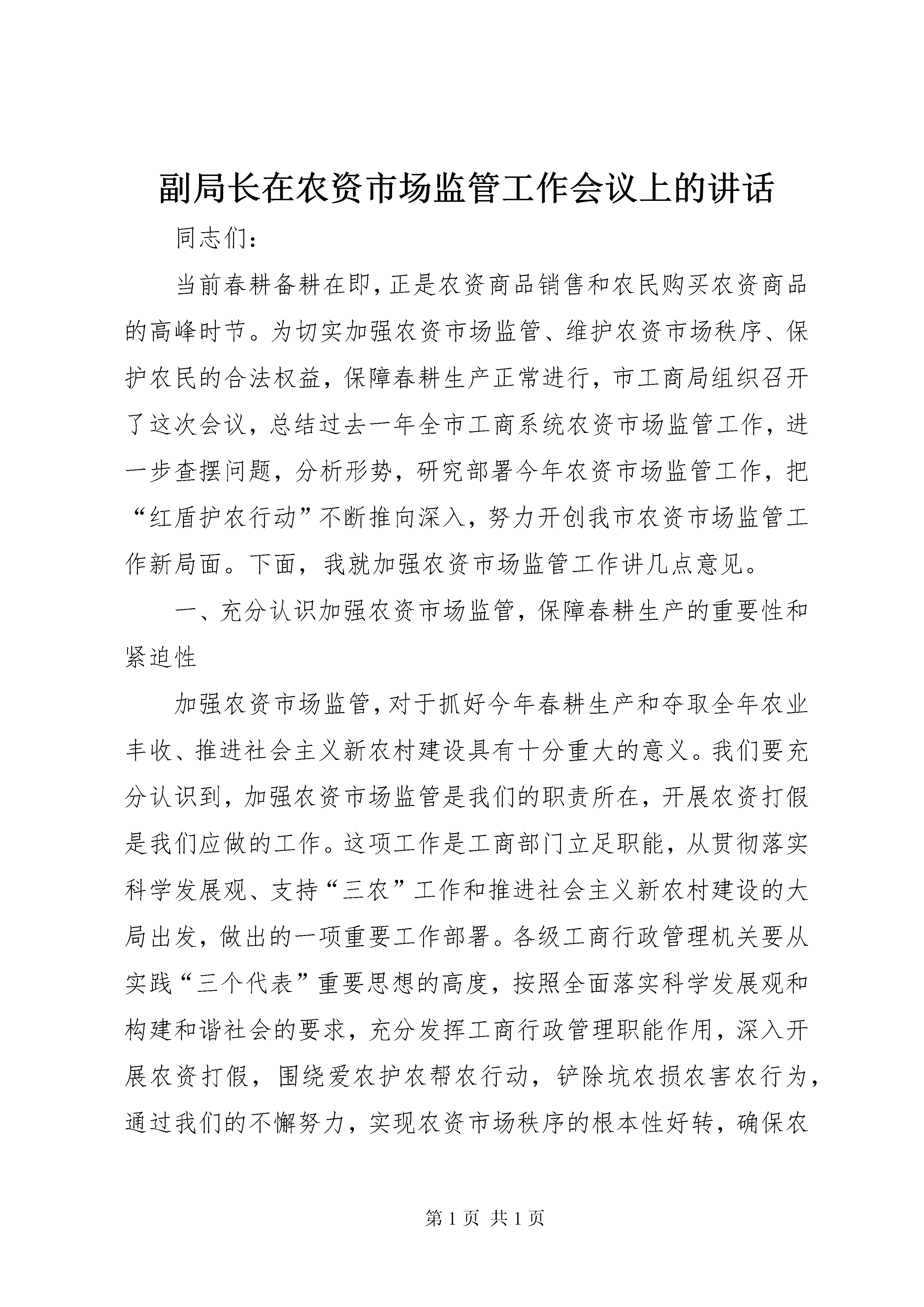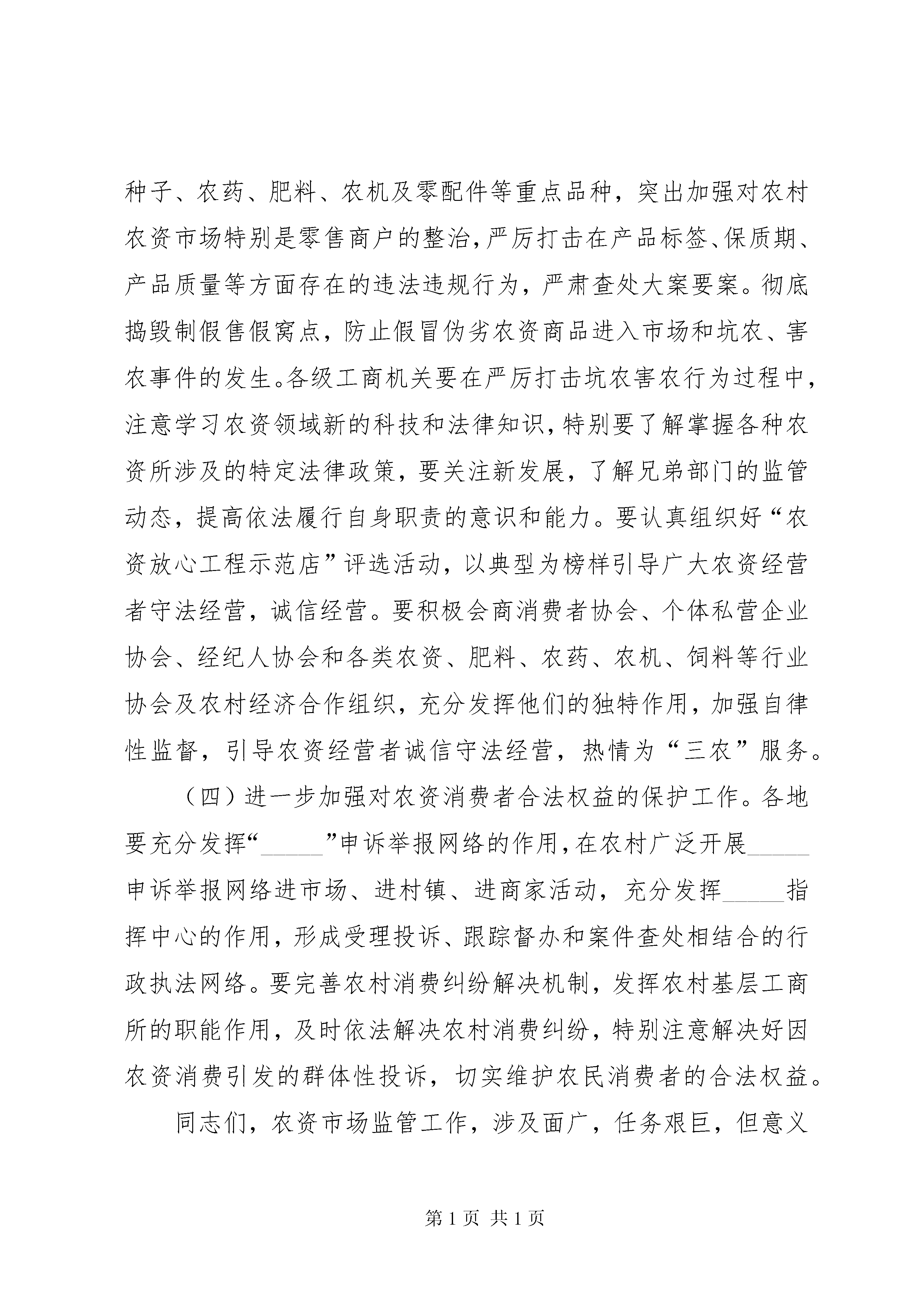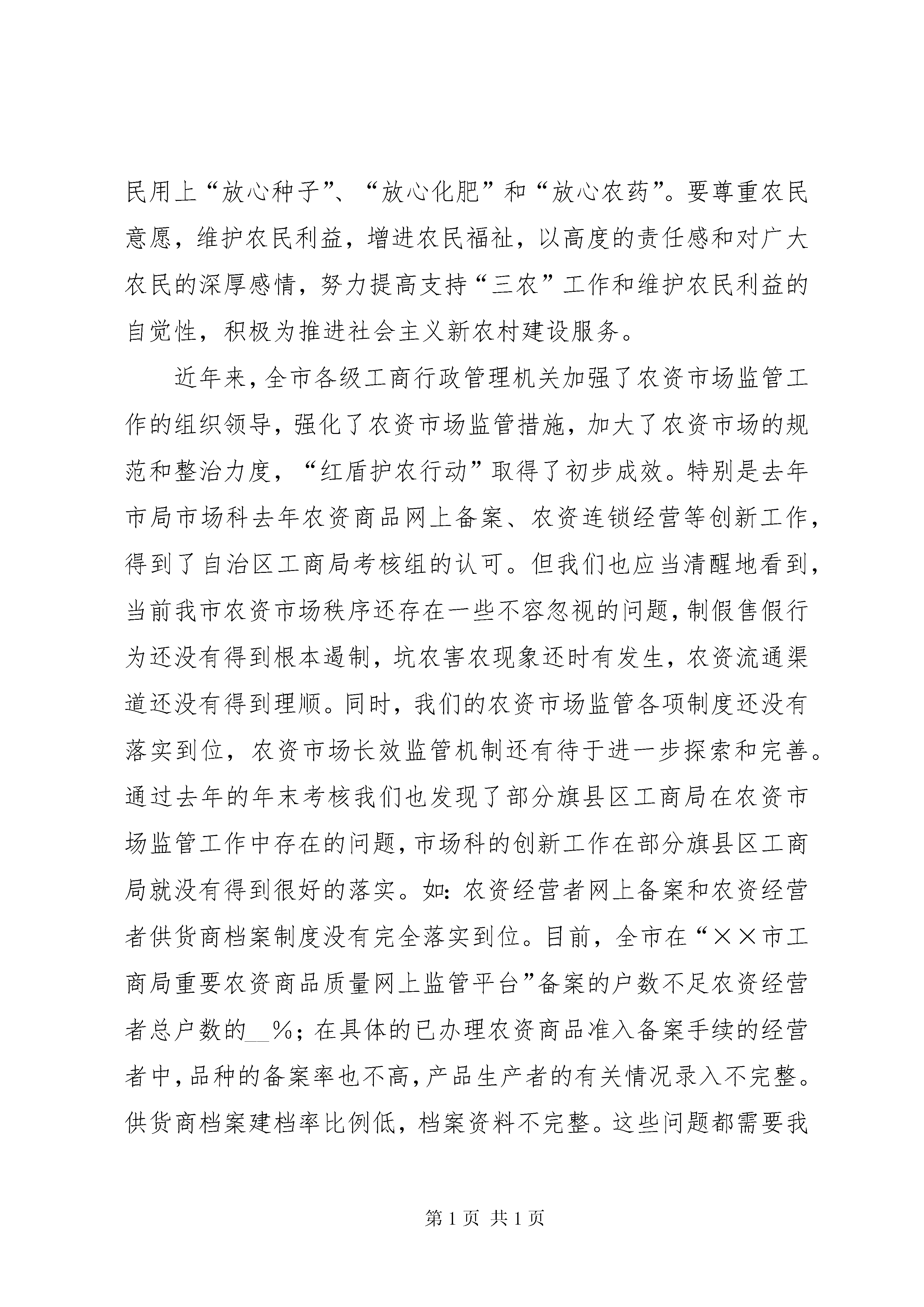 副局长在农资市场监管工作会议上的讲话同志们:当前春耕备耕在即,正是农资商品销售和农民购买农资商品的高峰时节。为切实加强农资市场监管、维护农资市场秩序、保护农民的合法权益,保障春耕生产正常进行,市工商局组织召开了这次会议,总结过去一年全市工商系统农资市场监管工作,进一步查摆问题,分析形势,研究部署今年农资市场监管工作,把“红盾护农行动”不断推向深入,努力开创我市农资市场监管工作新局面。下面,我就加强农资市场监管工作讲几点意见。一、充分认识加强农资市场监管,保障春耕生产的重要性和紧迫性加强农资市场监管,对于抓好今年春耕生产和夺取全年农业丰收、推进社会主义新农村建设具有十分重大的意义。我们要充分认识到,加强农资市场监管是我们的职责所在,开展农资打假是我们应做的工作。这项工作是工商部门立足职能,从贯彻落实科学发展观、支持“三农”工作和推进社会主义新农村建设的大局出发,做出的一项重要工作部署。各级工商行政管理机关要从实践“三个代表”重要思想的高度,按照全面落实科学发展观和构建和谐社会的要求,充分发挥工商行政管理职能作用,深入开展农资打假,围绕爱农护农帮农行动,铲除坑农损农害农行为,通过我们的不懈努力,实现农资市场秩序的根本性好转,确保农民用上“放心种子”、“放心化肥”和“放心农药”。要尊重农民意愿,维护农民利益,增进农民福祉,以高度的责任感和对广大农民的深厚感情,努力提高支持“三农”工作和维护农民利益的自觉性,积极为推进社会主义新农村建设服务。近年来,全市各级工商行政管理机关加强了农资市场监管工作的组织领导,强化了农资市场监管措施,加大了农资市场的规范和整治力度,“红盾护农行动”取得了初步成效。特别是去年市局市场科去年农资商品网上备案、农资连锁经营等创新工作,得到了自治区工商局考核组的认可。但我们也应当清醒地看到,当前我市农资市场秩序还存在一些不容忽视的问题,制假售假行为还没有得到根本遏制,坑农害农现象还时有发生,农资流通渠道还没有得到理顺。同时,我们的农资市场监管各项制度还没有落实到位,农资市场长效监管机制还有待于进一步探索和完善。通过去年的年末考核我们也发现了部分旗县区工商局在农资市场监管工作中存在的问题,市场科的创新工作在部分旗县区工商局就没有得到很好的落实。如:农资经营者网上备案和农资经营者供货商档案制度没有完全落实到位。目前,全市在“××市工商局重要农资商品质量网上监管平台”备案的户数不足农资经营者总户数的__%;在具体的已办理农资商品准入备案手续的经营者中,品种的备案率也不高,产品生产者的有关情况录入不完整。供货商档案建档率比例低,档案资料不完整。这些问题都需要我们在今后的工作中加以改进。二、充分发挥工商行政管理职能作用,深入开展农资市场秩序整顿,保障春耕生产正常开展各地工商行政管理机关要充分发挥职能作用,继续推进红盾护农行动,深入开展农资市场秩序整顿,把维护和实现广大农民群众的切身利益作为工作的出发点和落脚点,以“打假、护农、增收”为目的,进一步加强种子、肥料、农药等农资市场监督管理,突出重点,严厉打击制售假冒伪劣农资和严重坑害农民利益的违法违规行为,进一步加强农资商品质量监测工作,保障春耕生产正常开展。(一)强化落实,完善农资市场管理的各项制度。各旗县区工商局要进一步加强农资市场监管的基础工作,全面落实农资市场监管供货商档案制度、农资商品市场准入备案登记制度、售货信誉卡制度、商品质量承诺制度和农资经营者信用监管等五项制度,强化农资市场监管基础工作,保障农业生产安全。立即开展一次对辖区所有农资生产经营者,特别是对中小农资生产经营者的全面清理,完善供货商档案和农资商品市场准入备案相关材料。同时,抓好创新工作的落实,现在市局市场科与信息中心已经开通了农资市场网上监管平台,各旗县区工商局必须抓好此项工作的落实,对本辖区的农资经营户必须全面实行网上备案,并及时更新内容。通过这一措施,深化农资商品入市备案管理和网上监管方式改革,强化对农资商品如实备案资料的实质性审查,使网上监管平台发挥全方位的监管效力。会议结束后各地要及时召开会议,传达此次会议精神,按照市局这次会议和实地指导等形式组织好培训工作。各旗县区工商局也要与工商所长签订农资市场管理责任状,层层落实好监管责任。(二)抓住重点,加强农资市场管理。各旗县区工商局要加强种子、化肥、农药、农机具及配件等农资市场监督管理。集中力量对农资生产、销售相对集中的地区及批发市场、专业市场和集散地,特别是农村集贸市场,进行重点检查,对制售假冒伪劣农资商品的行为,依法予以严厉打击,确保春耕生产安全,确保不误农时。强化农资经营者的质量责任,倡导农资经营者在农资商品交易活动中签订合同时使用示范文本,提高农民的维权意识。今年市局选择了XX市农业生产资料公司等_家信用好、经营规范
