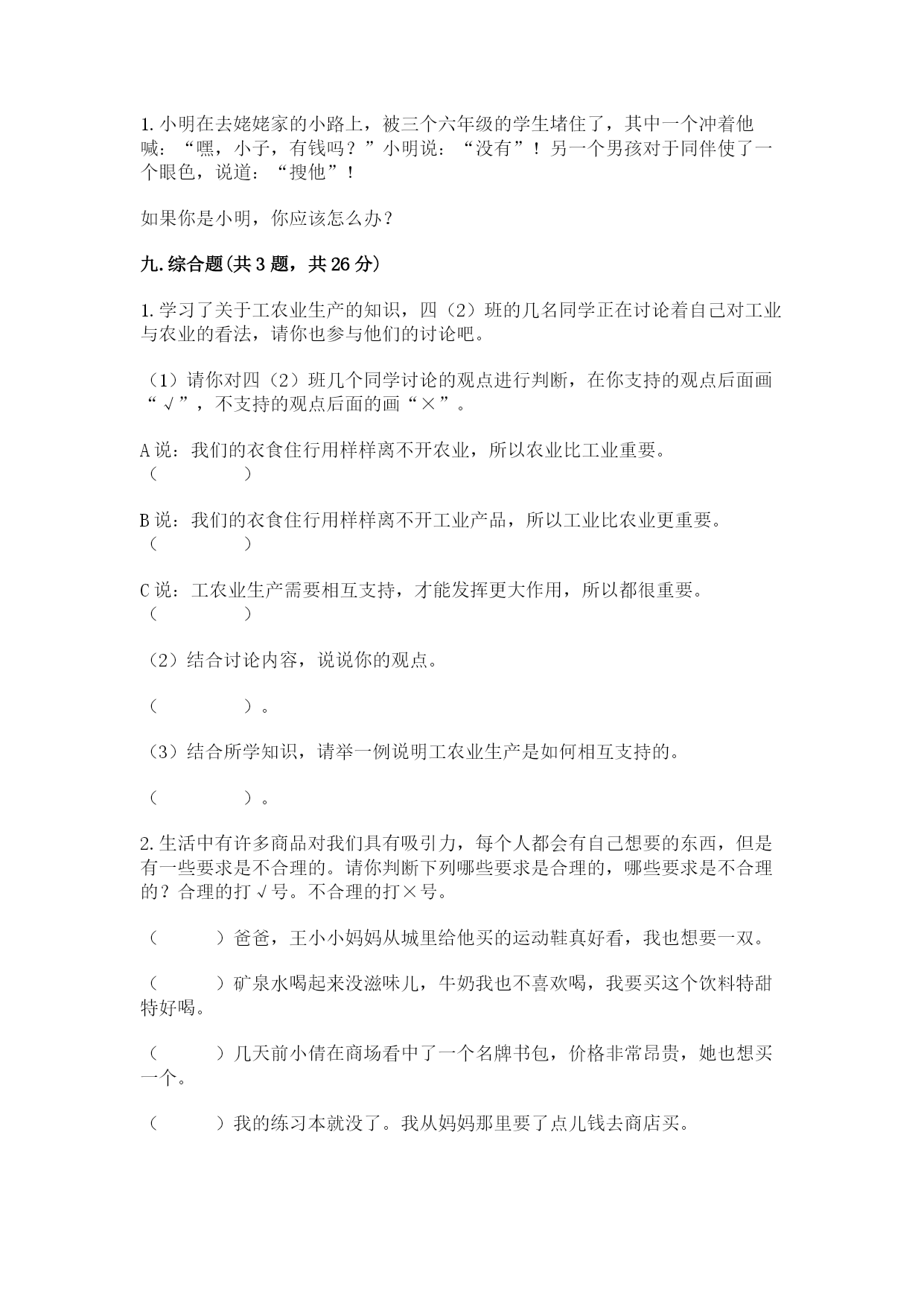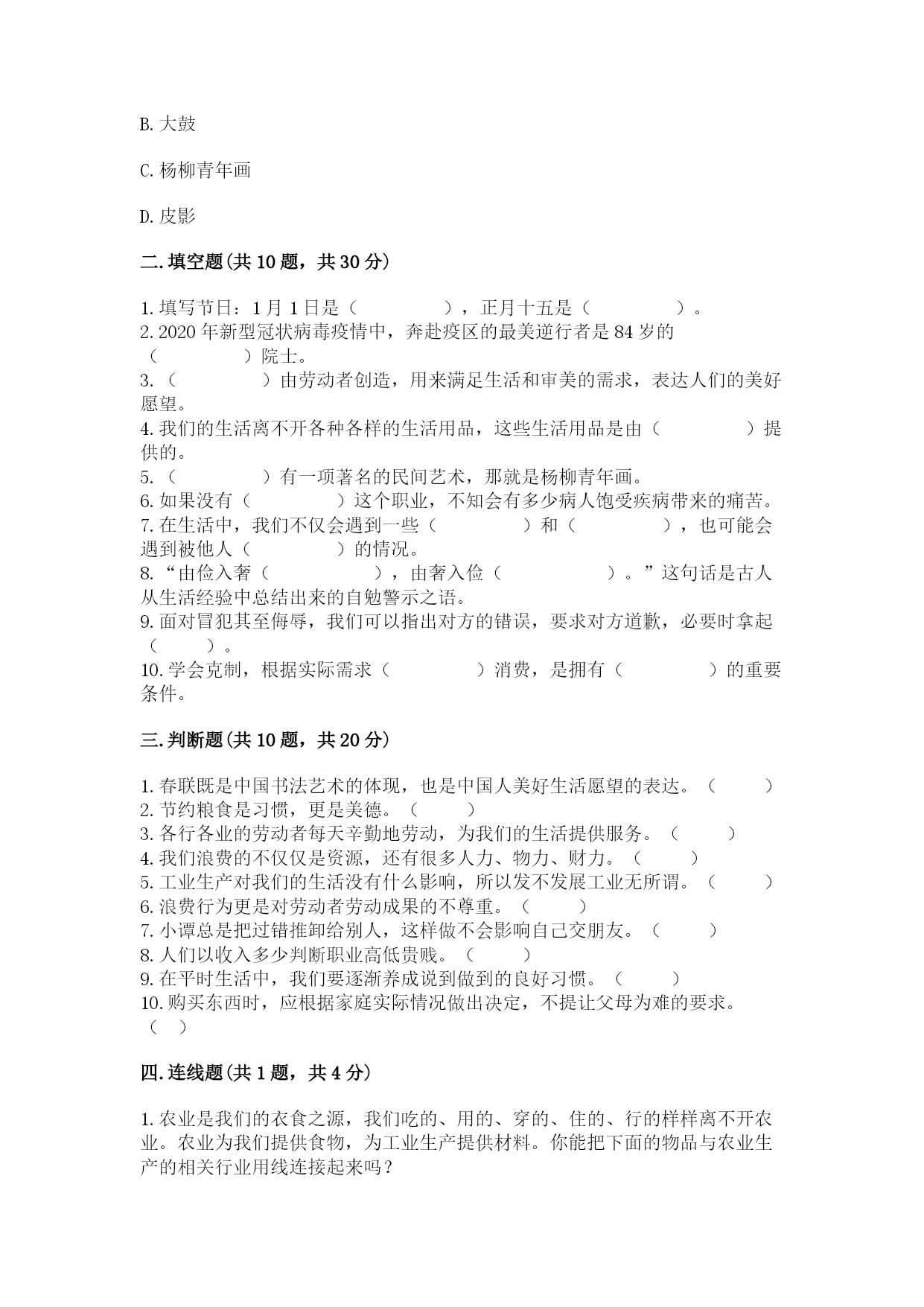 部编版四年级下册道德与法治期末测试卷一.选择题(共10题,共20分)1.以下做法不会伤害到友谊的做法是()。A.选班长时,好友王明把票投给了更适合当班长的孟华,子晴很生气地质问王明:“为什么不投我一票?”B.李强和王赞因小事吵了起来,好友张帅劝李强不要冲动,李强埋怨张帅不帮他C.好朋友李玉和张冲到图书室借阅《中国古代神话传说故事》,可只剩下一本,张帅让给了李玉,李玉提议一块读2.过度的消费会()。A.入不敷出B.量入为出C.精打细算3.下列()不是中国重要的传统节日。A.春节B.儿童节C.中秋节4.下列行为错误的是()。A.我想买漫画书,妈妈不给买,我很不开心,后来到爷爷家住了两天就忘了不开心的事B.小丽从来不赶时髦,也从不与同学攀比C.小明从来不买矿泉水喝,都是买可乐等饮料5.“民间叙事长诗”《阿诗玛》是()的文学作品。A.彝族B.苗族C.侗族D.傣族6.端午节是农历的()。A.二月初二B.三月初三C.五月初五7.在新型冠状病毒防控时期,我们应该注意()。①勤洗手②多串门③勤消毒④少聚会⑤多通风A.①②③B.②③④C.③④⑤D.②④⑤8.下列不属于大米来源的步骤的是()。A.插秧B.收割C.碾米D.磨面9.下列哪一种植物严禁非法种植()。A.罂粟B.水稻C.茶叶10.产生于天津地区的民间艺术是()。A.秧歌B.大鼓C.杨柳青年画D.皮影二.填空题(共10题,共30分)1.填写节日:1月1日是(),正月十五是()。2.2020年新型冠状病毒疫情中,奔赴疫区的最美逆行者是84岁的()院士。3.()由劳动者创造,用来满足生活和审美的需求,表达人们的美好愿望。4.我们的生活离不开各种各样的生活用品,这些生活用品是由()提供的。5.()有一项著名的民间艺术,那就是杨柳青年画。6.如果没有()这个职业,不知会有多少病人饱受疾病带来的痛苦。7.在生活中,我们不仅会遇到一些()和(),也可能会遇到被他人()的情况。8.“由俭入奢(),由奢入俭()。”这句话是古人从生活经验中总结出来的自勉警示之语。9.面对冒犯其至侮辱,我们可以指出对方的错误,要求对方道歉,必要时拿起()。10.学会克制,根据实际需求()消费,是拥有()的重要条件。三.判断题(共10题,共20分)1.春联既是中国书法艺术的体现,也是中国人美好生活愿望的表达。()2.节约粮食是习惯,更是美德。()3.各行各业的劳动者每天辛勤地劳动,为我们的生活提供服务。()4.我们浪费的不仅仅是资源,还有很多人力、物力、财力。()5.工业生产对我们的生活没有什么影响,所以发不发展工业无所谓。()6.浪费行为更是对劳动者劳动成果的不尊重。()7.小谭总是把过错推卸给别人,这样做不会影响自己交朋友。()8.人们以收入多少判断职业高低贵贱。()9.在平时生活中,我们要逐渐养成说到做到的良好习惯。()10.购买东西时,应根据家庭实际情况做出决定,不提让父母为难的要求。()四.连线题(共1题,共4分)1.农业是我们的衣食之源,我们吃的、用的、穿的、住的、行的样样离不开农业。农业为我们提供食物,为工业生产提供材料。你能把下面的物品与农业生产的相关行业用线连接起来吗?地瓜畜牧业木材渔业牛羊肉种植业螃蟹林业五.填表题(共1题,共7分)1.对祖辈、父辈以及自己三代人的衣食住行用等方面做一个调查,看看有哪些变化?(可以用图表)六.简答题(共6题,共36分)1.你有网购经历吗?你知道网购需要注意哪些问题吗?分享一下你的经验吧。2.想一想,生活中你和家人都接受过哪些劳动者提供的服务?如果缺少了这些服务,会给生活带来什么影响?3.除了电梯、洗衣机、空调外,你还能举出哪些使人们生活方便的工业产品。4.你是否有过说话不算数的经历,当时你是怎么想的,怎么做的,选取印象最深刻的一段经历,写下来。事情的经过是这样的()。我当时这样做是因为()。下一次我会()。5.米饭是我们熟悉的食物,你知道这小小的一粒米是怎样来的吗?6.你有没有和你的同学产生过冲突?你当时是怎么化解冲突的?如果是现在,你会怎么解决?七.辨析题(共1题,共12分)1.小雯同学去超市买东西,结账时,警报器突然响了,保安非说她夹带了没有付款的商品,要翻看她的书包,她只好把口袋和书包翻给他们看了。没发现什么问题,后来才发现是警报器出了问题。事后,小雯有点不开心,妈妈劝她说:“算了,给他们看看口袋和书包没什么,咱们身正不怕影子斜。”分析:你觉得小雯妈妈的做法可取吗?为什么?如果是你,你觉得应该怎么做?八.材料题(共1题,共4分)1.小明在去姥姥家的小路上,被三个六年级的学生堵住了,其中一个冲着他喊:“嘿,小子,有钱吗?”小明说:“没有”!另一个男孩对于同伴使了一个眼色,说道:“搜他”!如果你是小明,你应该怎么办?九.综合题(共3题,共26分)1.学习了关于工农业生产的知