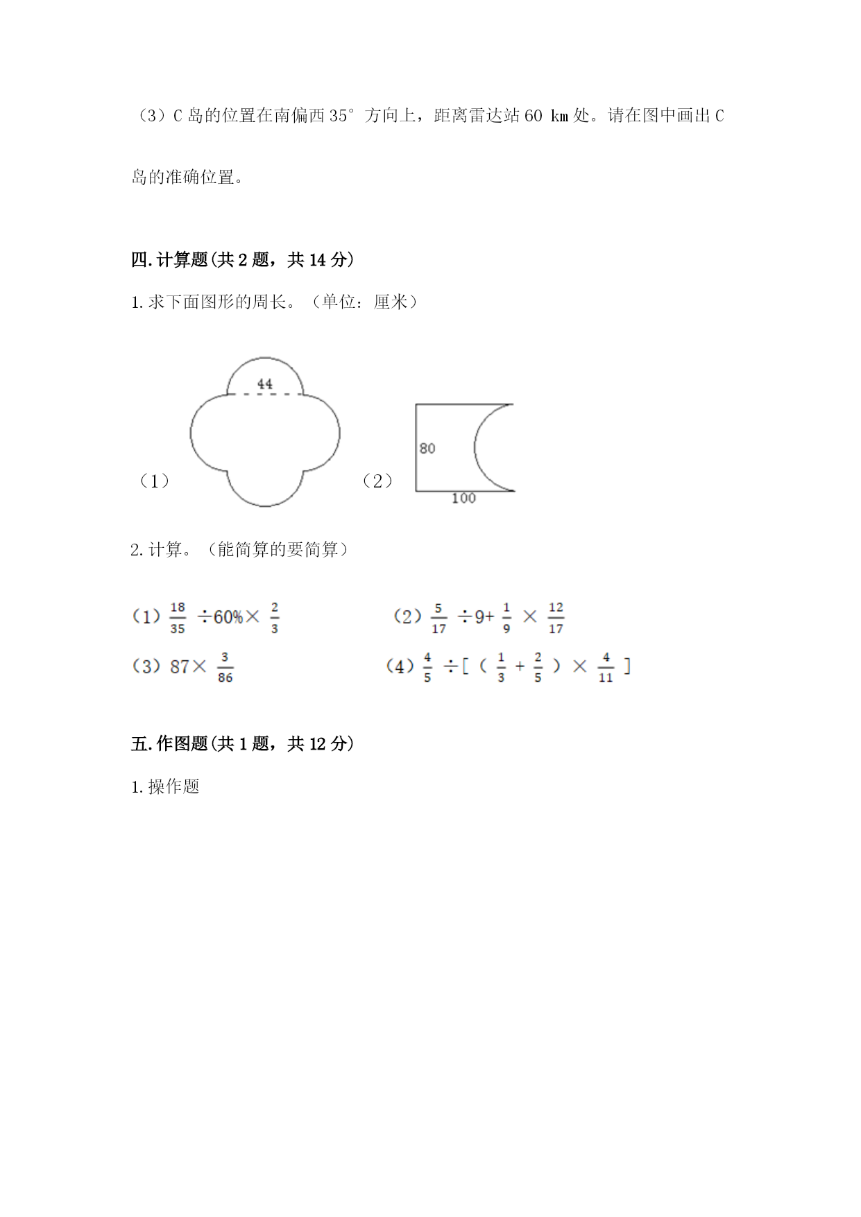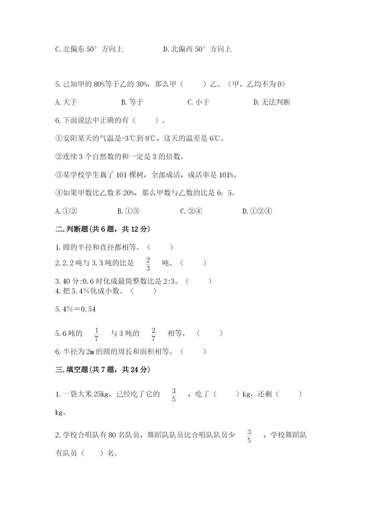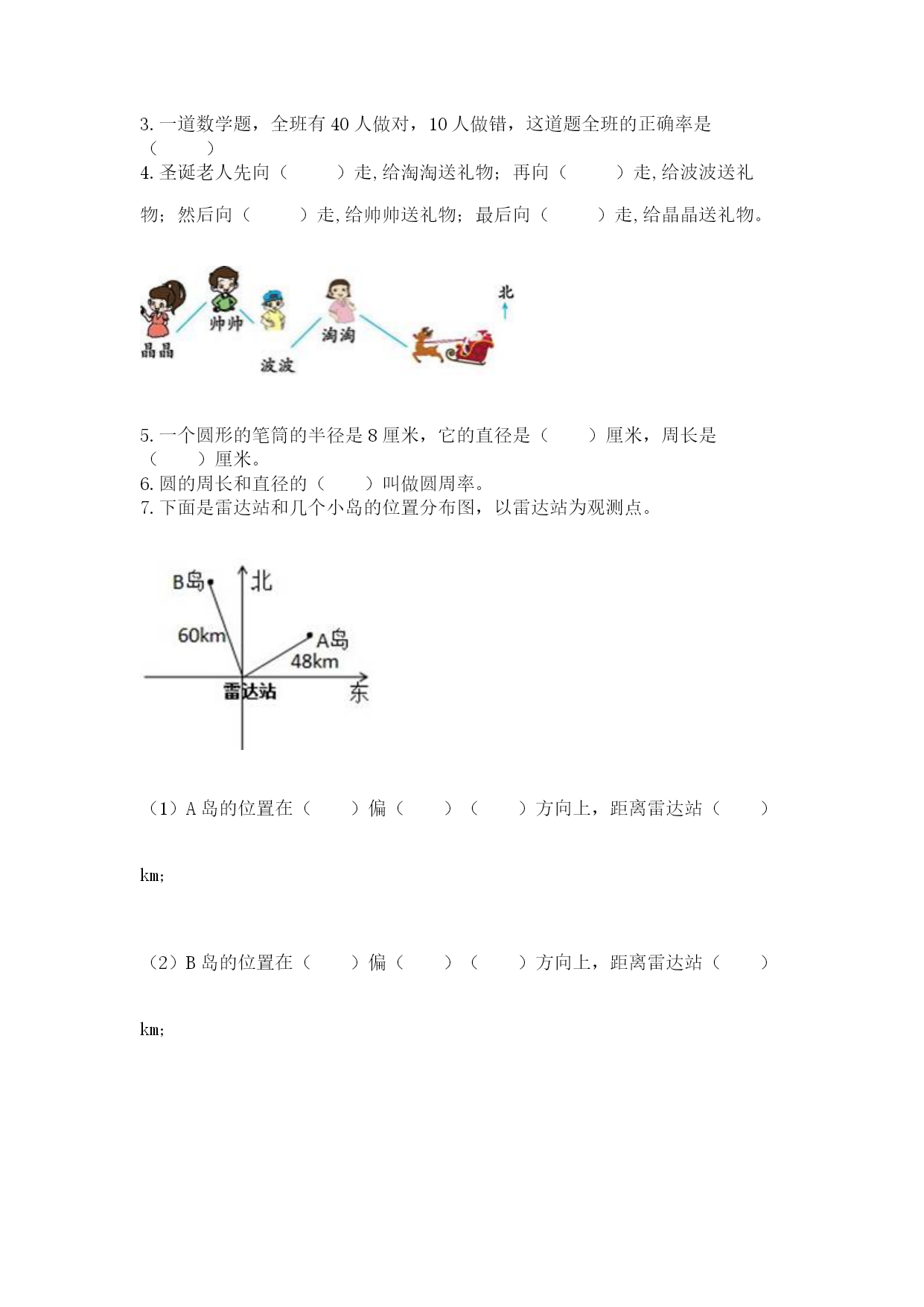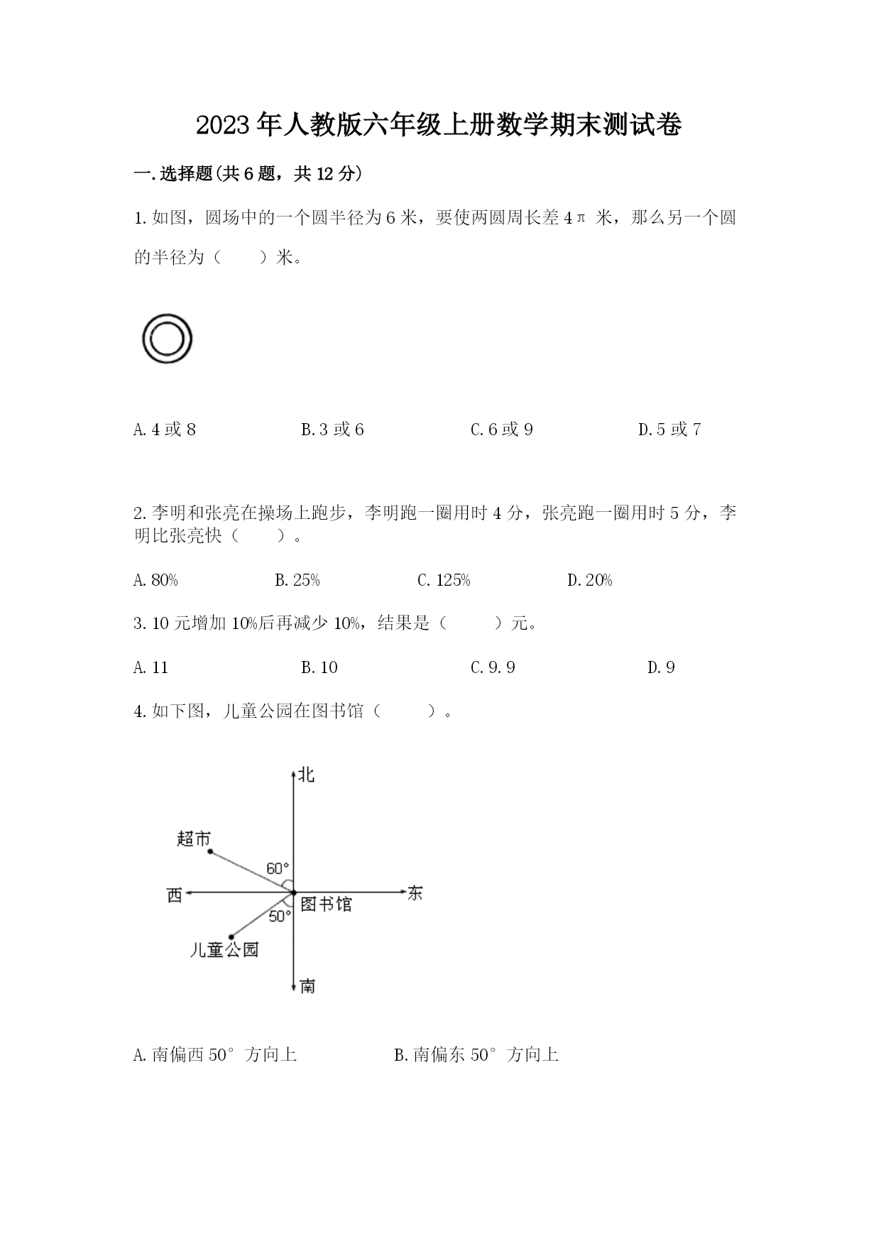 2023年人教版六年级上册数学期末测试卷一.选择题(共6题,共12分)1.如图,圆场中的一个圆半径为6米,要使两圆周长差4π米,那么另一个圆的半径为()米。A.4或8B.3或6C.6或9D.5或72.李明和张亮在操场上跑步,李明跑一圈用时4分,张亮跑一圈用时5分,李明比张亮快()。A.80%B.25%C.125%D.20%3.10元增加10%后再减少10%,结果是()元。A.11B.10C.9.9D.94.如下图,儿童公园在图书馆()。A.南偏西50°方向上B.南偏东50°方向上C.北偏东50°方向上D.北偏西50°方向上5.已知甲的80%等于乙的30%,那么甲()乙。(甲、乙均不为0)A.大于B.等于C.小于D.无法判断6.下面说法中正确的有()。①安阳某天的气温是-3℃到9℃,这天的温差是6℃。②连续3个自然数的和一定是3的倍数。③某学校学生栽了101棵树,全部成活,成活率是101%。④如果甲数比乙数多20%,那么甲数与乙数的比是6:5。A.①②B.①③C.②④D.①②④二.判断题(共6题,共12分)1.圆的半径和直径都相等。()2.2.2吨与3.3吨的比是吨。()3.40分:0.6时化成最简整数比是2:3。()4.把5.4%化成小数。()5.4%=0.545.6吨的与3吨的相等。()6.半径为2m的圆的周长和面积相等。()三.填空题(共7题,共24分)1.一袋大米25kg,已经吃了它的,吃了()kg,还剩()kg。2.学校合唱队有80名队员,舞蹈队队员比合唱队队员少,学校舞蹈队有队员()名。3.一道数学题,全班有40人做对,10人做错,这道题全班的正确率是()4.圣诞老人先向()走,给淘淘送礼物;再向()走,给波波送礼物;然后向()走,给帅帅送礼物;最后向()走,给晶晶送礼物。5.一个圆形的笔筒的半径是8厘米,它的直径是()厘米,周长是()厘米。6.圆的周长和直径的()叫做圆周率。7.下面是雷达站和几个小岛的位置分布图,以雷达站为观测点。(1)A岛的位置在()偏()()方向上,距离雷达站()km;(2)B岛的位置在()偏()()方向上,距离雷达站()km;(3)C岛的位置在南偏西35°方向上,距离雷达站60km处。请在图中画出C岛的准确位置。四.计算题(共2题,共14分)1.求下面图形的周长。(单位:厘米)(1)(2)2.计算。(能简算的要简算)五.作图题(共1题,共12分)1.操作题(1)把圆移到圆心是(8,2)的位置上。(2)把图形A绕O点逆时针旋转90°。(3)请画出轴对称图形B的另一半。六.解答题(共6题,共31分)1.用两根长3.14米的铁丝分别围成一个正方形和一个圆,哪个面积大?大多少?2.图书室中,故事书有175本,科学书有150本。故事书比科学书多百分之几?3.一桶洗衣粉,第一次倒出全桶的22%,第二次倒出全桶的23%,还剩下2.2千克,这桶洗衣粉原有多少千克?4.随着地铁六号线一期的全线贯通,天津地铁日均客流量由原来的80万人次,增加到现在的100万人次.天津地铁日均客流量增加了百分之几?5.一项绿化工程,实际投资765万元,计划投资900万元,实际投资比计划投资节约百分之几?6.学校建综合楼,计划投资120万元,实际节约了30万元,节约了百分之几?参考答案一.选择题1.A2.B3.C4.A5.C6.C二.判断题1.×2.×3.×4.×5.√6.×三.填空题1.15;102.323.80%4.西北;西南;西北;西南5.16;50.246.比7.(1)东,北,30°,48;(2)北,西,20°,60;(3)见下图。四.计算题1.(1)3.14×44×2=138.16×2=276.32(厘米)(2)3.14×80÷2+100×2+80=251.2÷2+100×2+80=125.6+200+80=325.6+80=405.6(厘米)2.(1);(2);(3);(4)3五.作图题1.(1)(2)(3)六.解答题1.3.14÷4=0.785(米),0.785×0.785=0.61625(平方米)3.14÷3.14÷2=0.5(米),3.14×0.5=0.785(平方米)0.785-0.61625=0.16875(平方米)答:圆的面积大,大0.16875平方米。2.解:(175-150)÷150×100%=16.7%答:故事书比科学书多16.7%。3.解:2.2÷(1-22%-23%)=4(千克)4.解:(100﹣80)÷80=20÷80=25%答:天津地铁日均客流量增加了25%。5.解:(900-765)÷900×100%=15%答:实际投资比计划投资节约15%。6.解:30÷120