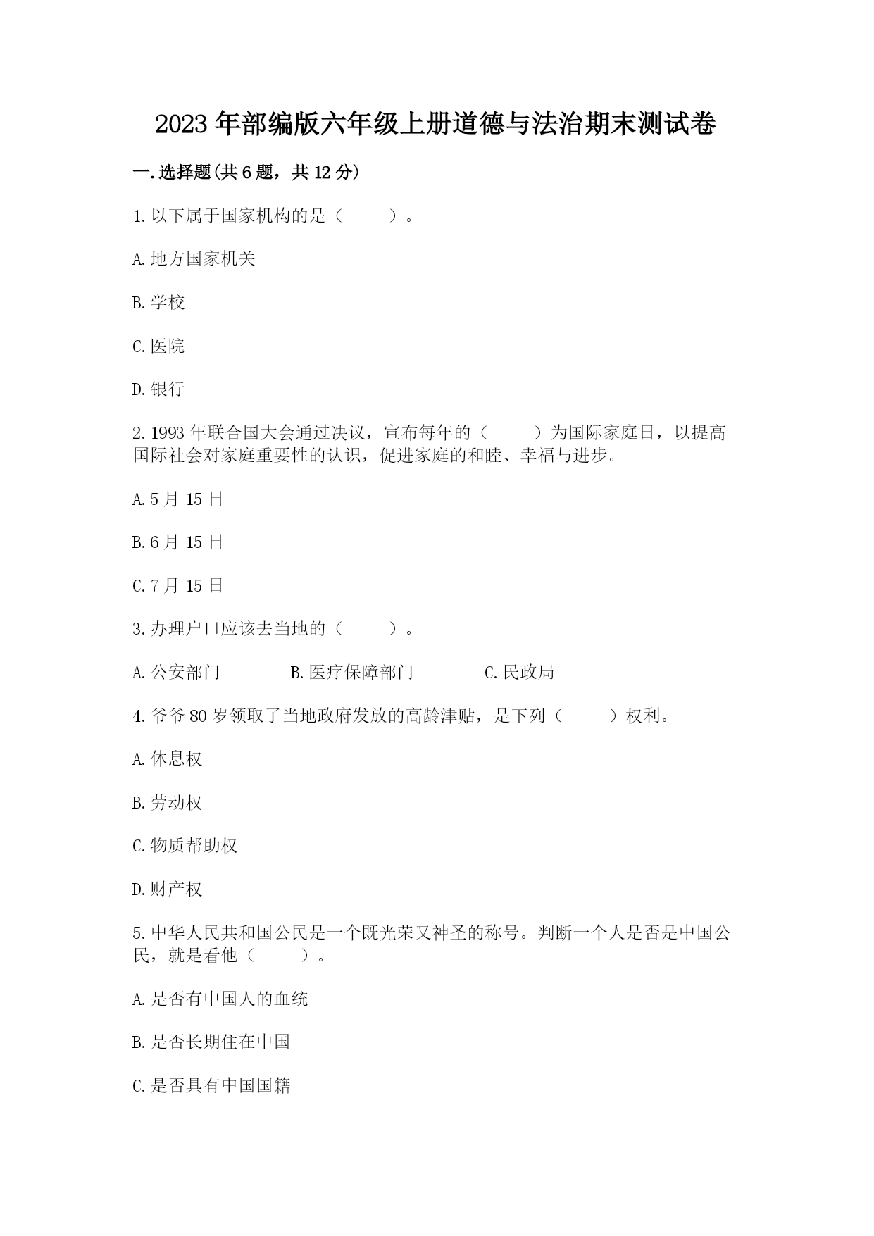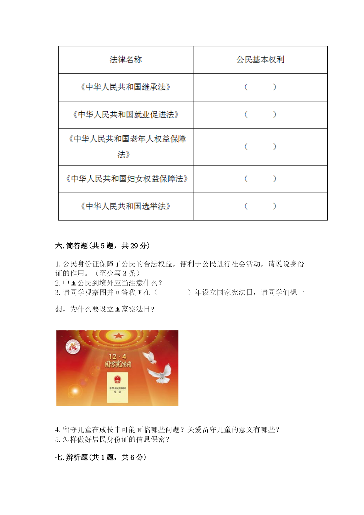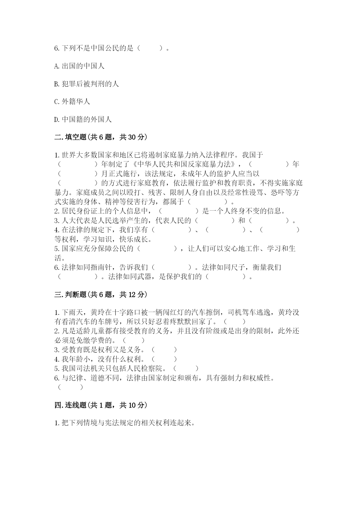 2023年部编版六年级上册道德与法治期末测试卷一.选择题(共6题,共12分)1.以下属于国家机构的是()。A.地方国家机关B.学校C.医院D.银行2.1993年联合国大会通过决议,宣布每年的()为国际家庭日,以提高国际社会对家庭重要性的认识,促进家庭的和睦、幸福与进步。A.5月15日B.6月15日C.7月15日3.办理户口应该去当地的()。A.公安部门B.医疗保障部门C.民政局4.爷爷80岁领取了当地政府发放的高龄津贴,是下列()权利。A.休息权B.劳动权C.物质帮助权D.财产权5.中华人民共和国公民是一个既光荣又神圣的称号。判断一个人是否是中国公民,就是看他()。A.是否有中国人的血统B.是否长期住在中国C.是否具有中国国籍6.下列不是中国公民的是()。A.出国的中国人B.犯罪后被判刑的人C.外籍华人D.中国籍的外国人二.填空题(共6题,共30分)1.世界大多数国家和地区已将遏制家庭暴力纳入法律程序。我国于()年制定了《中华人民共和国反家庭暴力法》,()年()月正式施行,该法规定,未成年人的监护人应当以()的方式进行家庭教育,依法履行监护和教育职责,不得实施家庭暴力。家庭成员之间以殴打、残害、限制人身自由以及经常性谩骂、恐吓等方式实施的身体、精神等侵害行为,都属于()。2.居民身份证上的个人信息中,()是一个人终身不变的信息。3.人大代表是人民选举产生的,代表人民的()和()。4.在法律的规定下,我们享有()、()、()等权利,学习知识,快乐成长。5.国家应充分保障公民的(),让人们可以安心地工作、学习和生活。6.法律如同指南针,告诉我们()。法律如同尺子,衡量我们()。法律如同武器,是保护我们的()。三.判断题(共6题,共12分)1.下雨天,黄玲在十字路口被一辆闯红灯的汽车擦倒,司机驾车逃逸,黄玲没有看清汽车的车牌号,所以只好忍着疼默默回家了。()2.凡是适龄儿童都有接受教育的义务,并且没有阶级或是出身的限制,此外还必须是免缴学费的。()3.受教育既是权利又是义务。()4.我年龄小,没有什么权利。()5.我国司法机关只包括人民检察院。()6.与纪律、道德不同,法律由国家制定和颁布,具有强制力和权威性。()四.连线题(共1题,共10分)1.把下列情境与宪法规定的相关权利连起来。五.填表题(共1题,共10分)1.请将法律名称与其保障的公民基本权利对应,在横线处填入序号即可。①选举权与被选举权②劳动权③物质帮助权④女性的权利⑤财产权六.简答题(共5题,共29分)1.公民身份证保障了公民的合法权益,便利于公民进行社会活动,请说说身份证的作用。(至少写3条)2.中国公民到境外应当注意什么?3.请同学观察图并回答我国在()年设立国家宪法日,请同学们想一想,为什么要设立国家宪法日?4.留守儿童在成长中可能面临哪些问题?关爱留守儿童的意义有哪些?5.怎样做好居民身份证的信息保密?七.辨析题(共1题,共6分)1.2020年10月新修订的《未成年人保护法》新增了“网络保护”“政府保护”章节,这引起了同学们的热议。小北认为“国家集合了全社会的力量,创造了有利于未成年人健康成长的良好环境,一定能够杜绝未成年人违法犯罪。”你赞同小北的观点吗?请说明理由。八.材料题(共1题,共8分)1.材料探究题。17岁的赵佳在假期结识了社会上的一些不良分子,并在他们的诱惑下多次参与赌博,欠下500多元赌债。为了偿还赌债,赵佳多次手持三棱刮刀,强行劫取9名小学生的财物,得赃款400余元。人民法院认定赵佳犯了抢劫罪,依法判处有期徒刑。1.赵佳触犯的法律是()。A.《中华人民共和国继承法》B.《中华人民共和国选举法》C.《中华人民共和国刑法》2.怎样有效预防未成年人违法犯罪?九.综合题(共2题,共14分)1.以下是某校六年级小张同学在学校的两段经历。对此,六年级(2)班举行了以“正确行使权利,自觉履行义务”为内容的主题班会,请你参与其中。(1)请为主题班会拟定一个议题。(2)请你运用公民权利和义务的相关知识,说说小张同学的第一段经历对吗?为什么?2.你认为以下情形会运用到下列哪部法律,请将合适的序号写在圆圈中。1.《中华人民共和国反家庭暴力法》2.《中华人民共和国未成年人保护法》3.《中华人民共和国预防未成年人犯罪法》4.《中华人民共和国义务教育法》参考答案一.选择题1.A2.A3.A4.C5.C6.C二.填空题1.2015;2016;3;文明;家庭暴力2.公民身份号码3.利益;意志4.人生权;财产权;受教育权5.基本权利6.行为的方向;行为的对错;坚强盾牌三.判断题1.×2.√3.√4.×5.×6.√四.连线题1.小亮的爷爷今年年80岁,他领取了当地政府发族的高龄津贴----物质帮助权;家琪的爸爸工作的公司要求员工工作12小时,还没有加班费----劳动权;小明给同桌同