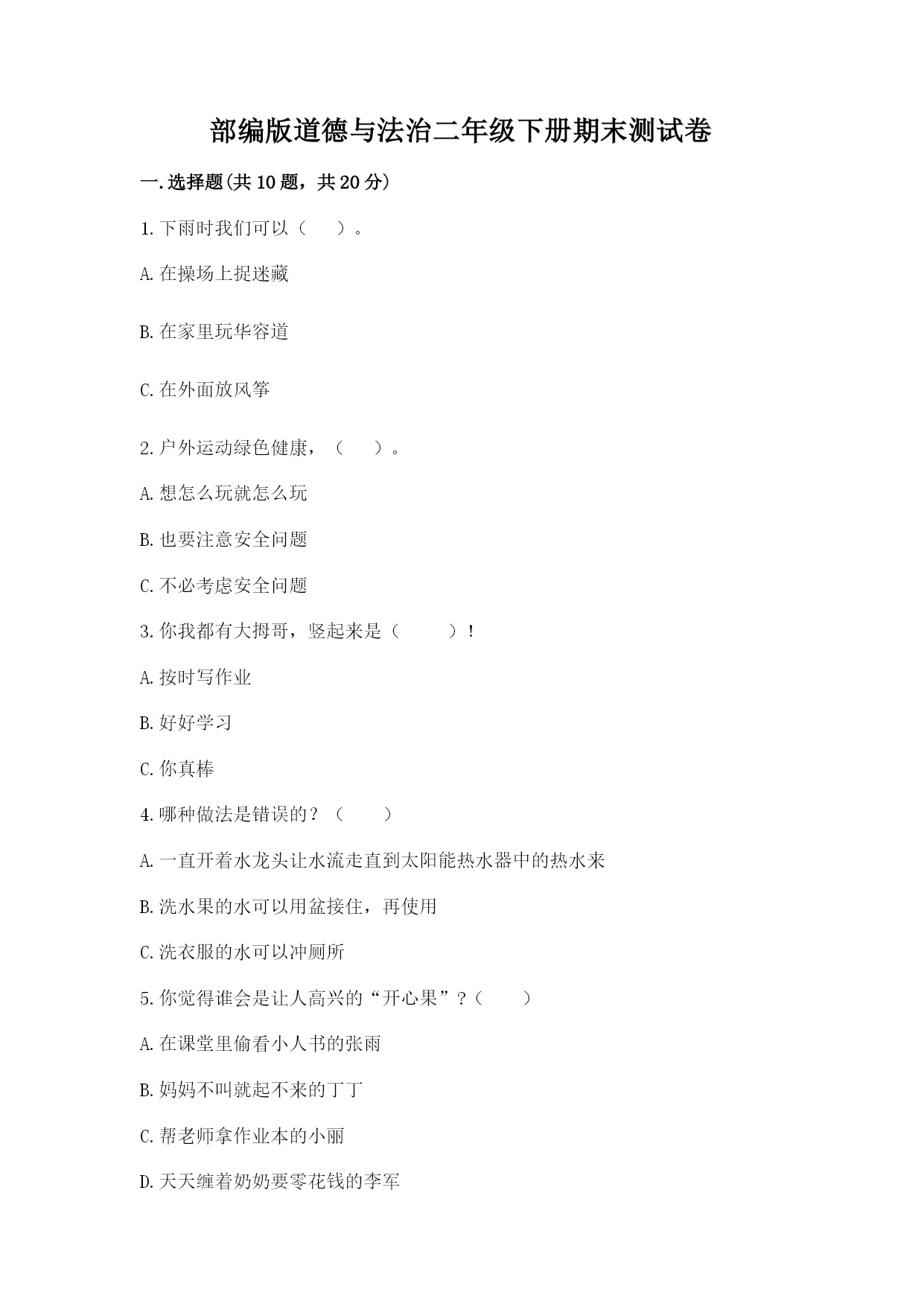 部编版道德与法治二年级下册期末测试卷一.选择题(共10题,共20分)1.下雨时我们可以()。A.在操场上捉迷藏B.在家里玩华容道C.在外面放风筝2.户外运动绿色健康,()。A.想怎么玩就怎么玩B.也要注意安全问题C.不必考虑安全问题3.你我都有大拇哥,竖起来是()!A.按时写作业B.好好学习C.你真棒4.哪种做法是错误的?()A.一直开着水龙头让水流走直到太阳能热水器中的热水来B.洗水果的水可以用盆接住,再使用C.洗衣服的水可以冲厕所5.你觉得谁会是让人高兴的“开心果”?()A.在课堂里偷看小人书的张雨B.妈妈不叫就起不来的丁丁C.帮老师拿作业本的小丽D.天天缠着奶奶要零花钱的李军6.纸的主要原材料是()等。A.树木、竹子B.塑料C.石油7.种了小苗要细心的呵护,勤除草,()施肥浇水才会有收获。A.半天B.每天C.适时8.下面()是安全玩具。A.伤人飞镖B.电人玩具C.积木9.下棋的时候如果下输了我会()。A.总结经验,再接再厉B.不下了C.把棋子扔了10.健康安全的游戏是()。A.下跳棋B.躲在衣柜里捉迷藏二.填空题(共10题,共40分)1.()是我国南方一些少数民族喜爱的传统游戏。2.锄禾日当午,汗滴禾下土。谁知盘中餐,()。3.游戏要到()的地点,保证()才能玩得开心。4.()才发现,其实没有那么难!5.你的大拇指叫(),你要把他送给(),因为()。6.可是有些人却不()我,往我身上乱扔(),倾倒污物。7.通过观察我发现同桌今天不舒服,我会()。8.变个规则玩一玩,游戏会有()。9.我了解到的传统游戏有()、()、()、()、()、()、()等。10.和大家一起玩时,我们最应该关注的是()问题。三.判断题(共10题,共20分)1.我们来做安全提示牌,放到可能会有危险的地方,让大家玩得更安全!()2.我们玩游戏的时候,要把安全放在首位。()3.我只愿意赞美和自己关系好的人,对其他人爱理不理。()4.多安排一些活动,可以减少看电视的时间。()5.玩游戏时,自己的安全和他人的安全一样重要。()6.璐璐上课时很喜欢和同桌打闹。()7.得传染病是因为我们得罪了天上的神仙。()8.我常和小朋友们玩捉迷藏。()9.户外运动绿色健康,我喜欢。()10.星期六,我和小明在大树下下棋。()四.连线题(共1题,共8分)1.生活中有很多第一-次,第-次是挑战也带给我们成长与惊喜。请你连一连下面的小朋友第一次都做了哪些事情。练习本用没了有点不好意思炒菜糊了第一次自己去商店买第一次学轮滑奶奶告诉我下次小点火第一次在很多人面前唱歌摔了很多跟头五.简答题(共7题,共40分)1.和纸交朋友,我们可以怎么做?2.写一段话,鼓励一下下面的小朋友我有点胆小,不敢看着别人的眼睛说话。3.说说怎样才能成为大家的“开心果”?4.给自己发张奖状,说说自己这学期的进步。5.你有哪些应对不快乐的小妙招呢?6.我们生活中有时候也会有很多不快乐,那么,你有哪些应对不快乐的小妙招呢?7.我们能为保护空气做些什么?六.综合题(共1题,共8分)1.哪些下列物品和行为是环保的?请在后面圆圈里画上“☆”。一次性纸杯()不锈钢水壶()小树苗()自行车()环保布口袋()塑料方便袋()轿车()电动车()随手关灯()环保盆栽()鞭炮烟花()草地()用废旧纸张制作草稿本()用废旧材料制成的新玩具()参考答案一.选择题1.B2.B3.C4.A5.C6.A7.C8.C9.A10.A二.填空题1.竹竿舞2.粒粒皆辛苦3.合适;安全4.挑战后5.“真棒”;自己(其它合理答案亦可);我的跳绳技术非常高(其它合理答案亦可)6.珍惜;垃圾7.关心他的病情8.新乐趣9.编花篮;挤油油;抓石子;竹蜻蜓;翻花绳;兰蛐蛐;跳大绳10.安全三.判断题1.√2.√3.×4.√5.√6.×7.×8.√9.√10.√四.连线题1.如图:五.简答题1.(1)把废纸送到回收站去。(2)挂历纸可以做成练习本。2.或许“胆小”是你的天性,但上天从不喜欢“胆小”的人,尝试着走出这一错误的误区,相信你,经过自己的努力,你一定能成为一个顶天立地的人。3.爱唱歌、爱运动,喜欢读书、认真听课、懂得陪伴老人、喜欢交朋友.....4.1、我的书写进步了;2、我的广播操做的比以前好了;3、我上课积极发言了。5.(答案不唯一)①把不高兴的事说给好朋友听。②画画、唱歌也可以赶走不快乐。③做深呼吸,把烦心的事吐出去。④不开心的时候我会去踢球。6.(答案不唯一)①把不高兴的事说给好朋友听。②唱歌也可以赶走不快乐。③做深呼吸,把烦心的事吐出去。④不开心的时候,我会去踢足球。7.(1)出行尽量乘坐公交车。(2)禁止燃放烟花爆竹。六.综合题1.
