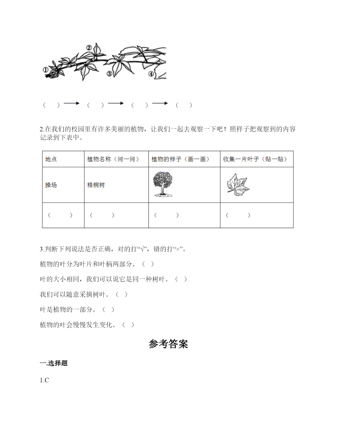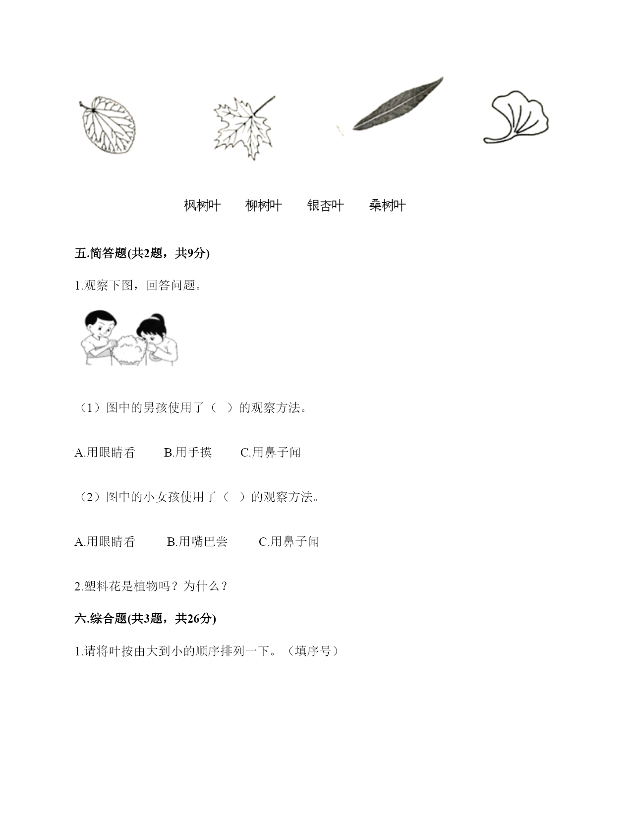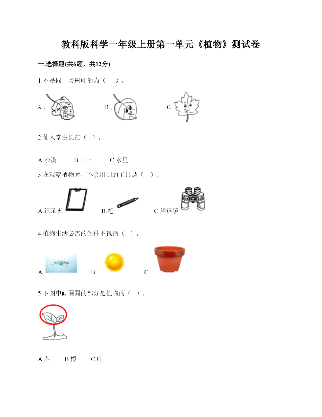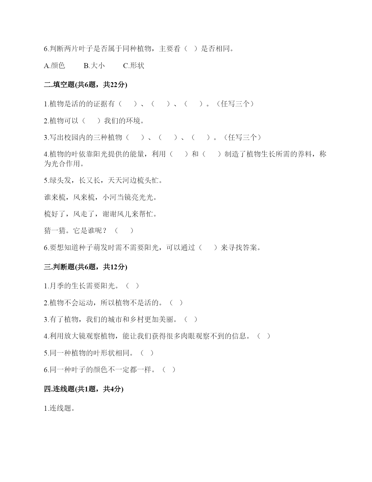 教科版科学一年级上册第一单元《植物》测试卷一.选择题(共6题,共12分)1.不是同一类树叶的为()。A.B.C.2.仙人掌生长在()。A.沙漠B.山上C.水里3.在观察植物时,不会用到的工具是()。A.记录夹B.笔C.望远镜4.植物生活必需的条件不包括()。A.B.C.5.下图中画圈圈的部分是植物的()。A.茎B.根C.叶6.判断两片叶子是否属于同种植物,主要看()是否相同。A.颜色B.大小C.形状二.填空题(共6题,共22分)1.植物是活的的证据有()、()、()。(任写三个)2.植物可以()我们的环境。3.写出校园内的三种植物()、()、()。(任写三个)4.植物的叶依靠阳光提供的能量,利用()和()制造了植物生长所需的养料,称为光合作用。5.绿头发,长又长,天天河边梳头忙。谁来梳,风来梳,小河当镜亮光光。梳好了,风走了,谢谢风儿来帮忙。猜一猜。它是谁呢?()6.要想知道种子萌发时需不需要阳光,可以通过()来寻找答案。三.判断题(共6题,共12分)1.月季的生长需要阳光。()2.植物不会运动,所以植物不是活的。()3.有了植物,我们的城市和乡村更加美丽。()4.利用放大镜观察植物,能让我们获得很多肉眼观察不到的信息。()5.同一种植物的叶形状相同。()6.同一种叶子的颜色不一定都一样。()四.连线题(共1题,共4分)1.连线题。五.简答题(共2题,共9分)1.观察下图,回答问题。(1)图中的男孩使用了()的观察方法。A.用眼睛看B.用手摸C.用鼻子闻(2)图中的小女孩使用了()的观察方法。A.用眼睛看B.用嘴巴尝C.用鼻子闻2.塑料花是植物吗?为什么?六.综合题(共3题,共26分)1.请将叶按由大到小的顺序排列一下。(填序号)()()()()2.在我们的校园里有许多美丽的植物,让我们一起去观察一下吧!照样子把观察到的内容记录到下表中。3.判断下列说法是否正确,对的打“√”,错的打“×”。植物的叶分为叶片和叶柄两部分。()叶的大小相同,我们可以说它是同一种树叶。()我们可以随意采摘树叶。()叶是植物的一部分。()植物的叶会慢慢发生变化。()参考答案一.选择题1.C2.A3.C4.C5.C6.C二.填空题1.会生长;会凋谢;生长需要阳光、水分2.美化3.杨树;小草;菊花4.二氧化碳;水5.柳树6.实验三.判断题1.√2.×3.√4.√5.×6.√四.连线题1.如图:五.简答题1.B;C2.塑料花不是植物。它没有生命。六.综合题1.④;③;②;①2.公园;柳树;3.×;×;×;√;√