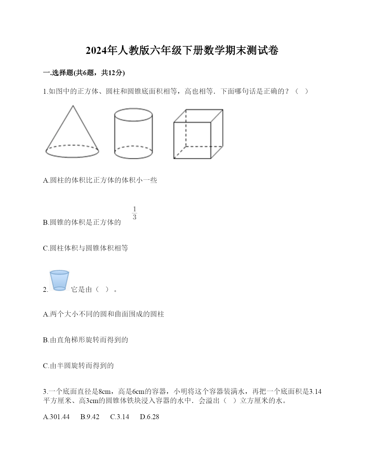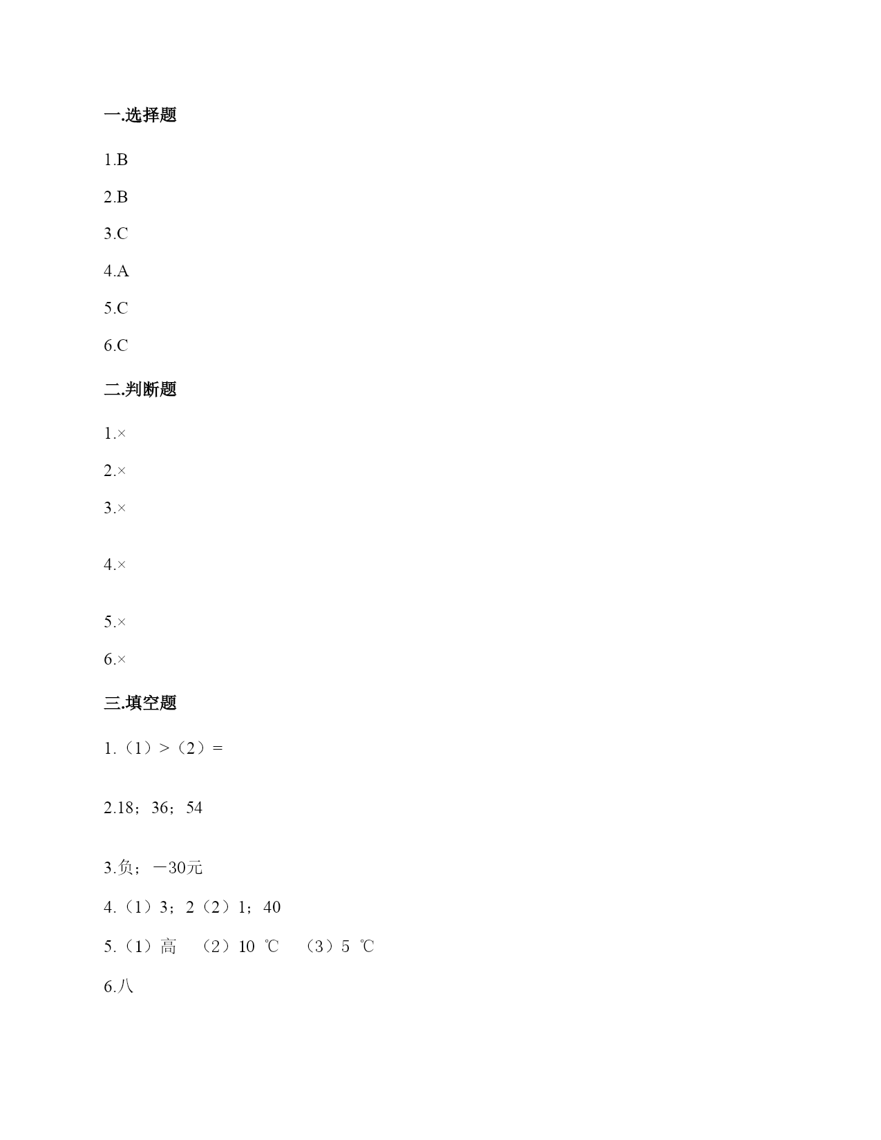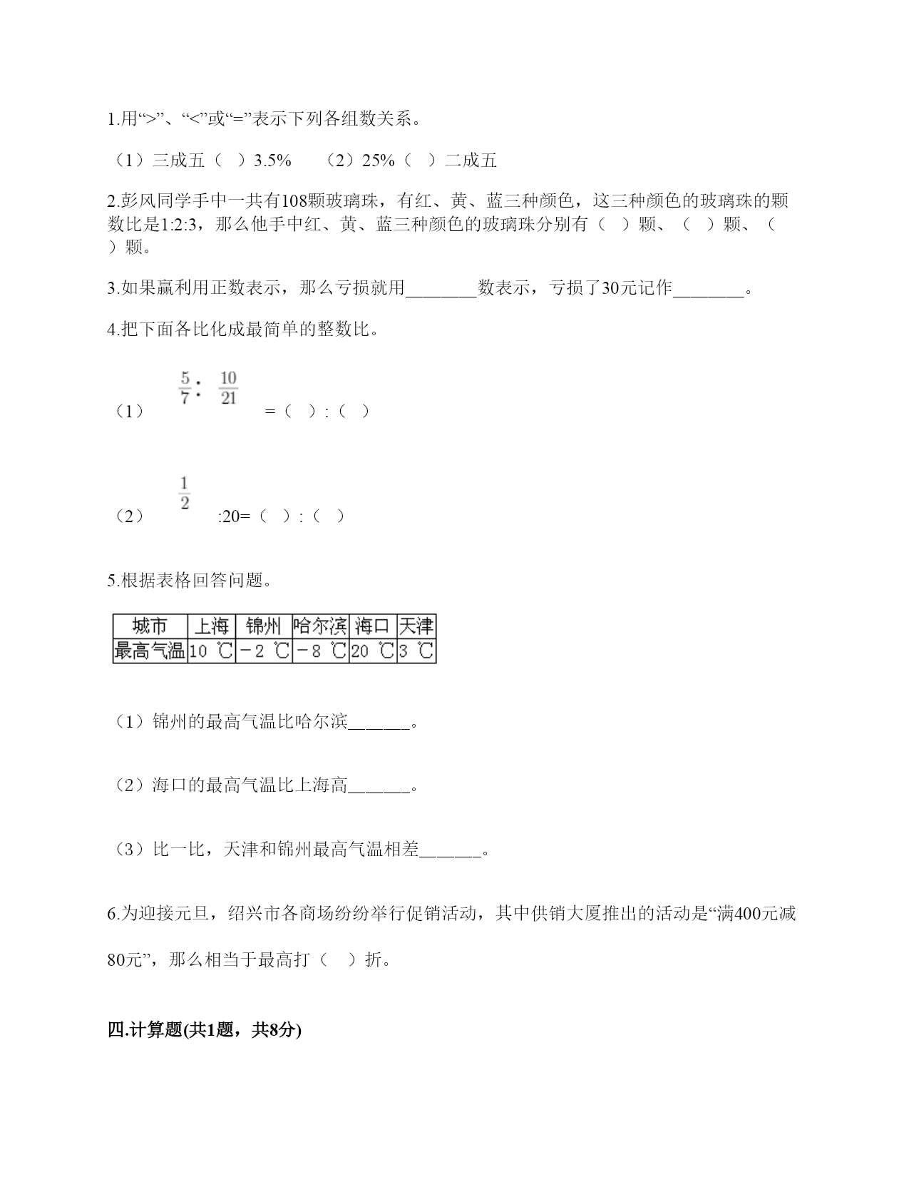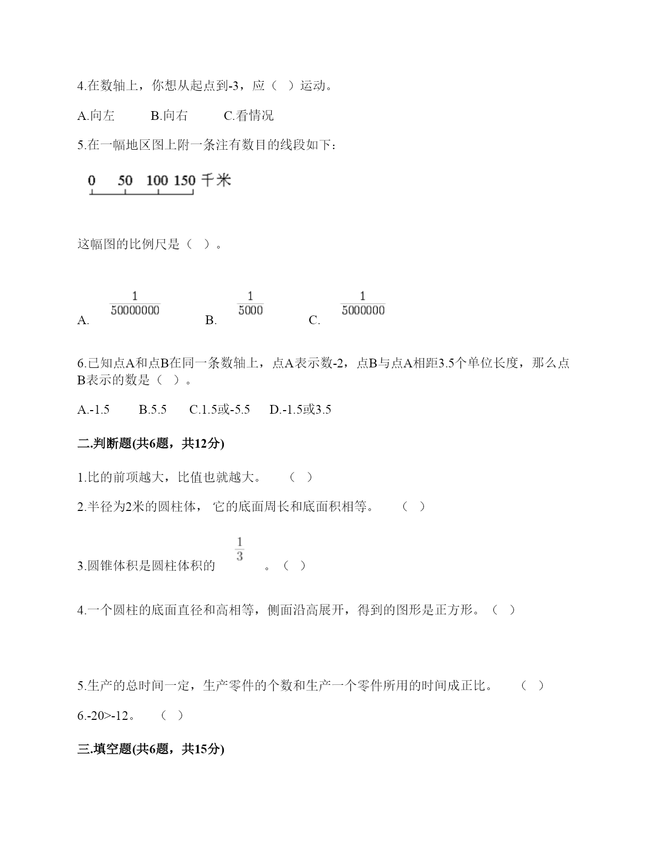 2024年人教版六年级下册数学期末测试卷一.选择题(共6题,共12分)1.如图中的正方体、圆柱和圆锥底面积相等,高也相等.下面哪句话是正确的?()A.圆柱的体积比正方体的体积小一些B.圆锥的体积是正方体的C.圆柱体积与圆锥体积相等2.它是由()。A.两个大小不同的圆和曲面围成的圆柱B.由直角梯形旋转而得到的C.由半圆旋转而得到的3.一个底面直径是8cm,高是6cm的容器,小明将这个容器装满水,再把一个底面积是3.14平方厘米、高3cm的圆锥体铁块浸入容器的水中.会溢出()立方厘米的水。A.301.44B.9.42C.3.14D.6.284.在数轴上,你想从起点到-3,应()运动。A.向左B.向右C.看情况5.在一幅地区图上附一条注有数目的线段如下:这幅图的比例尺是()。A.B.C.6.已知点A和点B在同一条数轴上,点A表示数-2,点B与点A相距3.5个单位长度,那么点B表示的数是()。A.-1.5B.5.5C.1.5或-5.5D.-1.5或3.5二.判断题(共6题,共12分)1.比的前项越大,比值也就越大。()2.半径为2米的圆柱体,它的底面周长和底面积相等。()3.圆锥体积是圆柱体积的。()4.一个圆柱的底面直径和高相等,侧面沿高展开,得到的图形是正方形。()5.生产的总时间一定,生产零件的个数和生产一个零件所用的时间成正比。()6.-20>-12。()三.填空题(共6题,共15分)1.用“>”、“<”或“=”表示下列各组数关系。(1)三成五()3.5%(2)25%()二成五2.彭风同学手中一共有108颗玻璃珠,有红、黄、蓝三种颜色,这三种颜色的玻璃珠的颗数比是1:2:3,那么他手中红、黄、蓝三种颜色的玻璃珠分别有()颗、()颗、()颗。3.如果赢利用正数表示,那么亏损就用________数表示,亏损了30元记作________。4.把下面各比化成最简单的整数比。(1)=():()(2):20=():()5.根据表格回答问题。(1)锦州的最高气温比哈尔滨_______。(2)海口的最高气温比上海高_______。(3)比一比,天津和锦州最高气温相差_______。6.为迎接元旦,绍兴市各商场纷纷举行促销活动,其中供销大厦推出的活动是“满400元减80元”,那么相当于最高打()折。四.计算题(共1题,共8分)1.解方程。五.作图题(共1题,共5分)1.在下面直线上,画出比-3大的数所在区域。六.解答题(共6题,共36分)1.一个压路机的滚筒横截面的直径是1米,长是1.8米,转一周能压路多少平方米?如果每分钟转8周,半小时能压路多少平方米?2.一个圆柱形水池,在水池内壁和底部都镶上瓷砖,水池内部底面周长25.12m,池深2m,镶瓷砖的面积是多少平方米?3.一个圆柱,高减少2厘米,表面积就减少18.84平方厘米,这个圆柱的上、下两个底面面积的和是多少平方厘米?4.一条公路全长1500m,修路队第一天修了全长的45%,第二天修了全长的。还剩下多少米没有修?5.服装店销售某款服装,每件标价是540元,若按标价的8折出售,仍可获利20%,则这款服装每件的进价是多少元?6.学校购进图书2000本,其中文学类图书占80%,将这些文学书按2:3全部分给中、高年级,高年级可以分得多少本?参考答案一.选择题1.B2.B3.C4.A5.C6.C二.判断题1.×2.×3.×4.×5.×6.×三.填空题1.(1)>(2)=2.18;36;543.负;-30元4.(1)3;2(2)1;405.(1)高(2)10℃(3)5℃6.八四.计算题1.(1)3(2)50(3)(4)2.5五.作图题1.如图:六.解答题1.解:3.14×1×1.8=5.652(平方米)5.652×8×30=1356.48(平方米)答:半小时能压路1356.48平方米。2.解:底面半径:25.12÷3.14÷2=4(m),3.14×42+25.12×2=50.24+50.24=100.48(平方米)答:镶瓷砖的面积是100.48平方米。3.解:底面周长:18.84÷2=9.42(厘米)半径:9.42÷3.14÷2=1.5(厘米)两个底面积之和:1.5×1.5×3.14×2=14.13(平方厘米)答:两个底面面积的和是14.13平方厘米。4.1500×(1-45%-)=1500×(1-0.45-0.4)=1500×0.15=225(米)答:还剩下225米没有修。5.解:540×80%÷(1+20%)=360(元)答:这款服装每件的进价是360元。6.2000×80%=2000×0.8=1600(本)1600×=1600×=960(本)答:高年级可以分得960本。