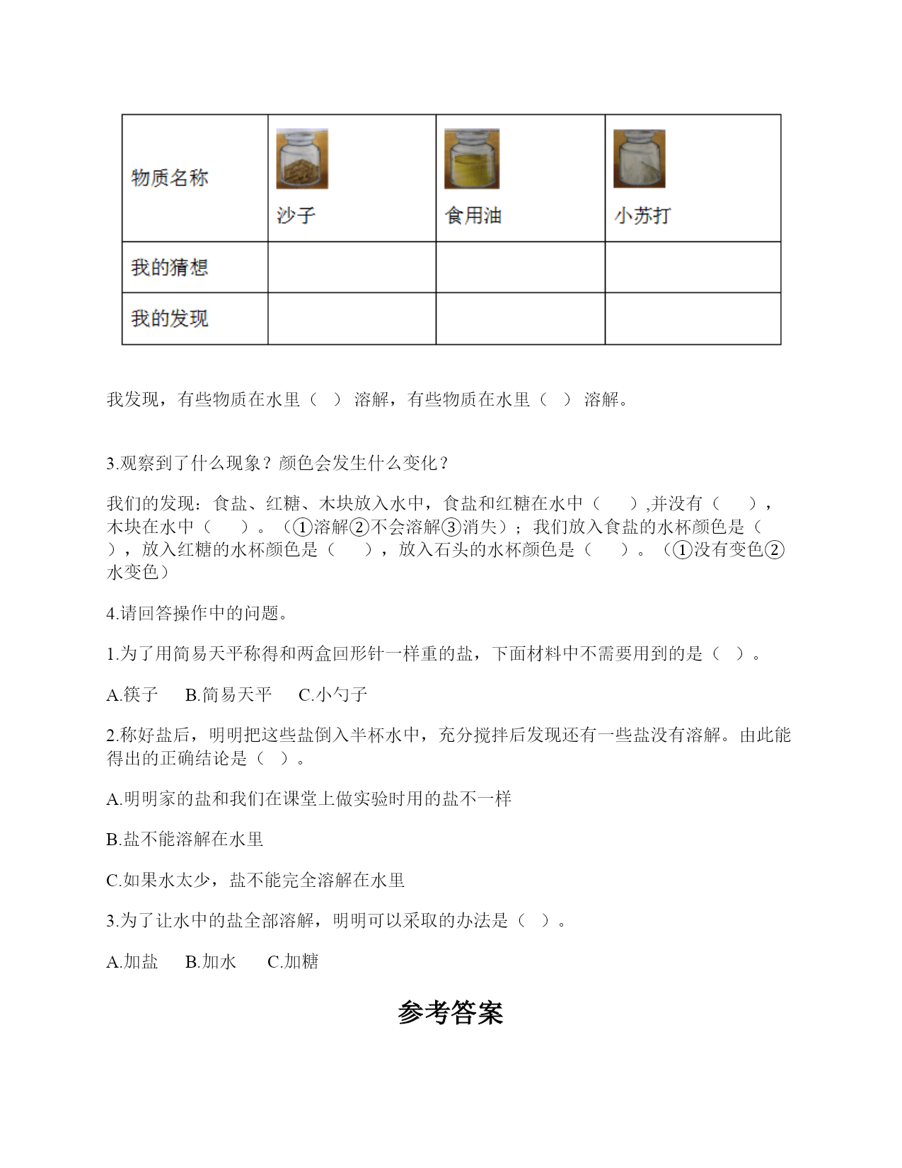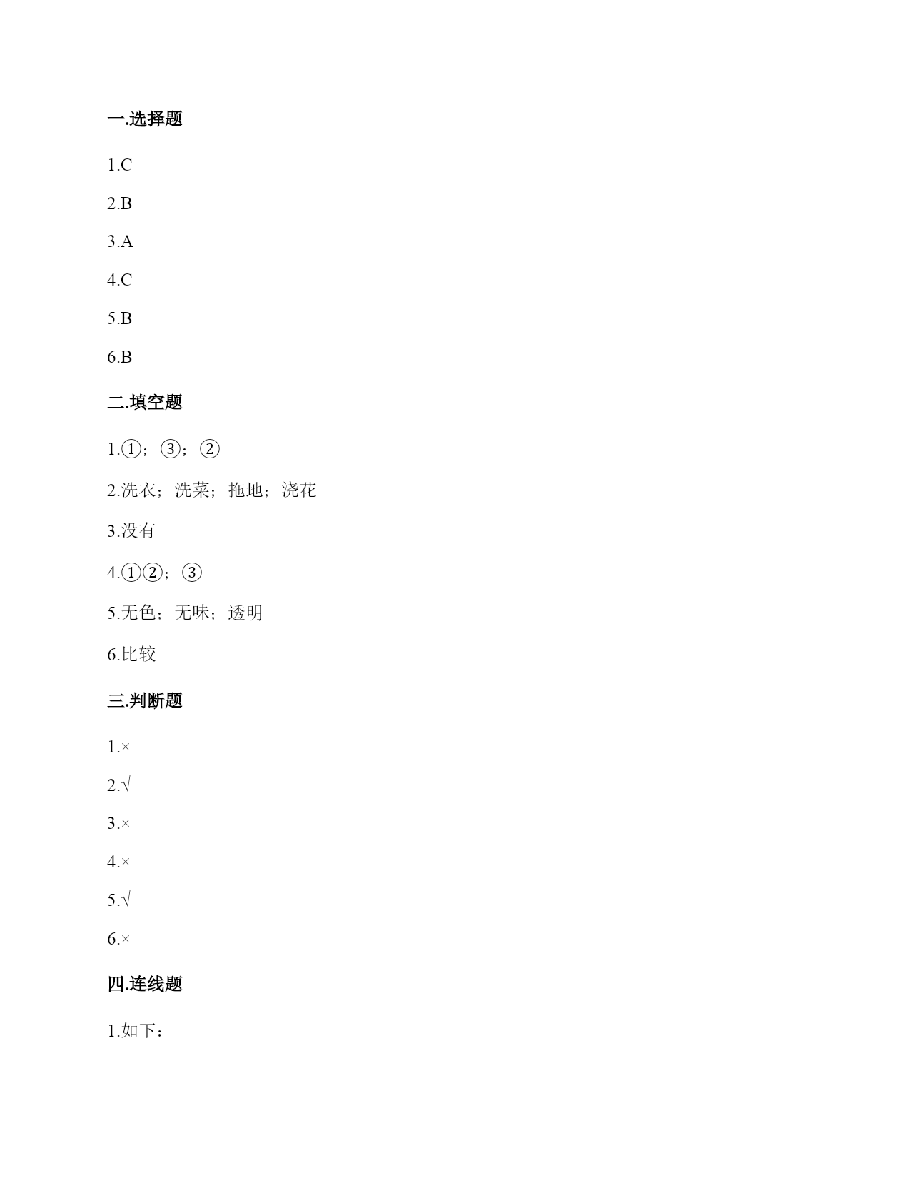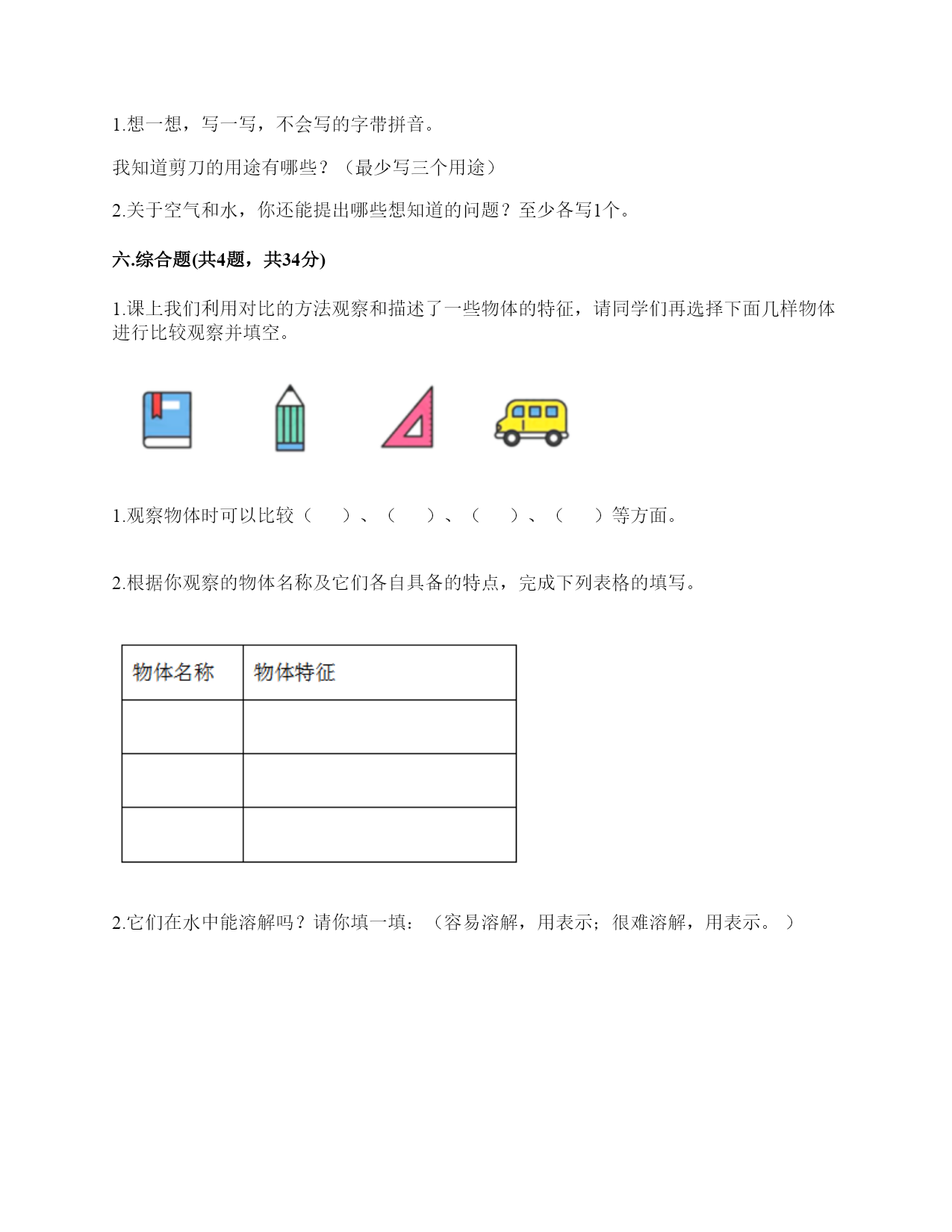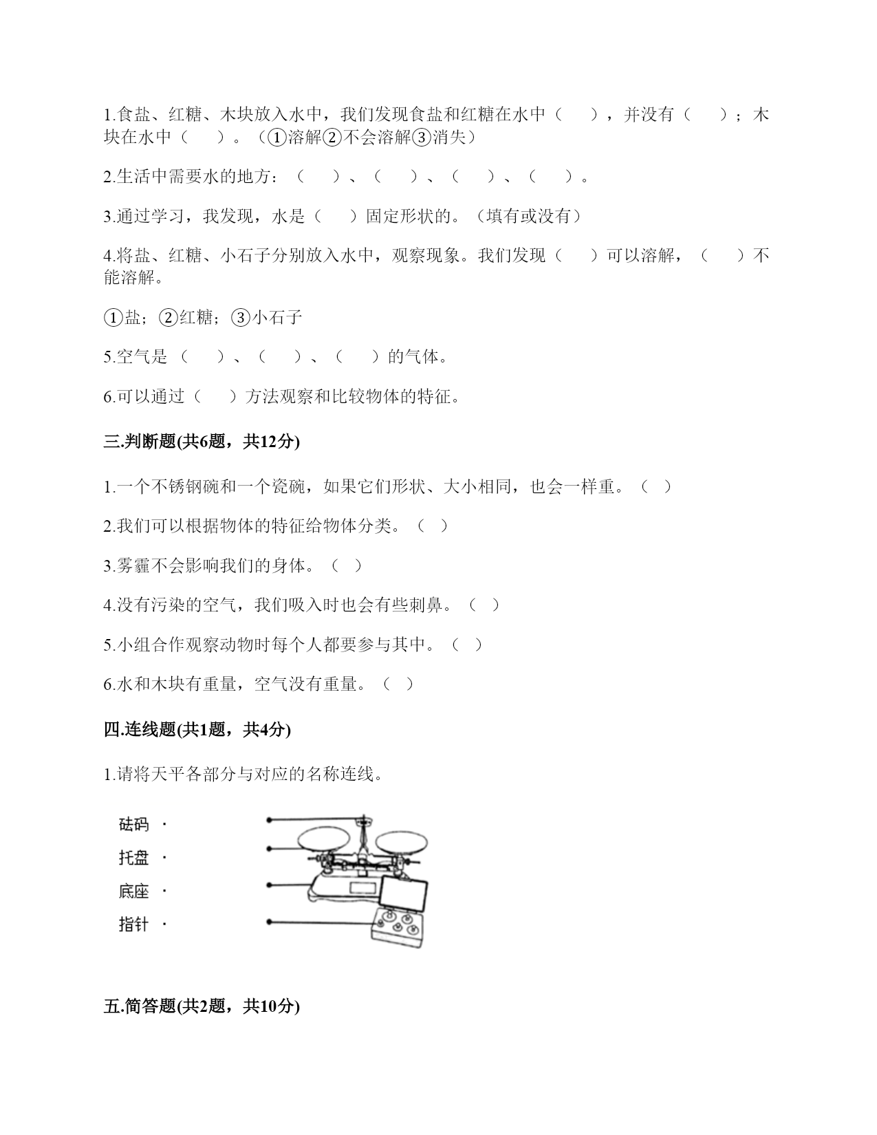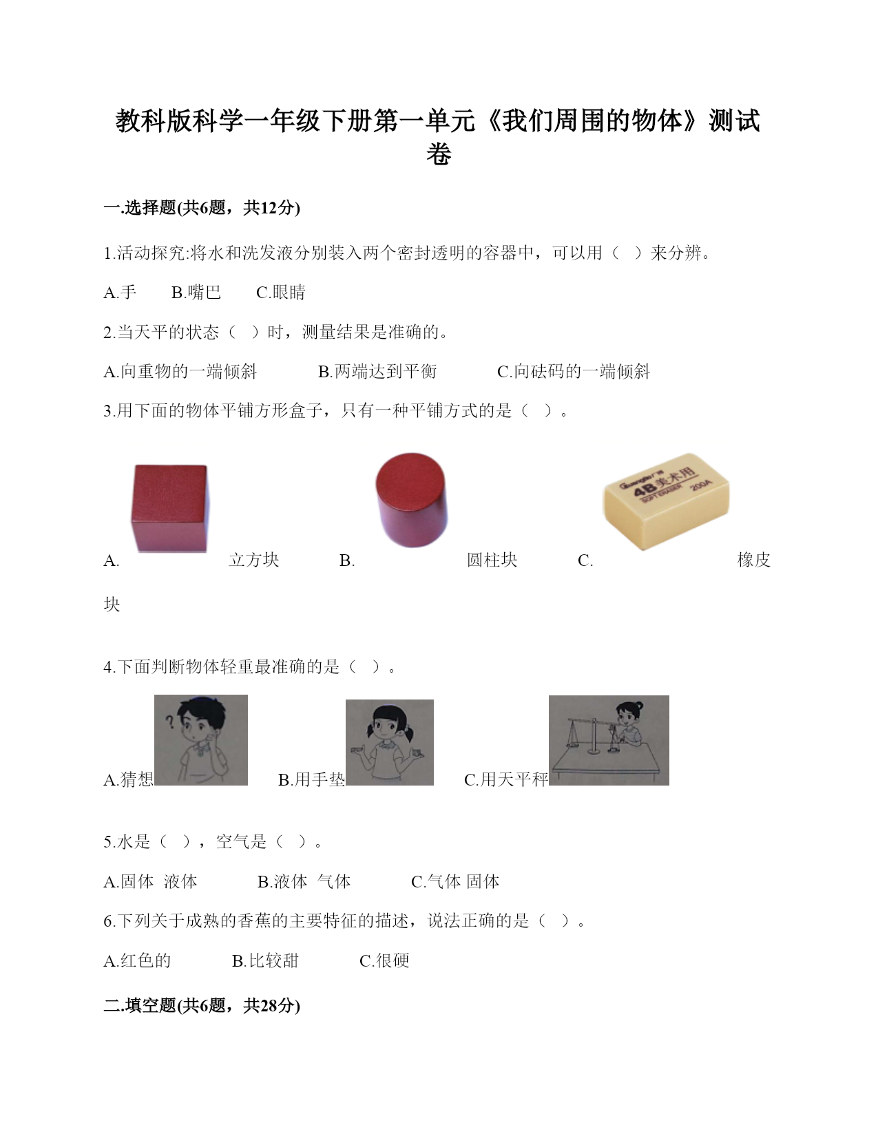 教科版科学一年级下册第一单元《我们周围的物体》测试卷一.选择题(共6题,共12分)1.活动探究:将水和洗发液分别装入两个密封透明的容器中,可以用()来分辨。A.手B.嘴巴C.眼睛2.当天平的状态()时,测量结果是准确的。A.向重物的一端倾斜B.两端达到平衡C.向砝码的一端倾斜3.用下面的物体平铺方形盒子,只有一种平铺方式的是()。A.立方块B.圆柱块C.橡皮块4.下面判断物体轻重最准确的是()。A.猜想B.用手垫C.用天平秤5.水是(),空气是()。A.固体液体B.液体气体C.气体固体6.下列关于成熟的香蕉的主要特征的描述,说法正确的是()。A.红色的B.比较甜C.很硬二.填空题(共6题,共28分)1.食盐、红糖、木块放入水中,我们发现食盐和红糖在水中(),并没有();木块在水中()。(①溶解②不会溶解③消失)2.生活中需要水的地方:()、()、()、()。3.通过学习,我发现,水是()固定形状的。(填有或没有)4.将盐、红糖、小石子分别放入水中,观察现象。我们发现()可以溶解,()不能溶解。①盐;②红糖;③小石子5.空气是()、()、()的气体。6.可以通过()方法观察和比较物体的特征。三.判断题(共6题,共12分)1.一个不锈钢碗和一个瓷碗,如果它们形状、大小相同,也会一样重。()2.我们可以根据物体的特征给物体分类。()3.雾霾不会影响我们的身体。()4.没有污染的空气,我们吸入时也会有些刺鼻。()5.小组合作观察动物时每个人都要参与其中。()6.水和木块有重量,空气没有重量。()四.连线题(共1题,共4分)1.请将天平各部分与对应的名称连线。五.简答题(共2题,共10分)1.想一想,写一写,不会写的字带拼音。我知道剪刀的用途有哪些?(最少写三个用途)2.关于空气和水,你还能提出哪些想知道的问题?至少各写1个。六.综合题(共4题,共34分)1.课上我们利用对比的方法观察和描述了一些物体的特征,请同学们再选择下面几样物体进行比较观察并填空。1.观察物体时可以比较()、()、()、()等方面。2.根据你观察的物体名称及它们各自具备的特点,完成下列表格的填写。2.它们在水中能溶解吗?请你填一填:(容易溶解,用表示;很难溶解,用表示。)我发现,有些物质在水里()溶解,有些物质在水里()溶解。3.观察到了什么现象?颜色会发生什么变化?我们的发现:食盐、红糖、木块放入水中,食盐和红糖在水中(),并没有(),木块在水中()。(①溶解②不会溶解③消失);我们放入食盐的水杯颜色是(),放入红糖的水杯颜色是(),放入石头的水杯颜色是()。(①没有变色②水变色)4.请回答操作中的问题。1.为了用简易天平称得和两盒回形针一样重的盐,下面材料中不需要用到的是()。A.筷子B.简易天平C.小勺子2.称好盐后,明明把这些盐倒入半杯水中,充分搅拌后发现还有一些盐没有溶解。由此能得出的正确结论是()。A.明明家的盐和我们在课堂上做实验时用的盐不一样B.盐不能溶解在水里C.如果水太少,盐不能完全溶解在水里3.为了让水中的盐全部溶解,明明可以采取的办法是()。A.加盐B.加水C.加糖参考答案一.选择题1.C2.B3.A4.C5.B6.B二.填空题1.①;③;②2.洗衣;洗菜;拖地;浇花3.没有4.①②;③5.无色;无味;透明6.比较三.判断题1.×2.√3.×4.×5.√6.×四.连线题1.如下:五.简答题1.剪纸、剪布料、剪绳子。2.空气:如何测量空气的重量?水:水什么时候会结冰?六.综合题1.形状;大小;味道;轻重;书;略;三角板;略;铅笔;略2.;容易;很难3.溶解;消失;不会溶解;白色;红色;没有变色4.A;C;B