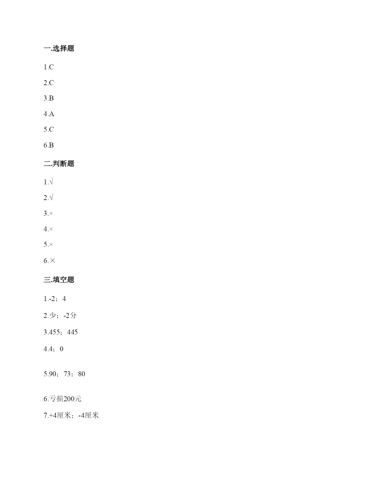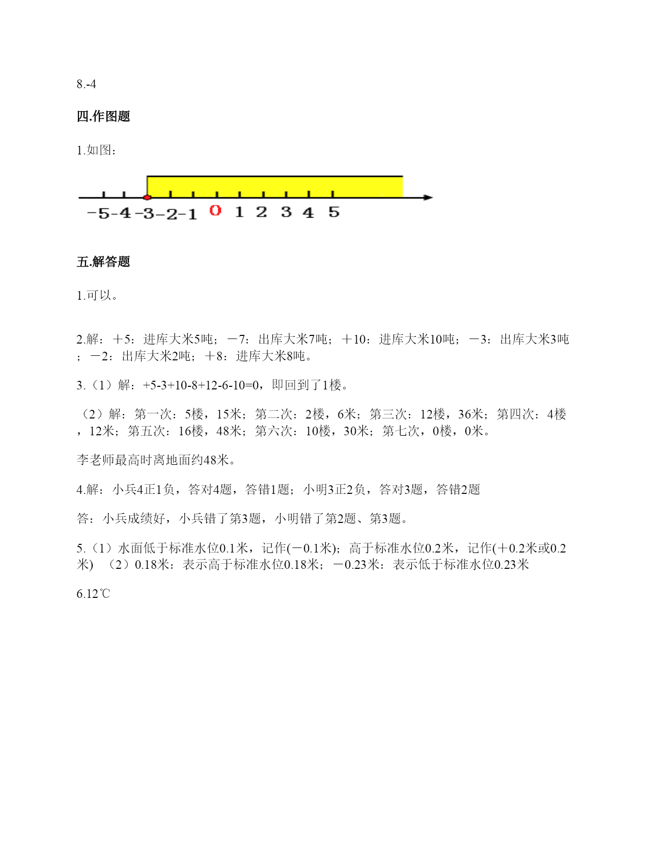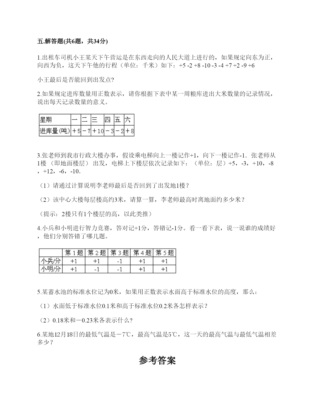 人教版六年级下册数学第一单元《负数》测试卷一.选择题(共6题,共12分)1.如果收入100元可记作+100元,那么支出200元可记()。A.200元B.+200元C.-200元D.以上都不对2.规定收入为正,那么支出200元则为()。A.200B.+200C.-200D.不知道3.比零下8℃还低1℃的温度,可表示为()。A.9℃B.-9℃C.-7℃4.规定10吨记为0吨,11吨记为+1吨,则下列说法错误的是()。A.8吨记为-8吨B.15吨记为+5吨C.6吨记为-4吨D.+3吨表示重量为13吨5.如图,点A表示的数可能是()。A.B.-C.-D.-0.56.海拔155米比-28米高()。A.127米B.183米C.138米二.判断题(共6题,共12分)1.比较-和-的大小,应该是-<-。()2.正数和负数是具有相反意义的量。()3.-4℃比-8℃低4℃。()4.所有的负数都比0小,最小的正数是0。()5.像0、-1、-2、-1.3这样的数都是负数。()6.因为7>4,所以-7>-4。()三.填空题(共8题,共17分)1.德江县城一月份的某一天的最低气温是零下2℃,记作________℃,最高气温是2℃,这一天的温差________℃。2.如果把平均成绩记作0分,+9分表示比平均成绩高9分,那么-18分表示比平均成绩________18分,比平均成绩少2分,记作________。3.一袋食盐包装袋上写着“净重450克±5克”,这说明这袋食盐最多有________克,最少有________克。4.在16,-2,-0.03,0.25,0,-1.5,-0.67中,负数有()个,()既不是正数也不是负数。5.数学竞赛中成绩在80分以上为优秀,如果将一小组三名同学的成绩以80分为标准,高于80分的部分记为“+”,低于80分的部分记为“-”,分别简记为10分,-7分和0分,这三名同学的实际成绩分别是()分、()分、()分。6.如果+300表示盈利300元,那么-200表示________。7.小明身高142厘米,笑笑身高134厘米,如果把这两人的平均身高138厘米记作0,那么李海的身高可记作________,赵亮的身高可记作________。8.一次数学测验全班平均95分,小明考了98分,张老师记作+3分.小亮考了91分,那么张老师记作________分。四.作图题(共1题,共5分)1.在下面直线上,画出比-3大的数所在区域。五.解答题(共6题,共34分)1.出租车司机小王某天下午营运是在东西走向的人民大道上进行的,如果规定向东为正,向西为负,这天下午他的行程(单位:千米)如下:+5-2+8-10-3-4+7+2-9+6小王最后是否能回到出发点?2.如果规定进库数量用正数表示,请你根据下表中某一周粮库进出大米数量的记录情况,说出每天记录数量的意义。3.张老师到我市行政大楼办事,假设乘电梯向上一楼记作+1,向下一楼记作-1.张老师从1楼(即地面楼层)出发,电梯上下楼层依次记录如下:(单位:层)+5,-3,+10,-8,+12,-6,-10.(1)请通过计算说明李老师最后是否回到了出发地1楼?(2)该中心大楼每层楼高约3米,请算一算,李老师最高时离地面约多少米?(提示:2楼只有1个楼层的高,以此类推)4.小兵和小明进行智力竞赛,答对记+1分,答错记-1分。看一看下表,说一说谁的成绩好,他们分别答错了哪几题。5.某蓄水池的标准水位记为0米,如果用正数表示水面高于标准水位的高度,那么:(1)水面低于标准水位0.1米和高于标准水位0.2米各怎样表示?(2)0.18米和-0.23米各表示什么?6.某地12月18日的最低气温是-7℃,最高气温是5℃,这一天的最高气温与最低气温相差多少?参考答案一.选择题1.C2.C3.B4.A5.C6.B二.判断题1.√2.√3.×4.×5.×6.×三.填空题1.-2;42.少;-2分3.455;4454.4;05.90;73;806.亏损200元7.+4厘米;-4厘米8.-4四.作图题1.如图:五.解答题1.可以。2.解:+5:进库大米5吨;-7:出库大米7吨;+10:进库大米10吨;-3:出库大米3吨;-2:出库大米2吨;+8:进库大米8吨。3.(1)解:+5-3+10-8+12-6-10=0,即回到了1楼。(2)解:第一次:5楼,15米;第二次:2楼,6米;第三次:12楼,36米;第四次:4楼,12米;第五次:16楼,48米;第六次:10楼,30米;第七次,0楼,0米。李老师最高时离地面约48米。4.解:小兵4正1负,答对4题,答错1题;小明3正2负,答对3题,答错2题答:小兵成绩好,小兵错了第3题,小明错了第2题、第3题。5.(1)水面低于标准水位0.1米,记作(-0.1米);高于标准水位0.2米,记作(+0.2