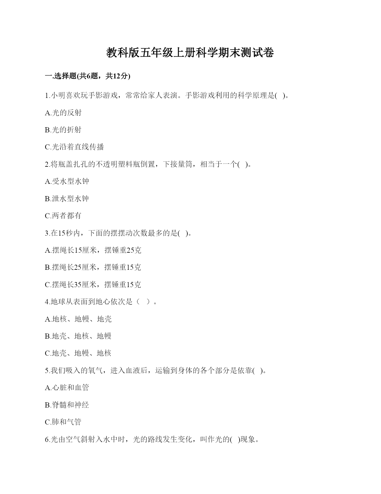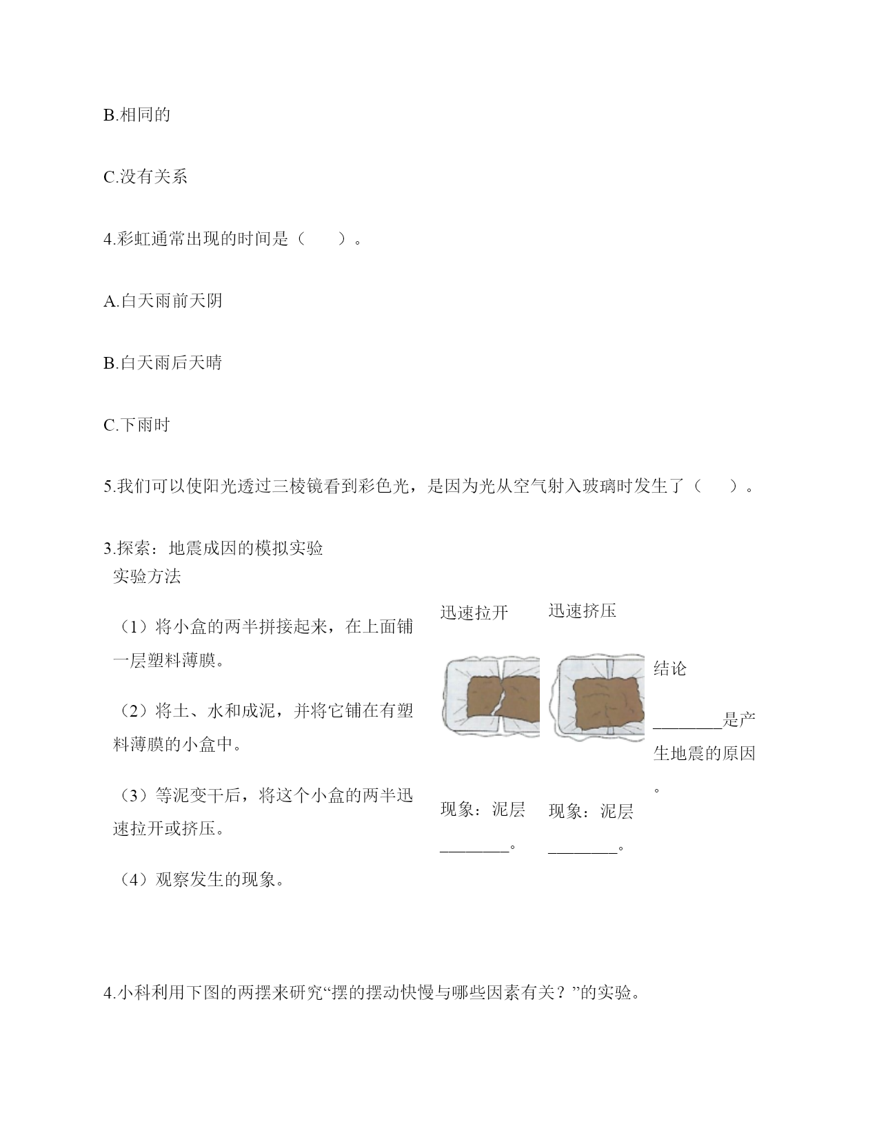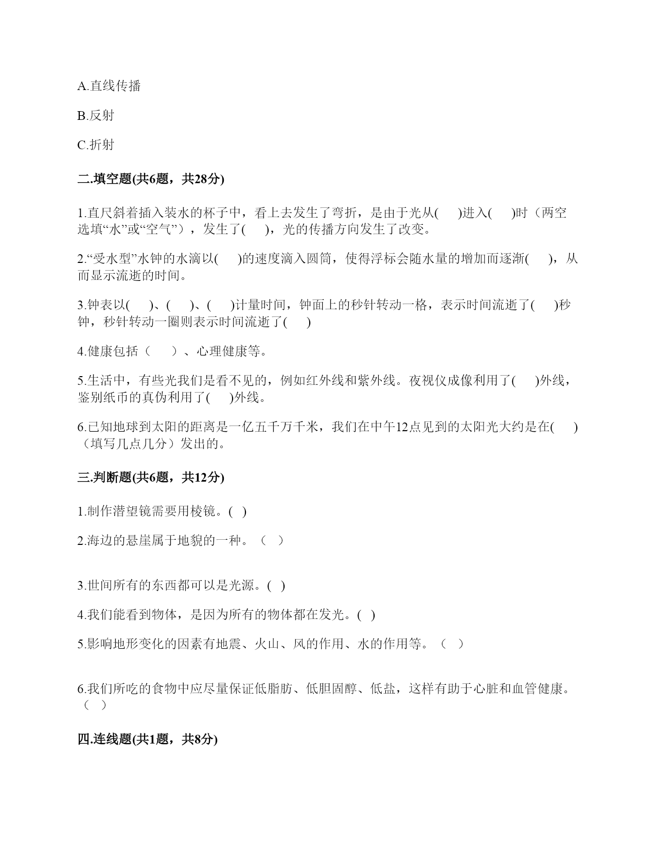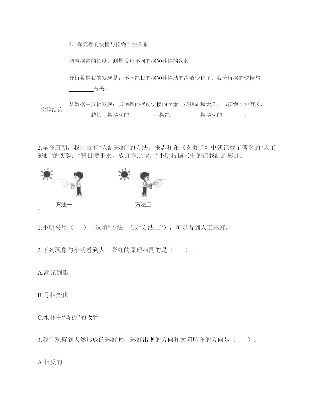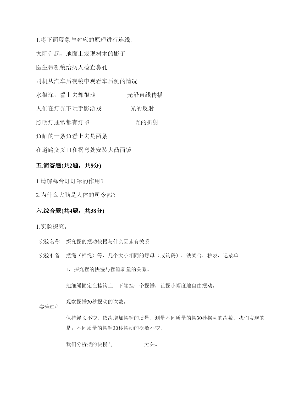 教科版五年级上册科学期末测试卷一.选择题(共6题,共12分)1.小明喜欢玩手影游戏,常常给家人表演。手影游戏利用的科学原理是()。A.光的反射B.光的折射C.光沿着直线传播2.将瓶盖扎孔的不透明塑料瓶倒置,下接量筒,相当于一个()。A.受水型水钟B.泄水型水钟C.两者都有3.在15秒内,下面的摆摆动次数最多的是()。A.摆绳长15厘米,摆锤重25克B.摆绳长25厘米,摆锤重15克C.摆绳长35厘米,摆锤重15克4.地球从表面到地心依次是()。A.地核、地幔、地壳B.地壳、地核、地幔C.地壳、地幔、地核5.我们吸入的氧气,进入血液后,运输到身体的各个部分是依靠()。A.心脏和血管B.脊髓和神经C.肺和气管6.光由空气斜射入水中时,光的路线发生变化,叫作光的()现象。A.直线传播B.反射C.折射二.填空题(共6题,共28分)1.直尺斜着插入装水的杯子中,看上去发生了弯折,是由于光从()进入()时(两空选填“水”或“空气”),发生了(),光的传播方向发生了改变。2.“受水型”水钟的水滴以()的速度滴入圆筒,使得浮标会随水量的增加而逐渐(),从而显示流逝的时间。3.钟表以()、()、()计量时间,钟面上的秒针转动一格,表示时间流逝了()秒钟,秒针转动一圈则表示时间流逝了()4.健康包括()、心理健康等。5.生活中,有些光我们是看不见的,例如红外线和紫外线。夜视仪成像利用了()外线,鉴别纸币的真伪利用了()外线。6.已知地球到太阳的距离是一亿五千万千米,我们在中午12点见到的太阳光大约是在()(填写几点几分)发出的。三.判断题(共6题,共12分)1.制作潜望镜需要用棱镜。()2.海边的悬崖属于地貌的一种。()3.世间所有的东西都可以是光源。()4.我们能看到物体,是因为所有的物体都在发光。()5.影响地形变化的因素有地震、火山、风的作用、水的作用等。()6.我们所吃的食物中应尽量保证低脂肪、低胆固醇、低盐,这样有助于心脏和血管健康。()四.连线题(共1题,共8分)1.将下面现象与对应的原理进行连线。太阳升起,地面上发现树木的影子医生带额镜给病人检查鼻孔司机从汽车后视镜中观看车后侧的情况水很深,看上去却很浅光沿直线传播人们在灯光下玩手影游戏光的反射照明灯通常都有灯罩光的折射鱼缸的一条鱼看上去是两条在道路交叉口和拐弯处安装大凸面镜五.简答题(共2题,共8分)1.请解释台灯灯罩的作用?2.为什么大脑是人体的司令部?六.综合题(共4题,共38分)1.实验探究。实验名称探究摆的摆动快慢与什么因素有关系实验准备摆绳(棉绳)等、几个大小相同的螺母(或钩码)、铁架台、秒表、记录单实验过程1、探究摆的快慢与摆锤质量的关系。把细绳固定在挂钩上,下端挂一个摆锤,让摆小幅度地自由摆动。观察摆锤30秒摆动的次数。保持绳长不变,依次增加摆锤的质量,测量不同质量的摆30秒摆动的次数。我们发现的是:不同质量的摆锤30秒摆动的次数不变。我们分析摆的快慢与____________无关。2、探究摆的快慢与摆绳长短关系。调整摆绳的长度,测量长短不同的摆30秒摆的次数。分析数据我的发现是:不同绳长的摆30秒摆动的次数变化了,我分析摆的快慢与_________有关。实验结论从数据中分析发现:影响摆的摆动快慢的因素与摆锤质量无关,与摆绳长短有关,________越长,摆摆动的_________,摆绳_________,摆摆动的________。2.早在唐朝,我国就有“人制彩虹”的方法。张志和在《玄贞子》中就记载了著名的“人工彩虹”的实验:“背日喷乎水,成虹霓之状。”小明根据书中的记载制造彩虹。1.小明采用()(选填“方法一”或“方法二”),可以看到人工彩虹。2.下列现象与小明看到人工彩虹的原理相同的是()。A.湖光倒影B.月相变化C.水杯中“弯折”的吸管3.我们观察到天然形成的彩虹时,彩虹出现的方向和太阳所在的方向是()。A.相反的B.相同的C.没有关系4.彩虹通常出现的时间是()。A.白天雨前天阴B.白天雨后天晴C.下雨时5.我们可以使阳光透过三棱镜看到彩色光,是因为光从空气射入玻璃时发生了()。3.探索:地震成因的模拟实验实验方法(1)将小盒的两半拼接起来,在上面铺一层塑料薄膜。(2)将土、水和成泥,并将它铺在有塑料薄膜的小盒中。(3)等泥变干后,将这个小盒的两半迅速拉开或挤压。(4)观察发生的现象。迅速拉开现象:泥层________。迅速挤压现象:泥层________。结论________是产生地震的原因。4.小科利用下图的两摆来研究“摆的摆动快慢与哪些因素有关?”的实验。(1)小科研究的问题是_____________。(2)小科需要保持不变的因素是_____________________。(3)如果小科各测了一次,测得两摆在15秒内摆动次数分别为20次和28次,请帮助小
