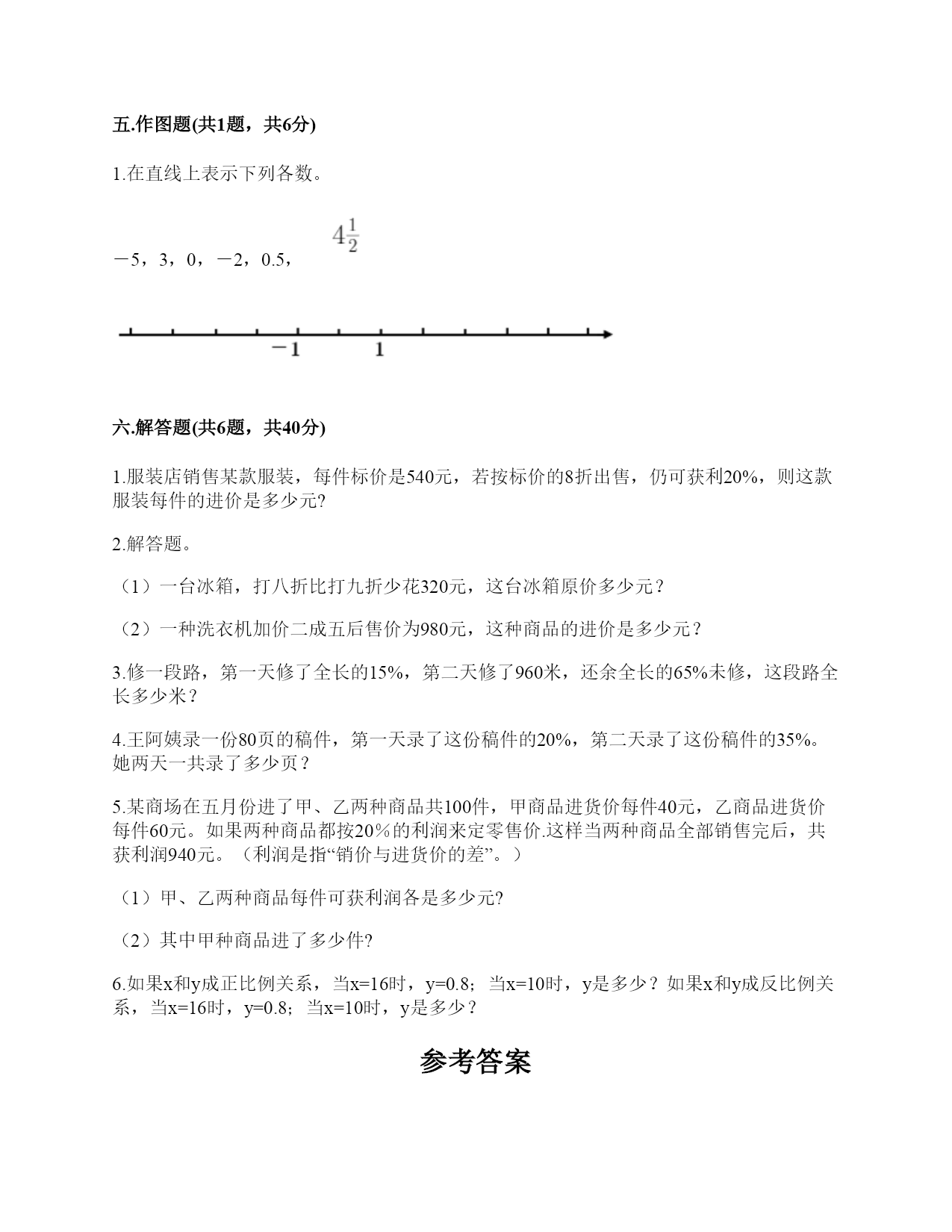 小学六年级下册数学期末测试卷一.选择题(共6题,共12分)1.如果收入100元可记作+100元,那么支出200元可记()。A.200元B.+200元C.-200元D.以上都不对2.如果向北走6米记作+6,那么-5表示()。A.向东走5米B.向西走5米C.向南走5米D.向北走5米3.表示x,y正比例关系的是()。A.x﹣y=5B.y=x×C.y+x=20D.xy=74.小商店进货50箱记作+50箱,那么卖出42箱记作()。A.42箱B.-42箱C.+42箱D.-50箱5.一艘潜水艇所处的高度是海拔-50米,一条鲨鱼在潜水艇上方30米,鲨鱼所处的位置是海拔()米。A.80B.-80C.20D.-206.某地一天的气温显示-6℃~2℃,那么这一天的温差是()。A.-8℃B.6℃C.8℃D.2℃二.判断题(共6题,共12分)1.一个图形按1∶10缩小,就是把这个图形的面积缩小为原来的。()2.圆锥体体积一定,底面积和高成反比例。()3.长方形的面积一定时,长和宽成反比例。()4.如果=y,那么x和y成正比例。()5.比的前项和后项同时增加或减少相同的倍数,比值不变。()6.一个直角三角形的两条直角边分别是3m,4m,把这个三角形按1∶2缩小,得到的图形面积是原三角形面积的倍。()三.填空题(共6题,共8分)1.明明身高150cm,爸爸身高1.80m,明明和爸爸的身高比是()。2.仓库里有10吨钢材,第一次用去总数的50%,第二次用去吨,还剩()吨。3.在括号里填上合适的数。(1)():6=0.75(2)6:()=0.754.一件羊毛衫的现价是200元,比原来降低了50元,降低了()%。5.小明有图书12本,小英有图书15本,小明的图书比小英的少()%,小英的图书比小明的多()%。6.把一个圆锥沿底面直径纵切开,切面是一个()形。四.计算题(共1题,共6分)1.求下列图形的体积。(单位:dm)(1)(2)五.作图题(共1题,共6分)1.在直线上表示下列各数。-5,3,0,-2,0.5,六.解答题(共6题,共40分)1.服装店销售某款服装,每件标价是540元,若按标价的8折出售,仍可获利20%,则这款服装每件的进价是多少元?2.解答题。(1)一台冰箱,打八折比打九折少花320元,这台冰箱原价多少元?(2)一种洗衣机加价二成五后售价为980元,这种商品的进价是多少元?3.修一段路,第一天修了全长的15%,第二天修了960米,还余全长的65%未修,这段路全长多少米?4.王阿姨录一份80页的稿件,第一天录了这份稿件的20%,第二天录了这份稿件的35%。她两天一共录了多少页?5.某商场在五月份进了甲、乙两种商品共100件,甲商品进货价每件40元,乙商品进货价每件60元。如果两种商品都按20%的利润来定零售价.这样当两种商品全部销售完后,共获利润940元。(利润是指“销价与进货价的差”。)(1)甲、乙两种商品每件可获利润各是多少元?(2)其中甲种商品进了多少件?6.如果x和y成正比例关系,当x=16时,y=0.8;当x=10时,y是多少?如果x和y成反比例关系,当x=16时,y=0.8;当x=10时,y是多少?参考答案一.选择题1.C2.C3.B4.B5.D6.C二.判断题1.×2.√3.√4.√5.√6.×三.填空题1.5:62.3.(1)4.5(2)84.205.20;256.等腰三角四.计算题1.(1)πr2h=3.14×82×10=2009.6(dm3)(2)πr2h=×3.14×(20÷2)2×24=2512(dm3)五.作图题1.根据正负数的意义可知:六.解答题1.解:540×80%÷(1+20%)=360(元)答:这款服装每件的进价是360元。2.(1)解:设这台冰箱原价是x元。90%x-80%x=3200.1x=320x=3200答:这台冰箱是3200元。(2)解:设这种商品的进价是x元。x+25%x=9801.25x=980x=784答:这种商品的进价是784元。3.960÷(1-15%-65%)=960÷20%=4800(米)答:这段路全长4800米。4.80×(25%+35%)=44(页)答:一共录了44页。5.(1)解:甲利润:40×20%=8(元)乙利润:60×20%=12(元)答:利润各是8元、12元.(2)解:设甲种商品进了x件,则乙种进了100-x件,8x+12×(100-x)=9408x+1200-12x=9404x=1200-940x=260÷4x=65答:甲种商品进了65件.6.解:①16:0.8=10:y16y=0.8×1016y÷16=8÷16y=0.5答:如果x和y成正比例关系,当x=16时,y=0.8;当x=10时,y是0.5。②10y=16×0.810y÷10=12.8÷10y=1.28答:如果x和y