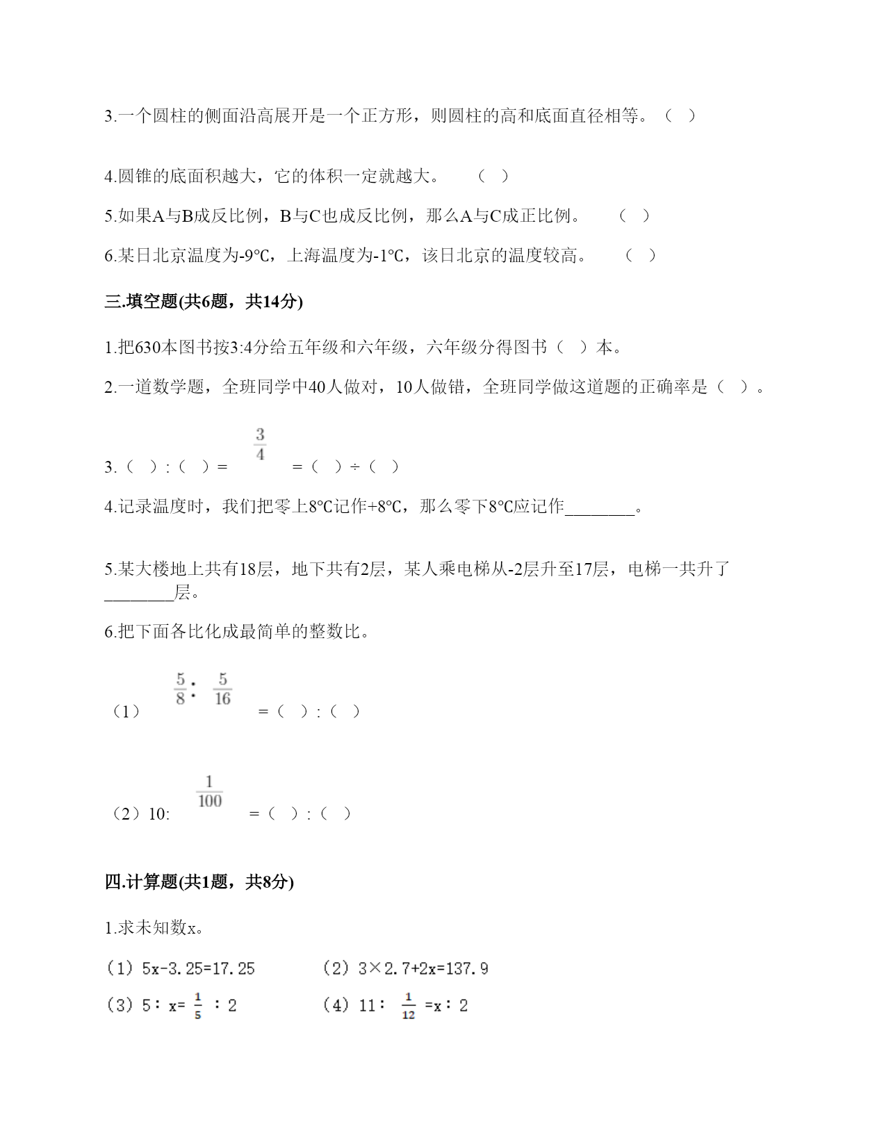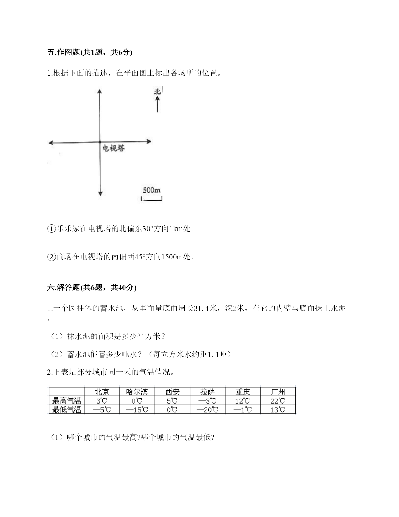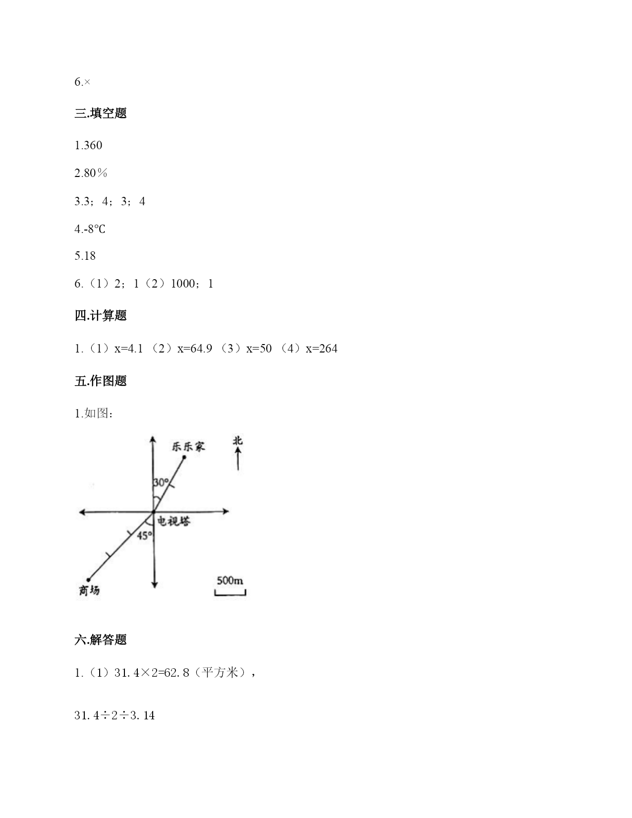 小升初六年级下册数学期末测试卷一.选择题(共6题,共12分)1.下列说法正确的是()。A.0是最小的数B.0既是正数又是负数C.负数比正数小D.数轴上-在-的左边2.把9、3、21再配上一个数使这四个数组成一个比例式,这个数可能是()。A.27B.63C.61D.723.向东走-5米表示()。A.向东走5米B.向西走5米C.向南走5米D.向北走5米4.求圆柱形罐头盒的用料就是求圆柱()。A.体积B.容积C.表面积5.小力家的萝卜地去年收萝卜15吨,今年比去年增产二成,今年收萝卜()。A.18吨B.3吨C.12.5吨D.12吨6.一件商品九折出售,就是按原价的()出售。A.B.C.二.判断题(共6题,共12分)1.在比例尺是10:1的图纸上,4厘米相当于实际距离4毫米。()2.一个圆柱,底面半径为r,高是2πr.这个圆柱的侧面展开图是一个正方形。()3.一个圆柱的侧面沿高展开是一个正方形,则圆柱的高和底面直径相等。()4.圆锥的底面积越大,它的体积一定就越大。()5.如果A与B成反比例,B与C也成反比例,那么A与C成正比例。()6.某日北京温度为-9℃,上海温度为-1℃,该日北京的温度较高。()三.填空题(共6题,共14分)1.把630本图书按3:4分给五年级和六年级,六年级分得图书()本。2.一道数学题,全班同学中40人做对,10人做错,全班同学做这道题的正确率是()。3.():()==()÷()4.记录温度时,我们把零上8℃记作+8℃,那么零下8℃应记作________。5.某大楼地上共有18层,地下共有2层,某人乘电梯从-2层升至17层,电梯一共升了________层。6.把下面各比化成最简单的整数比。(1)=():()(2)10:=():()四.计算题(共1题,共8分)1.求未知数x。五.作图题(共1题,共6分)1.根据下面的描述,在平面图上标出各场所的位置。①乐乐家在电视塔的北偏东30°方向1km处。②商场在电视塔的南偏西45°方向1500m处。六.解答题(共6题,共40分)1.一个圆柱体的蓄水池,从里面量底面周长31.4米,深2米,在它的内壁与底面抹上水泥。(1)抹水泥的面积是多少平方米?(2)蓄水池能蓄多少吨水?(每立方米水约重1.1吨)2.下表是部分城市同一天的气温情况。(1)哪个城市的气温最高?哪个城市的气温最低?(2)把各个城市的最低气温从低到高排列出来。(3)把各个城市的最高温从高到低排列出来。3.商场举办“迎六一”促销活动。一种钢笔每支8.4元,活动期间是“买10支送2支”。张老师要买40支这样的钢笔奖励给同学,只要花多少钱?张老师买的钢笔相当于打几折?4.一个圆柱和一个圆锥底面积比为2:3,体积比为5:6,求高的比。5.一个圆柱形的粮仓,从里面量得底面直径是3米,装有2.5米高的小麦.如果每立方米小麦重0.7吨,这个粮仓装有多少吨的小麦?6.王林参加射击比赛,打了20组子弹,每组10发。有10发子弹没有打中目标,请你算一算,王林射击的命中率是多少?参考答案一.选择题1.C2.B3.B4.C5.A6.C二.判断题1.√2.√3.×4.×5.√6.×三.填空题1.3602.80%3.3;4;3;44.-8℃5.186.(1)2;1(2)1000;1四.计算题1.(1)x=4.1(2)x=64.9(3)x=50(4)x=264五.作图题1.如图:六.解答题1.(1)31.4×2=62.8(平方米),31.4÷2÷3.14=15.7÷3.14=5(米)3.14×52+62.8=3.14×25+62.8=78.5+62.8=141.3(平方米)答:抹水泥的面积是141.3平方米。(2)3.14×52×2×1.1=3.14×25×2×1.1=78.5×2×1.1=157×1.1=172.7(吨)答:蓄水池能蓄水172.7吨。2.(1)解:22℃>12℃>5℃>3℃>0℃>-3℃,13℃>0℃>-1℃>-5℃>-15℃>-20℃答:广州的气温最高.拉萨的气温最低。(2)解:-20℃<-15℃<-5℃<-1℃<0℃<13℃(3)解:22℃>12℃>5℃>3℃>0℃>-3℃3.解:买30支送6支.再买4支,8.4×(30+4)=8.4×34=285.6(元)285.6÷(8.4×40)=285.6÷336=85%答;只要花285.6元;相当于打八五折。4.把圆柱的底面积看作2份数,圆锥的底面积看作3份数,再把圆柱的体积看作5份数,圆锥的体积看作6份数,那么圆柱的高:圆锥的高=(5÷2):(6×3÷3)=:6=5:12答:圆柱和圆锥高的比是5:12。5.圆柱形的粮仓的半径:3÷2=1.5(米)14×1.52×2.5=3.14×2.25×2.5=17.6625(立方米)这个粮仓装有小麦的吨数:0.7×17.6625=12.3