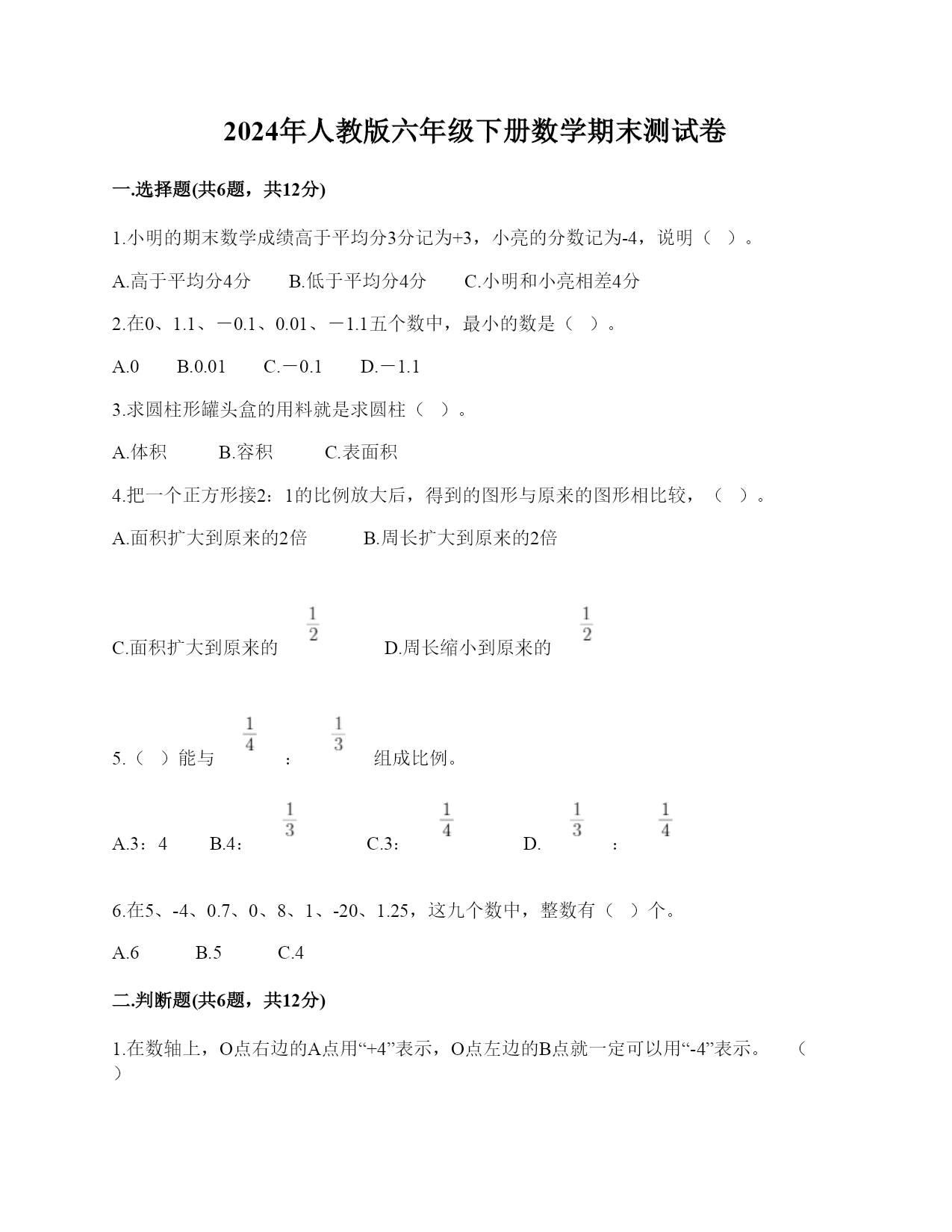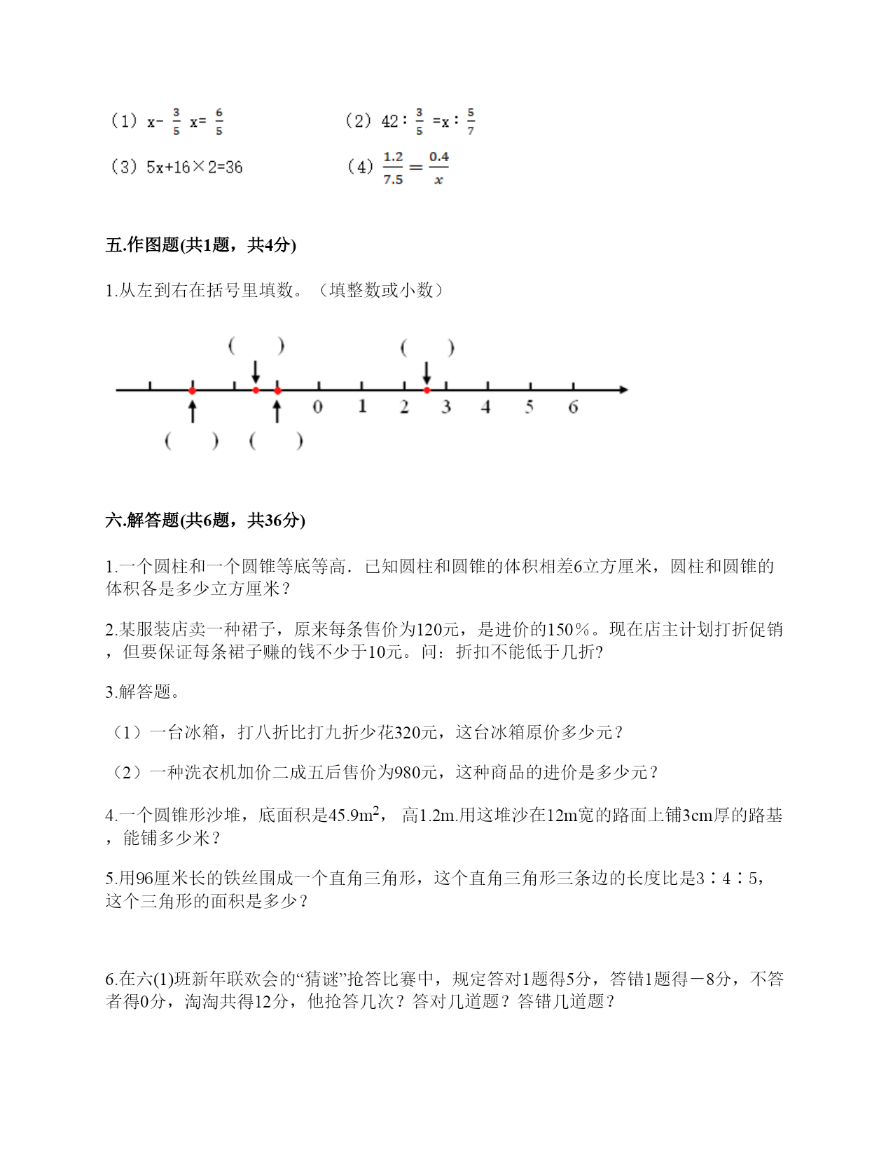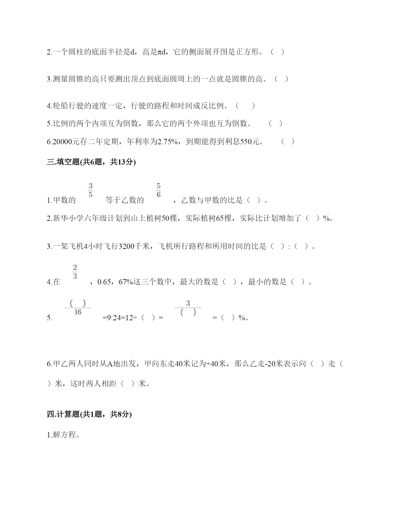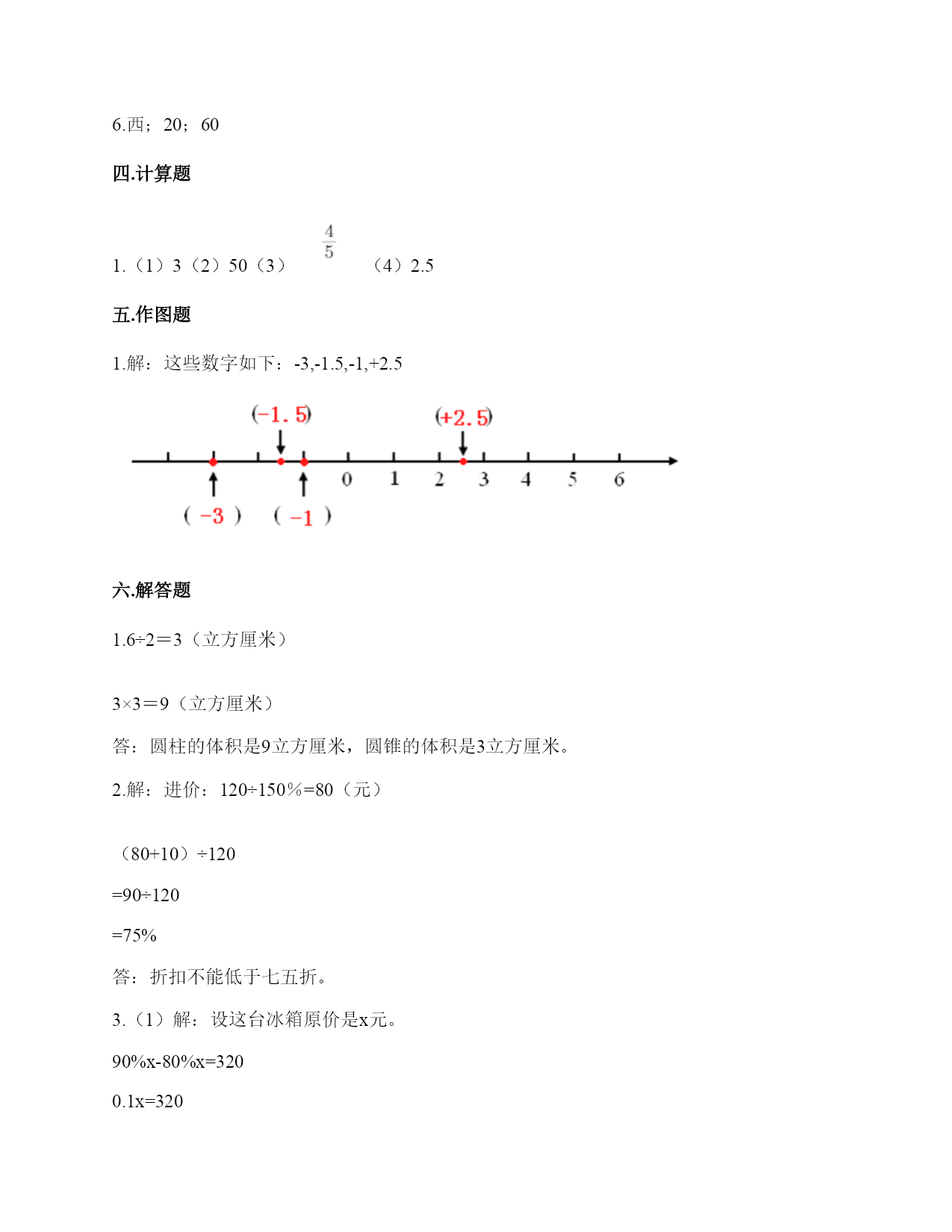 2024年人教版六年级下册数学期末测试卷一.选择题(共6题,共12分)1.小明的期末数学成绩高于平均分3分记为+3,小亮的分数记为-4,说明()。A.高于平均分4分B.低于平均分4分C.小明和小亮相差4分2.在0、1.1、-0.1、0.01、-1.1五个数中,最小的数是()。A.0B.0.01C.-0.1D.-1.13.求圆柱形罐头盒的用料就是求圆柱()。A.体积B.容积C.表面积4.把一个正方形接2:1的比例放大后,得到的图形与原来的图形相比较,()。A.面积扩大到原来的2倍B.周长扩大到原来的2倍C.面积扩大到原来的D.周长缩小到原来的5.()能与:组成比例。A.3:4B.4:C.3:D.:6.在5、-4、0.7、0、8、1、-20、1.25,这九个数中,整数有()个。A.6B.5C.4二.判断题(共6题,共12分)1.在数轴上,O点右边的A点用“+4”表示,O点左边的B点就一定可以用“-4”表示。()2.一个圆柱的底面半径是d,高是πd,它的侧面展开图是正方形。()3.测量圆锥的高只要测出顶点到底面圆周上的一点就是圆锥的高。()4.轮船行驶的速度一定,行驶的路程和时间成反比例。()5.比例的两个内项互为倒数,那么它的两个外项也互为倒数。()6.20000元存二年定期,年利率为2.75%,到期能得到利息550元。()三.填空题(共6题,共13分)1.甲数的等于乙数的,乙数与甲数的比是()。2.新华小学六年级计划到山上植树50棵,实际植树65棵,实际比计划增加了()%。3.一架飞机4小时飞行3200千米,飞机所行路程和所用时间的比是():()。4.在,0.65,67%这三个数中,最大的数是(),最小的数是()。5.=9:24=12÷()==()%。6.甲乙两人同时从A地出发,甲向东走40米记为+40米,那么乙走-20米表示向()走()米,这时两人相距()米。四.计算题(共1题,共8分)1.解方程。五.作图题(共1题,共4分)1.从左到右在括号里填数。(填整数或小数)六.解答题(共6题,共36分)1.一个圆柱和一个圆锥等底等高.已知圆柱和圆锥的体积相差6立方厘米,圆柱和圆锥的体积各是多少立方厘米?2.某服装店卖一种裙子,原来每条售价为120元,是进价的150%。现在店主计划打折促销,但要保证每条裙子赚的钱不少于10元。问:折扣不能低于几折?3.解答题。(1)一台冰箱,打八折比打九折少花320元,这台冰箱原价多少元?(2)一种洗衣机加价二成五后售价为980元,这种商品的进价是多少元?4.一个圆锥形沙堆,底面积是45.9m2,高1.2m.用这堆沙在12m宽的路面上铺3cm厚的路基,能铺多少米?5.用96厘米长的铁丝围成一个直角三角形,这个直角三角形三条边的长度比是3∶4∶5,这个三角形的面积是多少?6.在六(1)班新年联欢会的“猜谜”抢答比赛中,规定答对1题得5分,答错1题得-8分,不答者得0分,淘淘共得12分,他抢答几次?答对几道题?答错几道题?参考答案一.选择题1.B2.D3.C4.B5.A6.A二.判断题1.×2.×3.×4.×5.√6.×三.填空题1.18:252.303.800;14.67%;0.655.6;32;8;37.56.西;20;60四.计算题1.(1)3(2)50(3)(4)2.5五.作图题1.解:这些数字如下:-3,-1.5,-1,+2.5六.解答题1.6÷2=3(立方厘米)3×3=9(立方厘米)答:圆柱的体积是9立方厘米,圆锥的体积是3立方厘米。2.解:进价:120÷150%=80(元)(80+10)÷120=90÷120=75%答:折扣不能低于七五折。3.(1)解:设这台冰箱原价是x元。90%x-80%x=3200.1x=320x=3200答:这台冰箱是3200元。(2)解:设这种商品的进价是x元。x+25%x=9801.25x=980x=784答:这种商品的进价是784元。4.3厘米=0.03米×45.9×1.2÷(12×0.03)=18.36÷0.36=51(米)答:能铺51米。5.96×=24(厘米)96×=32(厘米)24×32÷2=384(平方厘米)6.解:抢答5次,答对4道,答错1道;抢答18次,答对12道,答错6道;抢答31次,答对20道,答错11道;抢答44次,答对28道,答错16道;……(答案不唯一)