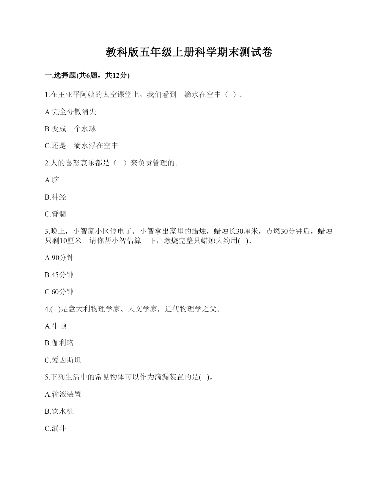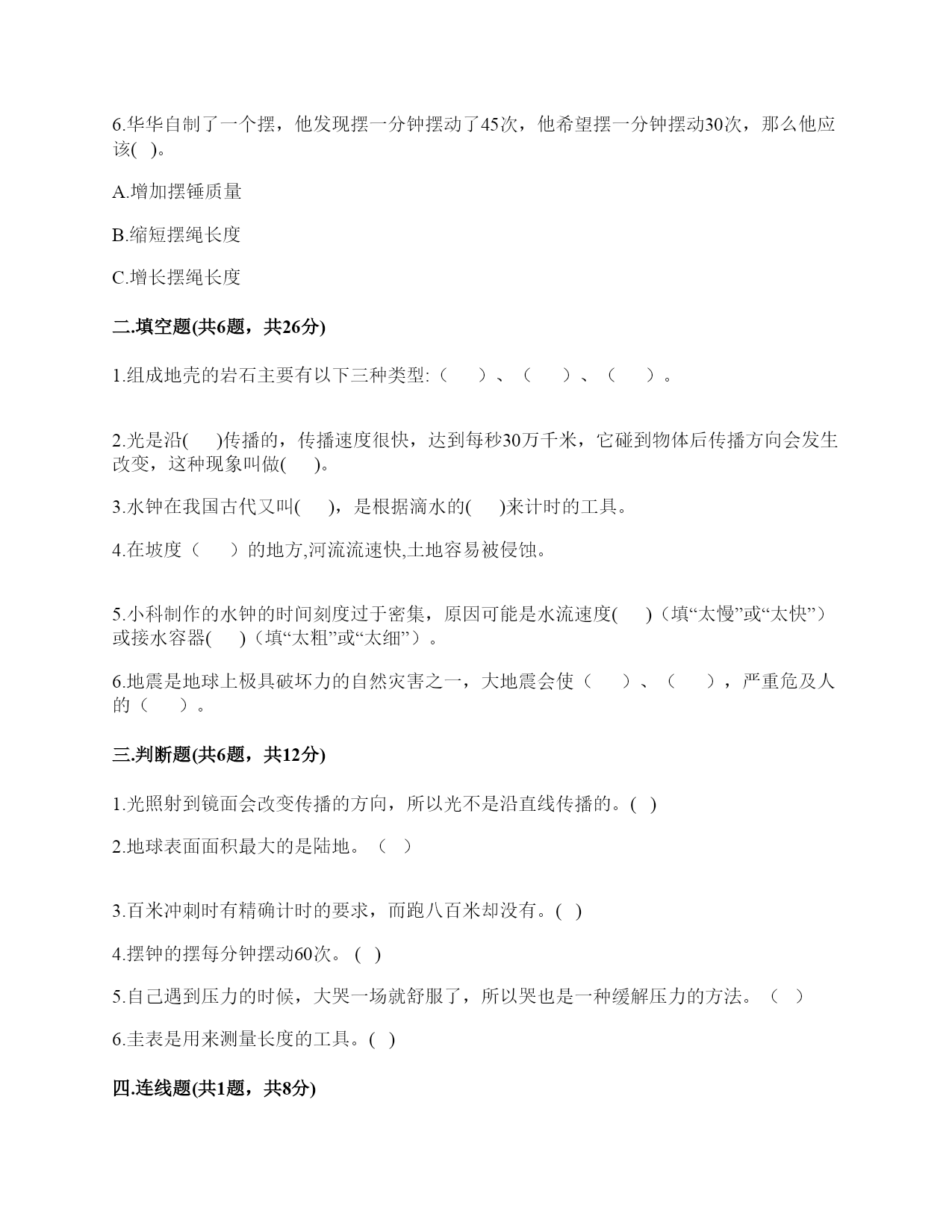 教科版五年级上册科学期末测试卷一.选择题(共6题,共12分)1.在王亚平阿姨的太空课堂上,我们看到一滴水在空中()。A.完全分散消失B.变成一个水球C.还是一滴水浮在空中2.人的喜怒哀乐都是()来负责管理的。A.脑B.神经C.脊髓3.晚上,小智家小区停电了。小智拿出家里的蜡烛,蜡烛长30厘米,点燃30分钟后,蜡烛只剩10厘米。请你帮小智估算一下,燃烧完整只蜡烛大约用()。A.90分钟B.45分钟C.60分钟4.()是意大利物理学家、天文学家,近代物理学之父。A.牛顿B.伽利略C.爱因斯坦5.下列生活中的常见物体可以作为滴漏装置的是()。A.输液装置B.饮水机C.漏斗6.华华自制了一个摆,他发现摆一分钟摆动了45次,他希望摆一分钟摆动30次,那么他应该()。A.增加摆锤质量B.缩短摆绳长度C.增长摆绳长度二.填空题(共6题,共26分)1.组成地壳的岩石主要有以下三种类型:()、()、()。2.光是沿()传播的,传播速度很快,达到每秒30万千米,它碰到物体后传播方向会发生改变,这种现象叫做()。3.水钟在我国古代又叫(),是根据滴水的()来计时的工具。4.在坡度()的地方,河流流速快,土地容易被侵蚀。5.小科制作的水钟的时间刻度过于密集,原因可能是水流速度()(填“太慢”或“太快”)或接水容器()(填“太粗”或“太细”)。6.地震是地球上极具破坏力的自然灾害之一,大地震会使()、(),严重危及人的()。三.判断题(共6题,共12分)1.光照射到镜面会改变传播的方向,所以光不是沿直线传播的。()2.地球表面面积最大的是陆地。()3.百米冲刺时有精确计时的要求,而跑八百米却没有。()4.摆钟的摆每分钟摆动60次。()5.自己遇到压力的时候,大哭一场就舒服了,所以哭也是一种缓解压力的方法。()6.圭表是用来测量长度的工具。()四.连线题(共1题,共8分)1.将下列计时仪器与原理、准确性用线连接起来。五.简答题(共2题,共8分)1.请你例举三种可以证明时间在流逝的生活实例。2.举例说明生活中哪些事例是应用了光的反射原理?六.综合题(共4题,共50分)1.下面是小明进行的光的直线传播探究实验,请你帮他填写完整。实验名称:探究光的直线传播实验准备:手电筒、带有()的纸板、能直立的夹子(4个)实验猜想:光是沿直线传播的实验过程:a、把三张带有小孔的纸板竖放在桌面上,用一根笔直的细铁丝穿过三个小孔,使三个小孔在()上,抽出铁丝,在三张纸板的后面放上一个光屏;b、用()照射小孔,观察光能否穿过三个小孔到达光屏;C.向右或向左()三张纸板中的任意一张,再观察光能否穿过三个小孔。实验现象:当三个小孔在同一条直线上时,手电筒的光()穿过三个小孔。当三个小孔不在同一条直线上时,手电筒的光()穿过三个小孔。实验结论:光在空气中是沿()的。2.“囊萤映雪”描述了两个家贫而又刻苦读书的人的故事。其中的“囊萤”是指车胤家贫,没钱买灯油,而又想晚上读书,便在夏天晚上捉一些萤火虫来照明读书;“映雪”是指孙康冬天夜里利用雪映出月亮的光亮来读书。1.在“囊萤映雪”中,属于光源的是()。A.萤火虫B.月亮C.雪2.“映雪”这个故事中,孙康主要利用的是()现象。A.光的折射B.光的反射C.光的直线传播3.类似的故事还有“凿壁偷光”,讲述的是西汉大文学家匡衡幼时凿穿墙壁利用邻居家的烛光读书,终成一代文学家的故事。在这个故事中,匡衡利用的是()。A.光的折射B.光的反射C.光的直线传播3.某小学的张晓同学设计了下列方案探究植被和水土保持的关系。①取两块土壤样本,一块取自密植草坪,有草和根分布,另一块是裸土;②将两块土壤样品放在坡度相同的斜面上;③模拟下雨,冲刷两块土壤样本(洒水壶的高度、孔径大小、疏密程度、水量都相同);④称量雨水冲刷流经斜面后水的质量,测得冲刷裸土后水的质量为m1,冲刷草坪样本后水的质量为m2。回答下列问题:(1)可以推测:m1________m2。(填“>”“<”或“=”),得出的结论是________。(2)分析张晓同学设计的实验,因为步骤________的实验设计不合理,可能影响实验效果。你认为这一步必须控制的相同的实验条件是________。(3)我国的西北和华北地区植被稀少,土壤裸露,干旱少雨,一年中沙尘暴频繁发生,你认为沙尘暴频发的最根本原因是________;防治沙尘暴最先应采取的措施是________。4.填一填。参考答案一.选择题1.B2.A3.B4.B5.A6.C二.填空题1.岩浆岩;沉积岩;变质岩2.直线;光的反射3.刻漏(或滴漏);等时性4.大5.太慢;太粗6.房屋倒塌;道路毁坏;生命安全三.判断题1.×2.×3.×4.√5.√6.√四.连线题1.如图:五.简答题1.树的年轮、旧照片(任何旧的物体)、爷爷手上的皱纹、妈妈眼角的鱼尾纹等。2