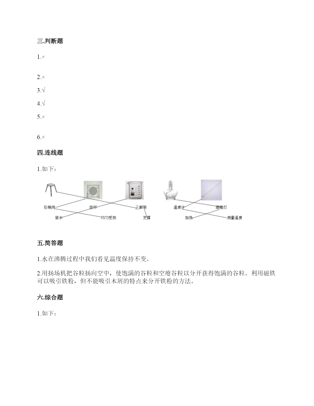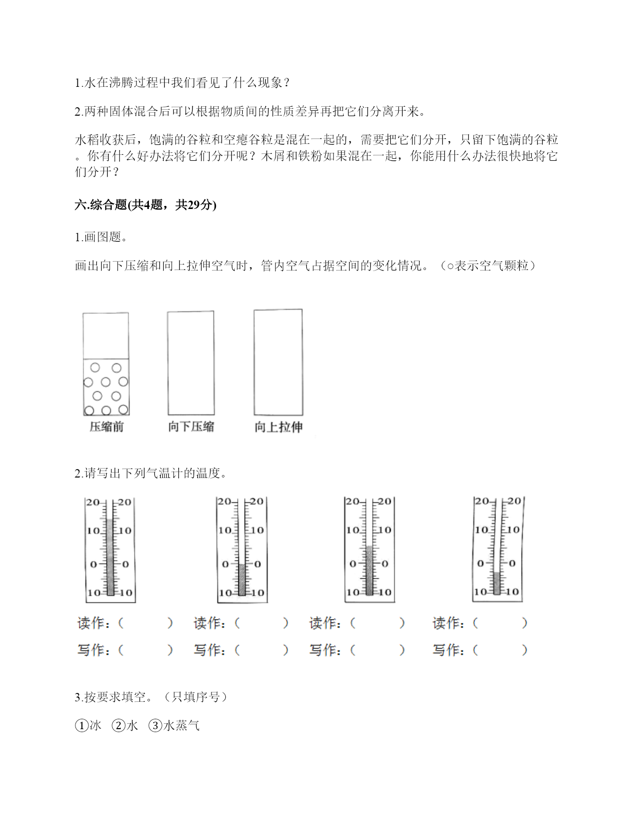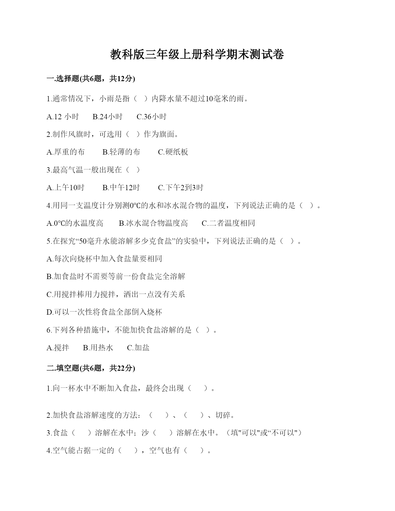教科版三年级上册科学期末测试卷一.选择题(共6题,共12分)1.通常情况下,小雨是指()内降水量不超过10毫米的雨。A.12小时B.24小时C.36小时2.制作风旗时,可选用()作为旗面。A.厚重的布B.轻薄的布C.硬纸板3.最高气温一般出现在()A.上午10时B.中午12时C.下午2到3时4.用同一支温度计分别测0℃的水和冰水混合物的温度,下列说法正确的是()。A.0℃的水温度高B.冰水混合物温度高C.二者温度相同5.在探究“50毫升水能溶解多少克食盐”的实验中,下列说法正确的是()。A.每次向烧杯中加入食盐量要相同B.加食盐时不需要等前一份食盐完全溶解C.用搅拌棒用力搅拌,洒出一点没有关系D.可以一次性将食盐全部倒入烧杯6.下列各种措施中,不能加快食盐溶解的是()。A.搅拌B.用热水C.加盐二.填空题(共6题,共22分)1.向一杯水中不断加入食盐,最终会出现()。2.加快食盐溶解速度的方法:()、()、切碎。3.食盐()溶解在水中;沙()溶解在水中。(填"可以"或“不可以")4.空气能占据一定的(),空气也有()。5.堵住注射器的管口,往外拉活塞,注射器中的空气数量(),间距()。6.水从液体变成()的过程就是结冰,结冰后的体积会()。三.判断题(共6题,共12分)1.做水结冰的实验时,需要用到的装水的仪器是烧杯。()2.冰融化成水,体积会膨胀。()3.一般情况下,空气是气体。()4.空气有一定的质量,但是质量很轻。()5.实验时,可以用燃着的酒精灯对火。()6.有生命的物体都离不开空气。()四.连线题(共1题,共9分)1.科学老师在整理实验室的时候找到了一些仪器,你能帮老师辨认出它们的名称及作用吗?请试着连连看。石棉网烧杯三脚架温度计酒精灯装水均匀受热支撑加热测量温度五.简答题(共2题,共13分)1.水在沸腾过程中我们看见了什么现象?2.两种固体混合后可以根据物质间的性质差异再把它们分离开来。水稻收获后,饱满的谷粒和空瘪谷粒是混在一起的,需要把它们分开,只留下饱满的谷粒。你有什么好办法将它们分开呢?木屑和铁粉如果混在一起,你能用什么办法很快地将它们分开?六.综合题(共4题,共29分)1.画图题。画出向下压缩和向上拉伸空气时,管内空气占据空间的变化情况。(○表示空气颗粒)2.请写出下列气温计的温度。3.按要求填空。(只填序号)①冰②水③水蒸气(1)()没有固定的形状,但有一定的体积。(2)()有一定的形状和体积。(3)()没有固定的形状和体积,存在于空气中。4.实验探究。1.在简易天平的两端各放入一个充好气的皮球和若干豆子,让天平达到()2.取出皮球,用打气筒打入10筒空气,再把皮球放回天平一端的小桶里,天平会向()端倾斜,如果想让天平重新平衡,需要向()端的小桶里加人豆子。3.天平重新达到平衡后,将皮球放出一部分气,天平会向()端倾斜,如果想让天平重新平衡,需要向()端的小桶里加人豆子。参考答案一.选择题1.B2.B3.C4.C5.A6.C二.填空题1.沉淀2.搅拌;加热3.可以;不可以4.空间;质量(重量)5.不变;增大6.固体;变大三.判断题1.×2.×3.√4.√5.×6.×四.连线题1.如下:五.简答题1.水在沸腾过程中我们看见温度保持不变。2.用扬场机把谷粒扬向空中,使饱满的谷粒和空瘪谷粒以分开获得饱满的谷粒。利用磁铁可以吸引铁粉,但不能吸引木屑的特点来分开铁粉的方法。六.综合题1.如下:2.十五摄氏度;零摄氏度;六摄氏度;零下摄氏度;15℃;0℃;6℃;-3℃3.②;①;③4.平衡;皮球;豆子;豆子;皮球