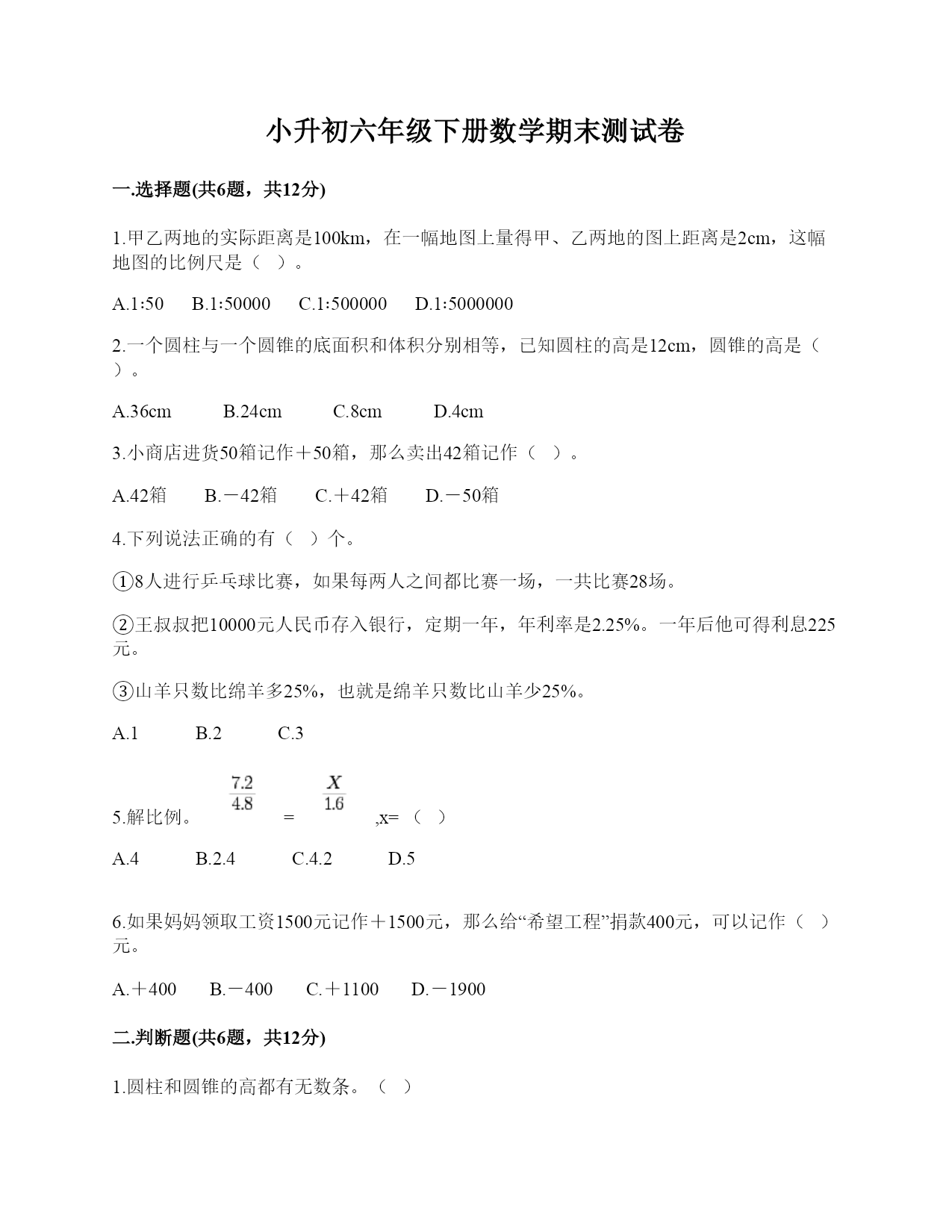 小升初六年级下册数学期末测试卷一.选择题(共6题,共12分)1.甲乙两地的实际距离是100km,在一幅地图上量得甲、乙两地的图上距离是2cm,这幅地图的比例尺是()。A.1∶50B.1∶50000C.1∶500000D.1∶50000002.一个圆柱与一个圆锥的底面积和体积分别相等,已知圆柱的高是12cm,圆锥的高是()。A.36cmB.24cmC.8cmD.4cm3.小商店进货50箱记作+50箱,那么卖出42箱记作()。A.42箱B.-42箱C.+42箱D.-50箱4.下列说法正确的有()个。①8人进行乒乓球比赛,如果每两人之间都比赛一场,一共比赛28场。②王叔叔把10000元人民币存入银行,定期一年,年利率是2.25%。一年后他可得利息225元。③山羊只数比绵羊多25%,也就是绵羊只数比山羊少25%。A.1B.2C.35.解比例。=,x=()A.4B.2.4C.4.2D.56.如果妈妈领取工资1500元记作+1500元,那么给“希望工程”捐款400元,可以记作()元。A.+400B.-400C.+1100D.-1900二.判断题(共6题,共12分)1.圆柱和圆锥的高都有无数条。()2.0可以看成正数,也可以看成负数。()3.从圆锥顶点向底面作垂直切割,所得到的截面是等腰三角形。()4.最大的负数是-1。()5.三角形的面积一定,它的高和底成反比例。()6.一地图的比例尺是1:500,则图上面积与实际面积的比是1:500。()三.填空题(共6题,共11分)1.张大爷养鸡和鸭的只数比是5:2,如果养鸡200只,比鸭多()只。2.水结成冰,体积增加,水与冰的体积之比是():()。3.六年级一班有学生40人,其中男生人数是女生的,男生有()人。4.甲、乙两人比赛爬楼梯,当甲跑到第四层时,乙恰好跑到第三层,照这样计算,甲跑到第16层时,乙应跑到第()层。5.在含盐率为30%的盐水中,加入3克的盐和7克水,这时盐水中盐和水的比是():()。6.某班五名同学的体重分别是:小军23千克,小强21千克,小兵25千克,小丽24千克,小红22千克.如果把他们的平均体重记为0千克,那么以下同学的体重分别记为:小兵________千克,小红________千克。四.计算题(共1题,共8分)1.直接写出答案。五.作图题(共1题,共4分)1.从左到右在括号里填数。(填整数或小数)六.解答题(共6题,共33分)1.张叔叔购买了三年期国债,当时年利率为3.14%。到期时张叔叔除本金外,拿到942元利息款。张叔叔购买了多少元的国债?2.电视机厂九月份生产电视机580台,比原计划增产80台,增产了百分之几?3.我们把李明从家出发,向西走了500米记作走了-500米,那么李明又接着走了+800米是什么意思?这时李明离家的距离有多远?4.一个圆柱铁皮油桶内装有半桶汽油,现在倒出汽油的后,还剩12升汽油。如果这个油桶的内底面积是10平方分米,油桶的高是多少分米?5.一个圆柱形铁皮水桶(无盖),高10dm,底面直径是6dm,做这个水桶大约要用多少铁皮?6.一个长方体木块长、宽、高分别是5cm、4cm、3cm。如果用它锯成一个最大的正方体,体积要比原来减少百分之几?参考答案一.选择题1.D2.A3.B4.A5.B6.B二.判断题1.×2.×3.√4.×5.√6.√三.填空题1.1202.11;123.164.115.3;76.+2;-1四.计算题1.0.06;0.8;0.056;87.5;;1.05;;5五.作图题1.解:这些数字如下:-3,-1.5,-1,+2.5六.解答题1.解:设张叔叔购买了x元国债。3.14%x×3=9420.0942x=942x=10000答:张叔叔一共购买了10000元国债。2.80÷(580-80)=16%答:增产了百分之十六。3.解:800-500=300(米)答:+800米表示向东走800米,离家有300米。4.油桶的容积:12÷(1-)=60(升)=60立方分米60×2=120(升)油桶的高:120÷10=12(分米)答:油桶的高是12分米。5.3.14×6×10+3.14×(6÷2)2=18.84×10+3.14×9=188.4+28.26=216.66(平方分米)答:做这个水桶大约要用铁皮216.66平方分米。6.原来长方体体积:5×4×3=60(平方厘米)最大的正方体体积:3×3×3=27(平方厘米)(60-27)÷60=33÷60=55%答:体积要比原来减少55%。