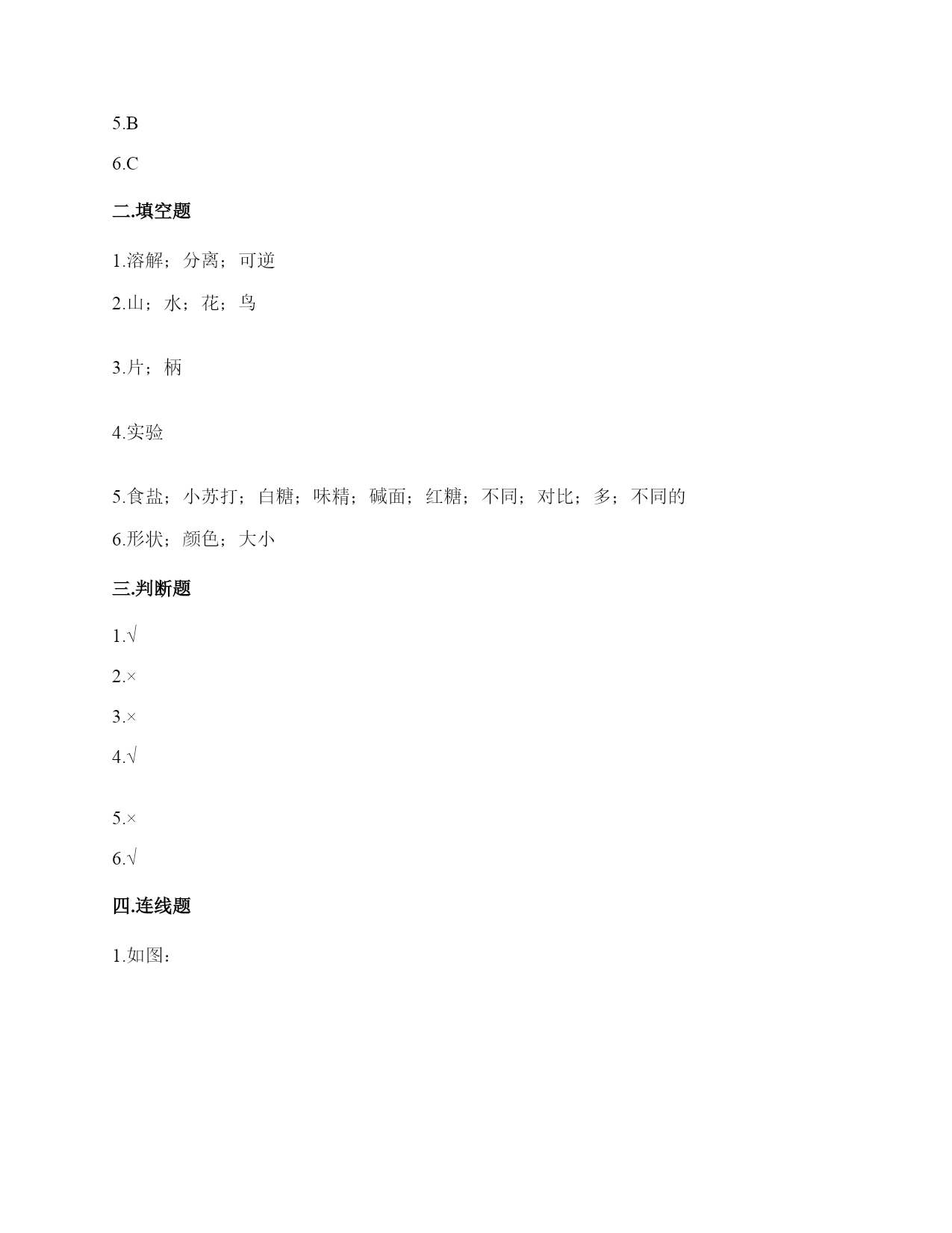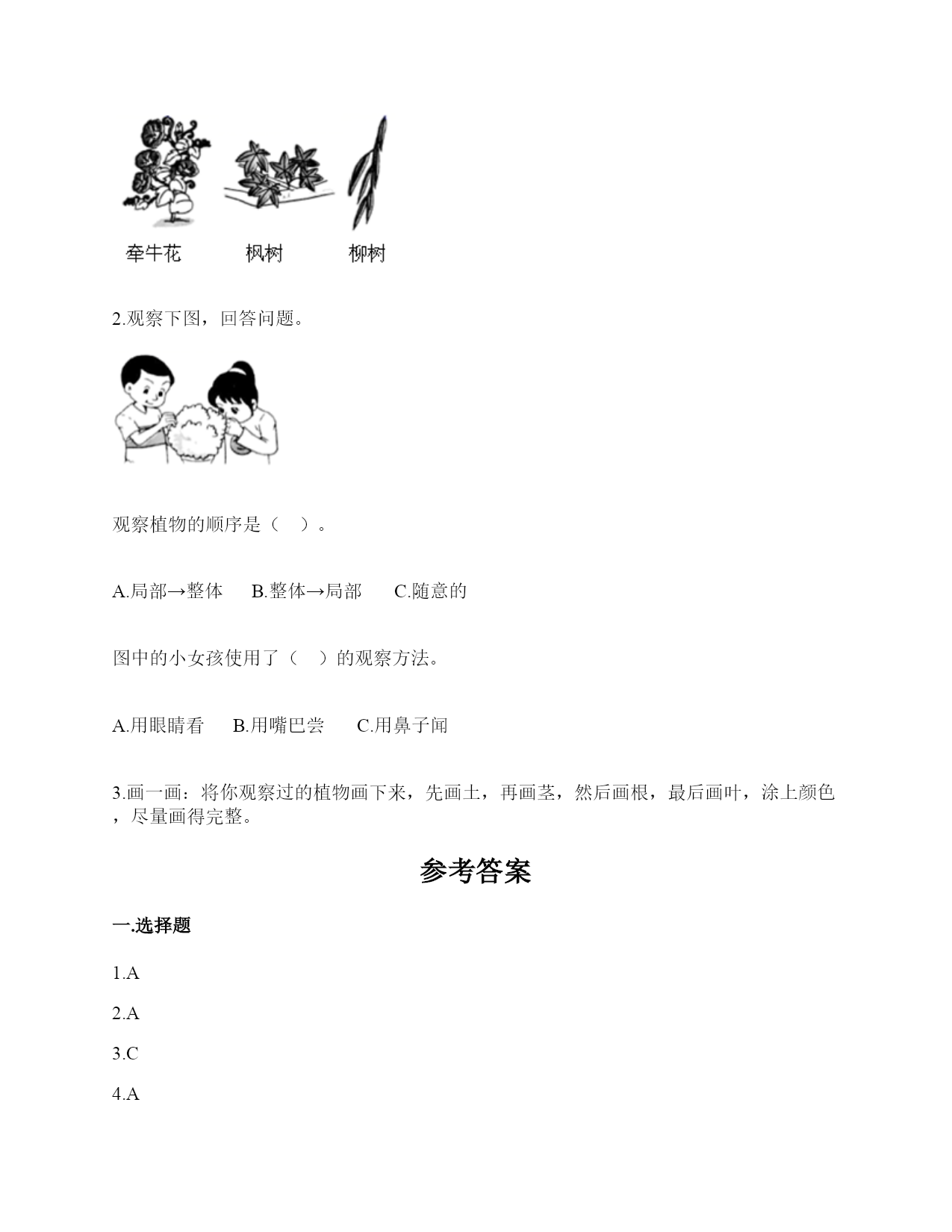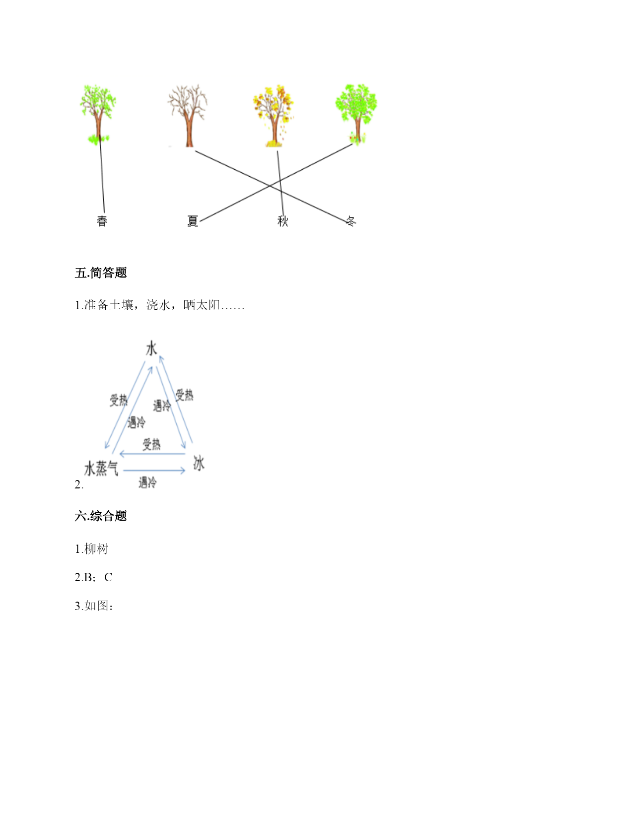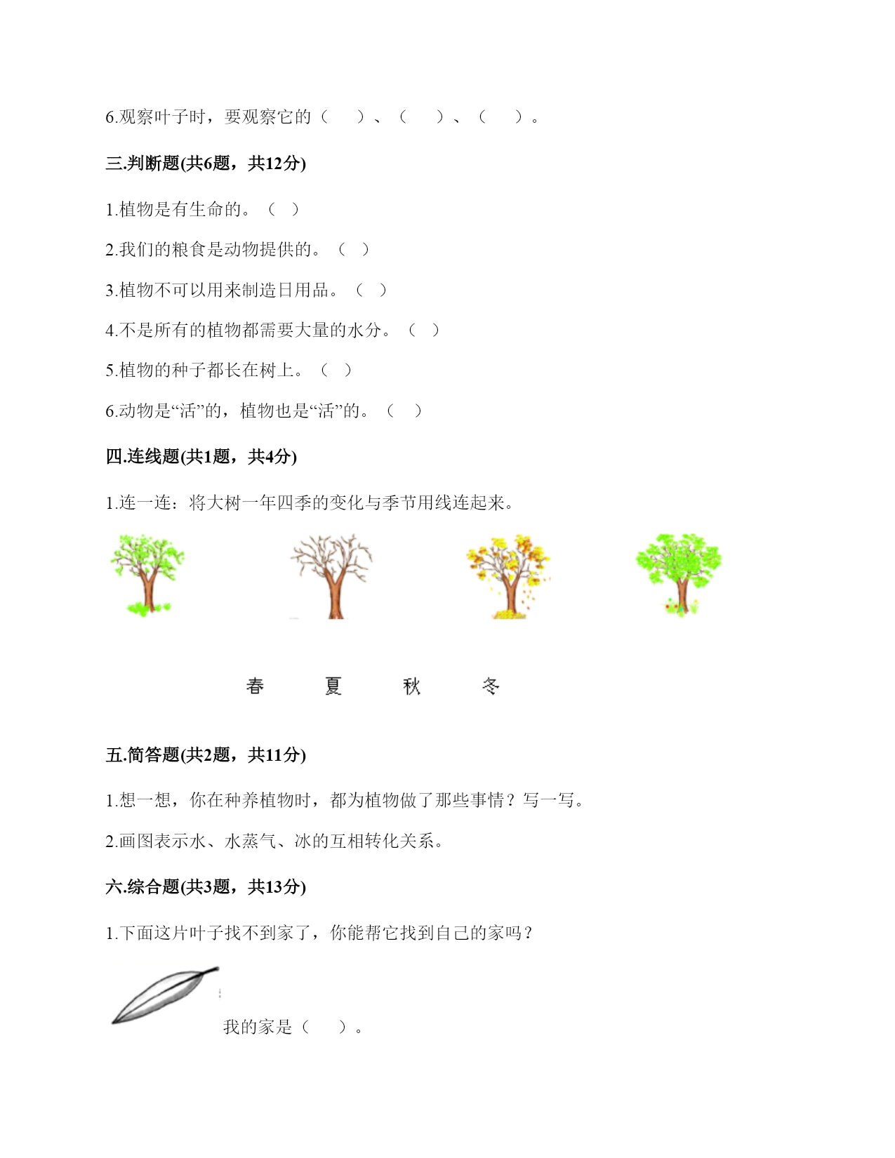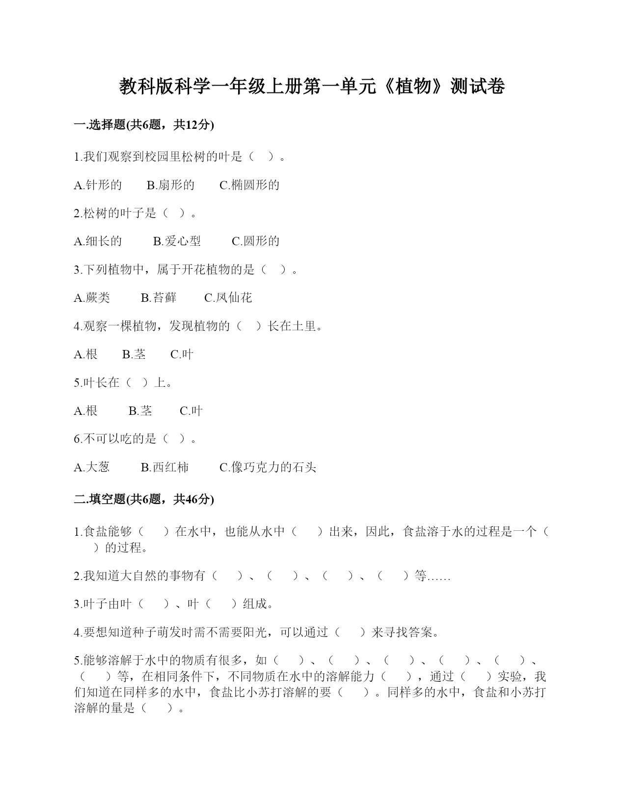 教科版科学一年级上册第一单元《植物》测试卷一.选择题(共6题,共12分)1.我们观察到校园里松树的叶是()。A.针形的B.扇形的C.椭圆形的2.松树的叶子是()。A.细长的B.爱心型C.圆形的3.下列植物中,属于开花植物的是()。A.蕨类B.苔藓C.凤仙花4.观察一棵植物,发现植物的()长在土里。A.根B.茎C.叶5.叶长在()上。A.根B.茎C.叶6.不可以吃的是()。A.大葱B.西红柿C.像巧克力的石头二.填空题(共6题,共46分)1.食盐能够()在水中,也能从水中()出来,因此,食盐溶于水的过程是一个()的过程。2.我知道大自然的事物有()、()、()、()等……3.叶子由叶()、叶()组成。4.要想知道种子萌发时需不需要阳光,可以通过()来寻找答案。5.能够溶解于水中的物质有很多,如()、()、()、()、()、()等,在相同条件下,不同物质在水中的溶解能力(),通过()实验,我们知道在同样多的水中,食盐比小苏打溶解的要()。同样多的水中,食盐和小苏打溶解的量是()。6.观察叶子时,要观察它的()、()、()。三.判断题(共6题,共12分)1.植物是有生命的。()2.我们的粮食是动物提供的。()3.植物不可以用来制造日用品。()4.不是所有的植物都需要大量的水分。()5.植物的种子都长在树上。()6.动物是“活”的,植物也是“活”的。()四.连线题(共1题,共4分)1.连一连:将大树一年四季的变化与季节用线连起来。五.简答题(共2题,共11分)1.想一想,你在种养植物时,都为植物做了那些事情?写一写。2.画图表示水、水蒸气、冰的互相转化关系。六.综合题(共3题,共13分)1.下面这片叶子找不到家了,你能帮它找到自己的家吗?我的家是()。2.观察下图,回答问题。观察植物的顺序是()。A.局部→整体B.整体→局部C.随意的图中的小女孩使用了()的观察方法。A.用眼睛看B.用嘴巴尝C.用鼻子闻3.画一画:将你观察过的植物画下来,先画土,再画茎,然后画根,最后画叶,涂上颜色,尽量画得完整。参考答案一.选择题1.A2.A3.C4.A5.B6.C二.填空题1.溶解;分离;可逆2.山;水;花;鸟3.片;柄4.实验5.食盐;小苏打;白糖;味精;碱面;红糖;不同;对比;多;不同的6.形状;颜色;大小三.判断题1.√2.×3.×4.√5.×6.√四.连线题1.如图:五.简答题1.准备土壤,浇水,晒太阳……2.六.综合题1.柳树2.B;C3.如图: