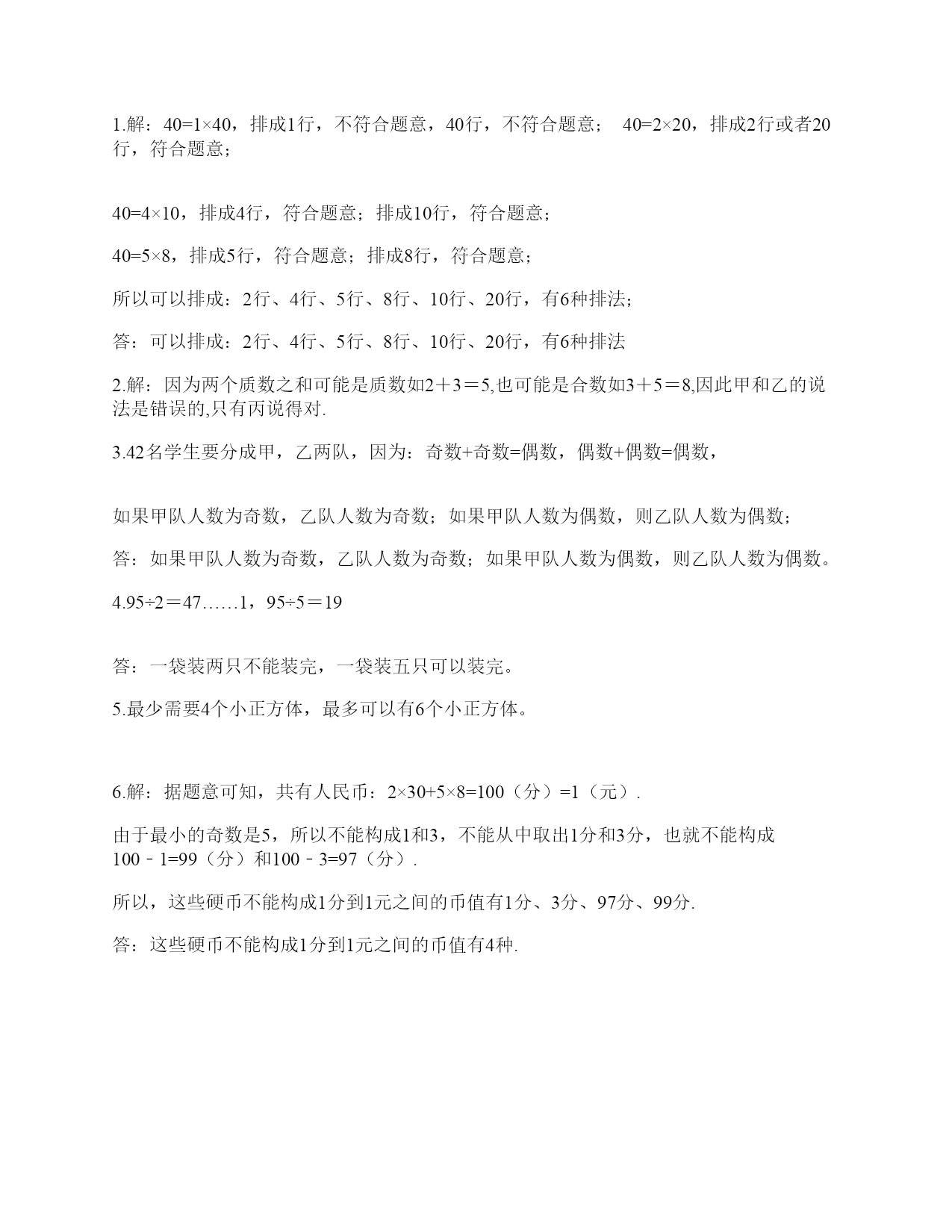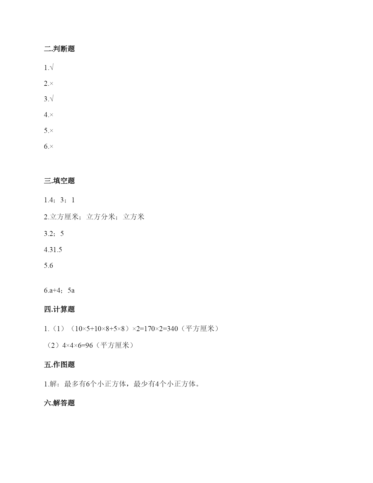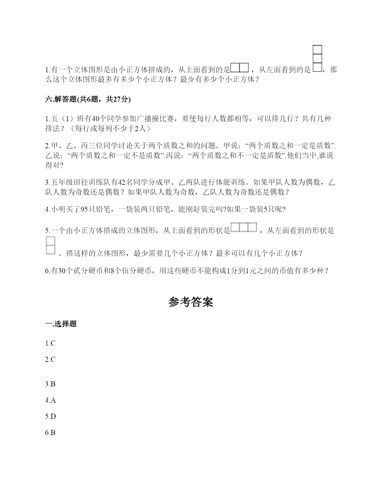 人教版五年级下册数学期中测试卷一.选择题(共6题,共12分)1.下面的说法中,正确的是()。A.12的因数只有5个。B.7的倍数只有7,14,21,28,35。C.32是32的因数,也是4的倍数。D.一个数的因数的个数是无限的。2.一个由五个方块搭成的图形,从正面看是,从左面看是,它是()。A.B.C.3.3立方米50立方分米()3.5立方米。A.大于B.小于C.等于D.不能比较4.下面()立体图形从正面看。A.B.C.5.把一个棱长4分米的正方体切成两个完全一样的长方体,表面积会增加()。A.4dm2B.8dm2C.16dm2D.32dm26.一个体积为40立方分米的长方体木块,从顶点挖掉一个棱长为1分米的小正方体后,()。A.表面积变小,体积变小B.表面积不变,体积变小C.表面积变小,体积不变二.判断题(共6题,共12分)1.1升水和1000毫升水一样重。()2.如果A÷B=6(A、B均为整数),我们就说A是倍数,B是因数。()3.正方形的边长是质数,它的周长和面积一定是合数。()4.因为4÷0.5=8,所以4是0.5的倍数,0.5是4的因数。()5.12÷5=2.4,12是5的倍数,5是12的因数。()6.个位上是3、6、9的数,是3的倍数。()三.填空题(共6题,共12分)1.长方体有()个,三角形有()个,长方体比三角形多()个。2.常用的体积单位有()、()、()。3.用容量为500毫升的瓶来装1升水,可装()瓶;用容量为200毫升的瓶来装1升水,可装()瓶。4.挖一个长7m,宽45dm,深25dm的长方体鱼池,这个鱼池的占地面积是()m2。5.既是2的倍数,又是3的倍数的数一定是()的倍数。6.有5个连续的偶数,它们的平均数是a,最大的一个数是(),它们的和是()。四.计算题(共1题,共5分)1.计算下面图形的表面积。(1)(2)五.作图题(共1题,共5分)1.有一个立体图形是由小正方体拼成的,从上面看到的是,从左面看到的是,那么这个立体图形最多有多少个小正方体?最少有多少个小正方体?六.解答题(共6题,共27分)1.五(1)班有40个同学参加广播操比赛,要使每行人数都相等,可以排几行?共有几种排法?(每行或每列不少于2人)2.甲、乙、丙三位同学讨论关于两个质数之和的问题。甲说:“两个质数之和一定是质数”.乙说:“两个质数之和一定不是质数”.丙说:“两个质数之和不一定是质数”.他们当中,谁说得对?3.五年级田径训练队有42名同学分成甲、乙两队进行体能训练。如果甲队人数为偶数,乙队人数为奇数还是偶数?如果甲队人数为奇数,乙队人数为奇数还是偶数?4.小明买了95只铅笔,一袋装两只铅笔,能刚好装完吗?如果一袋装5只呢?5.一个由小正方体搭成的立体图形,从上面看到的形状是,从左面看到的形状是。搭这样的立体图形,最少需要几个小正方体?最多可以有几个小正方体?6.有30个贰分硬币和8个伍分硬币,用这些硬币不能构成1分到1元之间的币值有多少种?参考答案一.选择题1.C2.C3.B4.A5.D6.B二.判断题1.√2.×3.√4.×5.×6.×三.填空题1.4;3;12.立方厘米;立方分米;立方米3.2;54.31.55.66.a+4;5a四.计算题1.(1)(10×5+10×8+5×8)×2=170×2=340(平方厘米)(2)4×4×6=96(平方厘米)五.作图题1.解:最多有6个小正方体,最少有4个小正方体。六.解答题1.解:40=1×40,排成1行,不符合题意,40行,不符合题意;40=2×20,排成2行或者20行,符合题意;40=4×10,排成4行,符合题意;排成10行,符合题意;40=5×8,排成5行,符合题意;排成8行,符合题意;所以可以排成:2行、4行、5行、8行、10行、20行,有6种排法;答:可以排成:2行、4行、5行、8行、10行、20行,有6种排法2.解:因为两个质数之和可能是质数如2+3=5,也可能是合数如3+5=8,因此甲和乙的说法是错误的,只有丙说得对.3.42名学生要分成甲,乙两队,因为:奇数+奇数=偶数,偶数+偶数=偶数,如果甲队人数为奇数,乙队人数为奇数;如果甲队人数为偶数,则乙队人数为偶数;答:如果甲队人数为奇数,乙队人数为奇数;如果甲队人数为偶数,则乙队人数为偶数。4.95÷2=47……1,95÷5=19答:一袋装两只不能装完,一袋装五只可以装完。5.最少需要4个小正方体,最多可以有6个小正方体。6.解:据题意可知,共有人民币:2×30+5×8=100(分)=1(元).由于最小的奇数是5,所以不能构成1和3,不能从中取出1分和3分,也就不能构成100﹣1=99(分)和100﹣3=97(分).所以,这些硬币不能构成1分到1元之间的币值有1分、3分、97分、99分.答:这些硬币不能构成1分到1
