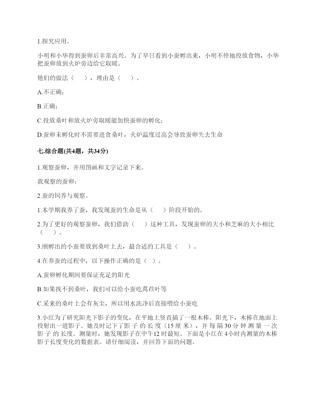 教科版三年级下册科学期末测试卷一.选择题(共6题,共12分)1.下列说法错误的是()。A.地球绕太阳转B.月球绕地球转C.太阳绕地球转2.一般情况下,下列动物中长跑速度最慢的是()。A.狮子B.猎豹C.藏羚羊D.大熊猫3.下面说法错误的是()。A.自然环境下,蚕宝宝一般在春天或夏天出生B.设计过山车时,要有直线轨道和曲线轨道C.将小球从桌面边缘平抛下去,小球的运动是直线运动D.月球的年龄是45亿年4.下列关于蚕蛾的描述中,不正确的是()。A.不吃东西B.两只蛾会尾对尾C.翅膀像蝴蝶一样,五颜六色5.下列自然现象与月球引力作用有关的是()。A.太阳黑子B.月食C.潮汐6.地球仪上的蓝色表示()。A.陆地B.海洋C.冰川二.填空题(共6题,共40分)1.熟鸡蛋的内部结构由()、()、()和()组成。2.我知道的胎生动物有:()、()、()等。3.骑自行车在道路上前进时,从整体看,自行车的运动方式是();从局部看,自行车把的运动方式是();脚蹬的运动方式是();车轮的运动方式是()。4.蚕要蜕皮是因为()。5.像滑滑梯、山坡这样的一端高、一端低的斜坡,在科学上被称为()。斜面上的物体会像滑滑梯那样()下去,会像石头从山顶向下滚下去一样()。6.月球自转的方向是(),月球绕地球运动,使()、()、()三者的相对位置在一个月中有规律的变动,而地球上人们看到的太阳光照亮的月球部分形状发生有规律的变化,从而产生()三.判断题(共6题,共12分)1.以车厢为参照物,车厢内走动的人是静止的。()2.月相只有在夜晚可以看到。()3.跷跷板会一上一下的做直线运动。()4.要判断物体是否运动,先要选择其他物体作参照。()5.在斜坡上滑行的木块是直线运动,小朋友踢球时从球的运动轨迹看属于曲线运动。()6.被选作参照物的物体,即被假设为静止。()四.连线题(共1题,共5分)1.比较蚕蛾和蚕蛹的身体结构,用线连出五个相同部位。五.简答题(共2题,共10分)1.观察生活中各种物体的运动,哪些运动属于直线运动,哪些运动属于曲线运动?2.请列举胎生动物和卵生动物各3个。六.材料题(共1题,共6分)1.探究应用。小明和小华得到蚕卵后非常高兴。为了早日看到小蚕孵出来,小明不停地投放食物,小华把蚕卵放到火炉旁边给它取暖。他们的做法(),理由是()。A.不正确;B.正确;C.投放桑叶和放火炉旁取暖能加快蚕卵的孵化;D.蚕卵未孵化时不需要进食桑叶,火炉温度过高会导致蚕卵失去生命七.综合题(共4题,共34分)1.观察蚕卵,并用图画和文字记录下来。我观察的蚕卵:2.蚕的饲养与观察。1.本学期我养了蚕,我发现蚕的生命是从()阶段开始的。2.为了更好的观察蚕卵,我们借助()这种工具,发现蚕卵的大小和芝麻的大小相比()。3.刚孵出的小蚕要放到桑叶上去,最合适的工具是()。4.在养蚕的过程中,以下操作正确的是()。A.蚕卵孵化期间要保证充足的阳光B.如果找不到桑叶,我们可以给小蚕吃莴苣叶等C.采来的桑叶上会有灰尘,所以用水洗净后直接喂给小蚕吃3.小红为了研究阳光下影子的变化,在平地上竖直插了一根木棒。阳光下,木棒在地面上投射出一道影子。她及时记下了影子的长度(15厘米),并每隔30分钟测量一次影子的长度。测量时,她发现影子在中午12时最短。下面是小红在4小时内测量的木棒影子长度变化的数据表。请仔细阅读,并回答下面的问题。1.从上面的数据表中,我们能推测出该小组是在()(填“上午“”中午”或“下午”)结束测量的。2.从上面的数据表中可以推测,如果进行第10次测量,此时木棒影子的长度大约()厘米。3.从上面的数据表中可以知道,从第1次测量到第6次测量这段时间里,影子的长度变化规律:随着时间的推移,影子越来越()填“短”或“长”)。4.画出一天中木棒影长变化的柱状图。4.参考蚕的生长过程,写出蝴蝶的四个生长阶段。参考答案一.选择题1.C2.D3.C4.C5.C6.B二.填空题1.气室;卵白;卵黄;卵壳2.羊;兔;熊猫3.平动;摆动;转动;转动4.旧皮阻碍身体长大5.斜面;滑动;滚动6.自西向东;日;地;月;月相三.判断题1.×2.×3.×4.√5.√6.√四.连线题1.头、胸、腹、触角、眼等,图略五.简答题1.拉锯、火车前进等属于直线运动;轮椅转动、水车转动等属于曲线运动。2.胎生动物:牛、羊、猫、狗、马、狮子、鯨鱼、蝙蝠、袋鼠等;卵生动物:鸡、鸭、鱼、鸟、青蛙、乌龟、蝴蝶等。六.材料题1.A;D七.综合题1.刚产下的蚕卵是淡黄色或黄色的,经1-2天变成淡红,浅褐色,再经3-4天变成灰绿或紫黑色,以后不再发生变化。蚕卵的形状近似圆形,紫黑色的蚕卵可以孵出小蚕来。2.蚕卵;放大镜;差不多;毛笔;B3.下午;2.12;3.短;4.4.如下: