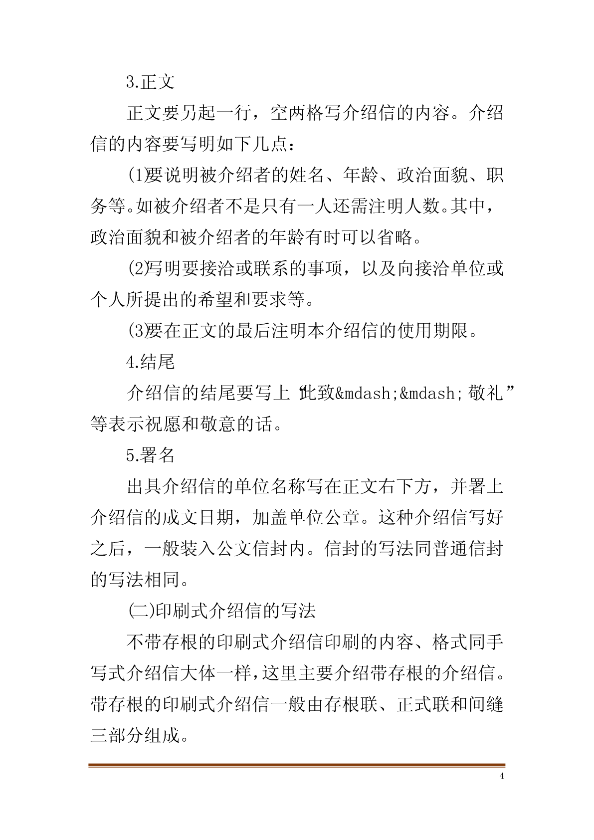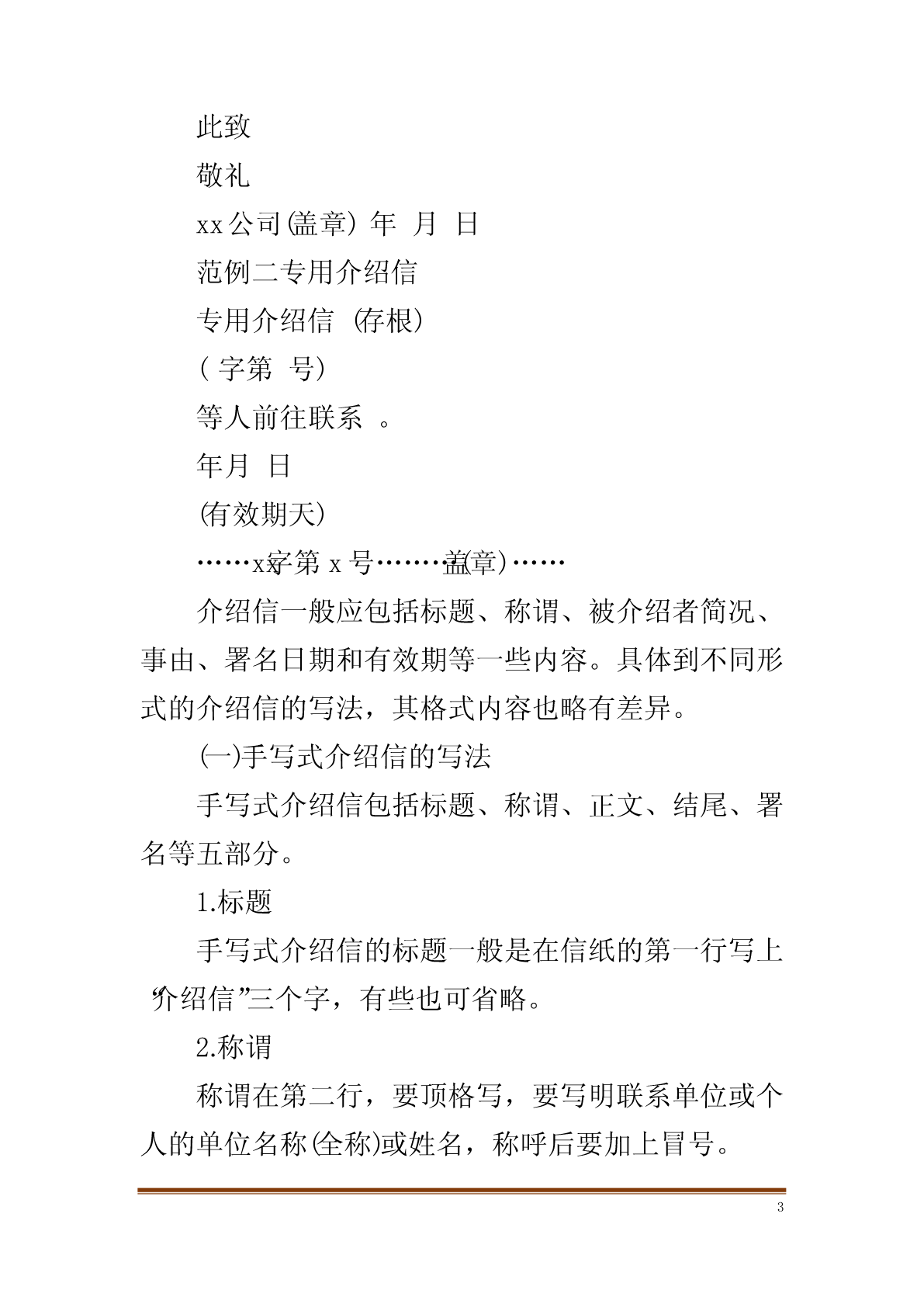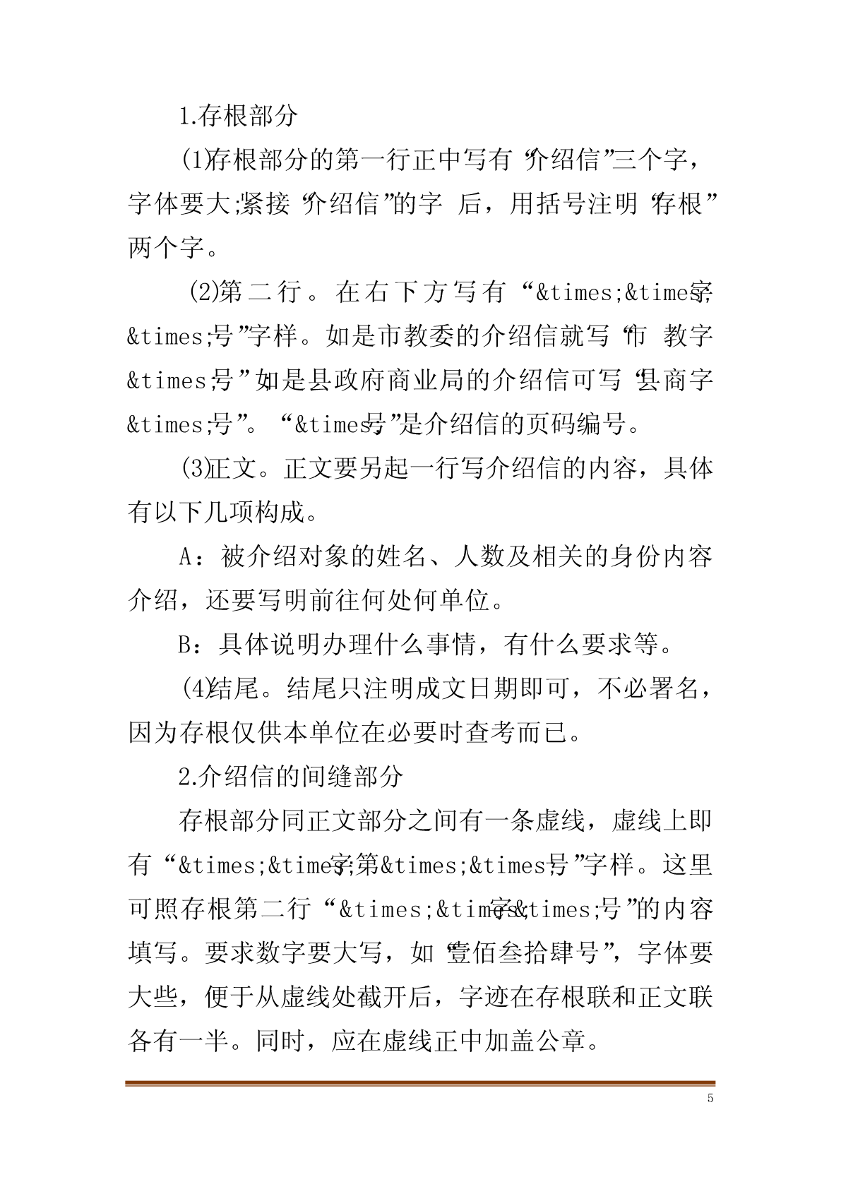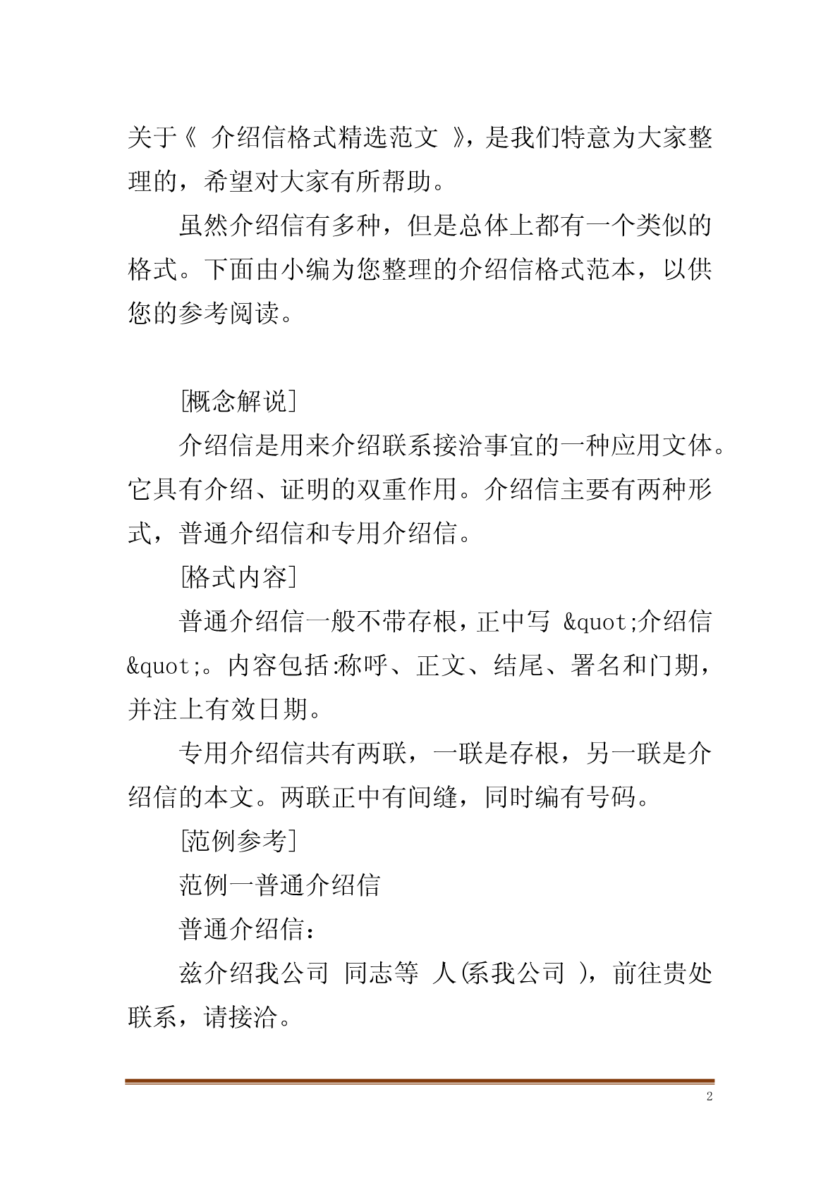 介绍信格式精选范文1关于《介绍信格式精选范文》,是我们特意为大家整理的,希望对大家有所帮助。虽然介绍信有多种,但是总体上都有一个类似的格式。下面由小编为您整理的介绍信格式范本,以供您的参考阅读。[概念解说]介绍信是用来介绍联系接洽事宜的一种应用文体。它具有介绍、证明的双重作用。介绍信主要有两种形式,普通介绍信和专用介绍信。[格式内容]普通介绍信一般不带存根,正中写"介绍信"。内容包括:称呼、正文、结尾、署名和门期,并注上有效日期。专用介绍信共有两联,一联是存根,另一联是介绍信的本文。两联正中有间缝,同时编有号码。[范例参考]范例一普通介绍信普通介绍信:兹介绍我公司同志等人(系我公司),前往贵处联系,请接洽。2此致敬礼xx公司(盖章)年月日范例二专用介绍信专用介绍信(存根)(字第号)等人前往联系。年月日(有效期天)……xx字第x号………(盖章)……介绍信一般应包括标题、称谓、被介绍者简况、事由、署名日期和有效期等一些内容。具体到不同形式的介绍信的写法,其格式内容也略有差异。(一)手写式介绍信的写法手写式介绍信包括标题、称谓、正文、结尾、署名等五部分。1.标题手写式介绍信的标题一般是在信纸的第一行写上“介绍信”三个字,有些也可省略。2.称谓称谓在第二行,要顶格写,要写明联系单位或个人的单位名称(全称)或姓名,称呼后要加上冒号。33.正文正文要另起一行,空两格写介绍信的内容。介绍信的内容要写明如下几点:(1)要说明被介绍者的姓名、年龄、政治面貌、职务等。如被介绍者不是只有一人还需注明人数。其中,政治面貌和被介绍者的年龄有时可以省略。(2)写明要接洽或联系的事项,以及向接洽单位或个人所提出的希望和要求等。(3)要在正文的最后注明本介绍信的使用期限。4.结尾介绍信的结尾要写上“此致——敬礼”等表示祝愿和敬意的话。5.署名出具介绍信的单位名称写在正文右下方,并署上介绍信的成文日期,加盖单位公章。这种介绍信写好之后,一般装入公文信封内。信封的写法同普通信封的写法相同。(二)印刷式介绍信的写法不带存根的印刷式介绍信印刷的内容、格式同手写式介绍信大体一样,这里主要介绍带存根的介绍信。带存根的印刷式介绍信一般由存根联、正式联和间缝三部分组成。41.存根部分(1)存根部分的第一行正中写有“介绍信”三个字,字体要大;紧接“介绍信”的字后,用括号注明“存根”两个字。(2)第二行。在右下方写有“××字×号”字样。如是市教委的介绍信就写“市教字×号”;如是县政府商业局的介绍信可写“县商字×号”。“×号”是介绍信的页码编号。(3)正文。正文要另起一行写介绍信的内容,具体有以下几项构成。A:被介绍对象的姓名、人数及相关的身份内容介绍,还要写明前往何处何单位。B:具体说明办理什么事情,有什么要求等。(4)结尾。结尾只注明成文日期即可,不必署名,因为存根仅供本单位在必要时查考而已。2.介绍信的间缝部分存根部分同正文部分之间有一条虚线,虚线上即有“××字第××号”字样。这里可照存根第二行“××字×号”的内容填写。要求数字要大写,如“壹佰叁拾肆号”,字体要大些,便于从虚线处截开后,字迹在存根联和正文联各有一半。同时,应在虚线正中加盖公章。53.正式联部分(1)第一行正中写有“介绍信”字样,字体较大。(2)第二行在右下方有“××字××号”字样,内容照存根联填写。(3)称谓。称谓要顶格写,写明所联系的单位或个人的称呼或姓名。(4)正文。正文应另起一行,空两格起再写介绍信的具体内容。内容同存根内容一样,主要写明持介绍信者的姓名、人数、要接洽的具体事项、要求等。(5)结尾。写明祝愿或敬意的话,一般要写些诸如“请接洽”、“请指教”、“请协助”等类的话,后边还要写“此致——敬礼”。最后要注明该介绍信的有效期限。(6)署名。在右下方要署上本单位的名称全名,并加盖公章,同时另起一行署成文日期。这类介绍信写好后,也应装入公文信封内。信封的写法同普通信封相同。范文1:敬尊的领导:您好!俺是来自XXX学大网络工程师专业的XXX。本人在学大期间积极参加各种社会实践活动,担任学校多个单位的职位。从中俺不仅认识到了团队精神的6重要性,还学会了如何做人,明白了做人要厚道的道理,同时俺还学会了如何和人交流沟通。可以说,俺的学大生活很充实,这可以算是俺人生的转折点和飞跃点。大一到大三期间,俺在计算机中心担任网络管理员,主要负责机房网络和作工站的日常维护作工,还负责机房财务收支管理作工。在这三年里,俺不仅学到了有关硬件和网络管理方面的识