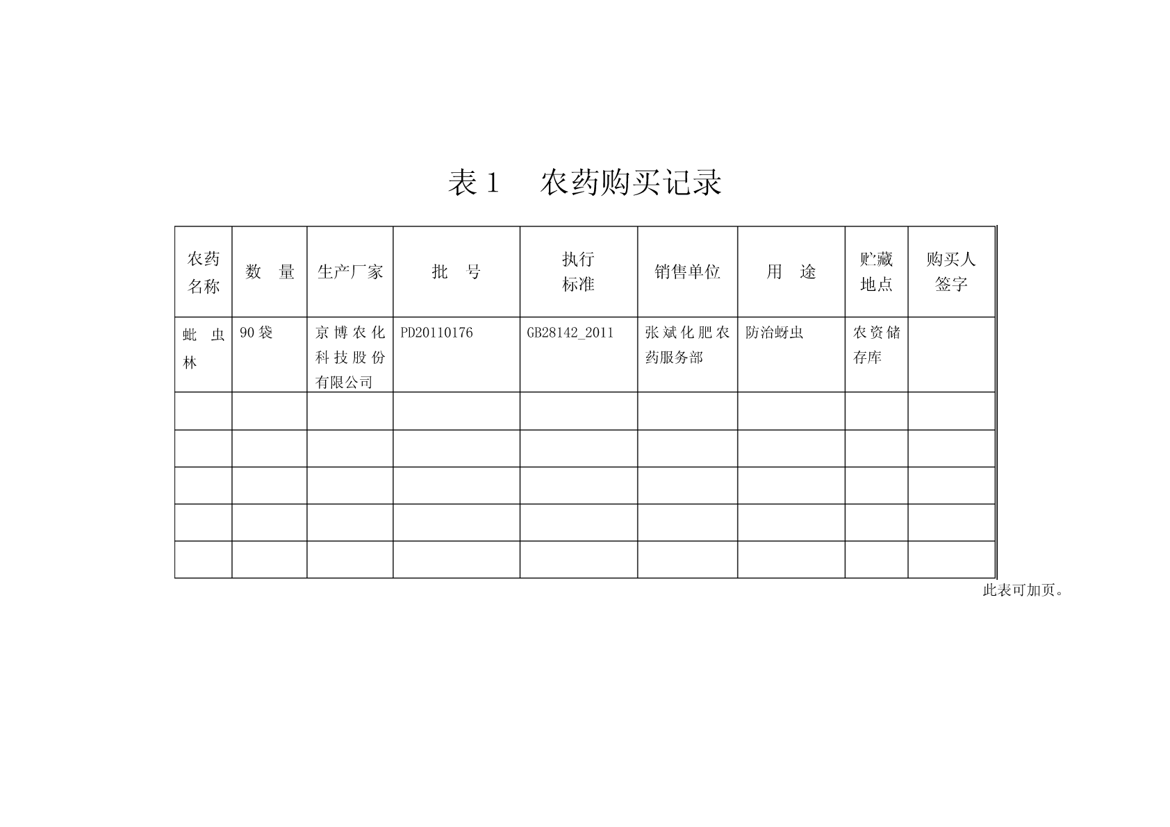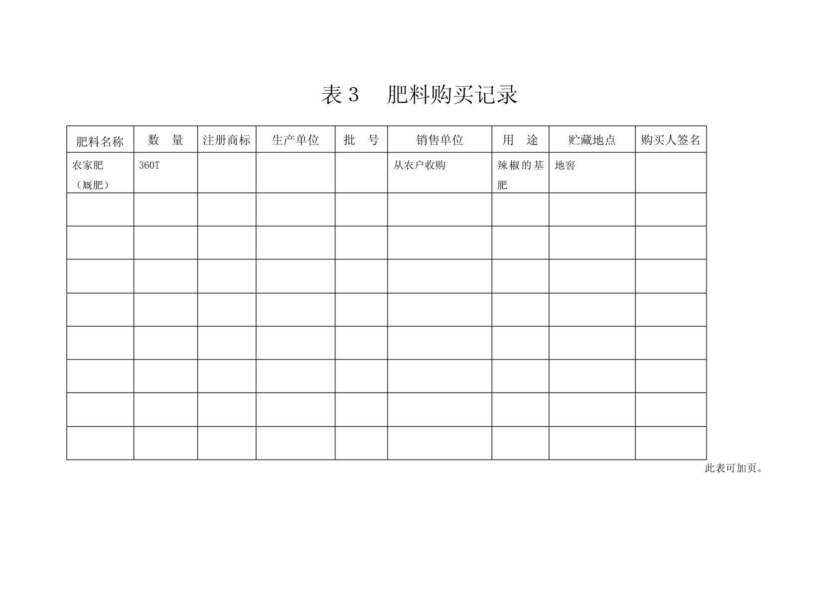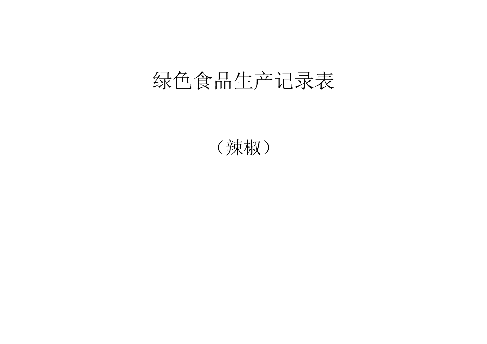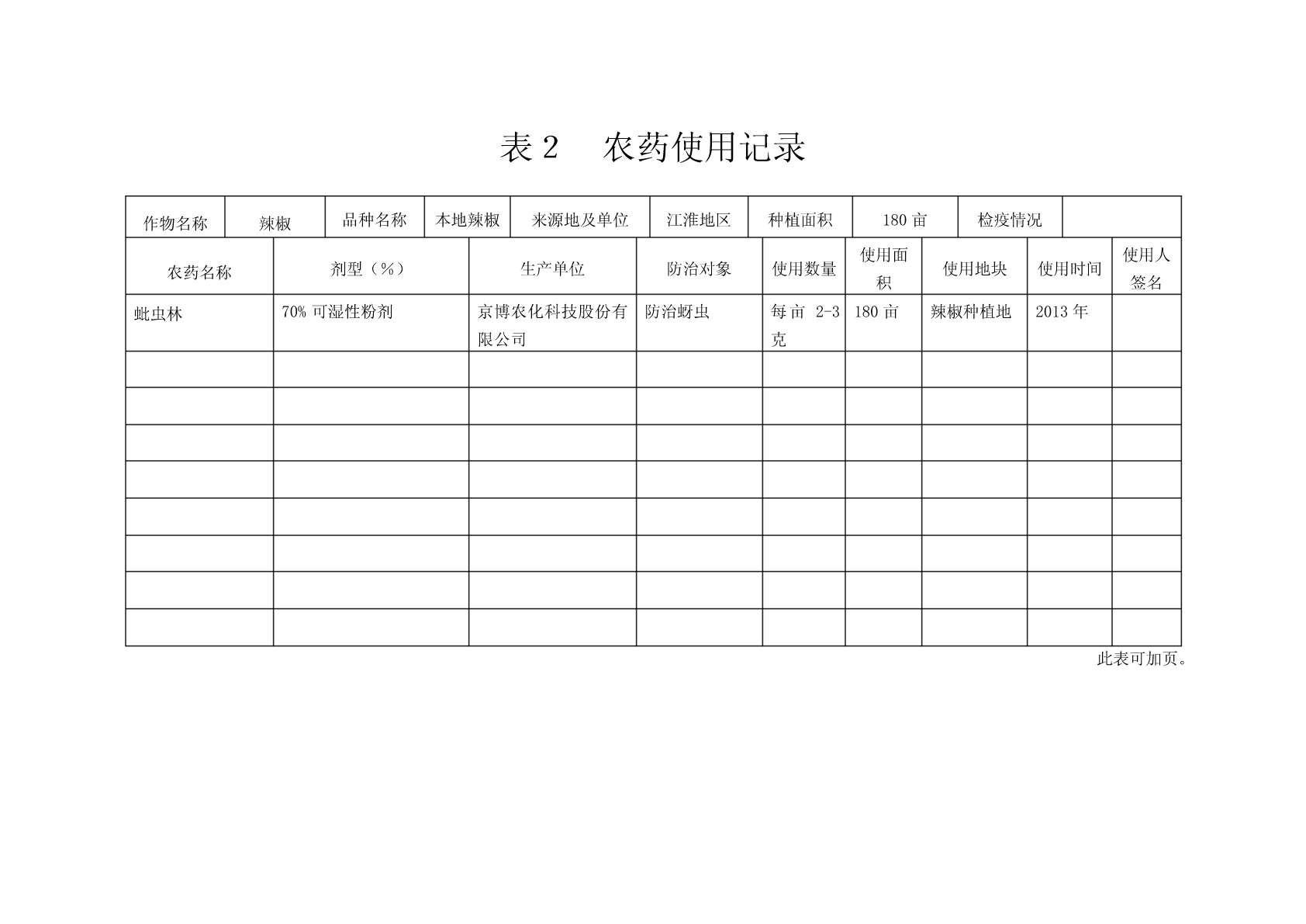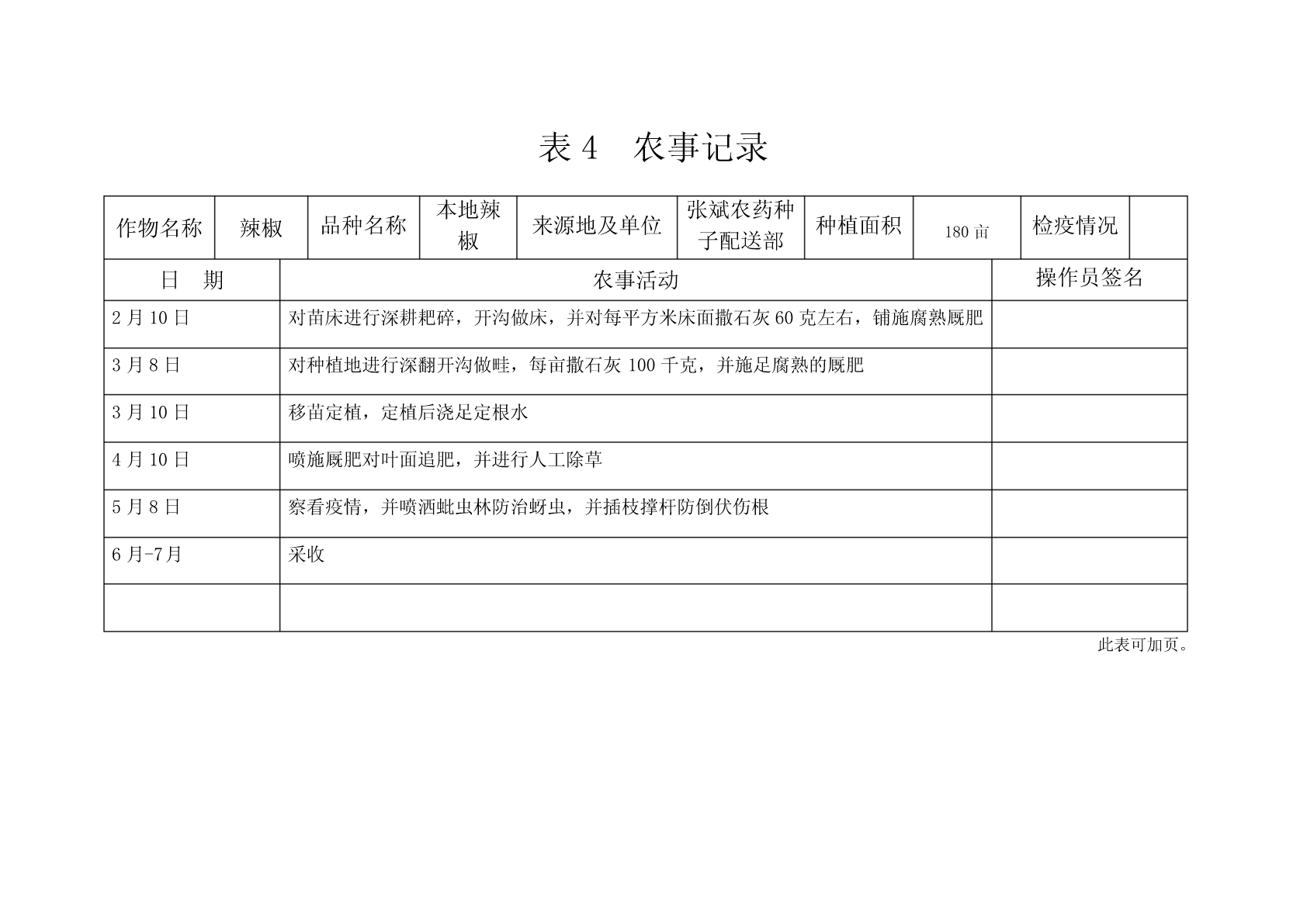 绿色食品生产记录表(辣椒)表1农药购买记录农药执行贮藏购买人数量生产厂家批号销售单位用途名称标准地点签字蚍虫90袋京博农化PD20110176GB28142_2011张斌化肥农防治蚜虫农资储林科技股份药服务部存库有限公司此表可加页。表2农药使用记录作物名称辣椒品种名称本地辣椒来源地及单位江淮地区种植面积180亩检疫情况使用面使用人农药名称剂型(%)生产单位防治对象使用数量使用地块使用时间积签名蚍虫林70%可湿性粉剂京博农化科技股份有防治蚜虫每亩2-3180亩辣椒种植地2013年限公司克此表可加页。表3肥料购买记录肥料名称数量注册商标生产单位批号销售单位用途贮藏地点购买人签名农家肥360T从农户收购辣椒的基地窖(厩肥)肥此表可加页。表4农事记录本地辣张斌农药种作物名称辣椒品种名称来源地及单位种植面积检疫情况椒子配送部180亩日期农事活动操作员签名2月10日对苗床进行深耕耙碎,开沟做床,并对每平方米床面撒石灰60克左右,铺施腐熟厩肥3月8日对种植地进行深翻开沟做畦,每亩撒石灰100千克,并施足腐熟的厩肥3月10日移苗定植,定植后浇足定根水4月10日喷施厩肥对叶面追肥,并进行人工除草5月8日察看疫情,并喷洒蚍虫林防治蚜虫,并插枝撑杆防倒伏伤根6月-7月采收此表可加页。