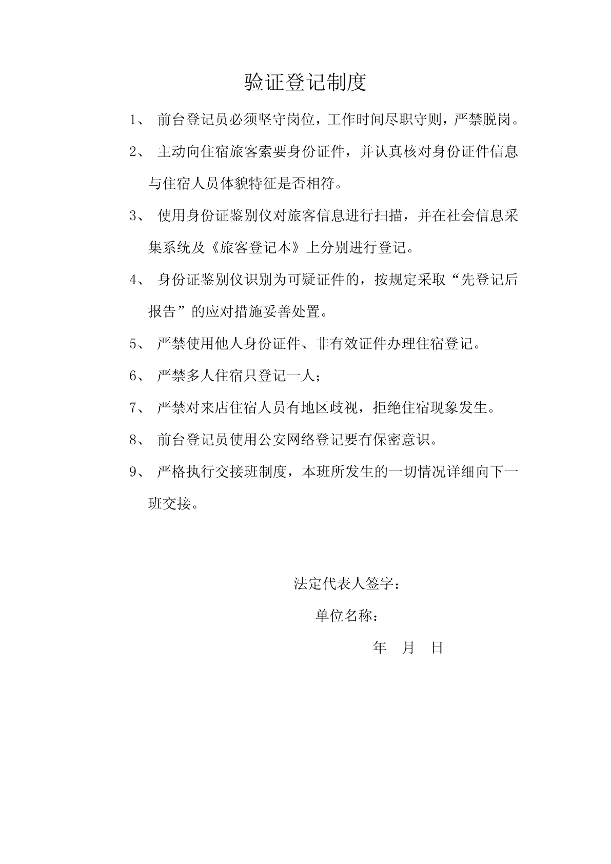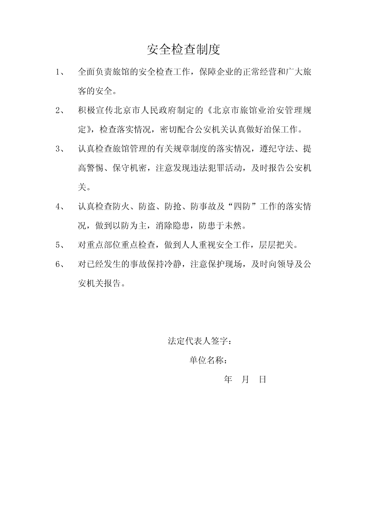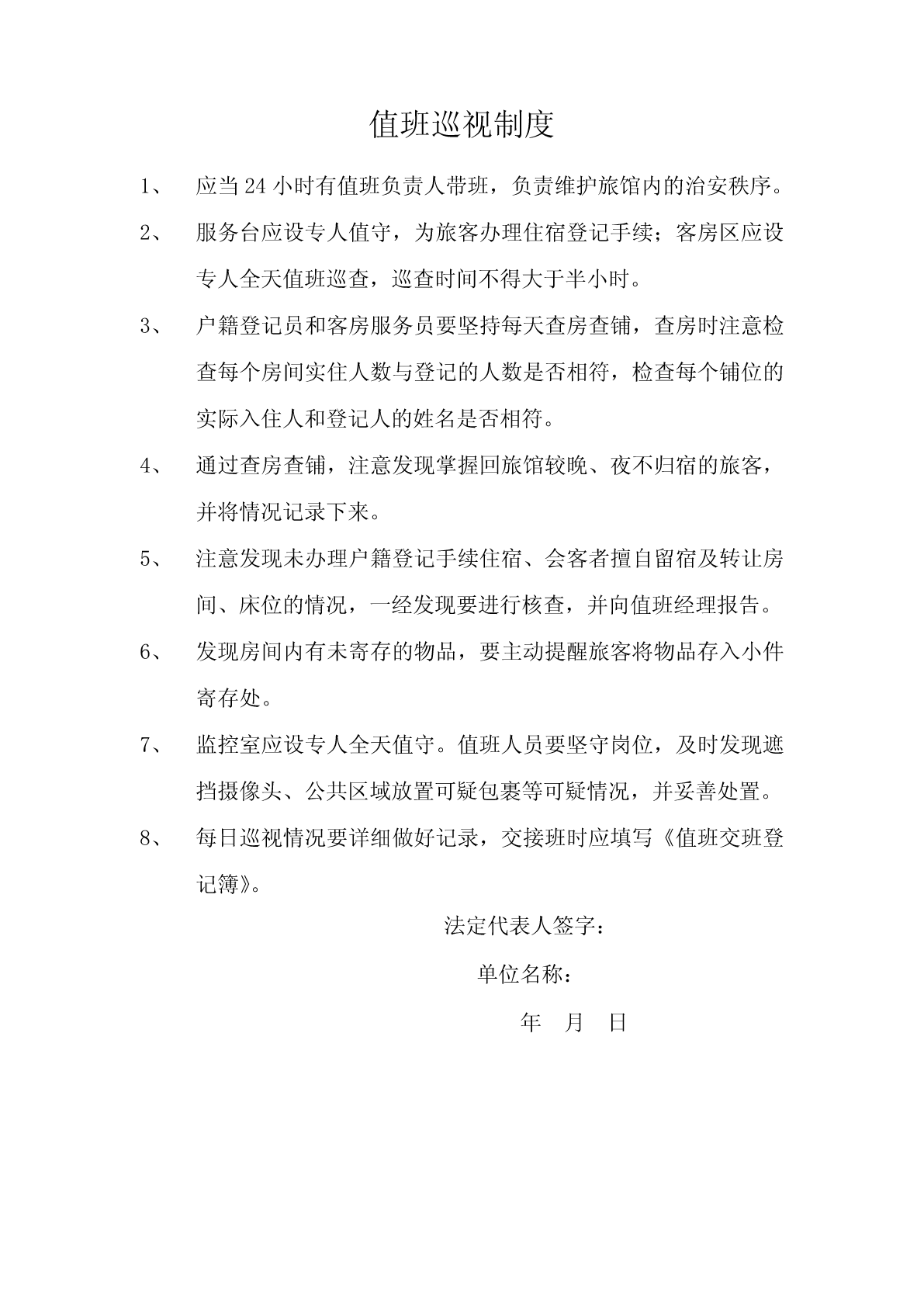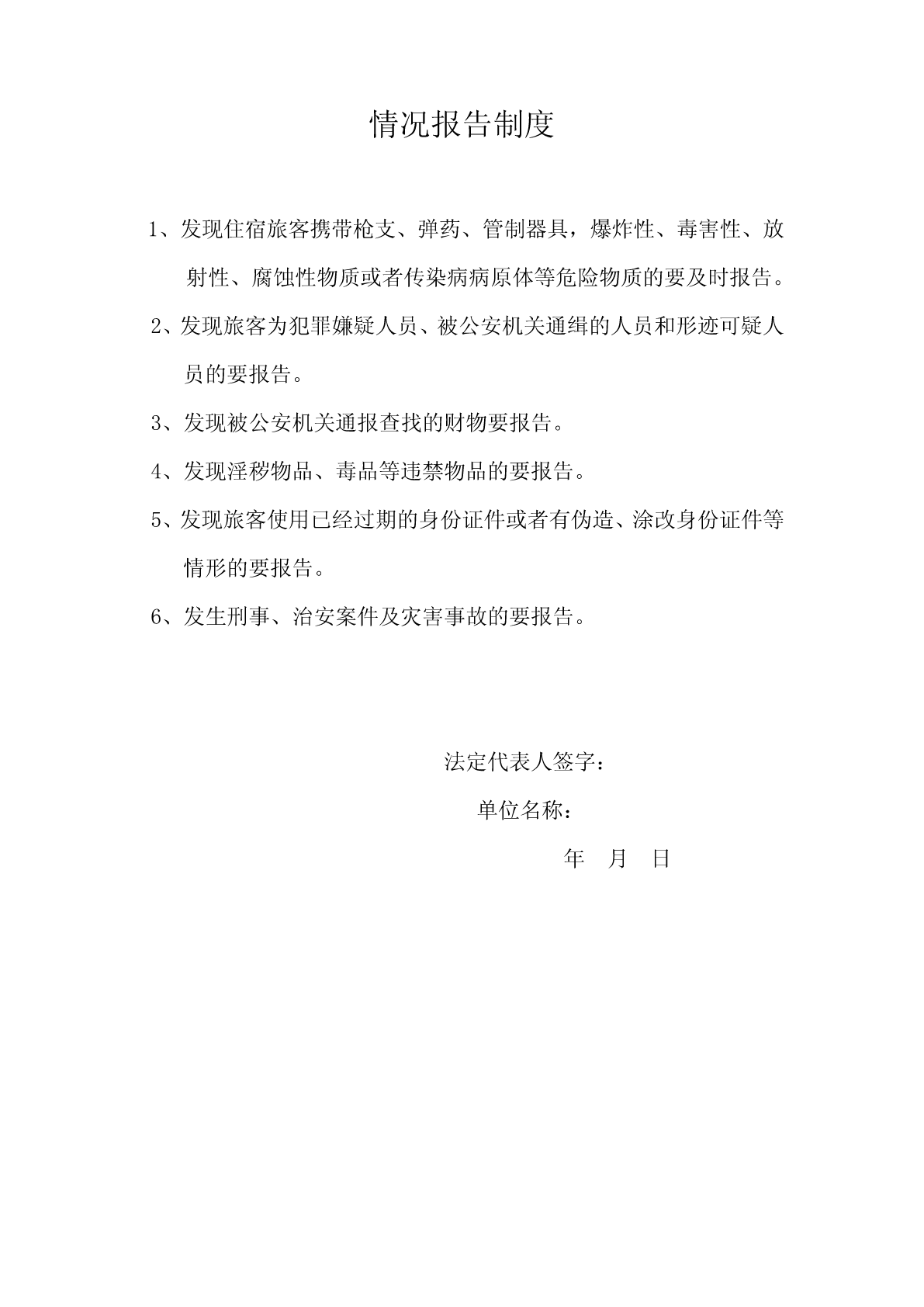 旅馆业安全管理制度验证登记制度1、前台登记员必须坚守岗位,工作时间尽职守则,严禁脱岗。2、主动向住宿旅客索要身份证件,并认真核对身份证件信息与住宿人员体貌特征是否相符。3、使用身份证鉴别仪对旅客信息进行扫描,并在社会信息采集系统及《旅客登记本》上分别进行登记。4、身份证鉴别仪识别为可疑证件的,按规定采取“先登记后报告”的应对措施妥善处置。5、严禁使用他人身份证件、非有效证件办理住宿登记。6、严禁多人住宿只登记一人;7、严禁对来店住宿人员有地区歧视,拒绝住宿现象发生。8、前台登记员使用公安网络登记要有保密意识。9、严格执行交接班制度,本班所发生的一切情况详细向下一班交接。法定代表人签字:单位名称:年月日情况报告制度1、发现住宿旅客携带枪支、弹药、管制器具,爆炸性、毒害性、放射性、腐蚀性物质或者传染病病原体等危险物质的要及时报告。2、发现旅客为犯罪嫌疑人员、被公安机关通缉的人员和形迹可疑人员的要报告。3、发现被公安机关通报查找的财物要报告。4、发现淫秽物品、毒品等违禁物品的要报告。5、发现旅客使用已经过期的身份证件或者有伪造、涂改身份证件等情形的要报告。6、发生刑事、治安案件及灾害事故的要报告。法定代表人签字:单位名称:年月日值班巡视制度1、应当24小时有值班负责人带班,负责维护旅馆内的治安秩序。2、服务台应设专人值守,为旅客办理住宿登记手续;客房区应设专人全天值班巡查,巡查时间不得大于半小时。3、户籍登记员和客房服务员要坚持每天查房查铺,查房时注意检查每个房间实住人数与登记的人数是否相符,检查每个铺位的实际入住人和登记人的姓名是否相符。4、通过查房查铺,注意发现掌握回旅馆较晚、夜不归宿的旅客,并将情况记录下来。5、注意发现未办理户籍登记手续住宿、会客者擅自留宿及转让房间、床位的情况,一经发现要进行核查,并向值班经理报告。6、发现房间内有未寄存的物品,要主动提醒旅客将物品存入小件寄存处。7、监控室应设专人全天值守。值班人员要坚守岗位,及时发现遮挡摄像头、公共区域放置可疑包裹等可疑情况,并妥善处置。8、每日巡视情况要详细做好记录,交接班时应填写《值班交班登记簿》。法定代表人签字:单位名称:年月日安全检查制度1、全面负责旅馆的安全检查工作,保障企业的正常经营和广大旅客的安全。2、积极宣传北京市人民政府制定的《北京市旅馆业治安管理规定》,检查落实情况,密切配合公安机关认真做好治保工作。3、认真检查旅馆管理的有关规章制度的落实情况,遵纪守法、提高警惕、保守机密,注意发现违法犯罪活动,及时报告公安机关。4、认真检查防火、防盗、防抢、防事故及“四防”工作的落实情况,做到以防为主,消除隐患,防患于未然。5、对重点部位重点检查,做到人人重视安全工作,层层把关。6、对已经发生的事故保持冷静,注意保护现场,及时向领导及公安机关报告。法定代表人签字:单位名称:年月日门卫会客制度1、坚守岗位,不准与任何人闲谈,不准看书、看报,不准擅离职守。2、对出入本店大门的旅客要严格验证,不能让非住宿客人随意出入。3、对来访宾客要详细填写会客登记,来访宾客离店时要检查被访者是否签字,并注意时间,不准旅客私留客人住宿,4、注意观察出入人员动态和周围情况,发现可疑情况及时汇报。5、会客登记单只限当天进入客房区使用,会客时间不得超过晚十一时。法定代表人签字:单位名称:年月日拣拾物品制度1、拣拾物品不准私自处理或侵占,要及时上交主管领导。2、对旅客遗弃的违禁品和可疑物品,要上报主管领导,由主管领导指定专人负责保管,按规定上缴公安机关。3、所有拣拾物品要规定填写在《北京市旅店业捡拾遗留物品登记簿》上。4、妥善保管旅客遗留的财务,并设法归还原主或公示招领,经招领三个月无人认领的,登记造册,送交公安机关。法定代表人签字:单位名称:年月日小件寄存制度1、在服务台设置“贵重物品请寄存”提示牌,服务员主动提示旅客寄存贵重物品。认真向旅客作好“三防”宣传,行李物品存放于小件寄存室,贵重物品及现金交业务室存放在保险柜中单独保管。2、服务员在旅客寄存物品时应认真填写、核对存(取)物手续,严格把关。旅客凭房卡或其他住宿凭证寄存物品,服务员收存物品要当面点清,填写取物凭证。客人取物时,服务员要认真查验,核对旅客姓名、房号及所存物品名称、件数、取物凭证等,防止丢失、冒领事件发生。3、严禁存入枪支弹药、易燃、易爆、剧毒、放射性物品及其它违禁品,以及带密级的文件、资料等。4、遇旅客取物凭证丢失,要及时向主管领导汇报,同时严格对旅客寄存物品进行控制。经有关部门主管领导同意领取物品时,除查验住宿证、领取人证件外,还要开列所有物品清单,经核对无误后方可领取。领取时要请取物人在清单上签名,如发现冒领,立即报告。法定代表人签字:单位名称:年月日治保会(小组)工作报告制度1、由法定代表人或经营负责人负责,建立治保会