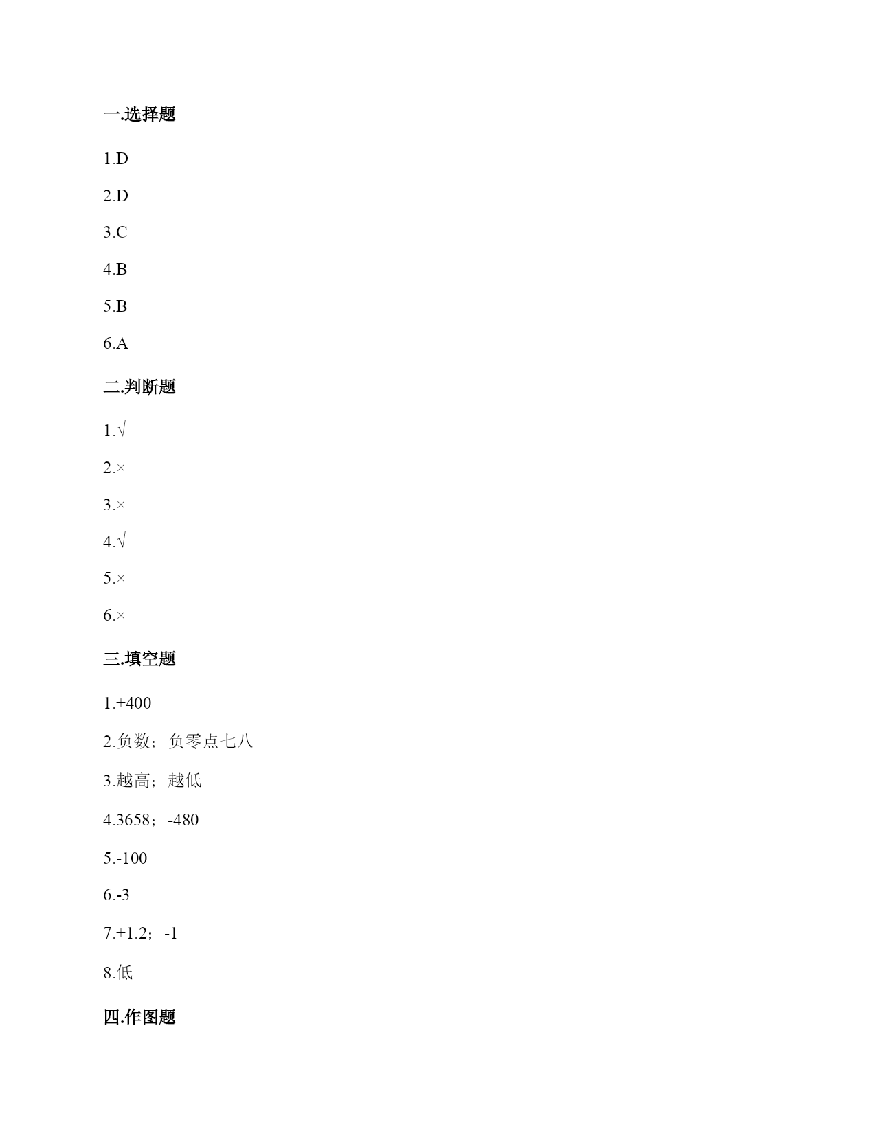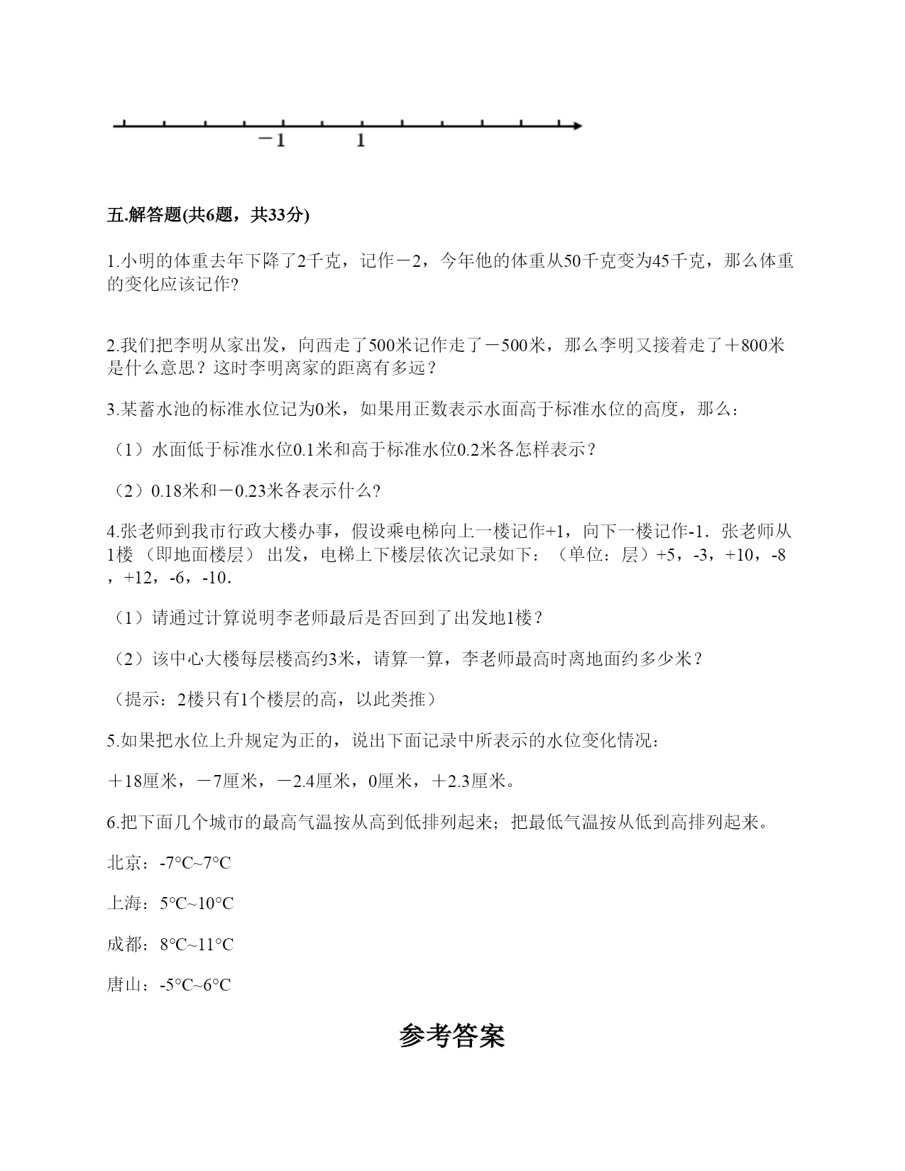 人教版六年级下册数学第一单元《负数》测试卷一.选择题(共6题,共12分)1.点A为数轴上表示-2的点,当点A沿数轴移动4个单位长度到点B时,点B所表示的数为()。A.2B.-6C.4D.2或-62.两个有理数的积是负数,和也是负数,那么这两个数()。A.都是负数B.互为相反数C.其中绝对值大的数是正数,另一个是负数D.其中绝对值大的数是负数,另一个是正数3.以亮亮家为起点,向东走为正,向西走为负。如果亮亮从家走了+80米,然后又走了-60米,此时,亮亮离家的距离是()米。A.-20B.-140C.20D.1404.如果顺时针转30°,记作+30°,那么逆时针转60°,记作()°。A.+60B.-605.如果规定前进、收入、盈利为正,那么下面错误的语句是()。A.-18米表示后退18米B.-80表示盈利80元C.-4万元表示支出4万元6.如果规定飞机上升为“+”,那么-500米表示()。A.飞机下降500米B.飞机位于海平面以下500米二.判断题(共6题,共12分)1.某城市一天的气温是﹣5℃~7℃,最高气温和最低气温相差12℃。()2.如果向东走正,向西走为负。小明从出发地先走了-110米,又走了+120米,小明这时的位置是在出发地的西边。()3.零下10℃比零下4℃高6℃。()4.我们学过的数,都能用直线上的点表示出来。()5.在数轴上,右边的数一定小于左边的数。()6.因为7>4,所以-7>-4。()三.填空题(共8题,共15分)1.支出500元记作-500元,收入400元记作()元。2.想一想,填一填。像-5,-0.78,-,-1000,…这样的数叫做________。-0.78读作________。3.红色液柱越高,温度就________,红色液柱越低,温度就________。4.通常我们规定海平面的海拔高度为0米,我国的城市拉萨,是世界上海拔最高的城市,高于海平面3658米,记作________米;死海是世界上海拔最低的海,低于海平面480米,记作________米。5.如果小红向南走80m记作+80m,那么小明向北走100m应记作________m。6.如果某大厦地上5层记作+5层,那么地下3层应记作()层。7.某石拱桥警戒水位是5m,把超过5m的部分用正数表示,把低于5m的部分用负数表示。一场暴雨后,水位达6.2m,应记作________m;第二天,水位下降到4m,应记作________m。8.比较两个零下温度的大小:谁比0℃低得更多,谁就更________。(填低或高)四.作图题(共1题,共6分)1.在直线上表示下列各数。-5,3,0,-2,0.5,五.解答题(共6题,共33分)1.小明的体重去年下降了2千克,记作-2,今年他的体重从50千克变为45千克,那么体重的变化应该记作?2.我们把李明从家出发,向西走了500米记作走了-500米,那么李明又接着走了+800米是什么意思?这时李明离家的距离有多远?3.某蓄水池的标准水位记为0米,如果用正数表示水面高于标准水位的高度,那么:(1)水面低于标准水位0.1米和高于标准水位0.2米各怎样表示?(2)0.18米和-0.23米各表示什么?4.张老师到我市行政大楼办事,假设乘电梯向上一楼记作+1,向下一楼记作-1.张老师从1楼(即地面楼层)出发,电梯上下楼层依次记录如下:(单位:层)+5,-3,+10,-8,+12,-6,-10.(1)请通过计算说明李老师最后是否回到了出发地1楼?(2)该中心大楼每层楼高约3米,请算一算,李老师最高时离地面约多少米?(提示:2楼只有1个楼层的高,以此类推)5.如果把水位上升规定为正的,说出下面记录中所表示的水位变化情况:+18厘米,-7厘米,-2.4厘米,0厘米,+2.3厘米。6.把下面几个城市的最高气温按从高到低排列起来;把最低气温按从低到高排列起来。北京:-7°C~7°C上海:5°C~10°C成都:8°C~11°C唐山:-5°C~6°C参考答案一.选择题1.D2.D3.C4.B5.B6.A二.判断题1.√2.×3.×4.√5.×6.×三.填空题1.+4002.负数;负零点七八3.越高;越低4.3658;-4805.-1006.-37.+1.2;-18.低四.作图题1.根据正负数的意义可知:五.解答题1.解:从50千克变成45千克,减轻了5千克,所以应该记作-5。2.解:800-500=300(米)答:+800米表示向东走800米,离家有300米。3.(1)水面低于标准水位0.1米,记作(-0.1米);高于标准水位0.2米,记作(+0.2米或0.2米)(2)0.18米:表示高于标准水位0.18米;-0.23米:表示低于标准水位0.23米4.(1)解:+5-3+10-8+12-6-10=0,即回到了1楼。(2)解:第一次:5楼,15米;
