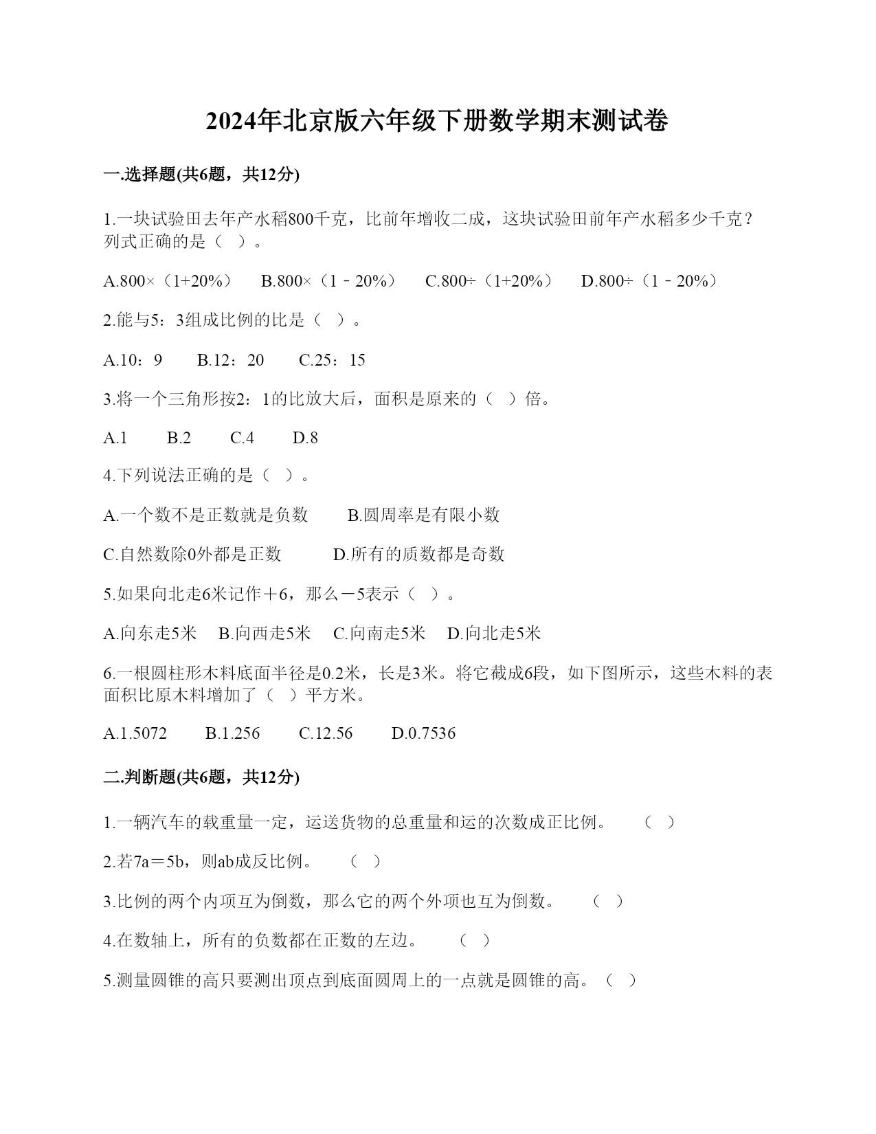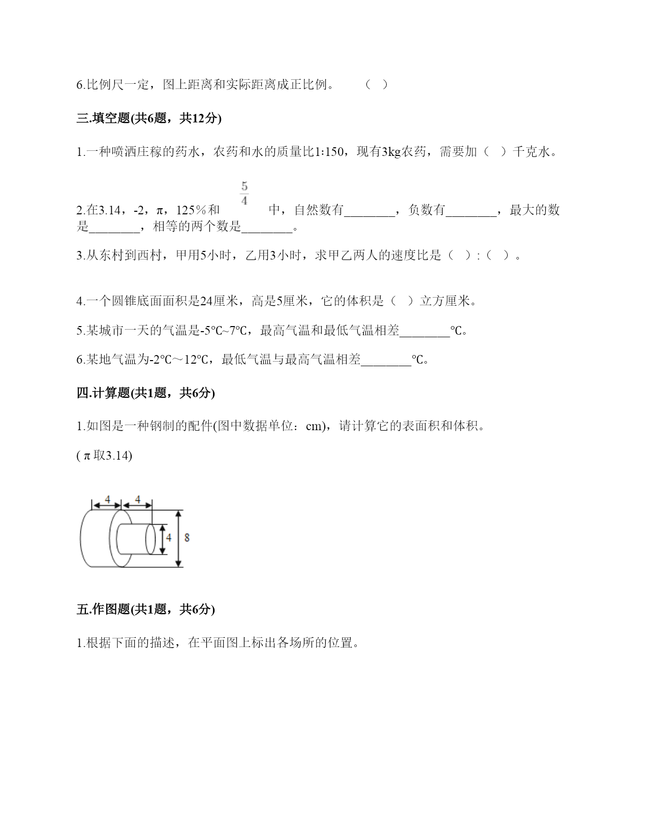 2024年北京版六年级下册数学期末测试卷一.选择题(共6题,共12分)1.一块试验田去年产水稻800千克,比前年增收二成,这块试验田前年产水稻多少千克?列式正确的是()。A.800×(1+20%)B.800×(1﹣20%)C.800÷(1+20%)D.800÷(1﹣20%)2.能与5:3组成比例的比是()。A.10:9B.12:20C.25:153.将一个三角形按2:1的比放大后,面积是原来的()倍。A.1B.2C.4D.84.下列说法正确的是()。A.一个数不是正数就是负数B.圆周率是有限小数C.自然数除0外都是正数D.所有的质数都是奇数5.如果向北走6米记作+6,那么-5表示()。A.向东走5米B.向西走5米C.向南走5米D.向北走5米6.一根圆柱形木料底面半径是0.2米,长是3米。将它截成6段,如下图所示,这些木料的表面积比原木料增加了()平方米。A.1.5072B.1.256C.12.56D.0.7536二.判断题(共6题,共12分)1.一辆汽车的载重量一定,运送货物的总重量和运的次数成正比例。()2.若7a=5b,则ab成反比例。()3.比例的两个内项互为倒数,那么它的两个外项也互为倒数。()4.在数轴上,所有的负数都在正数的左边。()5.测量圆锥的高只要测出顶点到底面圆周上的一点就是圆锥的高。()6.比例尺一定,图上距离和实际距离成正比例。()三.填空题(共6题,共12分)1.一种喷洒庄稼的药水,农药和水的质量比1∶150,现有3kg农药,需要加()千克水。2.在3.14,-2,π,125%和中,自然数有________,负数有________,最大的数是________,相等的两个数是________。3.从东村到西村,甲用5小时,乙用3小时,求甲乙两人的速度比是():()。4.一个圆锥底面面积是24厘米,高是5厘米,它的体积是()立方厘米。5.某城市一天的气温是-5℃~7℃,最高气温和最低气温相差________℃。6.某地气温为-2℃~12℃,最低气温与最高气温相差________℃。四.计算题(共1题,共6分)1.如图是一种钢制的配件(图中数据单位:cm),请计算它的表面积和体积。(π取3.14)五.作图题(共1题,共6分)1.根据下面的描述,在平面图上标出各场所的位置。①乐乐家在电视塔的北偏东30°方向1km处。②商场在电视塔的南偏西45°方向1500m处。六.解答题(共6题,共31分)1.某服装店卖一种裙子,原来每条售价为120元,是进价的150%。现在店主计划打折促销,但要保证每条裙子赚的钱不少于10元。问:折扣不能低于几折?2.一个圆锥形沙堆,底面周长25.12米,高3米。如果每立方米沙重1.7吨,这堆沙重多少吨?(得数保留整数)3.一个圆锥形沙堆,底面积是45.9m2,高1.2m.用这堆沙在12m宽的路面上铺3cm厚的路基,能铺多少米?4.新华书店打折出售图书,张老师用340元买了一套《中国四大名著》,而原价是400元。这套《中国四大名著》打了几折?5.蔬菜基地今年生产了2.4万吨蔬菜,比去年增产了二成,去年这个蔬菜基地的产量是多少万吨?6.在一个底面半径为10厘米的圆柱形杯里装满水,水里放了一个底面半径为5厘米的圆锥形铅锤,当铅锤从水中完全取出后,杯里的水面下降了0.5厘米,这个铅锤的体积是多少?参考答案一.选择题1.C2.C3.C4.C5.C6.B二.判断题1.√2.×3.√4.√5.×6.√三.填空题1.4502.0;-2;π;125%和3.3;54.405.126.14四.计算题1.解:3.14×4×4×2=100.48(cm2)3.14×8×4=100.48(cm2)3.14×4×4=50.24(cm2)配件的表面积=100.48+100.48+50.24=251.2(cm2);3.14×22×4=200.96(cm3)3.14×22×4=50.24(cm3)配件的体积=200.96+50.24=251.2(cm3)。五.作图题1.如图:六.解答题1.解:进价:120÷150%=80(元)(80+10)÷120=90÷120=75%答:折扣不能低于七五折。2.圆锥形沙堆的底面半径:25.12÷3.14÷2=4(米)圆锥形沙堆的体积:3.14×4×3×=50.24(立方米)沙堆的重量:50.24×1.7≈85(吨)答:这堆沙重约85吨。3.3厘米=0.03米×45.9×1.2÷(12×0.03)=18.36÷0.36=51(米)答:能铺51米。4.解:340÷400=85%答:这套《中国四大名著》打了八五折。5.解:2.4÷(1+20%)=2.4÷120%=2(万吨)答:去年这个蔬菜基地的产量是2万吨。6.3.14×102×0.5=157(立方厘米)答:这个铅锤的体积是157立方厘米。