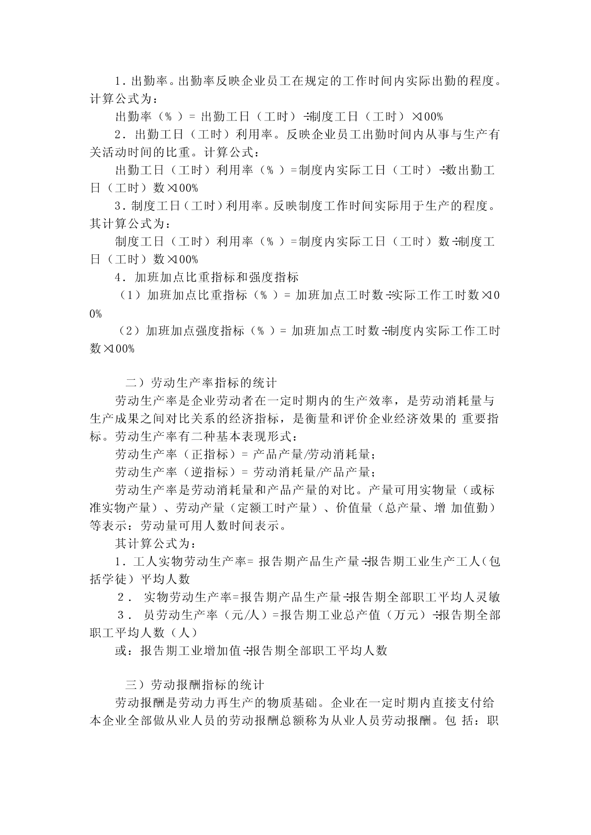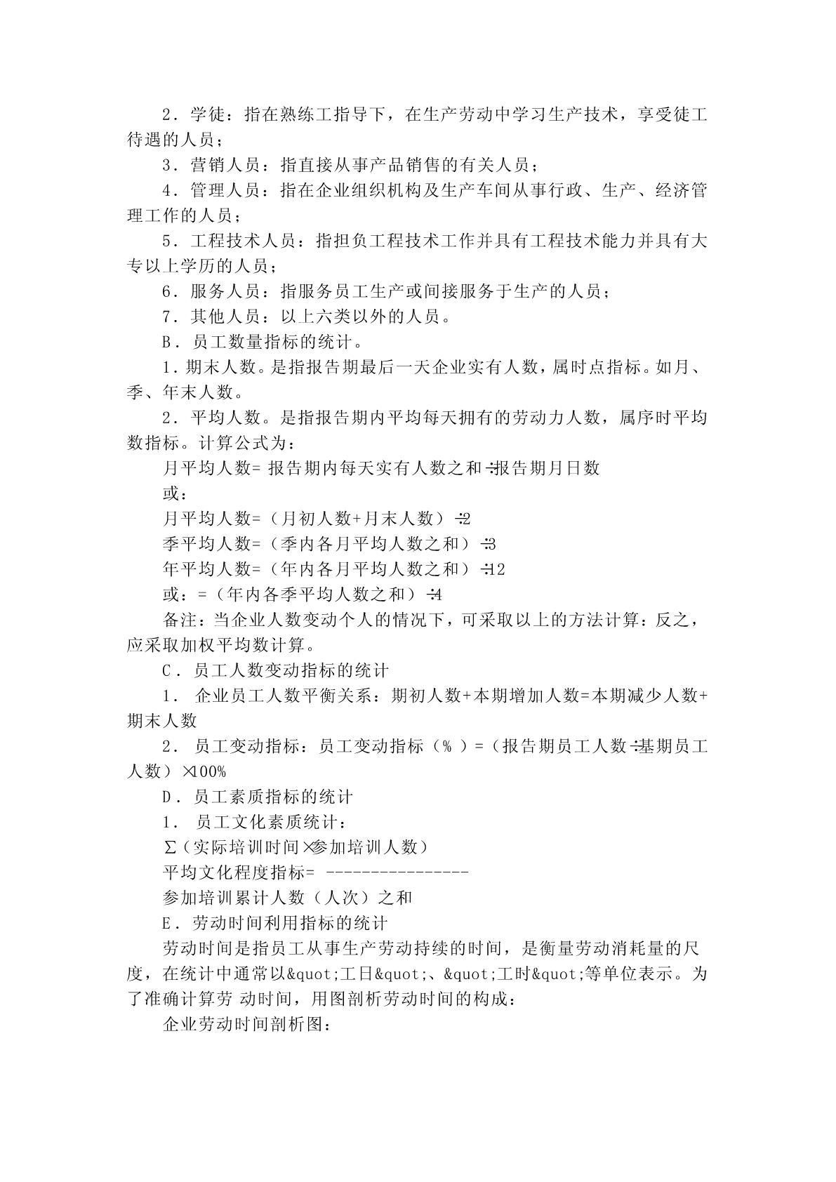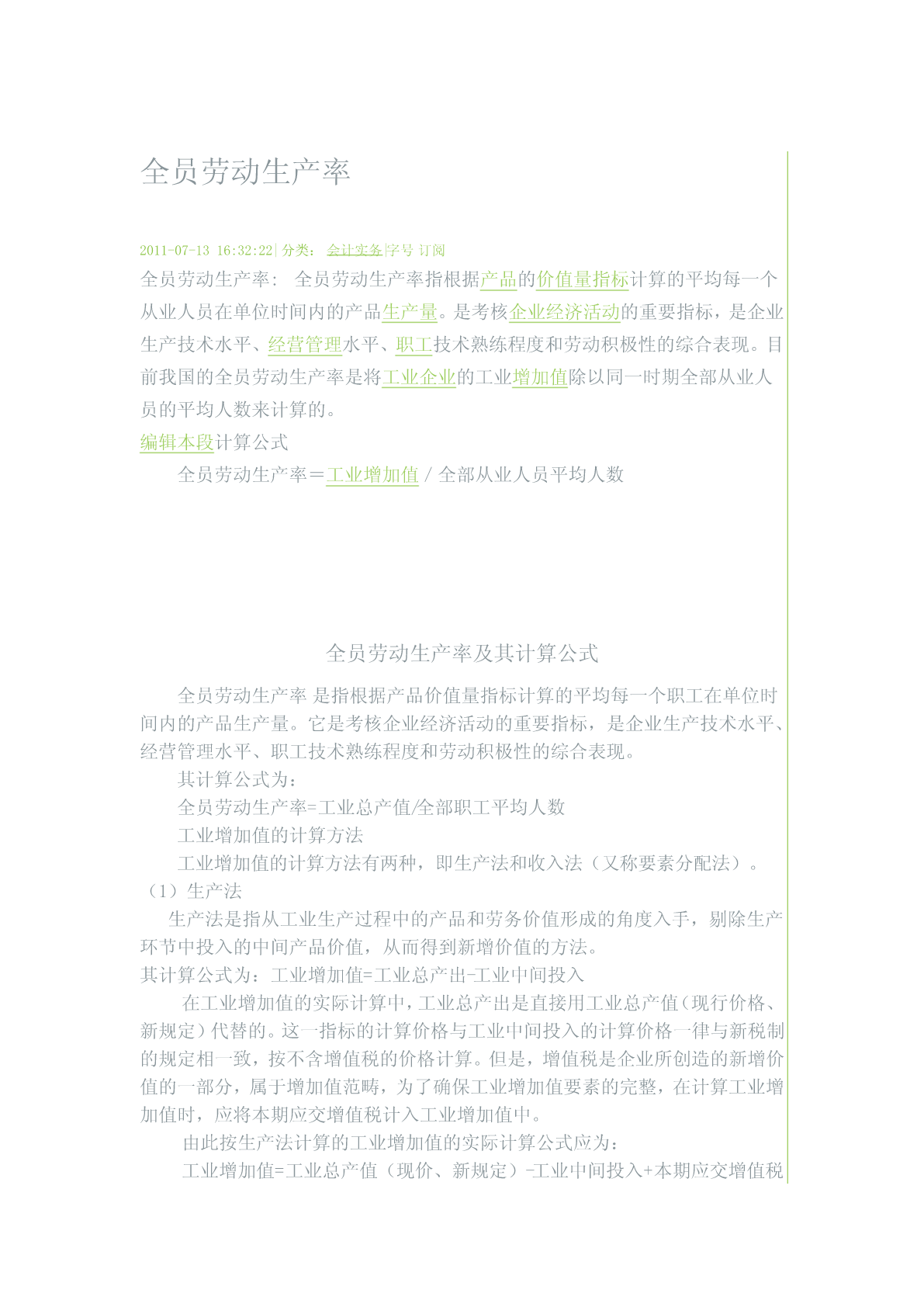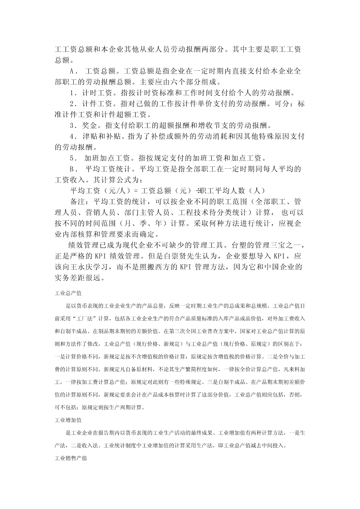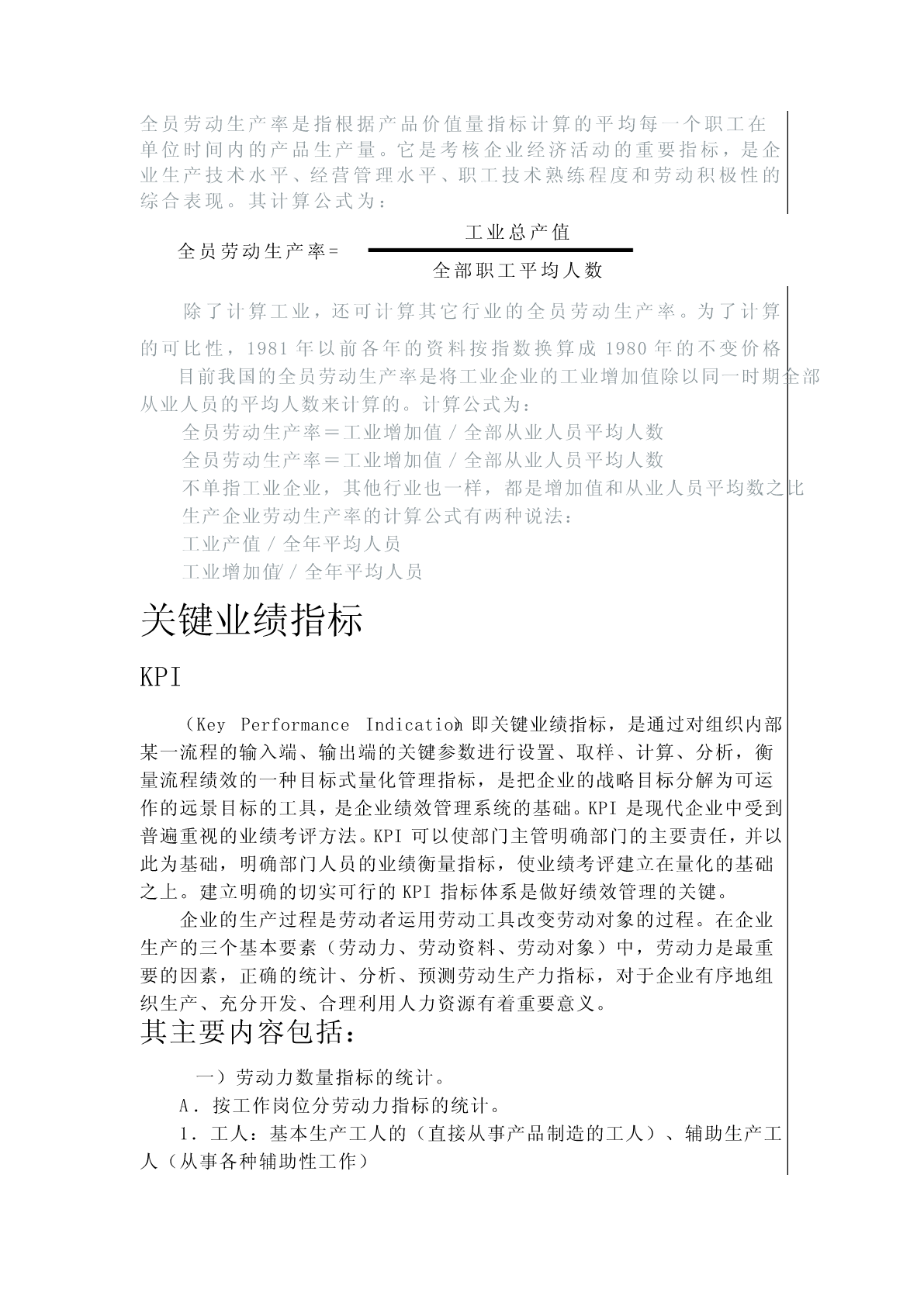 全员劳动生产率2011-07-1316:32:22|分类:会计实务|字号订阅全员劳动生产率:全员劳动生产率指根据产品的价值量指标计算的平均每一个从业人员在单位时间内的产品生产量。是考核企业经济活动的重要指标,是企业生产技术水平、经营管理水平、职工技术熟练程度和劳动积极性的综合表现。目前我国的全员劳动生产率是将工业企业的工业增加值除以同一时期全部从业人员的平均人数来计算的。编辑本段计算公式全员劳动生产率=工业增加值/全部从业人员平均人数全员劳动生产率及其计算公式全员劳动生产率是指根据产品价值量指标计算的平均每一个职工在单位时间内的产品生产量。它是考核企业经济活动的重要指标,是企业生产技术水平、经营管理水平、职工技术熟练程度和劳动积极性的综合表现。其计算公式为:全员劳动生产率=工业总产值/全部职工平均人数工业增加值的计算方法工业增加值的计算方法有两种,即生产法和收入法(又称要素分配法)。(1)生产法生产法是指从工业生产过程中的产品和劳务价值形成的角度入手,剔除生产环节中投入的中间产品价值,从而得到新增价值的方法。其计算公式为:工业增加值=工业总产出-工业中间投入在工业增加值的实际计算中,工业总产出是直接用工业总产值(现行价格、新规定)代替的。这一指标的计算价格与工业中间投入的计算价格一律与新税制的规定相一致,按不含增值税的价格计算。但是,增值税是企业所创造的新增价值的一部分,属于增加值范畴,为了确保工业增加值要素的完整,在计算工业增加值时,应将本期应交增值税计入工业增加值中。由此按生产法计算的工业增加值的实际计算公式应为:工业增加值=工业总产值(现价、新规定)-工业中间投入+本期应交增值税全员劳动生产率是指根据产品价值量指标计算的平均每一个职工在单位时间内的产品生产量。它是考核企业经济活动的重要指标,是企业生产技术水平、经营管理水平、职工技术熟练程度和劳动积极性的综合表现。其计算公式为:工业总产值全员劳动生产率=全部职工平均人数除了计算工业,还可计算其它行业的全员劳动生产率。为了计算的可比性,1981年以前各年的资料按指数换算成1980年的不变价格目前我国的全员劳动生产率是将工业企业的工业增加值除以同一时期全部从业人员的平均人数来计算的。计算公式为:全员劳动生产率=工业增加值/全部从业人员平均人数全员劳动生产率=工业增加值/全部从业人员平均人数不单指工业企业,其他行业也一样,都是增加值和从业人员平均数之比.生产企业劳动生产率的计算公式有两种说法:工业产值/全年平均人员工业增加值//全年平均人员关键业绩指标KPI(KeyPerformanceIndication)即关键业绩指标,是通过对组织内部某一流程的输入端、输出端的关键参数进行设置、取样、计算、分析,衡量流程绩效的一种目标式量化管理指标,是把企业的战略目标分解为可运作的远景目标的工具,是企业绩效管理系统的基础。KPI是现代企业中受到普遍重视的业绩考评方法。KPI可以使部门主管明确部门的主要责任,并以此为基础,明确部门人员的业绩衡量指标,使业绩考评建立在量化的基础之上。建立明确的切实可行的KPI指标体系是做好绩效管理的关键。企业的生产过程是劳动者运用劳动工具改变劳动对象的过程。在企业生产的三个基本要素(劳动力、劳动资料、劳动对象)中,劳动力是最重要的因素,正确的统计、分析、预测劳动生产力指标,对于企业有序地组织生产、充分开发、合理利用人力资源有着重要意义。其主要内容包括:一)劳动力数量指标的统计。A.按工作岗位分劳动力指标的统计。1.工人:基本生产工人的(直接从事产品制造的工人)、辅助生产工人(从事各种辅助性工作)2.学徒:指在熟练工指导下,在生产劳动中学习生产技术,享受徒工待遇的人员;3.营销人员:指直接从事产品销售的有关人员;4.管理人员:指在企业组织机构及生产车间从事行政、生产、经济管理工作的人员;5.工程技术人员:指担负工程技术工作并具有工程技术能力并具有大专以上学历的人员;6.服务人员:指服务员工生产或间接服务于生产的人员;7.其他人员:以上六类以外的人员。B.员工数量指标的统计。1.期末人数。是指报告期最后一天企业实有人数,属时点指标。如月、季、年末人数。2.平均人数。是指报告期内平均每天拥有的劳动力人数,属序时平均数指标。计算公式为:月平均人数=报告期内每天实有人数之和÷报告期月日数或:月平均人数=(月初人数+月末人数)÷2季平均人数=(季内各月平均人数之和)÷3年平均人数=(年内各月平均人数之和)÷12或:=(年内各季平均人数之和)÷4备注:当企业人数变动个人的情况下,可采取以上的方法计算:反之,应采取加权平均数计算。C.员工人数变动指标的统计1.企业员工人数平衡关系:期初人数+本期增加人数=本期减少人数+期末人数2.员工变动指标:员工变动指标(%)=(报告期员工
