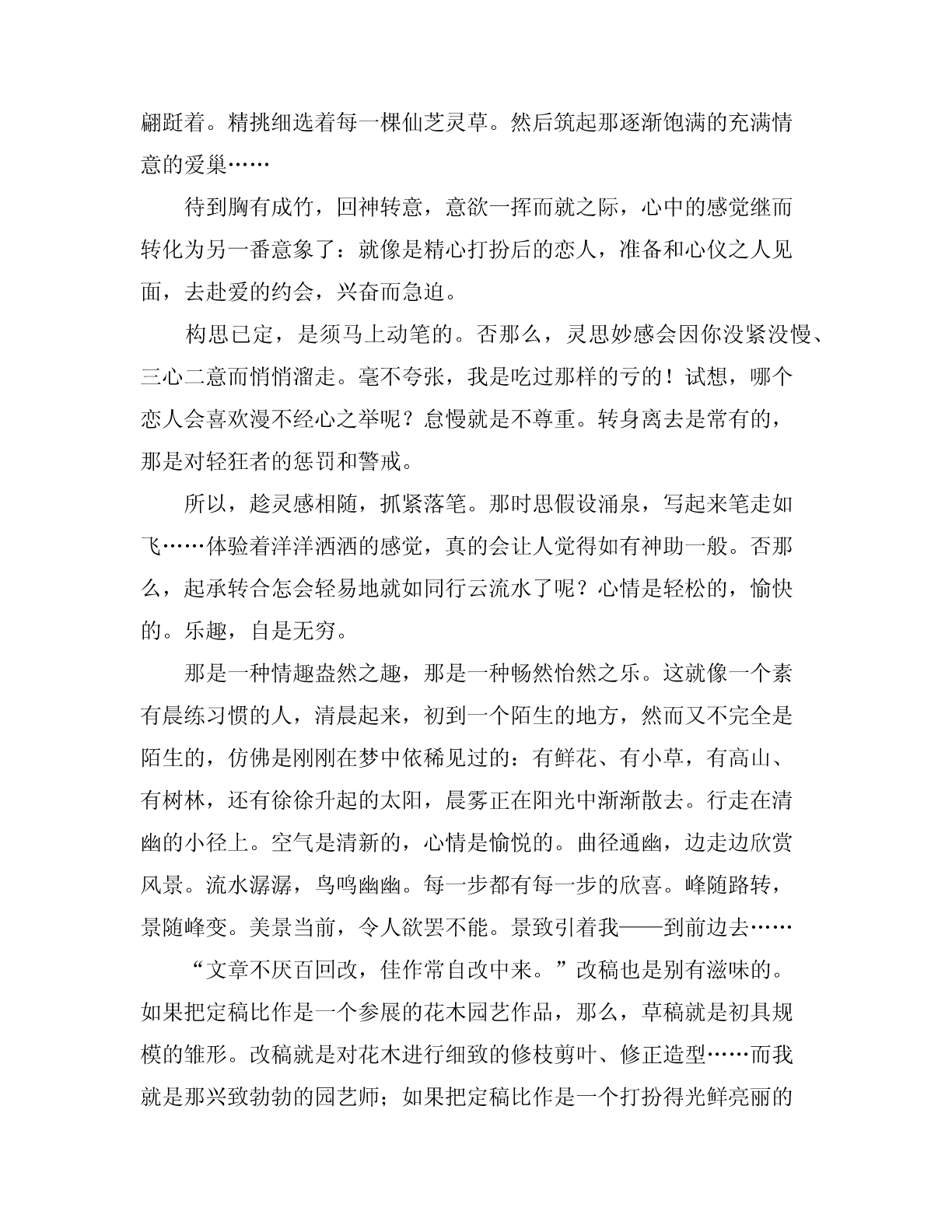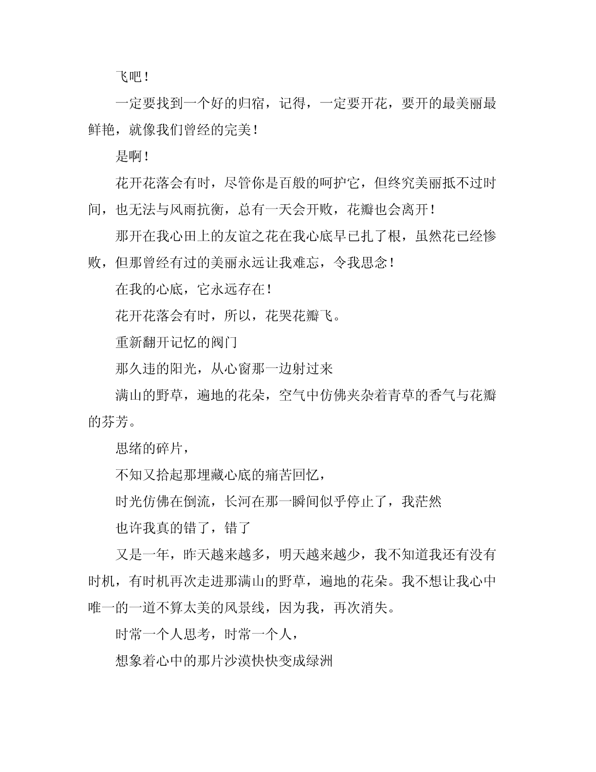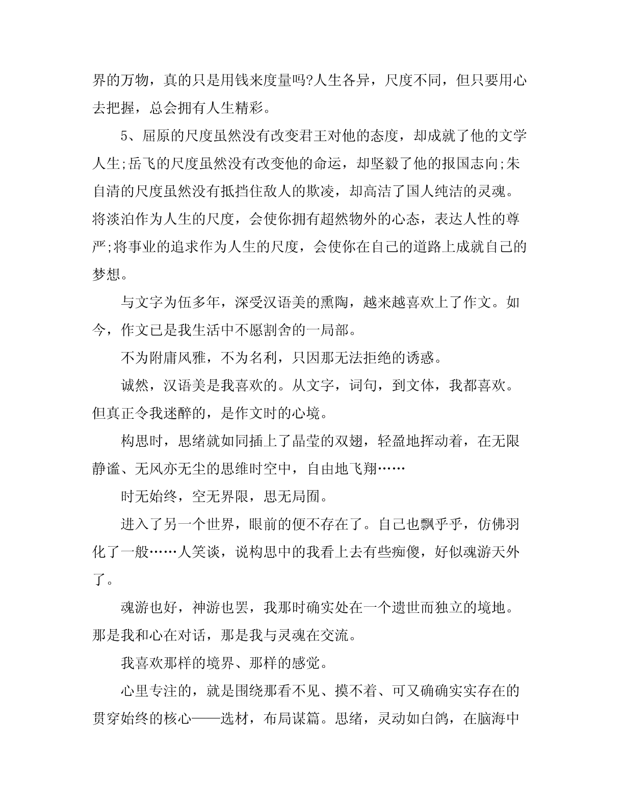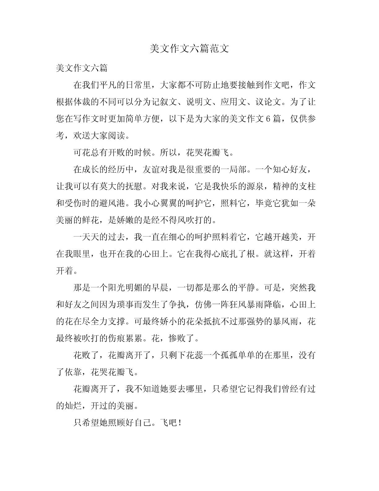 美文作文六篇范文美文作文六篇在我们平凡的日常里,大家都不可防止地要接触到作文吧,作文根据体裁的不同可以分为记叙文、说明文、应用文、议论文。为了让您在写作文时更加简单方便,以下是为大家的美文作文6篇,仅供参考,欢送大家阅读。可花总有开败的时候。所以,花哭花瓣飞。在成长的经历中,友谊对我是很重要的一局部。一个知心好友,让我可以有莫大的抚慰。对我来说,它是我快乐的源泉,精神的支柱和受伤时的避风港。我小心翼翼的呵护它,照料它,毕竟它犹如一朵美丽的鲜花,是娇嫩的是经不得风吹打的。一天天的过去,我一直在细心的呵护照料着它,它越开越美,开在我眼里,也开在我的心田上。它在我得心底扎了根。就这样,开着开着。那是一个阳光明媚的早晨,一切都是那么的平静。可是,突然我和好友之间因为琐事而发生了争执,仿佛一阵狂风暴雨降临,心田上的花在尽全力支撑。可最终娇小的花朵抵抗不过那强势的暴风雨,花最终被吹打的伤痕累累。花,惨败了。花败了,花瓣离开了,只剩下花蕊一个孤孤单单的在那里,没有了依靠,花哭花瓣飞。花瓣离开了,我不知道她要去哪里,只希望它记得我们曾经有过的灿烂,开过的美丽。只希望她照顾好自己。飞吧!飞吧!一定要找到一个好的归宿,记得,一定要开花,要开的最美丽最鲜艳,就像我们曾经的完美!是啊!花开花落会有时,尽管你是百般的呵护它,但终究美丽抵不过时间,也无法与风雨抗衡,总有一天会开败,花瓣也会离开!那开在我心田上的友谊之花在我心底早已扎了根,虽然花已经惨败,但那曾经有过的美丽永远让我难忘,令我思念!在我的心底,它永远存在!花开花落会有时,所以,花哭花瓣飞。重新翻开记忆的阀门那久违的阳光,从心窗那一边射过来满山的野草,遍地的花朵,空气中仿佛夹杂着青草的香气与花瓣的芬芳。思绪的碎片,不知又拾起那埋藏心底的痛苦回忆,时光仿佛在倒流,长河在那一瞬间似乎停止了,我茫然也许我真的错了,错了又是一年,昨天越来越多,明天越来越少,我不知道我还有没有时机,有时机再次走进那满山的野草,遍地的花朵。我不想让我心中唯一的一道不算太美的风景线,因为我,再次消失。时常一个人思考,时常一个人,想象着心中的那片沙漠快快变成绿洲1、的尺度改变了他的人生,也影响了中华民族的命运;鲁迅的尺度唤醒了无数国人昏睡的灵魂;“独立自主,自力更生”使中华民族屹立于世界民族之林而岿然不动;“和平”使得中国在世界上受到的赞誉不断增多。智者学派认为“人是万物的尺度”,人性的光芒由此大放异彩;孔子说“克己复礼”,“礼”便成为万事的尺度。中国的封建社会因此等级森严,道德充满。可见,尺度小那么改变一个人、一群人,大那么改变一个社会、一个时代。2、有了尺度,办事情才会有准那么。不可否认,世界上有许多让我们叹为观止的事物:喜马拉雅山脉、格陵兰岛、里海……但即使是地球上最华美的修饰,也必须在尺度面前有所收敛。这就是尺度的力量所在,它让世界上的一切事物向它屈服,没有能够击败它,它让人类无法征服整个世界。一幢高楼,再高也不可能超出地球去;一列火车,再长也不可能长过赤道;一架飞机,飞得再快也不可能超过光速。限制它们的,就是尺度。3、也许普通人对人生尺度的把握和追求,泄露的只是人性的一点光色,那么伟大的人对人生尺度的追求,那么如那灿烂的梨花,开满了我们头上的蓝色星空。无论你之前做过什么,现在,人生的尺度在于自身。尺度正确,我们可以接近成功,尺度错误,我们将面临失败。请树立一个正确的人生尺度吧,因为它们是通向美好的航标和指南针啊。4、世界的每一样事物都有衡量它的尺度,哲学上称它为价值,是指一事物对主体的积极意义,即一事物具有的能够满足主体需要的属性和功能。通常来说,价格在某一方面很好的表达了这一尺度。但世界的万物,真的只是用钱来度量吗?人生各异,尺度不同,但只要用心去把握,总会拥有人生精彩。5、屈原的尺度虽然没有改变君王对他的态度,却成就了他的文学人生;岳飞的尺度虽然没有改变他的命运,却坚毅了他的报国志向;朱自清的尺度虽然没有抵挡住敌人的欺凌,却高洁了国人纯洁的灵魂。将淡泊作为人生的尺度,会使你拥有超然物外的心态,表达人性的尊严;将事业的追求作为人生的尺度,会使你在自己的道路上成就自己的梦想。与文字为伍多年,深受汉语美的熏陶,越来越喜欢上了作文。如今,作文已是我生活中不愿割舍的一局部。不为附庸风雅,不为名利,只因那无法拒绝的诱惑。诚然,汉语美是我喜欢的。从文字,词句,到文体,我都喜欢。但真正令我迷醉的,是作文时的心境。构思时,思绪就如同插上了晶莹的双翅,轻盈地挥动着,在无限静谧、无风亦无尘的思维时空中,自由地飞翔……时无始终,空无界限,思无局囿。进入了另一个世界,眼前的便不存在了。自己也飘乎乎,仿佛羽化了一般……人笑谈,说构思中的我看上去有些痴傻,好似魂游天外了。魂游也好,神游也罢,我那时确实处在一个遗世而独立的境地。那是我和心在对