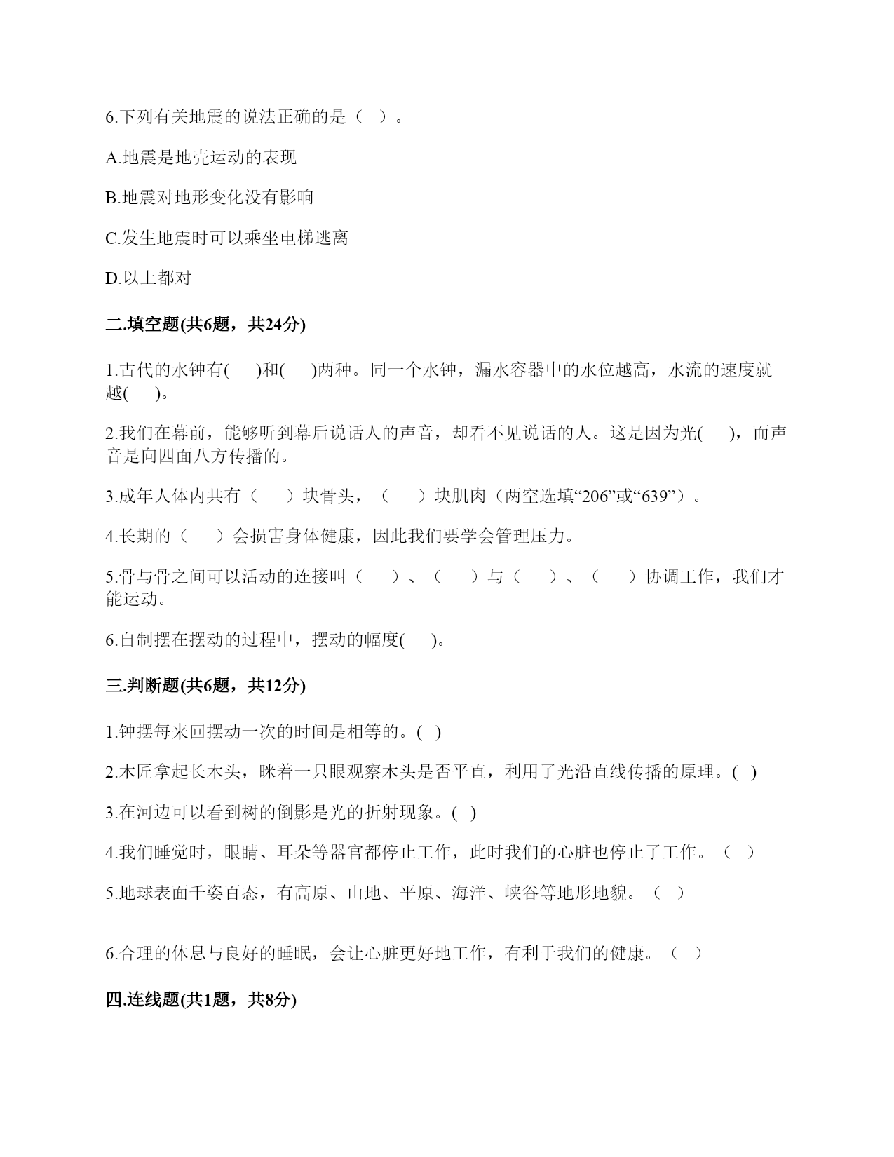 教科版五年级上册科学期末测试卷一.选择题(共6题,共12分)1.关于计量时间,下列说法错误的是()。A.按照日出而作、日落而息形成的早期计时单位是天B.日晷是利用阳光下物体影子方位变化的规律发明的C.因为水流的速度不稳定,所以不能用水来计时D.古人利用日影长度变化发明的天文仪器是圭表2.小明想要制作一个潜望镜,他为自己准备了剪刀、胶带纸、牙膏盒,以及2面()。A.凹面镜B.平面镜C.凸面镜3.奶奶用放大镜看报纸时,光的传播路径为()。A.人眼→放大镜→报纸B.报纸→放大镜→人眼C.放大镜→报纸→人眼4.大风或洪水的力量可以把破碎后形成的细小的沙、土搬运到远方,只留下大大小小的砾石,这便形成了()。A.沙漠B.戈壁滩5.()是人体的控制中心,包括左右两个大脑半球,脑的不同区域控制着我们身体的各个部分。A.小脑B.大脑C.脊髓6.下列有关地震的说法正确的是()。A.地震是地壳运动的表现B.地震对地形变化没有影响C.发生地震时可以乘坐电梯逃离D.以上都对二.填空题(共6题,共24分)1.古代的水钟有()和()两种。同一个水钟,漏水容器中的水位越高,水流的速度就越()。2.我们在幕前,能够听到幕后说话人的声音,却看不见说话的人。这是因为光(),而声音是向四面八方传播的。3.成年人体内共有()块骨头,()块肌肉(两空选填“206”或“639”)。4.长期的()会损害身体健康,因此我们要学会管理压力。5.骨与骨之间可以活动的连接叫()、()与()、()协调工作,我们才能运动。6.自制摆在摆动的过程中,摆动的幅度()。三.判断题(共6题,共12分)1.钟摆每来回摆动一次的时间是相等的。()2.木匠拿起长木头,眯着一只眼观察木头是否平直,利用了光沿直线传播的原理。()3.在河边可以看到树的倒影是光的折射现象。()4.我们睡觉时,眼睛、耳朵等器官都停止工作,此时我们的心脏也停止了工作。()5.地球表面千姿百态,有高原、山地、平原、海洋、峡谷等地形地貌。()6.合理的休息与良好的睡眠,会让心脏更好地工作,有利于我们的健康。()四.连线题(共1题,共8分)1.将下列钟表与其计时原理用线连接起来。五.简答题(共2题,共8分)1.生活中哪些仪器利用了光的反射原理?至少举出两例说明。2.彩虹是怎样形成的?六.综合题(共4题,共52分)1.探索:光照射玻璃、纸和书玻璃光()穿过玻璃,()看清玻璃前方物体的细节。(均填“能”或“不能”)纸光()穿过这张纸,()看清这张纸前方物体的细节。(均填“能”或“不能”)书光()穿过这本书,()看到这本书前方的物体。(均填“能”或“不能”)2.火山喷发模拟实验。在罐头盒内放入一些土豆泥,堆成小山的形状,并在山的顶部向下挖一个小洞。向小洞内倒入一定量的番茄酱(番茄酱适当的稀释一下),然后用一层薄薄的土豆泥封住洞口。将罐头盒放在铁架台上,用酒精灯加热,观察火山喷发现象。1.模拟“火山”的是____________,模拟“岩浆”的是____________。2.用酒精灯加热模拟的是()。A.增加地球外部压力B.增加地球内部压力C.使地壳快速运动3.火山喷发会给人类带来严重的灾难,但落在火山周围的火山灰能()。A.加速火山喷发B.提高土壤肥力C.减慢火山喷发4.火山地热是一种____________能源。5.火山喷发会造成()现象。A.加速平原地形的形成B.滑坡、山崩、泥石流、地震C.减慢平原地形的形成3.下面是关于高原、平原、山地、盆地四种地貌特征的描述,结合我们所学知识和生活经验,回答相关问题。A.海拔较高,地形开阔,周边以明显徒坡为界。B.四周地势较高,中间低平。C.地貌宽广平坦、起伏很小。D.蜿蜒起伏,层峦叠嶂。(1)关于高原.我知道的典型代表是________,高原的地貌特征是()。(填序号)(2)关于平原,我知道的典型代表是________,平原的地貌特征是()。(填序号)(3)关于山地,我知道的典型代表是________,山地的地貌特征是()。(填序号)(4)关于盆地,我知道的典型代表是________,盆地的地貌特征是()。(填序号)4.为了验证“温度对岩石有破坏作用”这个猜想,小明做了下面的实验,请你帮他填完成实验过程。实验器材:酒精灯、_______、_________、水、小石块、护目镜实验步骤:(1)用_________夹住小石块在酒精灯上加热;(2)把加热后的石块_______放入冷水;(3)重复步骤(1)(2)几次;。(4)仔细观察实验现象并记录;(5)整理器材。实验现象:_____________。实验结论:温度的______变化能使岩石风化。参考答案一.选择题1.C2.B3.B4.B5.B6.A二.填空题1.受水型;泄水型;快2.沿直线传播3.206;6394.压力5.关节;神经系统;骨;关节6.