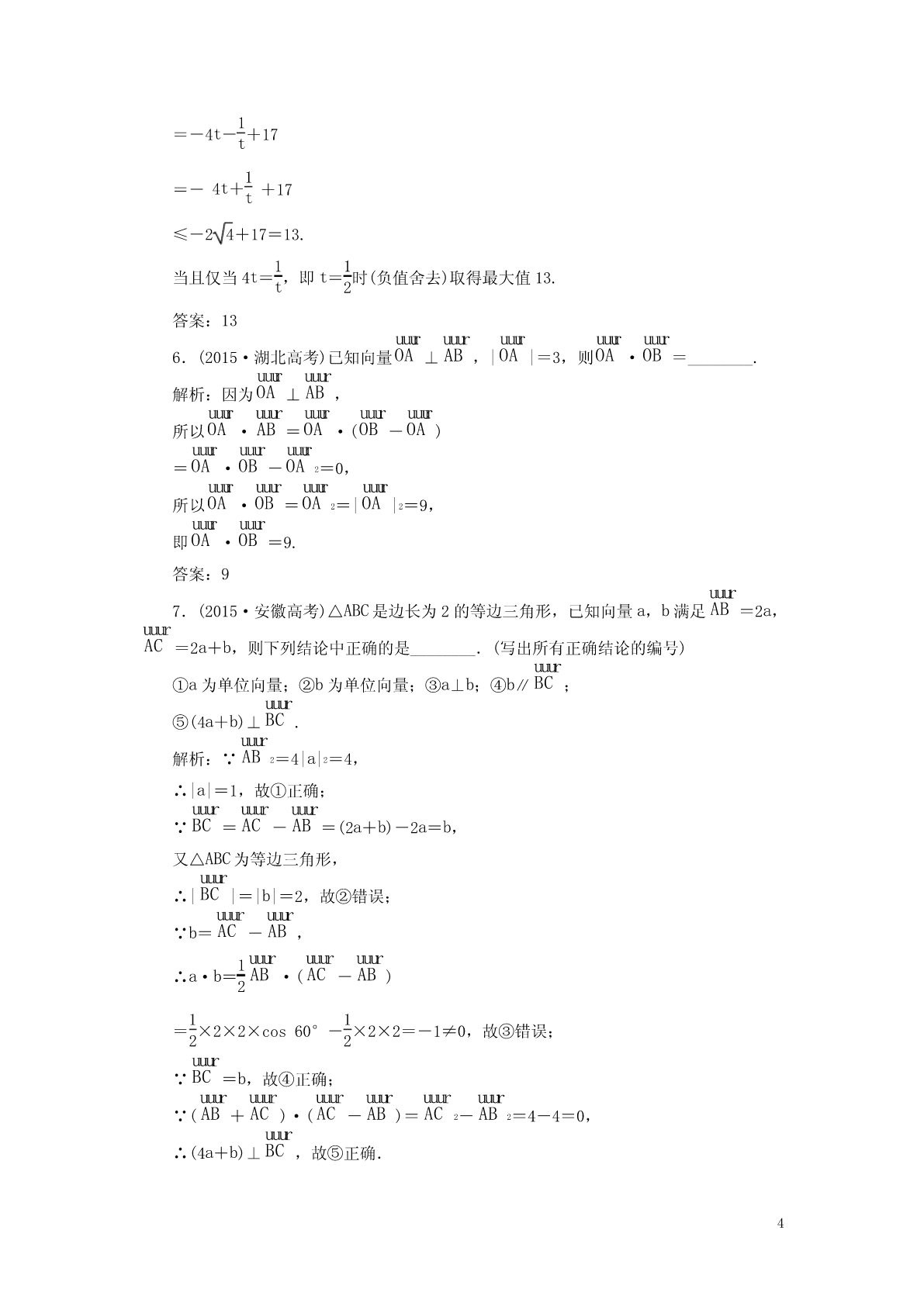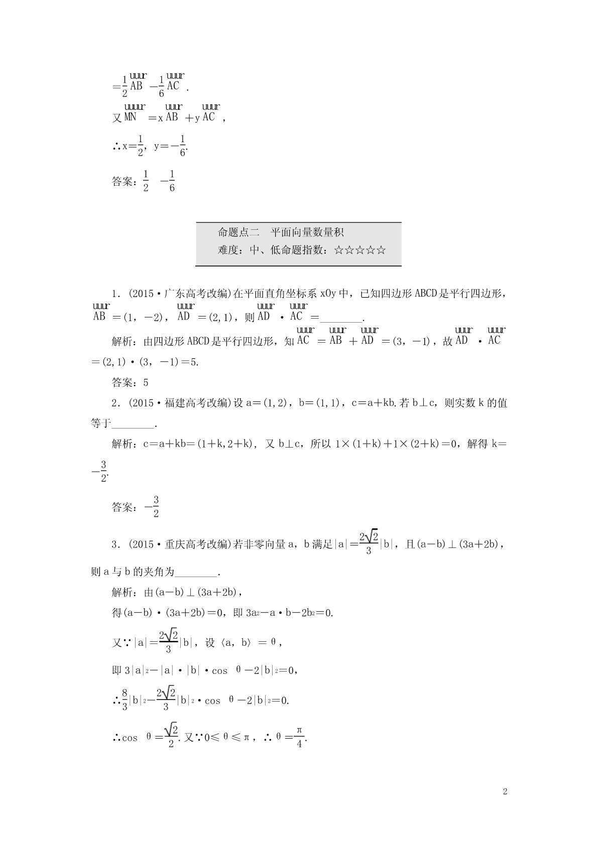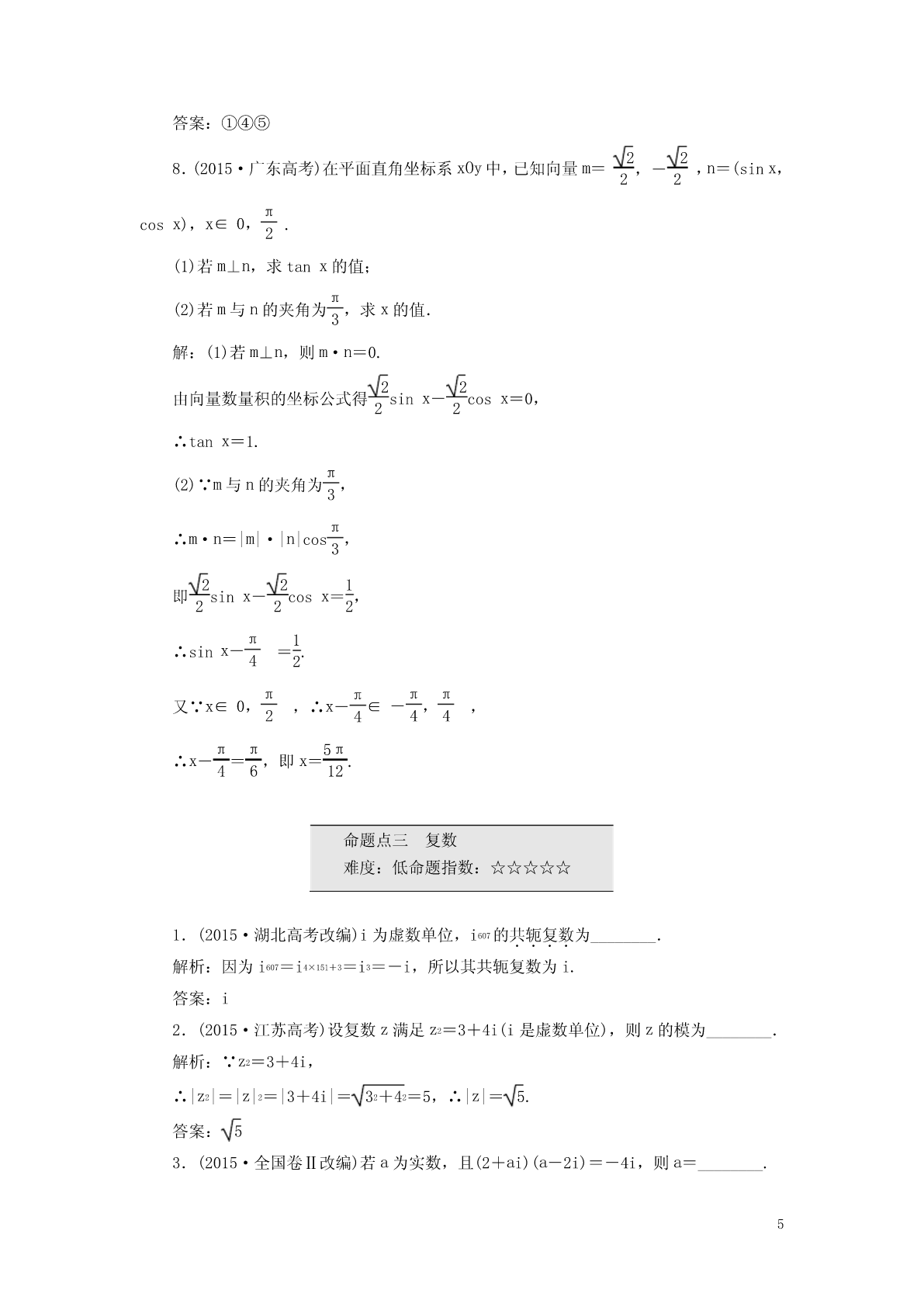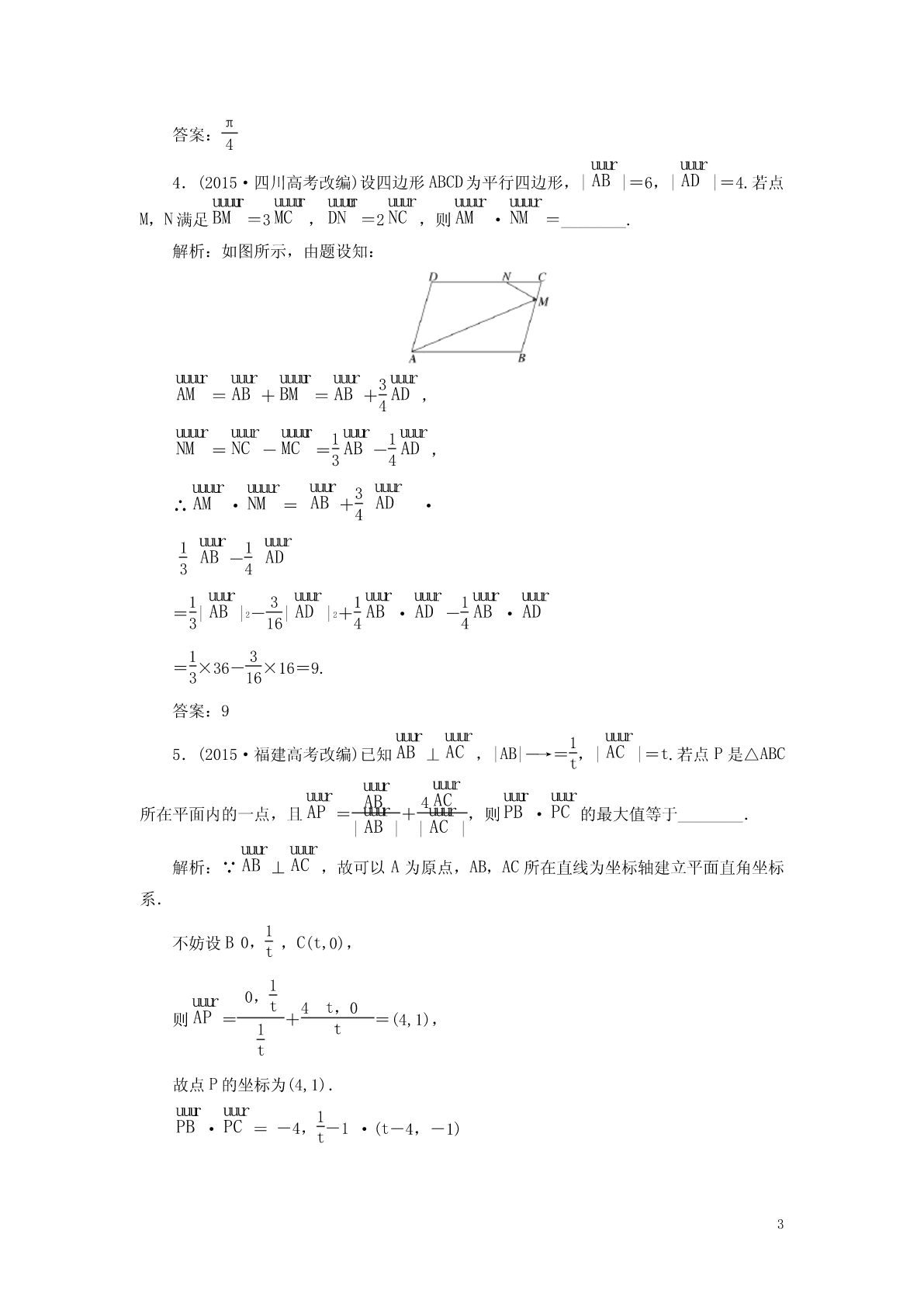 板块命题点专练(七)平面向量与复数1.(2015·四川高考改编)设向量a=(2,4)与向量b=(x,6)共线,则实数x=________.解析:∵a∥b,∴2×6-4x=0,解得x=3.答案:3uuuruuur2.(2015·全国卷Ⅰ改编)已知点A(0,1),B(3,2),向量AC=(-4,-3),则向量BC=________.uuur解析:AB=(3,2)-(0,1)=(3,1),uuuruuuruuurBC=AC-AB=(-4,-3)-(3,1)=(-7,-4).答案:(-7,-4)3.(2015·江苏高考)已知向量a=(2,1),b=(1,-2),若ma+nb=(9,-8)(m,n∈R),则m-n的值为________.解析:∵ma+nb=(2m+n,m-2n)=(9,-8),2m+n=9,m=2,∴∴m-2n=-8,n=5,∴m-n=2-5=-3.答案:-34.(2015·全国卷Ⅱ)设向量a,b不平行,向量λa+b与a+2b平行,则实数λ=________.解析:∵λa+b与a+2b平行,∴λa+b=t(a+2b),1λ=,λ=t,2即λa+b=ta+2tb,∴解得1=2t,1t=.21答案:2uuuuruuuuruuuruuuruuuur5.(2015·北京高考)在△ABC中,点M,N满足AM=2MC,BN=NC.若MN=uuuruuurxAB+yAC,则x=__________;y=__________.uuuuruuuuruuuur2uuur解析:∵AM=2MC,∴AM=AC.3uuuruuuruuuur1uuuruuur∵BN=NC,∴AN=(AB+AC),2uuuuruuuuruuuur1uuuruuur2uuur∴MN=AN-AM=(AB+AC)-AC2311uuur1uuur=AB-AC.26uuuuruuuruuur又MN=xAB+yAC,11∴x=,y=-.2611答案:-26命题点二平面向量数量积难度:中、低命题指数:☆☆☆☆☆1.(2015·广东高考改编)在平面直角坐标系xOy中,已知四边形ABCD是平行四边形,uuuruuuruuuruuurAB=(1,-2),AD=(2,1),则AD·AC=________.uuuruuuruuuruuuruuur解析:由四边形ABCD是平行四边形,知AC=AB+AD=(3,-1),故AD·AC=(2,1)·(3,-1)=5.答案:52.(2015·福建高考改编)设a=(1,2),b=(1,1),c=a+kb.若b⊥c,则实数k的值等于________.解析:c=a+kb=(1+k,2+k),又b⊥c,所以1×(1+k)+1×(2+k)=0,解得k=3-.23答案:-2223.(2015·重庆高考改编)若非零向量a,b满足|a|=|b|,且(a-b)⊥(3a+2b),3则a与b的夹角为________.解析:由(a-b)⊥(3a+2b),得(a-b)·(3a+2b)=0,即3a2-a·b-2b2=0.22又∵|a|=|b|,设〈a,b〉=θ,3即3|a|2-|a|·|b|·cosθ-2|b|2=0,822∴|b|2-|b|2·cosθ-2|b|2=0.332π∴cosθ=.又∵0≤θ≤π,∴θ=.242π答案:4uuuruuur4.(2015·四川高考改编)设四边形ABCD为平行四边形,|AB|=6,|AD|=4.若点uuuuruuuuruuuuruuuruuuuruuuurM,N满足BM=3MC,DN=2NC,则AM·NM=________.解析:如图所示,由题设知:uuuuruuuruuuuruuur3uuurAM=AB+BM=AB+AD,4uuuuruuuruuuur1uuur1uuurNM=NC-MC=AB-AD,34uuuuruuuuruuur3uuur∴AM·NM=AB+AD·41uuur1uuurAB-AD341uuur3uuur1uuuruuur1uuuruuur=|AB|2-|AD|2+AB·AD-AB·AD3164413=×36-×16=9.316答案:9uuuruuur1uuurABACABACtPABC5.(2015·福建高考改编)已知⊥,||―→=t,||=.若点是△uuuruuuruuurAB4ACuuuruuur所在平面内的一点,且AP=uuur+uuur,则PB·PC的最大值等于________.|AB||AC|uuuruuur解析:∵AB⊥AC,故可以A为原点,AB,AC所在直线为坐标轴建立平面直角坐标系.1B0,Ct,不妨设t,(0),10,uuurt4t,0则AP=+=(4,1),1tt故点P的坐标为(4,1).uuuruuur1P