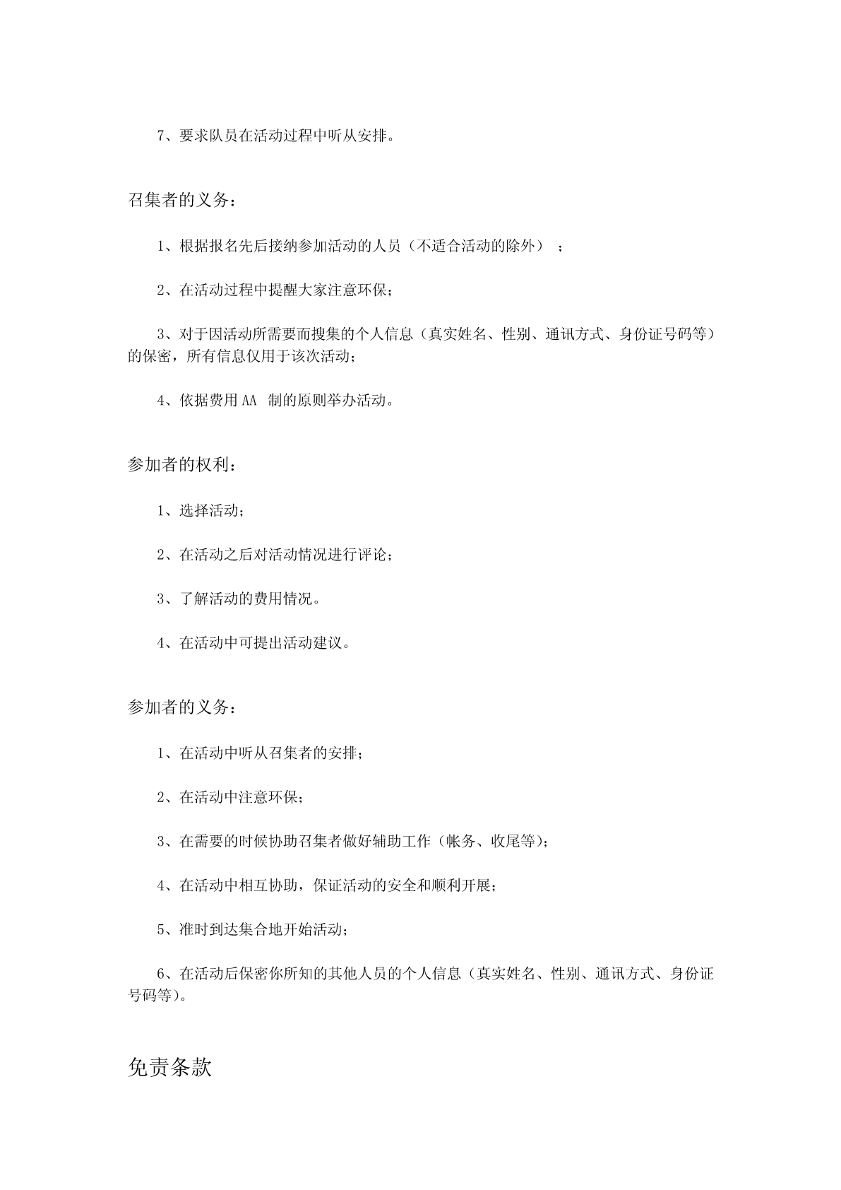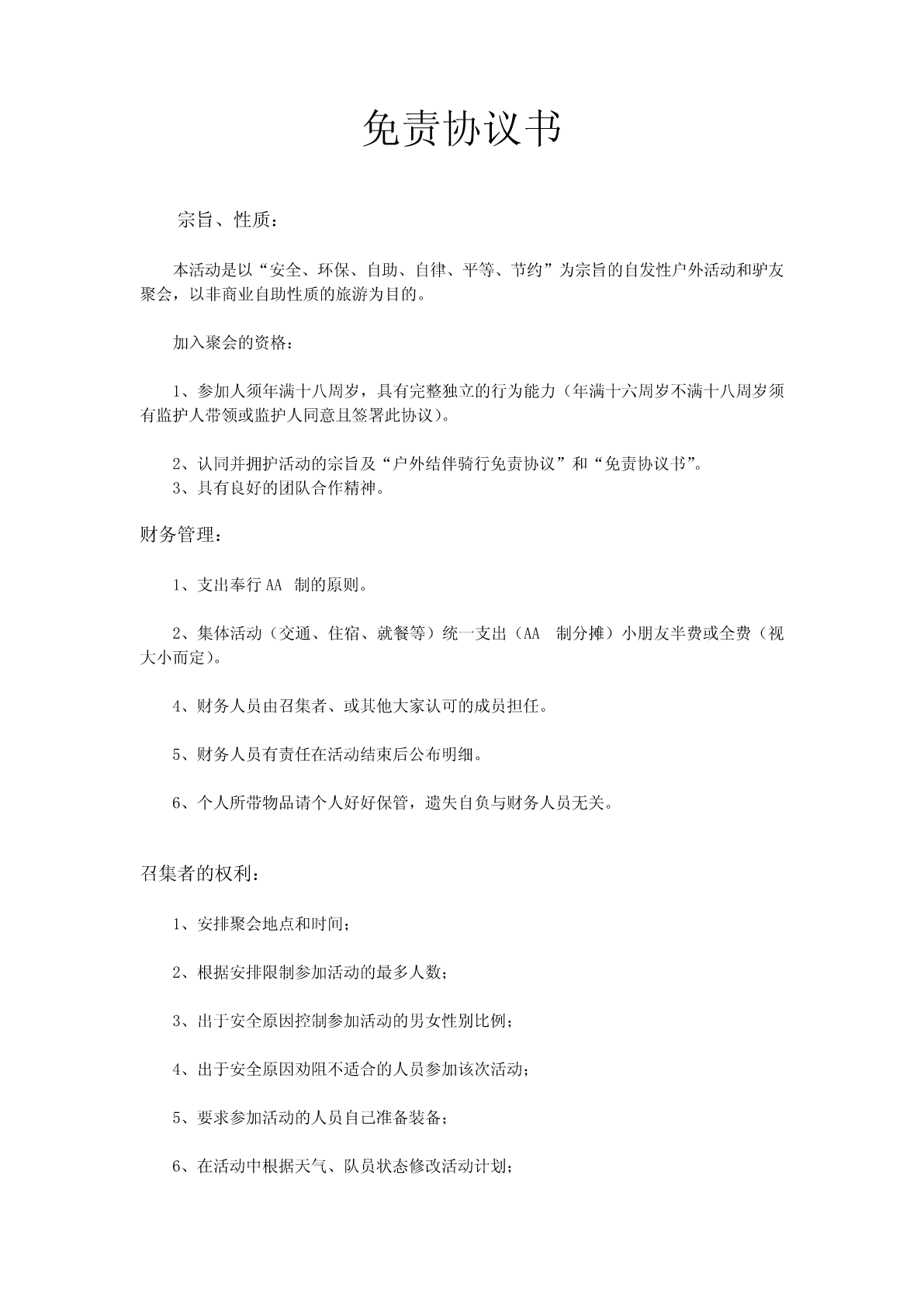 免责协议书宗旨、性质:本活动是以“安全、环保、自助、自律、平等、节约”为宗旨的自发性户外活动和驴友聚会,以非商业自助性质的旅游为目的。加入聚会的资格:1、参加人须年满十八周岁,具有完整独立的行为能力(年满十六周岁不满十八周岁须有监护人带领或监护人同意且签署此协议)。2、认同并拥护活动的宗旨及“户外结伴骑行免责协议”和“免责协议书”。3、具有良好的团队合作精神。财务管理:1、支出奉行AA制的原则。2、集体活动(交通、住宿、就餐等)统一支出(AA制分摊)小朋友半费或全费(视大小而定)。4、财务人员由召集者、或其他大家认可的成员担任。5、财务人员有责任在活动结束后公布明细。6、个人所带物品请个人好好保管,遗失自负与财务人员无关。召集者的权利:1、安排聚会地点和时间;2、根据安排限制参加活动的最多人数;3、出于安全原因控制参加活动的男女性别比例;4、出于安全原因劝阻不适合的人员参加该次活动;5、要求参加活动的人员自己准备装备;6、在活动中根据天气、队员状态修改活动计划;7、要求队员在活动过程中听从安排。召集者的义务:1、根据报名先后接纳参加活动的人员(不适合活动的除外);2、在活动过程中提醒大家注意环保;3、对于因活动所需要而搜集的个人信息(真实姓名、性别、通讯方式、身份证号码等)的保密,所有信息仅用于该次活动;4、依据费用AA制的原则举办活动。参加者的权利:1、选择活动;2、在活动之后对活动情况进行评论;3、了解活动的费用情况。4、在活动中可提出活动建议。参加者的义务:1、在活动中听从召集者的安排;2、在活动中注意环保;3、在需要的时候协助召集者做好辅助工作(帐务、收尾等);4、在活动中相互协助,保证活动的安全和顺利开展;5、准时到达集合地开始活动;6、在活动后保密你所知的其他人员的个人信息(真实姓名、性别、通讯方式、身份证号码等)。免责条款