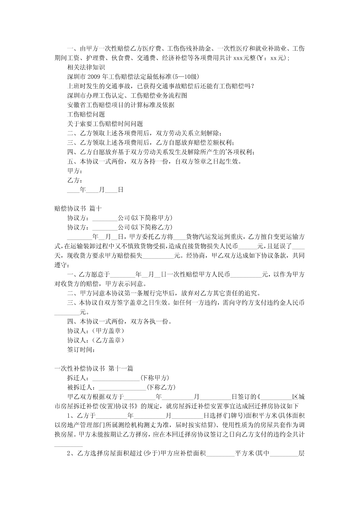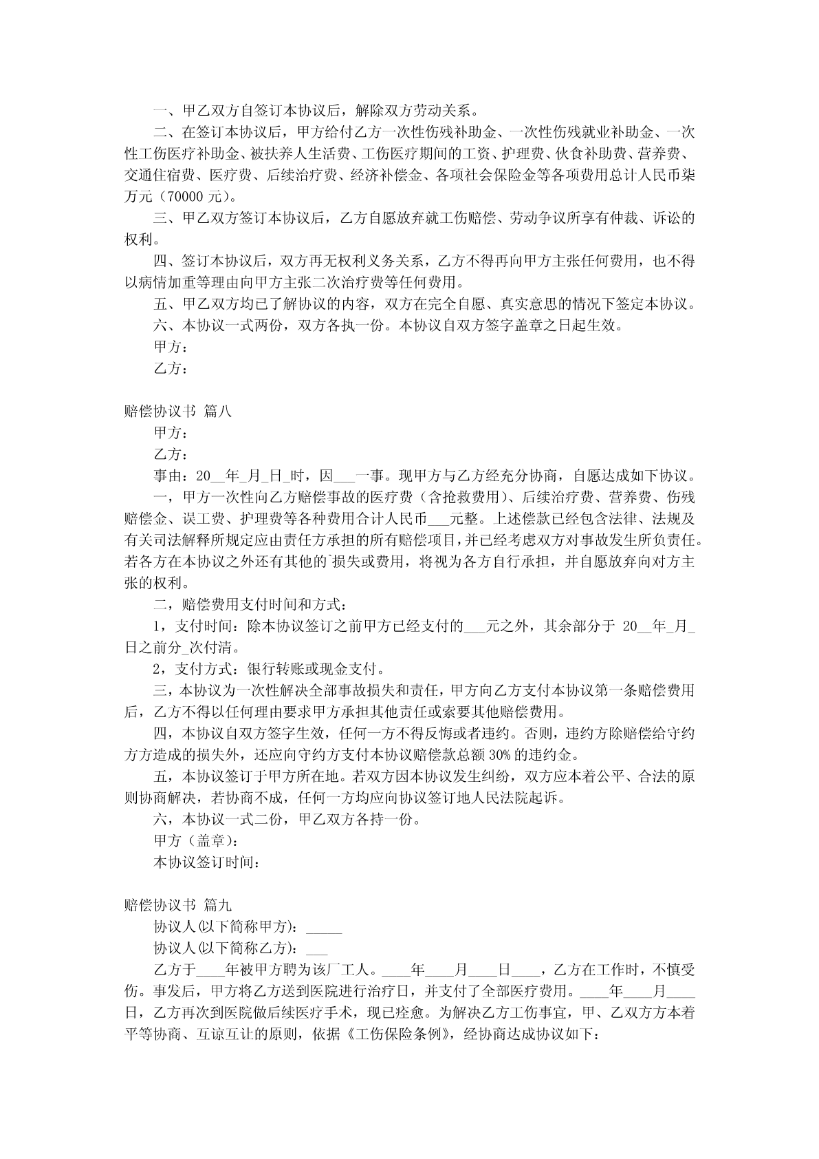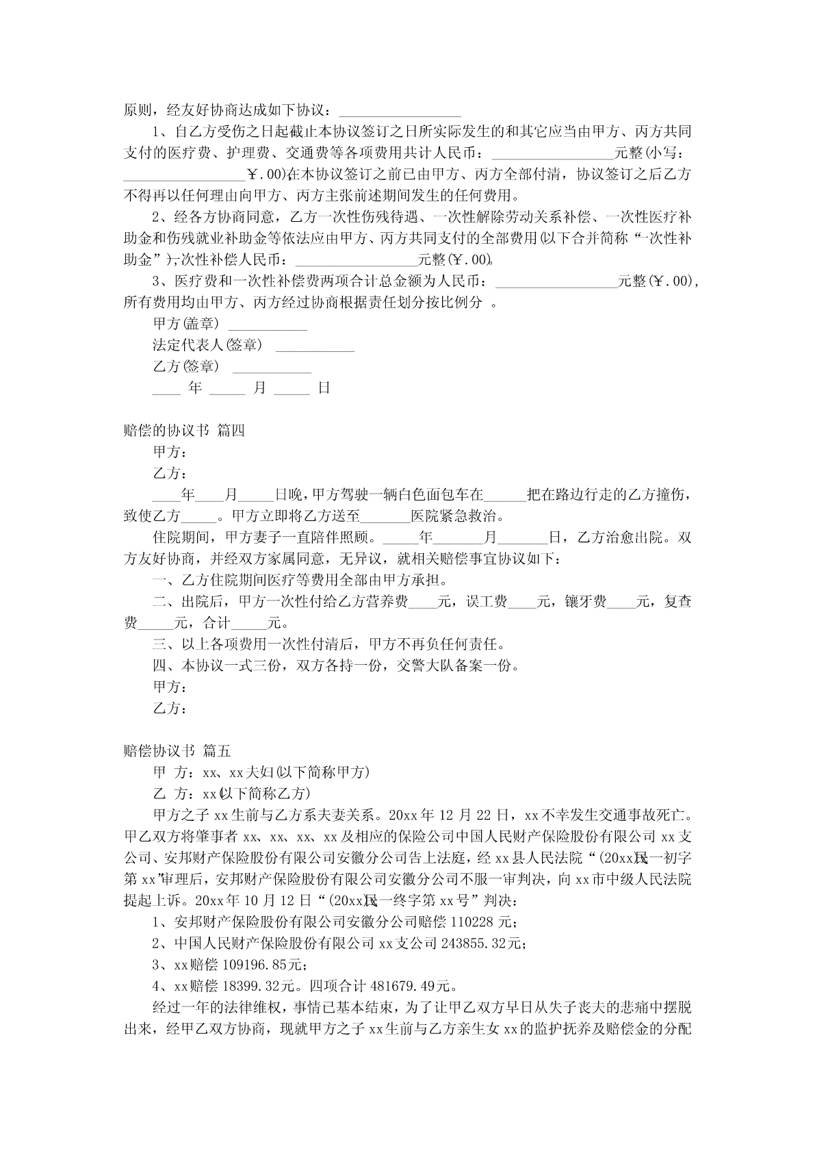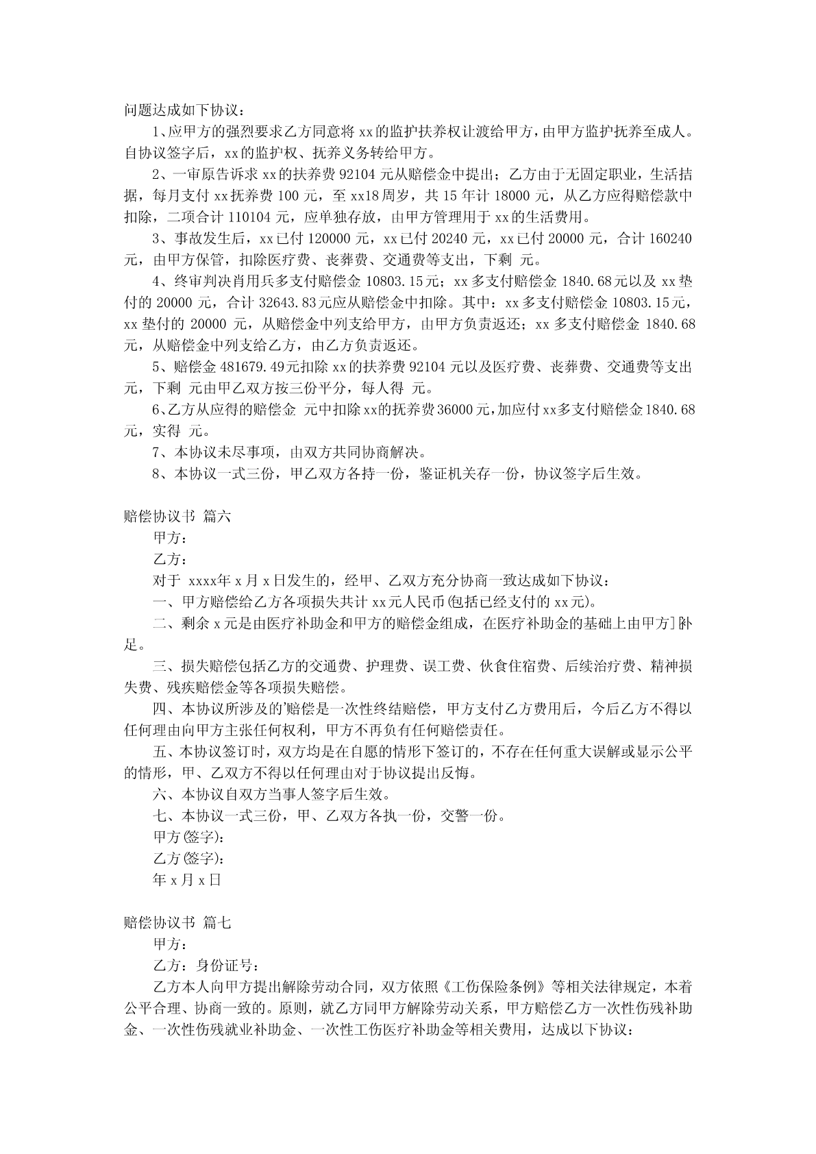 赔偿协议书(通用13篇)赔偿协议书篇一甲方:乙方:乙方于xxxx年x月x日在甲处借数码相机使用,后通过公司的老板归还,但甲方发现自己存在数码相机里的个人资料全部丢失,因为资料对甲方特别重要,里面是甲方存的个人简历、照片等资料,乙方对甲方的`经济造成损失,甲、乙双方对此事实予以确认。根据《中华人民共和国民法通则》第八十五条第一款之规定,乙方应依法承担民事责任。经甲、乙双方协商一致,乙方通过支付赔偿金的方式承担民事责任。乙方向甲方支付赔偿金总额为人民币:xx元。乙方应在本协议生效之日起x日内向甲方支付赔偿金。支付赔偿金方式为。本协议一式二份,甲、乙各执一份。其他责任:乙方支付上述款项后甲方无其他的义务,乙方不得以任何理由向甲方提出任何要求。协议文本:本协议一式三份,甲乙双方各执一份。另一份由甲方法律顾问备档。本协议自甲、乙双方签字之日起生效。甲方:(签字)乙方:(签字)年x月x日赔偿协议书篇二甲方:刘某、张乙方:娄某身份证号:为了解决赔偿事宜,根据相关法律、法规等之规定,现双方本着平等协商、自愿达成协议如下:一、甲方为乙方运输人员。于20xx年2月23日,甲方在乙方的货物地(位于新乡市新乡县朗公庙镇大泉村)尚未开始运输时,鸭蛋突然摔落,致鸭蛋部分受损。后经双方抢救,但现在民造成损失和已经花费各项费用余元人民币(大写)。此费用由甲方承担。二、乙方同意对于20xx年2月28日之后的费用由自己全部负责。三、甲乙双方一致同意:由甲方一次性赔偿乙方各项费用等共计人民币元整;该款于本协议签订之日起日内一次性付清。四、以上协议的达成,完全出于甲乙双方的自愿,是真实意思的表示,不存在威胁等情况。本协议经双方签字后生效,任何一方均不得以任何理由翻悔。本协议一式三份,双方各持甲方:乙方:赔偿协议书篇三甲方:_________________乙方:_________________(工人)姓名:_________________身份证号:_________________丙方(工程承包责任人)姓名:_________________身份证号:_________________乙方于年月日,在施工过程中由于,安全管理疏忽发生伤害事故,经治疗后复查,现已康复。为妥善解决乙方受伤事宜,经甲方协调,乙方与丙方双方本着平等自愿、互谅互让的原则,经友好协商达成如下协议:_________________1、自乙方受伤之日起截止本协议签订之日所实际发生的和其它应当由甲方、丙方共同支付的医疗费、护理费、交通费等各项费用共计人民币:_________________元整(小写:_________________¥.00),在本协议签订之前已由甲方、丙方全部付清,协议签订之后乙方不得再以任何理由向甲方、丙方主张前述期间发生的任何费用。2、经各方协商同意,乙方一次性伤残待遇、一次性解除劳动关系补偿、一次性医疗补助金和伤残就业补助金等依法应由甲方、丙方共同支付的全部费用(以下合并简称“一次性补助金”),一次性补偿人民币:_________________元整(¥.00)。3、医疗费和一次性补偿费两项合计总金额为人民币:_________________元整(¥.00),所有费用均由甲方、丙方经过协商根据责任划分按比例分。甲方(盖章)___________法定代表人(签章)___________乙方(签章)_______________年_____月_____日赔偿的协议书篇四甲方:乙方:____年____月_____日晚,甲方驾驶一辆白色面包车在______把在路边行走的乙方撞伤,致使乙方_____。甲方立即将乙方送至_______医院紧急救治。住院期间,甲方妻子一直陪伴照顾。_____年_______月_______日,乙方治愈出院。双方友好协商,并经双方家属同意,无异议,就相关赔偿事宜协议如下:一、乙方住院期间医疗等费用全部由甲方承担。二、出院后,甲方一次性付给乙方营养费____元,误工费____元,镶牙费____元,复查费_____元,合计_____元。三、以上各项费用一次性付清后,甲方不再负任何责任。四、本协议一式三份,双方各持一份,交警大队备案一份。甲方:乙方:赔偿协议书篇五甲方:xx、xx夫妇(以下简称甲方)乙方:xx(以下简称乙方)甲方之子xx生前与乙方系夫妻关系。20xx年12月22日,xx不幸发生交通事故死亡。甲乙双方将肇事者xx、xx、xx、xx及相应的保险公司中国人民财产保险股份有限公司xx支公司、安邦财产保险股份有限公司安徽分公司告上法庭,经xx县人民法院“(20xx)x民一初字第xx”审理后,安邦财产保险股份有限公司安徽分公司不服一审判决,向xx市中级人民法院提起上诉。20xx年10月12日“(20xx)x民一终字第xx号”判决:1、安邦财产保险股份
