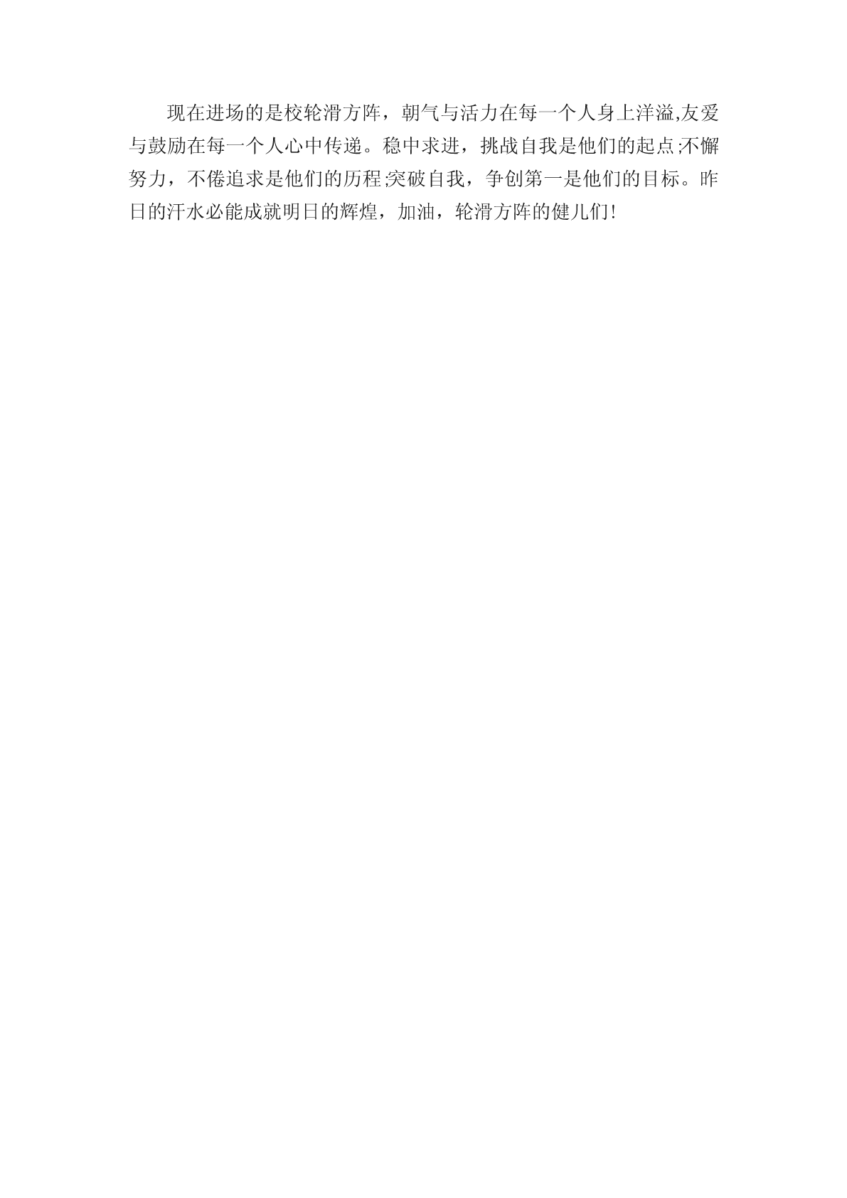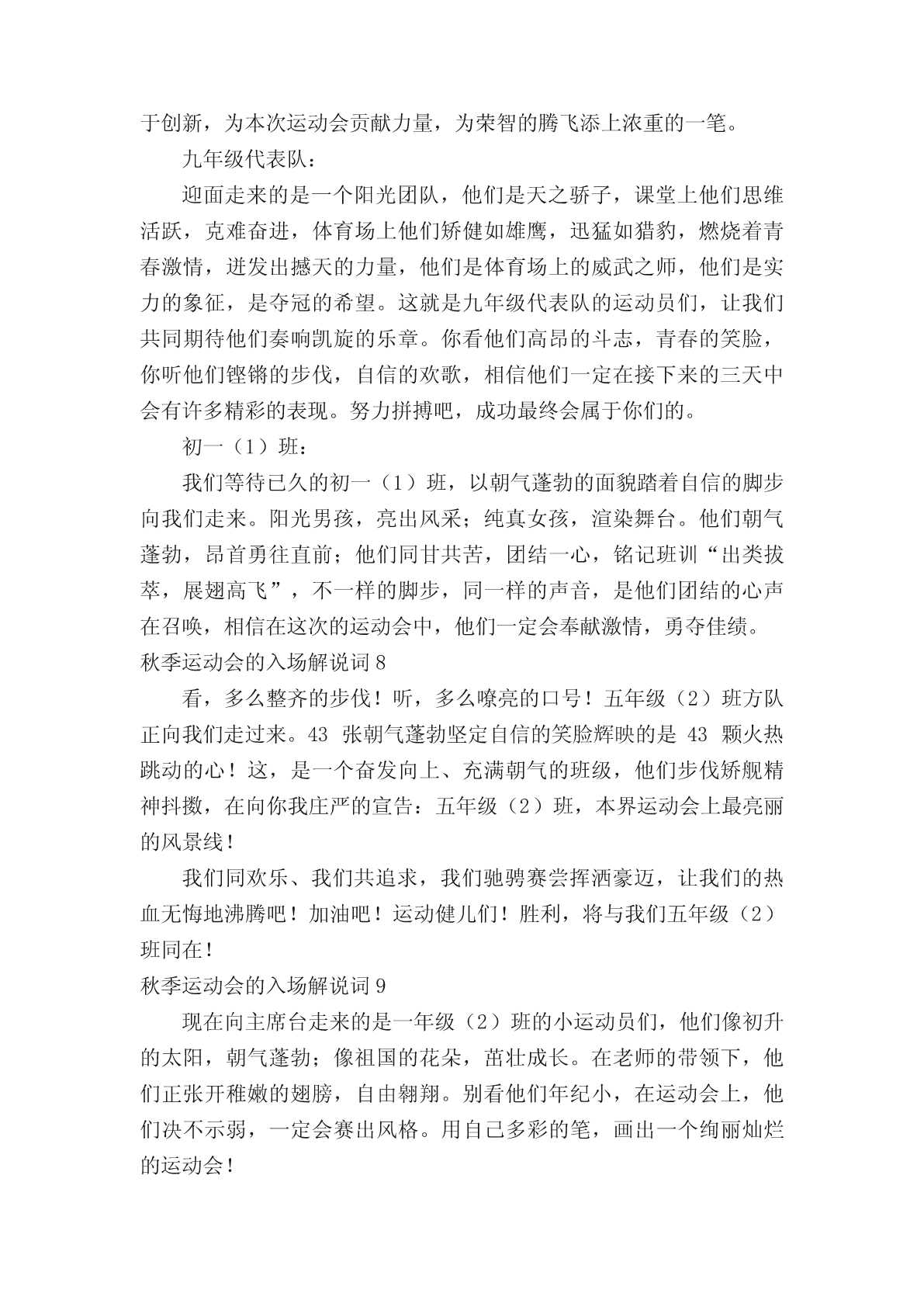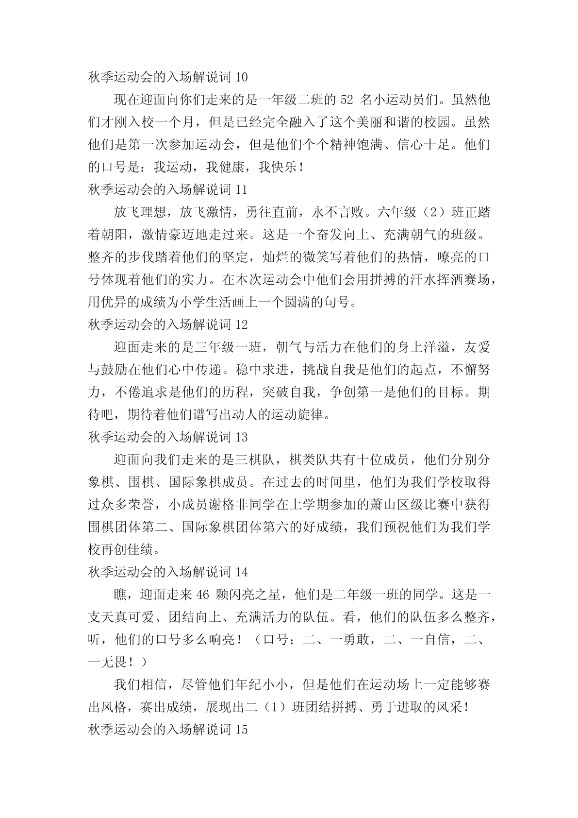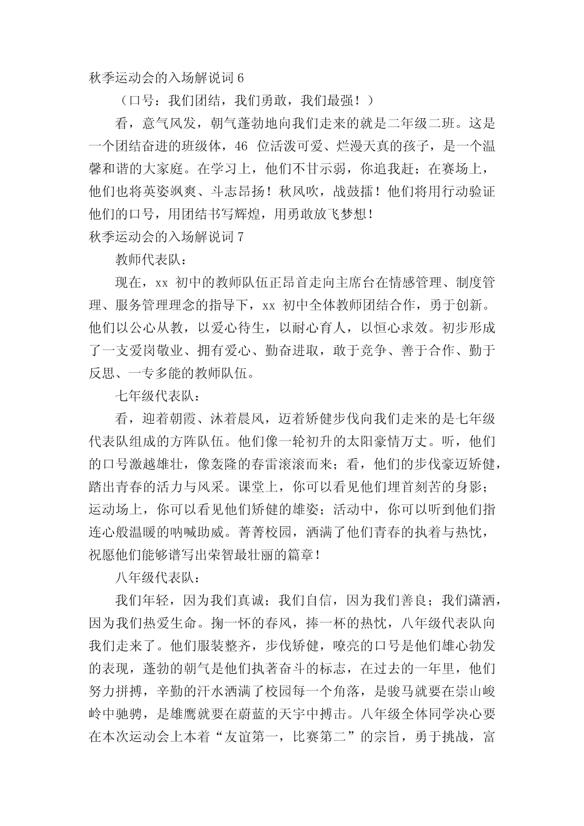 秋季运动会的入场解说词1现在向我们走来的是三年级(2)班的同学,他们着装整齐,精神饱满,迈着矫健的步伐通过主席台前。这是一个热情如火,团结向上的集体。瞧!他们的笑容是多么灿烂。听!他们的口号是多么响亮。在班主任刘老师的带领下,他们有百倍的信心取得好成绩,让我们为他们鼓掌加油!秋季运动会的入场解说词2迈着时代的步伐,踏着世纪的曙光,迎面走来的是四年级三班代表队,他们步伐整齐,口号响亮,精神饱满。在班主任老师的带领下,他们将本着“团结合作,争创佳绩”的宗旨,遵守比赛规则。希望参赛队员赛出水平,赛出风格,最后预祝我校运动会圆满成功。秋季运动会的入场解说词3六(1)班的运动健儿正迈着矫健的步伐向主席台走来,他们,来自一个团结上进的班集体,一个凝聚着老师们的心血,融汇着同学们的激情的班集体,他们朝奥运健儿的精神看齐,将会在这次运动会上展现自己独特的风采,看他们青春饱满的面容,看他们英姿飒爽的身躯,便可知他们有着非凡的'潜力,让我们为他们欢呼,为他们助阵,一起期待惊喜的成绩吧!秋季运动会的入场解说词4带着四射的激情,踏着整齐有力的步伐,一支个性鲜明,朝气蓬勃的队伍向我们走来,他们是四年二班代表队,活力是他们的特征,优胜是他们的代名词,他们期待着在这片簇新的场地上尽情燃放自己的激情,红色的跑道预示着他们的成功!秋季运动会的入场解说词5跆拳道是一项运用手脚技术进行搏击格斗的朝鲜民族传统的体育项目,它由拳套、搏击、功力检验三部分组成,它是引进与吸收中国的传统套术及日本空手道的基础上,创新与发展起来的一门独特武术,能使练习者增强体质,掌握技术,并培养坚韧不拨的意志品质,现在大家看到的是我们的跆拳道队。秋季运动会的入场解说词6(口号:我们团结,我们勇敢,我们最强!)看,意气风发,朝气蓬勃地向我们走来的就是二年级二班。这是一个团结奋进的班级体,46位活泼可爱、烂漫天真的孩子,是一个温馨和谐的大家庭。在学习上,他们不甘示弱,你追我赶;在赛场上,他们也将英姿飒爽、斗志昂扬!秋风吹,战鼓擂!他们将用行动验证他们的口号,用团结书写辉煌,用勇敢放飞梦想!秋季运动会的入场解说词7教师代表队:现在,xx初中的教师队伍正昂首走向主席台在情感管理、制度管理、服务管理理念的指导下,xx初中全体教师团结合作,勇于创新。他们以公心从教,以爱心待生,以耐心育人,以恒心求效。初步形成了一支爱岗敬业、拥有爱心、勤奋进取,敢于竞争、善于合作、勤于反思、一专多能的教师队伍。七年级代表队:看,迎着朝霞、沐着晨风,迈着矫健步伐向我们走来的是七年级代表队组成的方阵队伍。他们像一轮初升的太阳豪情万丈。听,他们的口号激越雄壮,像轰隆的春雷滚滚而来;看,他们的步伐豪迈矫健,踏出青春的活力与风采。课堂上,你可以看见他们埋首刻苦的身影;运动场上,你可以看见他们矫健的雄姿;活动中,你可以听到他们指连心般温暖的呐喊助威。菁菁校园,洒满了他们青春的执着与热忱,祝愿他们能够谱写出荣智最壮丽的篇章!八年级代表队:我们年轻,因为我们真诚;我们自信,因为我们善良;我们潇洒,因为我们热爱生命。掬一怀的春风,捧一杯的热忱,八年级代表队向我们走来了。他们服装整齐,步伐矫健,嘹亮的口号是他们雄心勃发的表现,蓬勃的朝气是他们执著奋斗的标志,在过去的一年里,他们努力拼搏,辛勤的汗水洒满了校园每一个角落,是骏马就要在崇山峻岭中驰骋,是雄鹰就要在蔚蓝的天宇中搏击。八年级全体同学决心要在本次运动会上本着“友谊第一,比赛第二”的宗旨,勇于挑战,富于创新,为本次运动会贡献力量,为荣智的腾飞添上浓重的一笔。九年级代表队:迎面走来的是一个阳光团队,他们是天之骄子,课堂上他们思维活跃,克难奋进,体育场上他们矫健如雄鹰,迅猛如猎豹,燃烧着青春激情,迸发出撼天的力量,他们是体育场上的威武之师,他们是实力的象征,是夺冠的希望。这就是九年级代表队的运动员们,让我们共同期待他们奏响凯旋的乐章。你看他们高昂的斗志,青春的笑脸,你听他们铿锵的步伐,自信的欢歌,相信他们一定在接下来的三天中会有许多精彩的表现。努力拼搏吧,成功最终会属于你们的。初一(1)班:我们等待已久的初一(1)班,以朝气蓬勃的面貌踏着自信的脚步向我们走来。阳光男孩,亮出风采;纯真女孩,渲染舞台。他们朝气蓬勃,昂首勇往直前;他们同甘共苦,团结一心,铭记班训“出类拔萃,展翅高飞”,不一样的脚步,同一样的声音,是他们团结的心声在召唤,相信在这次的运动会中,他们一定会奉献激情,勇夺佳绩。秋季运动会的入场解说词8看,多么整齐的步伐!听,多么嘹亮的口号!五年级(2)班方队正向我们走过来。43张朝气蓬勃坚定自信的笑脸辉映的是43颗火热跳动的心!这,是一个奋发向上、充满朝气的班级,他们步伐矫舰精神抖擞,在向你我庄严的宣告:五年级(2)班,本界运动会上最亮丽的风景线!我们同欢乐、我们共追求,我们驰骋赛尝挥