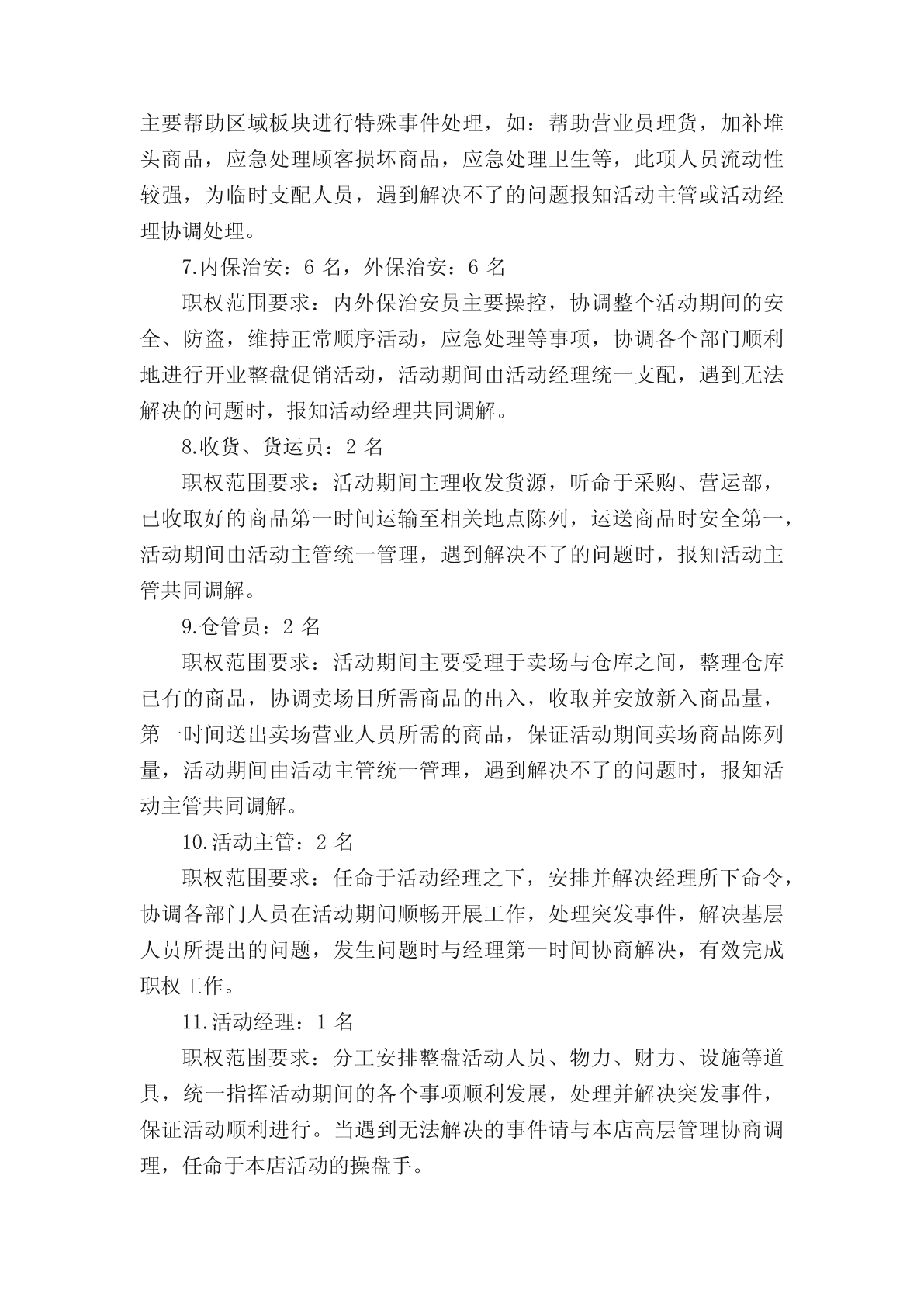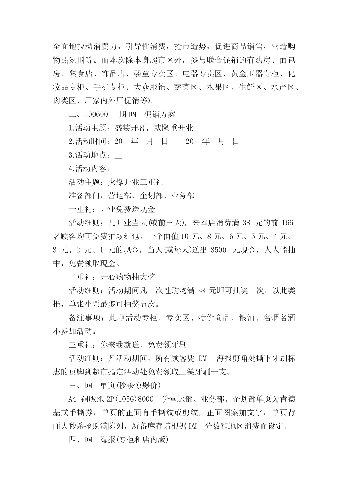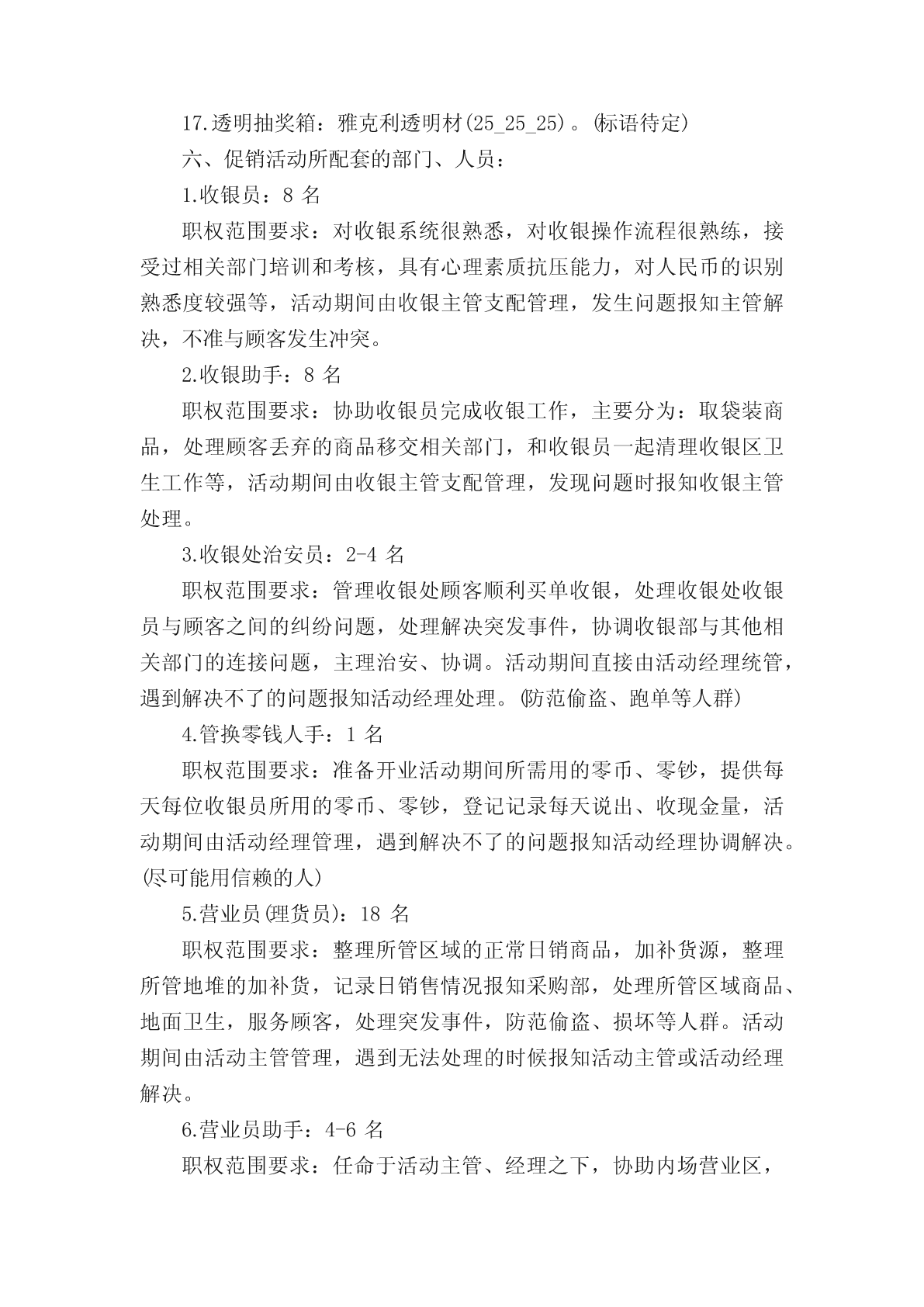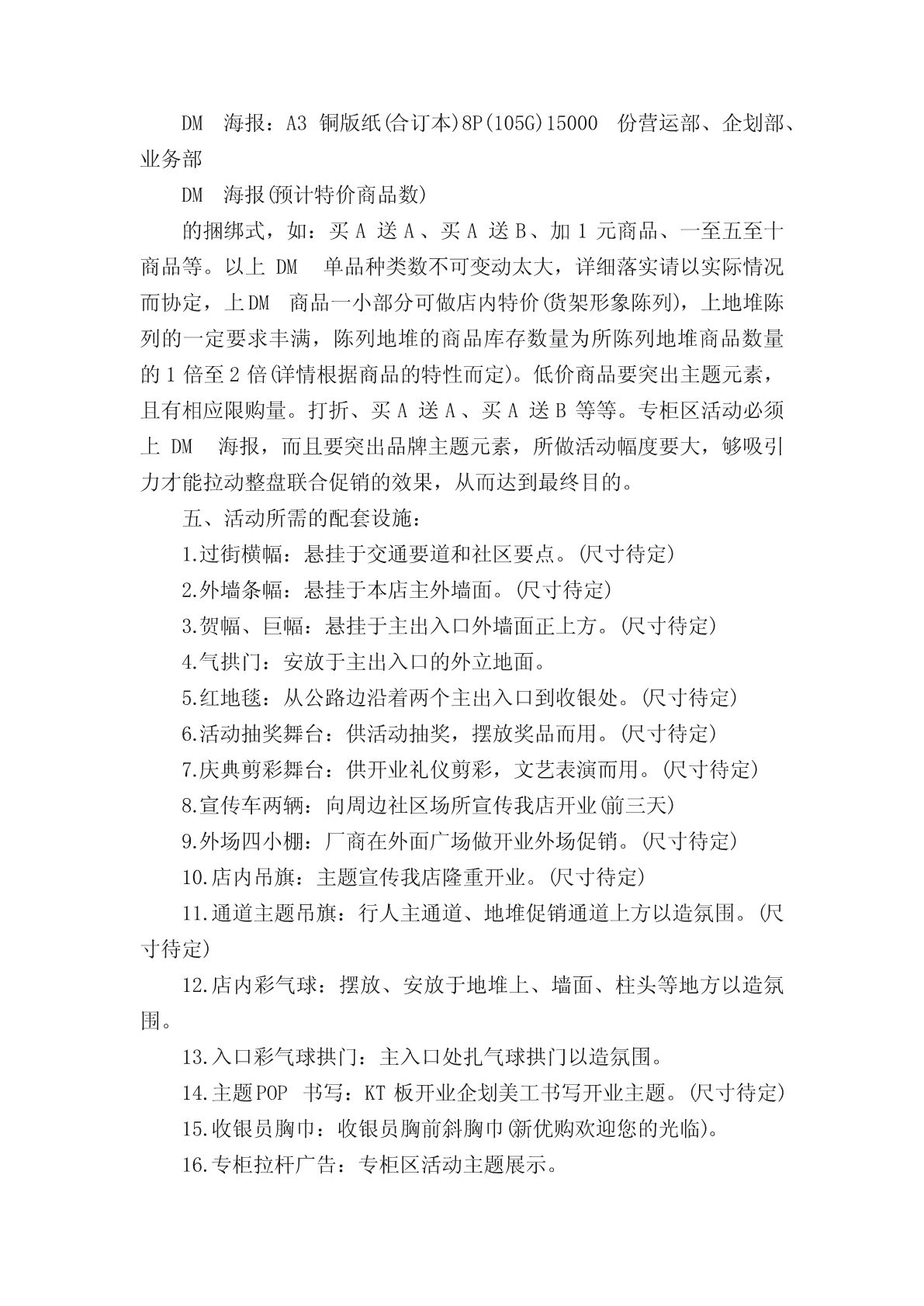开业策划流程方案6篇推荐文章2022年购物中心开业前预热期活动方案热度:开业典礼策划方案10篇热度:理发店新店开业策划方案10篇热度:新店开业活动策划方案【5篇】热度:开业活动策划方案详细模板热度:开业活动是门店惯用的促销方式,一般来说在开业前后,商家会通过发放宣传单来吸引大量的顾客。以下是小编精心收集整理的开业策划流程方案,欢迎大家阅读借鉴。开业策划流程方案1一、市场背景分析:1.人口基数、经济指数:__镇人口数在5.8万,中老幼指数居中,俱在潜在的消费力。__店所能辐射的人口数在2.8万人,而平均消费能力在580元/人/月,而能辐射的人口消费指数偏老龄化,消费具有保守性,目的直接性,冲动性消费占比8%。而__镇是一个本地居民为主的聚集地,工业经济较少,工薪层工作点多半在市区,以交通工具来回奔走,在本地工作的工薪层占比75%,具潜在消费能力,2.竞争力:__店所竞争的范围有:__农工商,__街道零散批发部及小便利店,__附近交通便利的超市、菜场,乘17路公交车到市区的大零售团体、KA卖场、购物中心等优越的购物点。但是,__现有的竞争业态并不完整,而有的零售店在商品结构、陈列、广告、管理上并不与我们匹比,无法形成一个正面的竞争力。乘公交到市区消费大多为大宗家电、服饰等种类,日用消费品还是会定居在__,而且乘车不方便等等。3.联合营销的目的性:现__店为二次开业,原有新时代消费的谷歌对新时代认知上有一定的局限性,而本次开业给顾客面目一新的感觉尤为重要,现我店除了拥众多的品牌专营和全新的店面形象外,还得加大整体促销活动的投入,力争达到:更有效的打击对手,稳定和扩大市场份额,全新和全面地拉动消费力,引导性消费,抢市造势,促进商品销售,营造购物热氛围等。而本次除本身超市区外,参与联合促销的有药房、面包房、熟食店、饰品店、婴童专卖区、电器专卖区、黄金玉器专柜、化妆品专柜、手机专柜、大众服饰、蔬菜区、水果区、生鲜区、水产区、肉类区、厂家内外厂促销等)。二、1006001期DM促销方案1.活动主题:盛装开幕,或隆重开业2.活动时间:20__年__月__日——20__年__月__日3.活动地点:__4.活动内容:活动主题:火爆开业三重礼准备部门:营运部、企划部、业务部一重礼:开业免费送现金活动细则:凡开业当天(或前三天),来本店消费满38元的前166名顾客均可免费抽取红包,一个面值10元、8元、6元、5元、4元、3元、2元、1元的现金,当天(或每天)送出3500元现金,人人能抽中,免费领取现金。二重礼:开心购物抽大奖活动细则:活动期间凡一次性购物满38元即可抽奖一次,以此类推,单张小票最多可抽奖五次。备注事项:此项活动专柜、专卖区、特价商品、粮油、名烟名酒不参加活动。三重礼:你来我就送,免费领牙刷活动细则:凡活动期间,所有顾客凭DM海报剪角处撕下牙刷标志的页脚到超市指定活动处免费领取三笑牙刷一支。三、DM单页(秒杀惊爆价)A4铜版纸2P(105G)8000份营运部、业务部、企划部单页为肯德基式手撕券,单页的正面有手撕纹或剪纹,正面图案加文字,单页背面为秒杀抢购满陈列,所备库存请根据DM分数和地区消费而设定。四、DM海报(专柜和店内版)DM海报:A3铜版纸(合订本)8P(105G)15000份营运部、企划部、业务部DM海报(预计特价商品数)的捆绑式,如:买A送A、买A送B、加1元商品、一至五至十商品等。以上DM单品种类数不可变动太大,详细落实请以实际情况而协定,上DM商品一小部分可做店内特价(货架形象陈列),上地堆陈列的一定要求丰满,陈列地堆的商品库存数量为所陈列地堆商品数量的1倍至2倍(详情根据商品的特性而定)。低价商品要突出主题元素,且有相应限购量。打折、买A送A、买A送B等等。专柜区活动必须上DM海报,而且要突出品牌主题元素,所做活动幅度要大,够吸引力才能拉动整盘联合促销的效果,从而达到最终目的。五、活动所需的配套设施:1.过街横幅:悬挂于交通要道和社区要点。(尺寸待定)2.外墙条幅:悬挂于本店主外墙面。(尺寸待定)3.贺幅、巨幅:悬挂于主出入口外墙面正上方。(尺寸待定)4.气拱门:安放于主出入口的外立地面。5.红地毯:从公路边沿着两个主出入口到收银处。(尺寸待定)6.活动抽奖舞台:供活动抽奖,摆放奖品而用。(尺寸待定)7.庆典剪彩舞台:供开业礼仪剪彩,文艺表演而用。(尺寸待定)8.宣传车两辆:向周边社区场所宣传我店开业(前三天)9.外场四小棚:厂商在外面广场做开业外场促销。(尺寸待定)10.店内吊旗:主题宣传我店隆重开业。(尺寸待定)11.通道主题吊旗:行人主通道、地堆促销通道上方以造氛围。(尺寸待定)12.店内彩气球:摆放、安放于地堆上、墙面、柱头等地方以造氛围。13.入口彩气球拱门:主入口处扎气球拱门以造氛围。14.主题POP书写: