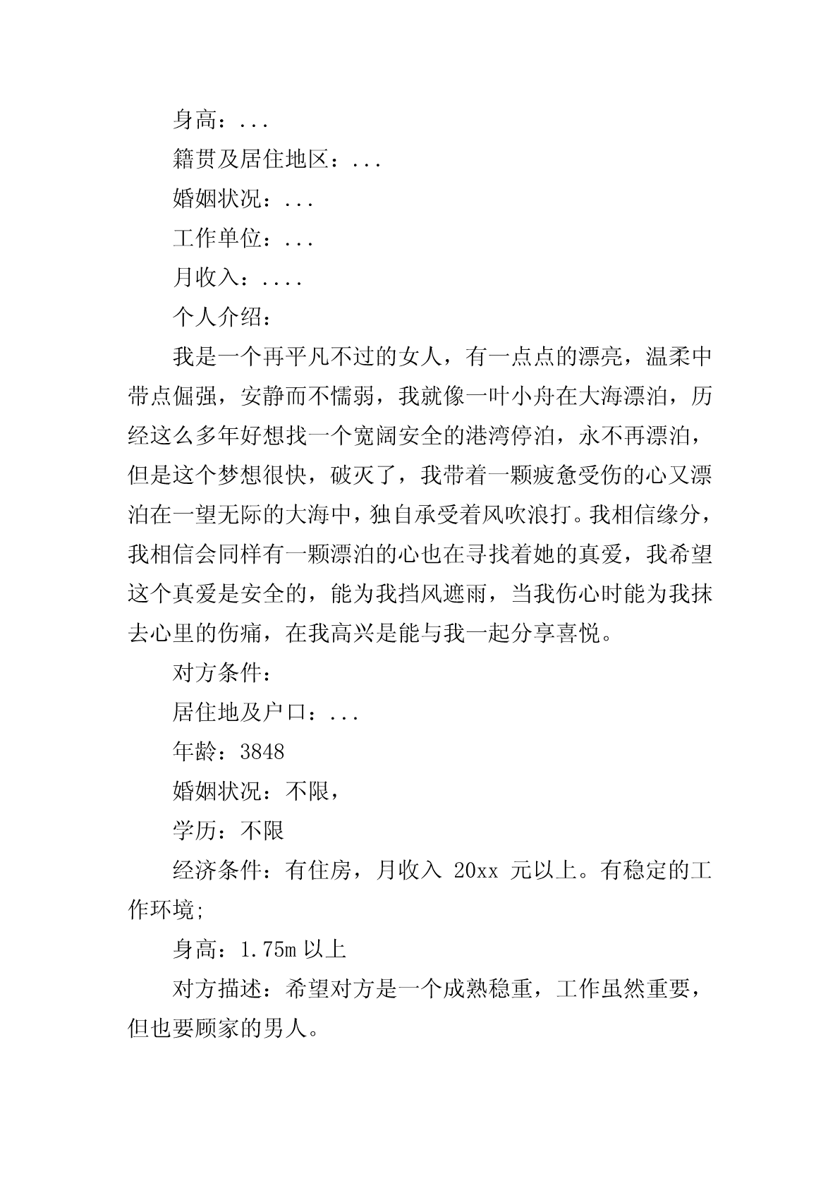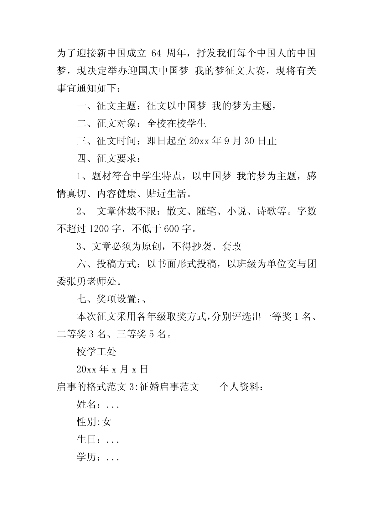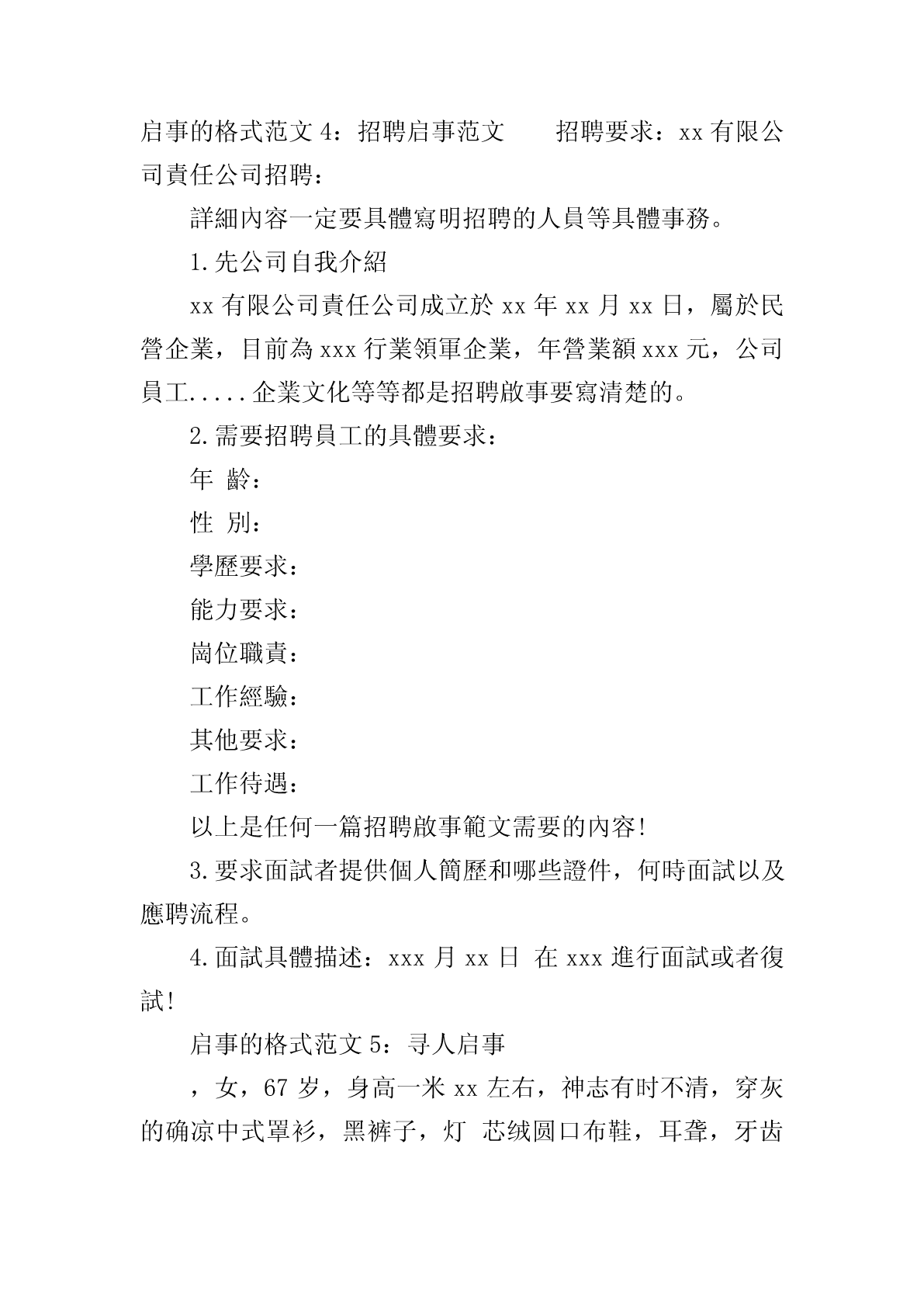 启事的格式_启事格式范文启事的格式启事是单位或个人有什么事情要向大家公开说明,或者对大家有什么要求,把它简明扼要地写出来张贴或刊登的短文。一般要写明:1、名称。如招领启事、寻物启事、征文启事等;2、内容。一般包括目的、意义、内容、形式、要求等项目,要做到周全完整,语言要具体明确,中肯礼貌。如果内容多,分条开列清楚;3、结尾。写明启事者的名称和启事的日期。启事的格式范文1:寻物启示范本寻猫启示20xx年x月x日晚9点,家中的猫在楼下不慎走失,它虽为土猫但十分可爱,1岁半,灰白相间色,因没有出过门,胆小,惊吓后跑失在本小区。虽然不值钱,但抚养日久生情.愿好心人发现后收留后送回,愿好人一生平安!联系电话:137xxxxxx68找到后必有重谢!1幢507室房主20xx年x月x日启事的格式范文2:征文启事中国梦我的梦征文启事今年是新中国成立64周年,在这艰苦奋斗的60多年里,我们的祖国经历风风雨雨,在困难中不断前进,值得我们每一个中华儿女骄傲和自豪的是,我们的祖国在各项事业中取得了辉煌的成就。党的会议中,提出了中国梦这个概念,我们全国人民的中国梦是:国家富强,民族振兴,人民幸福。为了迎接新中国成立64周年,抒发我们每个中国人的中国梦,现决定举办迎国庆中国梦我的梦征文大赛,现将有关事宜通知如下:一、征文主题:征文以中国梦我的梦为主题,二、征文对象:全校在校学生三、征文时间:即日起至20xx年9月30日止四、征文要求:1、题材符合中学生特点,以中国梦我的梦为主题,感情真切、内容健康、贴近生活。2、文章体裁不限:散文、随笔、小说、诗歌等。字数不超过1200字,不低于600字。3、文章必须为原创,不得抄袭、套改六、投稿方式:以书面形式投稿,以班级为单位交与团委张勇老师处。七、奖项设置:、本次征文采用各年级取奖方式,分别评选出一等奖1名、二等奖3名、三等奖5名。校学工处20xx年x月x日启事的格式范文3:征婚启事范文个人资料:姓名:...性别:女生日:...学历:...身高:...籍贯及居住地区:...婚姻状况:...工作单位:...月收入:....个人介绍:我是一个再平凡不过的女人,有一点点的漂亮,温柔中带点倔强,安静而不懦弱,我就像一叶小舟在大海漂泊,历经这么多年好想找一个宽阔安全的港湾停泊,永不再漂泊,但是这个梦想很快,破灭了,我带着一颗疲惫受伤的心又漂泊在一望无际的大海中,独自承受着风吹浪打。我相信缘分,我相信会同样有一颗漂泊的心也在寻找着她的真爱,我希望这个真爱是安全的,能为我挡风遮雨,当我伤心时能为我抹去心里的伤痛,在我高兴是能与我一起分享喜悦。对方条件:居住地及户口:...年龄:3848婚姻状况:不限,学历:不限经济条件:有住房,月收入20xx元以上。有稳定的工作环境;身高:1.75m以上对方描述:希望对方是一个成熟稳重,工作虽然重要,但也要顾家的男人。启事的格式范文4:招聘启事范文招聘要求:xx有限公司責任公司招聘:詳細內容一定要具體寫明招聘的人員等具體事務。1.先公司自我介紹xx有限公司責任公司成立於xx年xx月xx日,屬於民營企業,目前為xxx行業領軍企業,年營業額xxx元,公司員工.....企業文化等等都是招聘啟事要寫清楚的。2.需要招聘員工的具體要求:年齡:性別:學歷要求:能力要求:崗位職責:工作經驗:其他要求:工作待遇:以上是任何一篇招聘啟事範文需要的內容!3.要求面試者提供個人簡歷和哪些證件,何時面試以及應聘流程。4.面試具體描述:xxx月xx日在xxx進行面試或者復試!启事的格式范文5:寻人启事,女,67岁,身高一米xx左右,神志有时不清,穿灰的确凉中式罩衫,黑裤子,灯芯绒圆口布鞋,耳聋,牙齿已全部脱落,豫西口音,带一根木质拐杖,于二月三日出走至今未归。有知情者请与市机械安装厂联系,定有重谢。联系电话:传呼:年月日启事的格式_启事格式范文