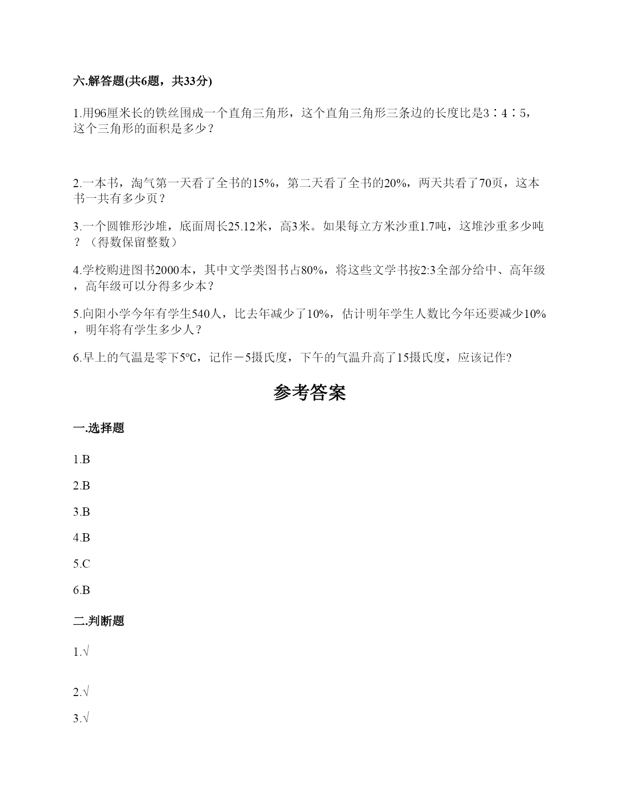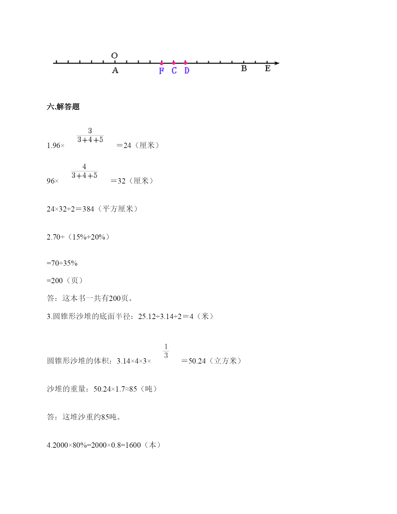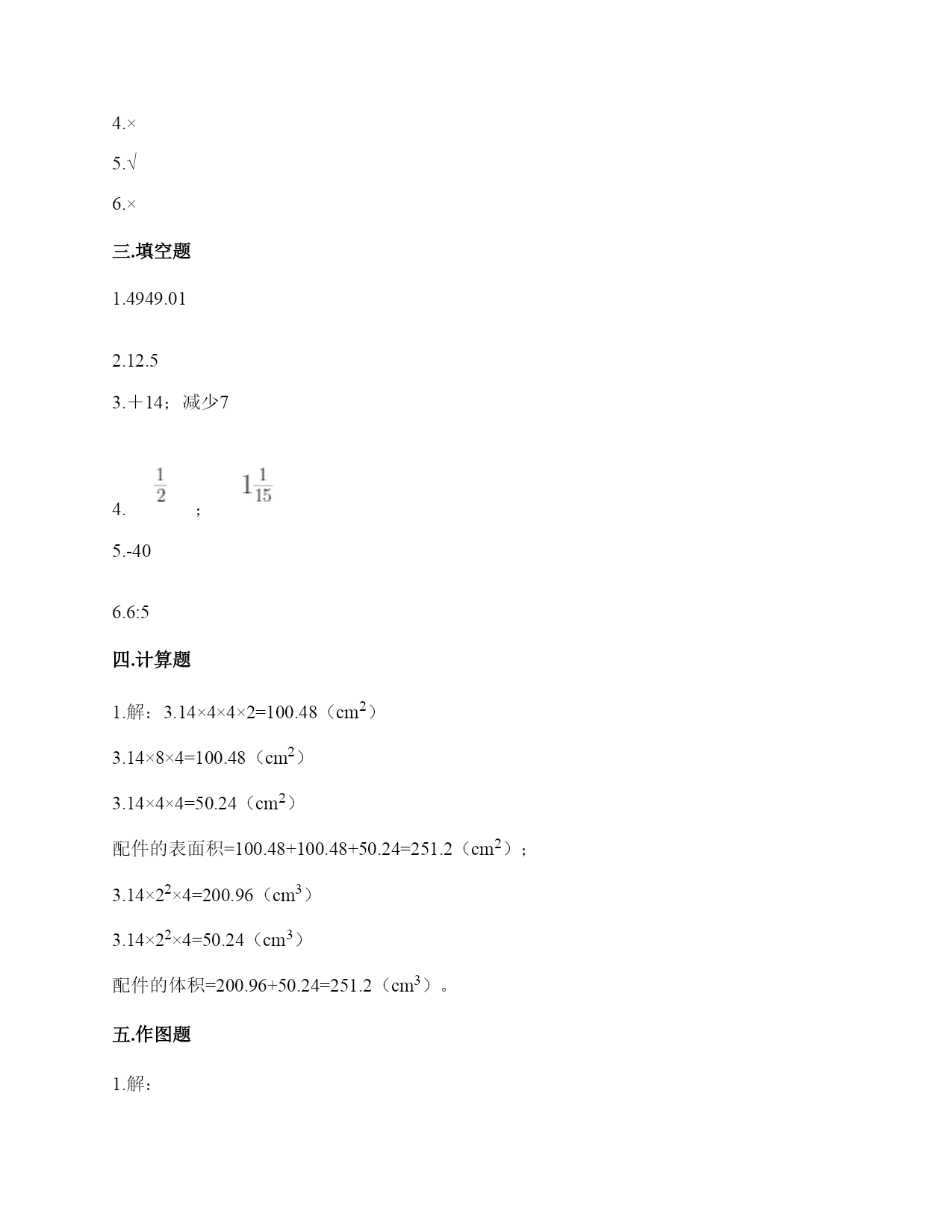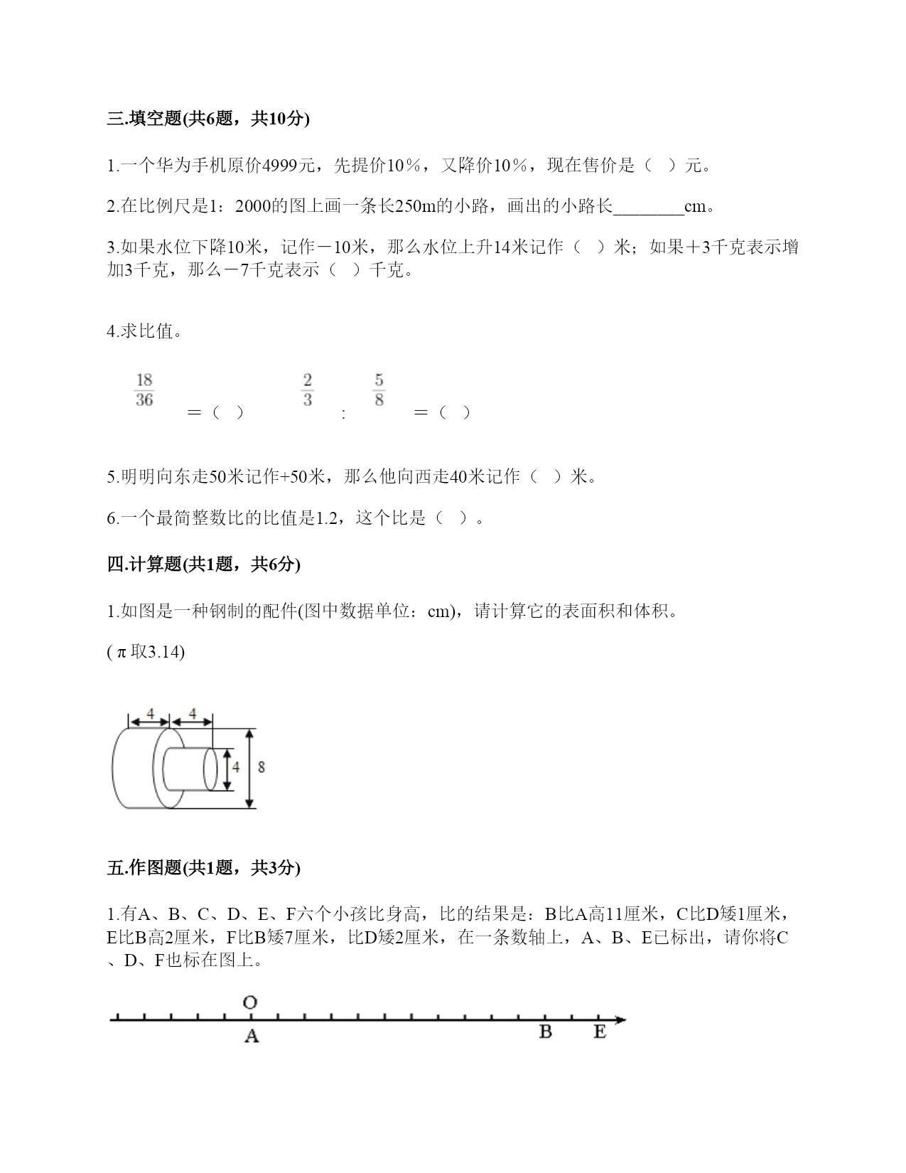 2024年人教版六年级下册数学期末测试卷一.选择题(共6题,共12分)1.如果进了3个球记作+3球,那么失2球应记作()球。A.+2B.-22.一种饼干包装袋上标着“净重(150±5克)”,表示这种饼干的标准质量是150克,实际每袋最少不少于()克。A.155B.145C.1503.一个圆柱形物体,底面周长是12.56厘米,高10厘米.它的表面积是()。A.125.6cm2B.150.72cm2C.25.12cm2D.32.21cm24.在一幅中国地图上,用3厘米长的线段表示地面上240千米,这幅地图的比例尺是()。A.1∶80000B.1∶8000000C.1∶800D.1∶80005.正方体的表面积与它的棱长成()关系。A.反比例B.正比例C.没有比例6.一件商品进价200元,要求销售利润率为10%,售价为()元。A.202B.220C.290D.380二.判断题(共6题,共12分)1.圆锥是旋转直角三角形得到的。()2.长方形的长一定,面积和宽成正比例。()3.把图形放大或缩小后得到的图形与原图形相比,大小不同,但形状相同。()4.如果气温下降8℃记作-8℃,那么+9℃的意义就表示零上9℃。()5.打八折出售,就是按原价的80%出售。()6.任意两个相同的圆和一个曲面就可以组成一个圆柱。()三.填空题(共6题,共10分)1.一个华为手机原价4999元,先提价10%,又降价10%,现在售价是()元。2.在比例尺是1:2000的图上画一条长250m的小路,画出的小路长________cm。3.如果水位下降10米,记作-10米,那么水位上升14米记作()米;如果+3千克表示增加3千克,那么-7千克表示()千克。4.求比值。=():=()5.明明向东走50米记作+50米,那么他向西走40米记作()米。6.一个最简整数比的比值是1.2,这个比是()。四.计算题(共1题,共6分)1.如图是一种钢制的配件(图中数据单位:cm),请计算它的表面积和体积。(π取3.14)五.作图题(共1题,共3分)1.有A、B、C、D、E、F六个小孩比身高,比的结果是:B比A高11厘米,C比D矮1厘米,E比B高2厘米,F比B矮7厘米,比D矮2厘米,在一条数轴上,A、B、E已标出,请你将C、D、F也标在图上。六.解答题(共6题,共33分)1.用96厘米长的铁丝围成一个直角三角形,这个直角三角形三条边的长度比是3∶4∶5,这个三角形的面积是多少?2.一本书,淘气第一天看了全书的15%,第二天看了全书的20%,两天共看了70页,这本书一共有多少页?3.一个圆锥形沙堆,底面周长25.12米,高3米。如果每立方米沙重1.7吨,这堆沙重多少吨?(得数保留整数)4.学校购进图书2000本,其中文学类图书占80%,将这些文学书按2:3全部分给中、高年级,高年级可以分得多少本?5.向阳小学今年有学生540人,比去年减少了10%,估计明年学生人数比今年还要减少10%,明年将有学生多少人?6.早上的气温是零下5℃,记作-5摄氏度,下午的气温升高了15摄氏度,应该记作?参考答案一.选择题1.B2.B3.B4.B5.C6.B二.判断题1.√2.√3.√4.×5.√6.×三.填空题1.4949.012.12.53.+14;减少74.;5.-406.6:5四.计算题1.解:3.14×4×4×2=100.48(cm2)3.14×8×4=100.48(cm2)3.14×4×4=50.24(cm2)配件的表面积=100.48+100.48+50.24=251.2(cm2);3.14×22×4=200.96(cm3)3.14×22×4=50.24(cm3)配件的体积=200.96+50.24=251.2(cm3)。五.作图题1.解:六.解答题1.96×=24(厘米)96×=32(厘米)24×32÷2=384(平方厘米)2.70÷(15%+20%)=70÷35%=200(页)答:这本书一共有200页。3.圆锥形沙堆的底面半径:25.12÷3.14÷2=4(米)圆锥形沙堆的体积:3.14×4×3×=50.24(立方米)沙堆的重量:50.24×1.7≈85(吨)答:这堆沙重约85吨。4.2000×80%=2000×0.8=1600(本)1600×=1600×=960(本)答:高年级可以分得960本。5.540×(1-10%)=540×90%=486(人)答:明年将有学生486人。6.解:零下15摄氏度的基础上升高了15摄氏度,变成10摄氏度,记作+10。